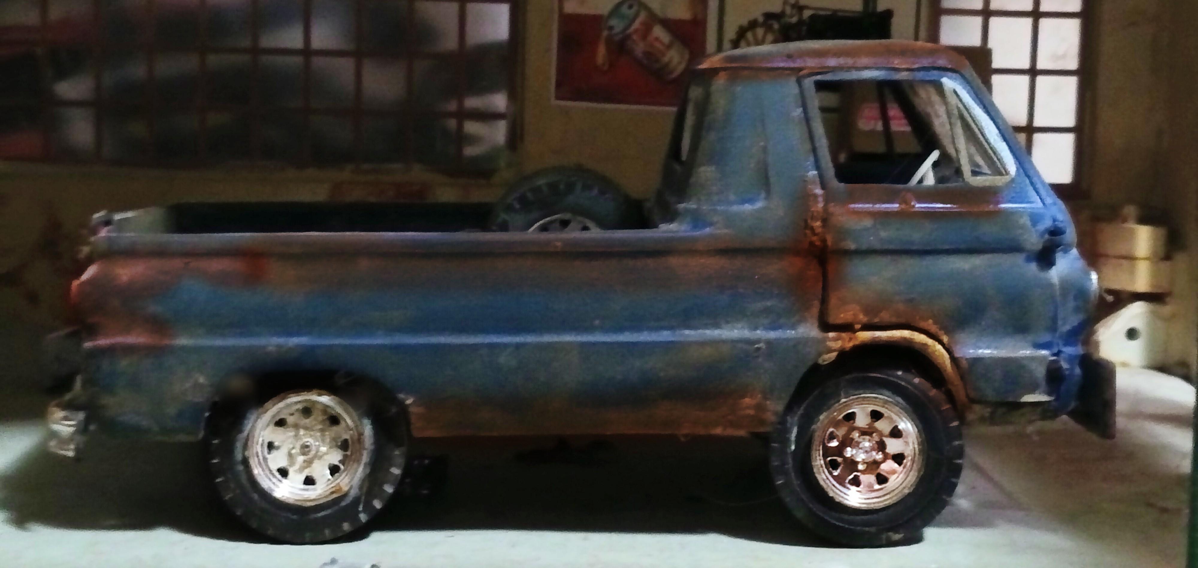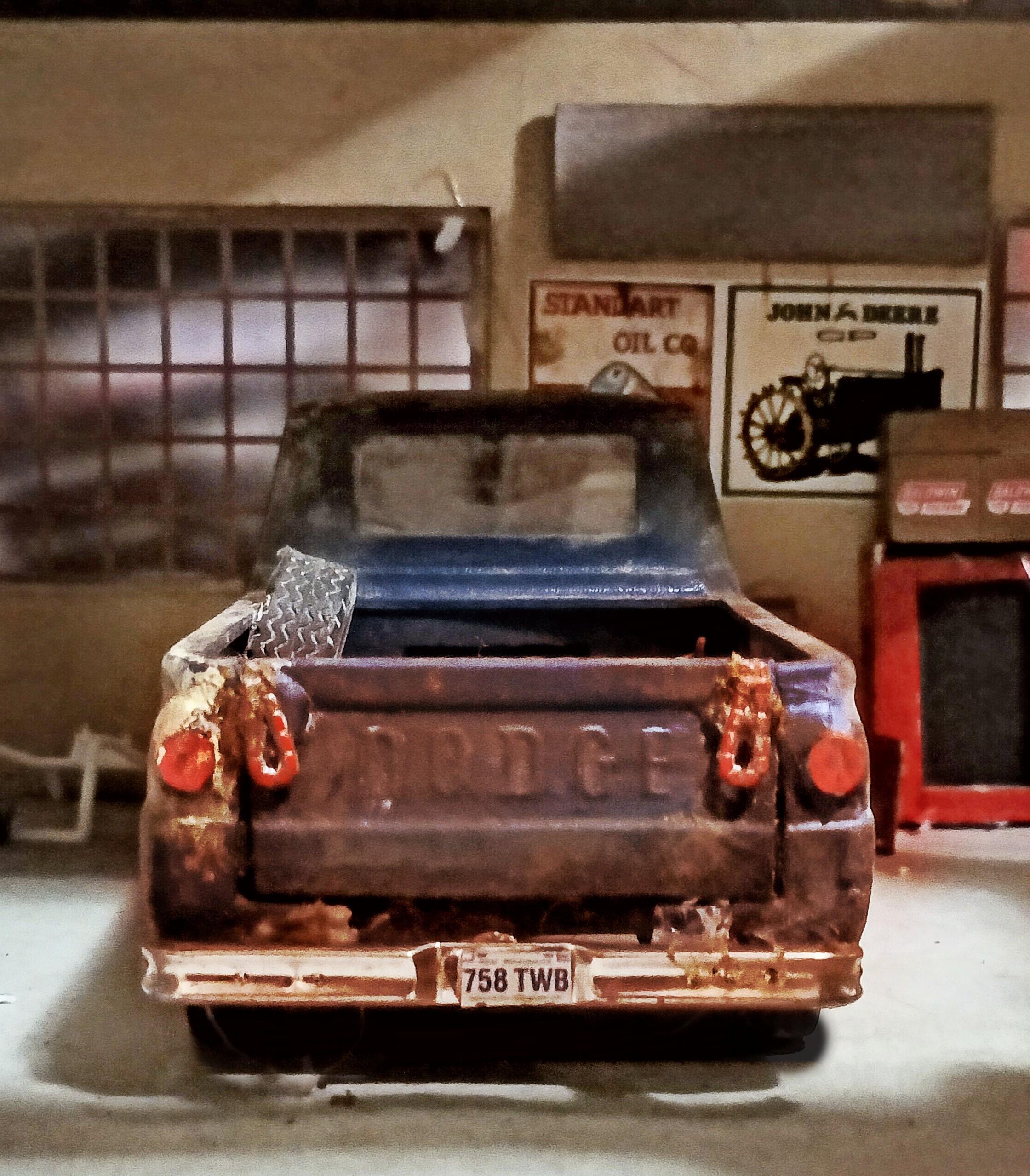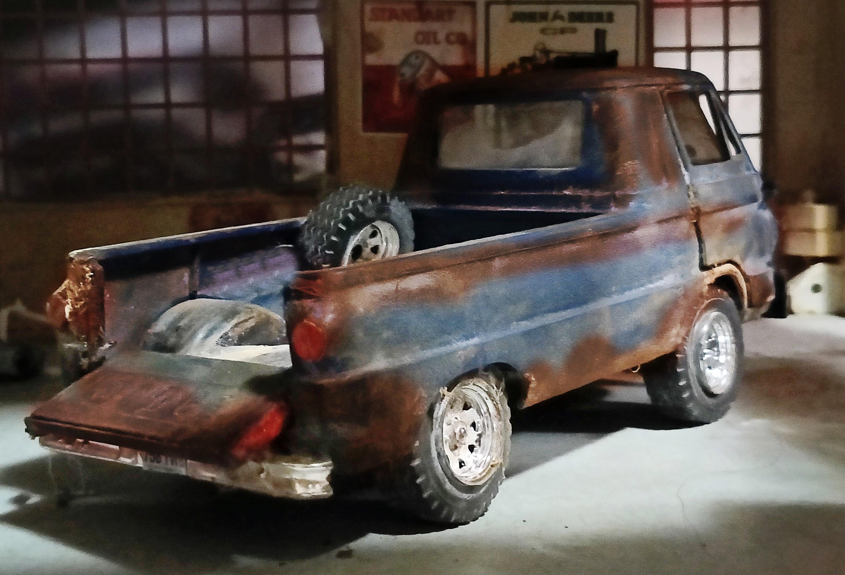 I started with a horrible gluebomb mess in a taped up box sold to me cheap by a friend. Whereas most stock builds of this are automatics, this one is a 3 on the tree instead of the kit supplied pushbutton automatic transmission, with a 273 V8 engine, aged/distressed Marlin Blue paint with simulated body damage, wood front bumper, ferric oxide corrosion all over with the deepest in the passenger's wheel arch and lower door, in the cab floor, & in both rocker panels. Grille was absent from the partially built gluebomb and pile of parts I purchased for a great price, so was replaced with cross stitching mesh made to look like chain link poultry fencing, Monogram all-terrain tires and parts bin seats/steering wheel/column round out the build. Weathering done with artist's oil paints, talcum powder, ground chalk pastels, and Tamiya & homemade washes, body damage was done by steel wooling the bare plastic and heating both doors/the tailgate with a bick lighter, then using the blunt ends of hand tools to distort them & flash cooling them in my freezer. I finished it off with New Brunswick license plates to fit with the rusty, greasy, creaky look/feel of the build and can call it finished now.
