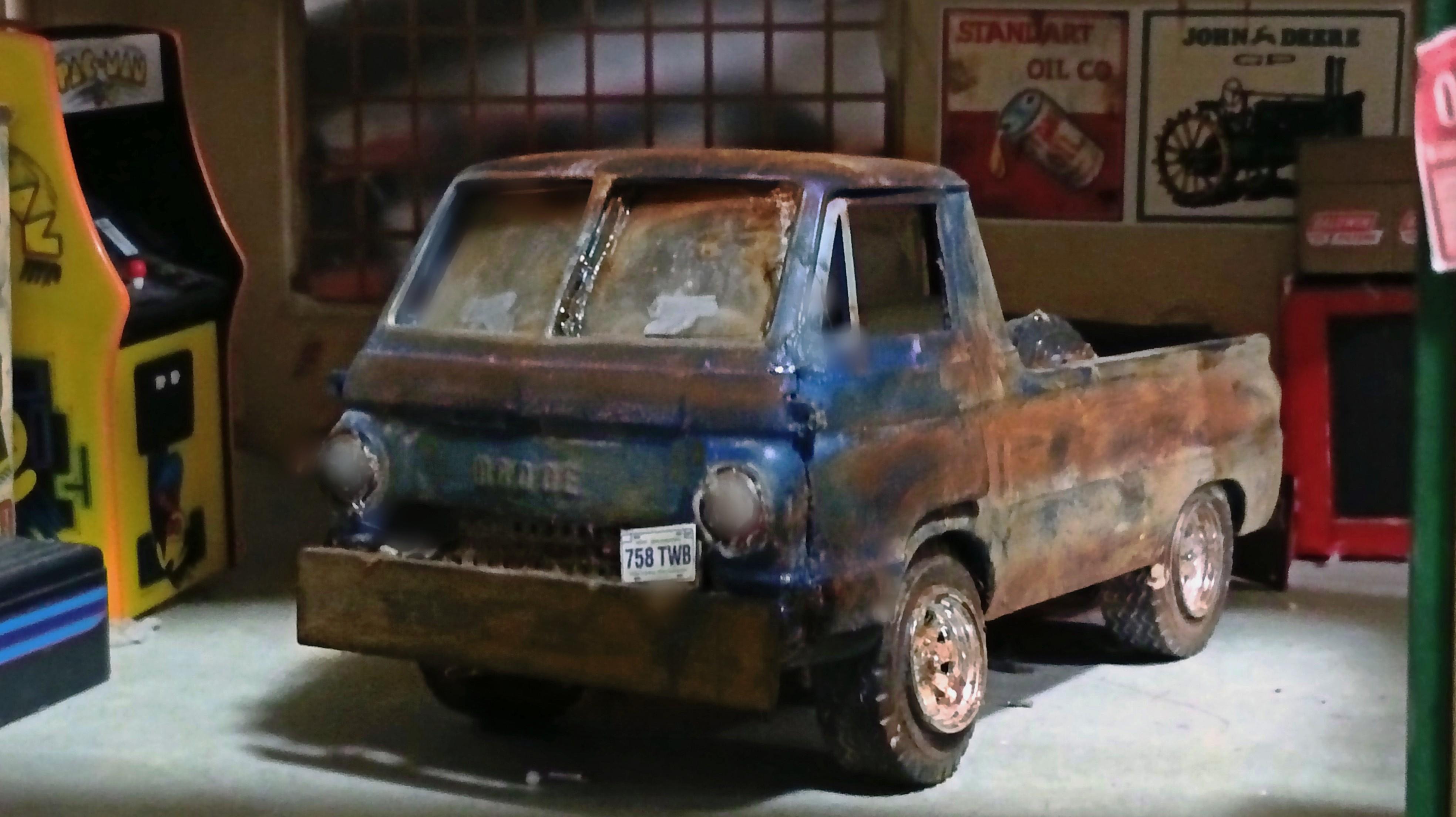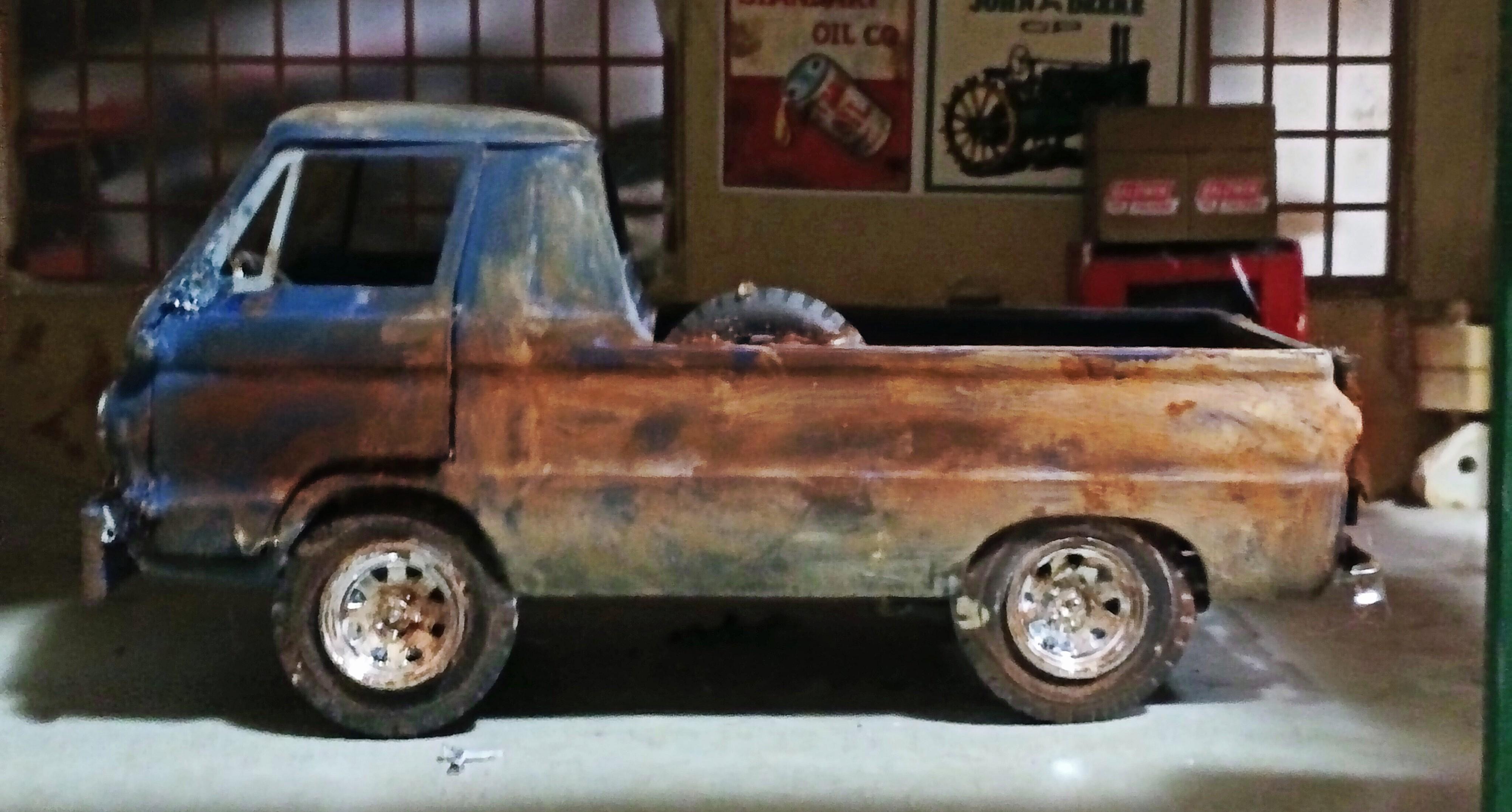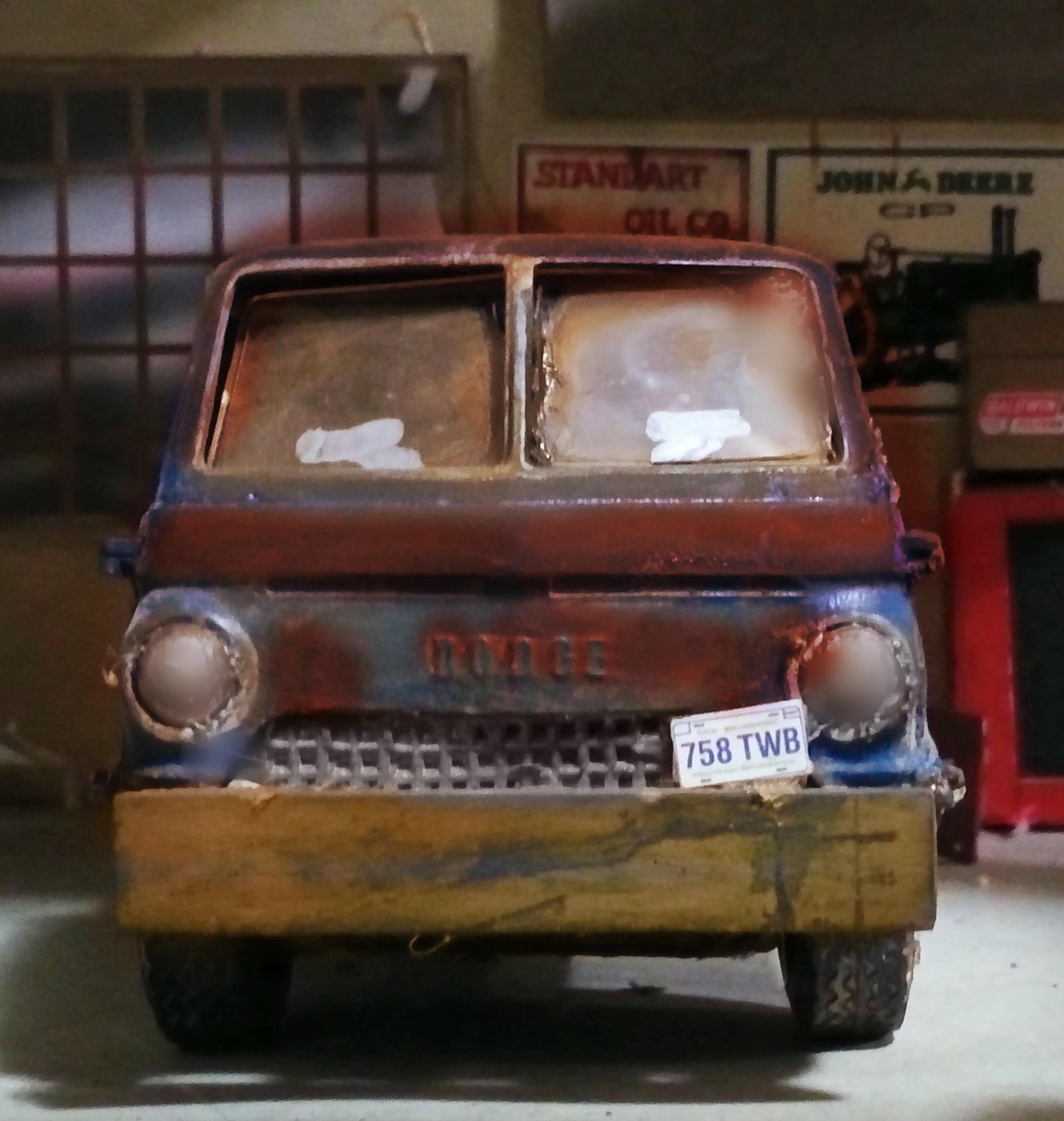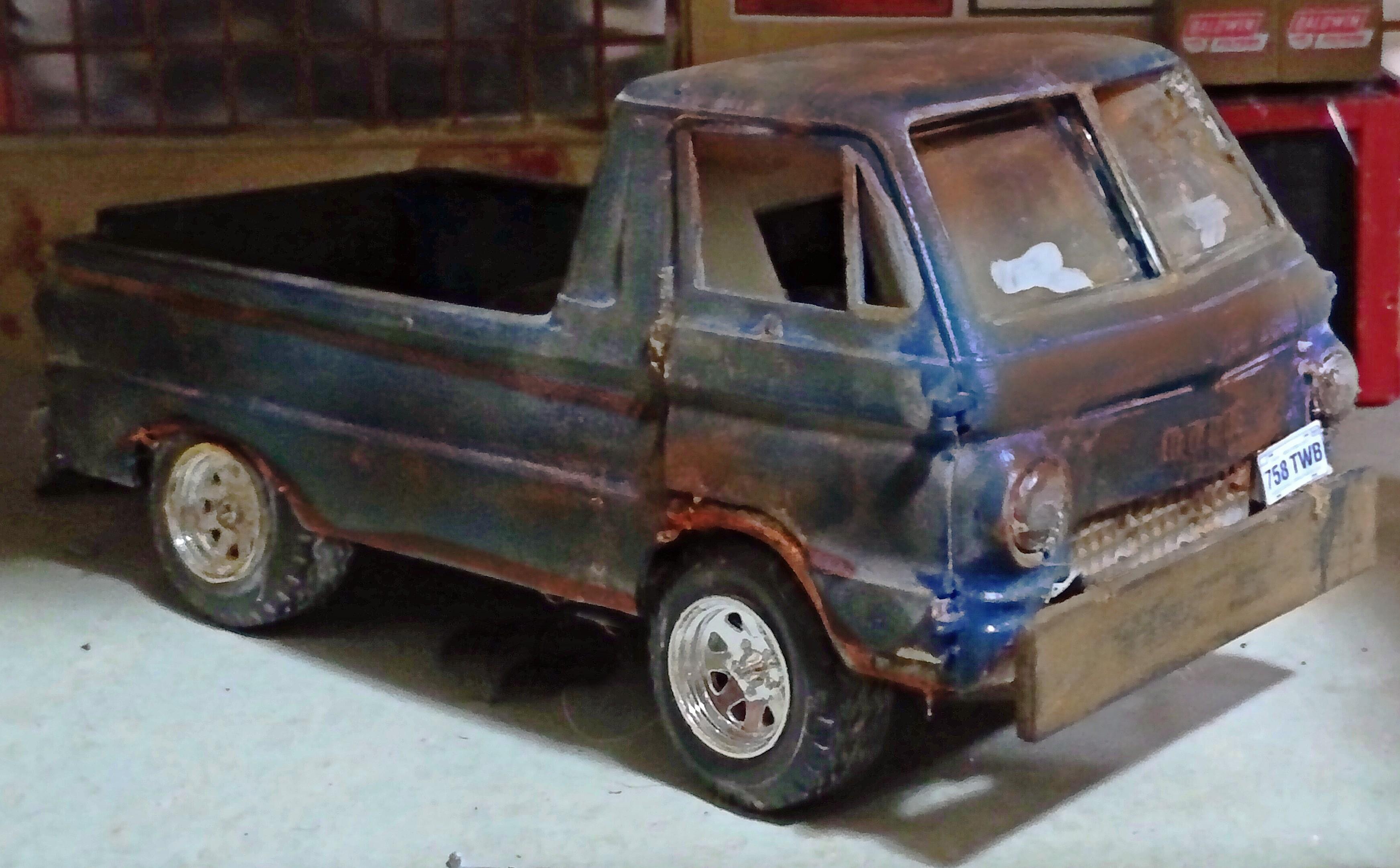 I started with a horrible gluebomb mess in a taped up box sold to me cheap by a friend. Whereas most stock builds of this are automatics, this one is a 3 on the tree instead of the kit supplied pushbutton automatic transmission, with a 273 V8 engine, aged/distressed Marlin Blue paint with simulated body damage, wood front bumper, ferric oxide corrosion all over with the deepest in the passenger's wheel arch and lower door, in the cab floor, & in both rocker panels. Grille was absent from the partially built gluebomb and pile of parts I purchased for a great price, so was replaced with cross stitching mesh made to look like chain link poultry fencing, Monogram all-terrain tires and parts bin seats/steering wheel/column round out the build. Weathering done with artist's oil paints, talcum powder, ground chalk pastels, and Tamiya & homemade washes, body damage was done by steel wooling the bare plastic and heating both doors/the tailgate with a bick lighter, then using the blunt ends of hand tools to distort them & flash cooling them in my freezer. I finished it off with New Brunswick license plates to fit with the rusty, greasy, creaky look/feel of the build and can call it finished now.