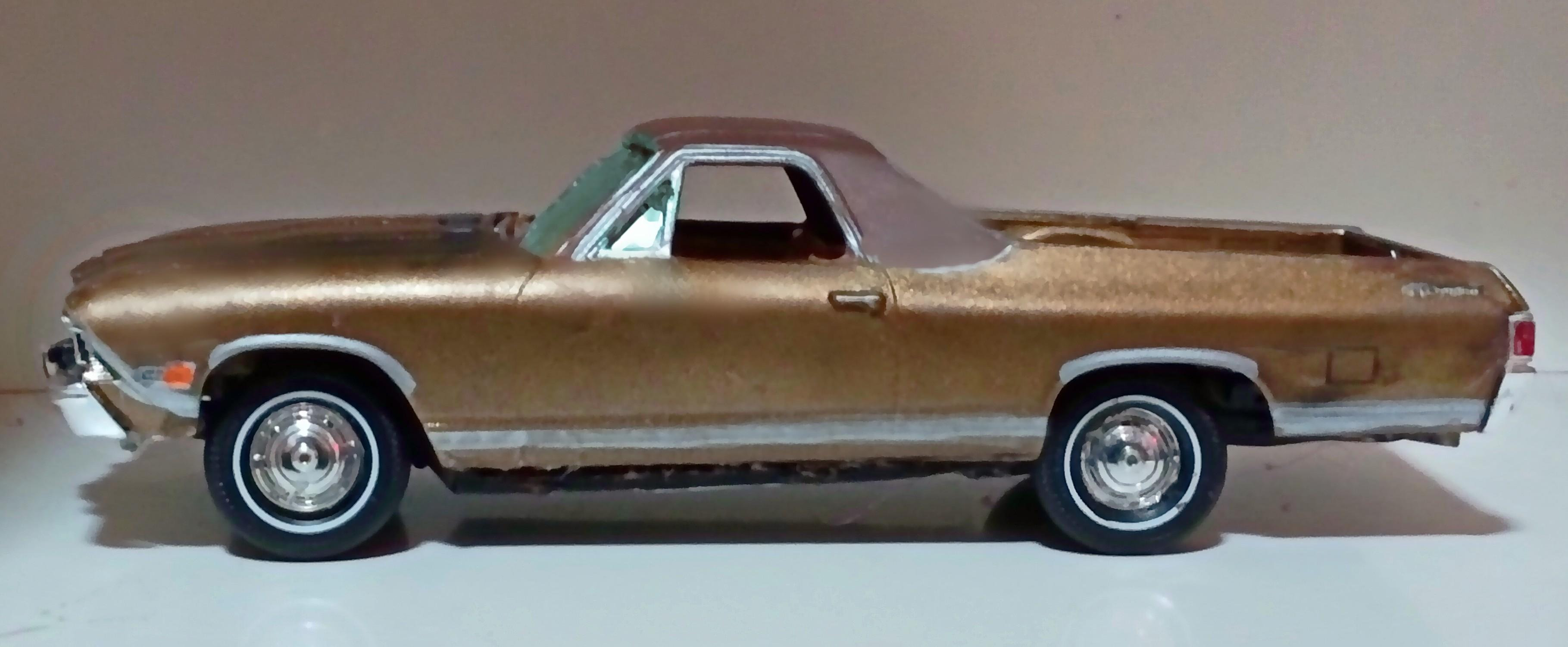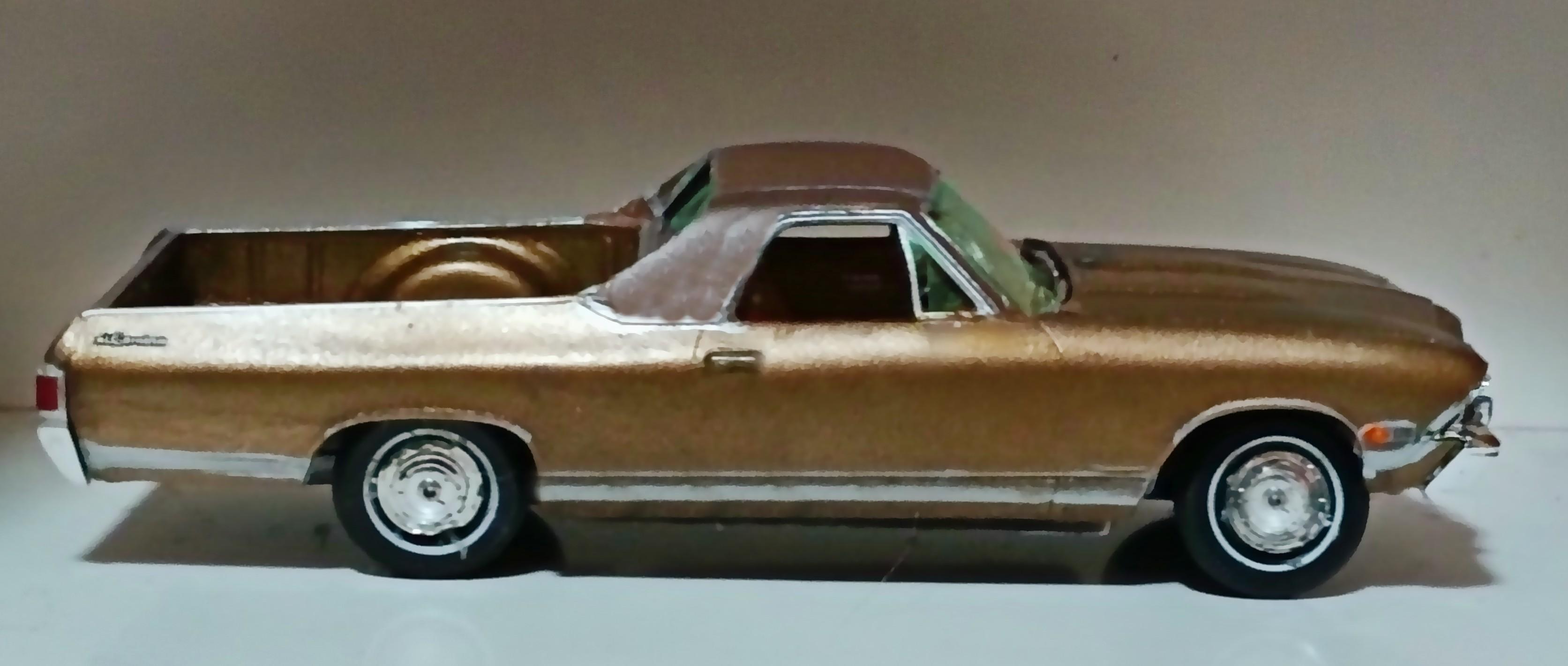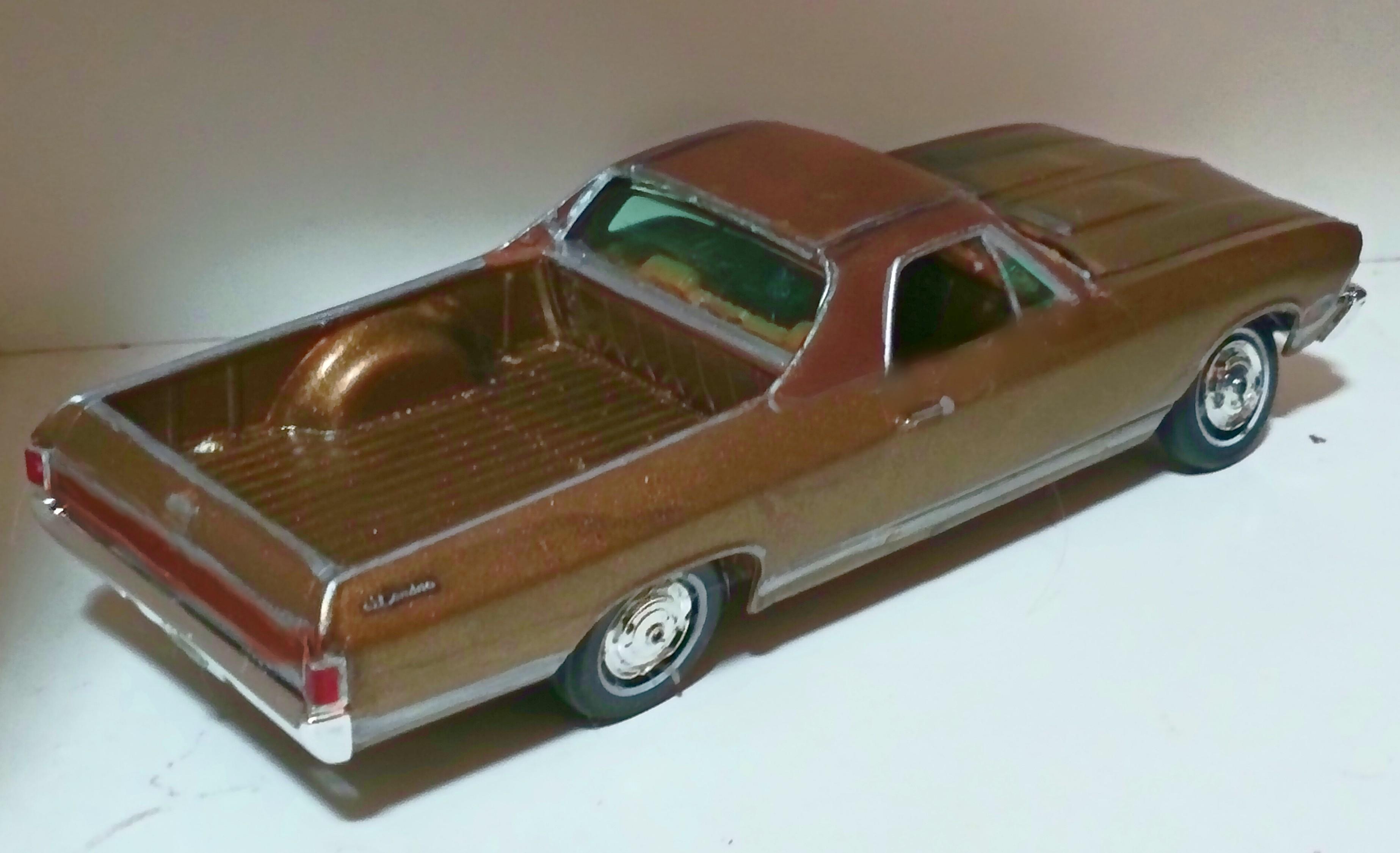 Finished 1/25 scale AMT '68 Chevy El Camino. I converted this kit to a 307/TH350 powered, Burnished Brown with saddle top/interior and SoftRay tinted glass, bench seat interior, non-SS example with full stainless steel hubcaps and whitewall Firestone Supreme tires. There was no clearance for the air filter on the carburetor, so I glued the hood shut reluctantly to make a promo-style or curbside build.