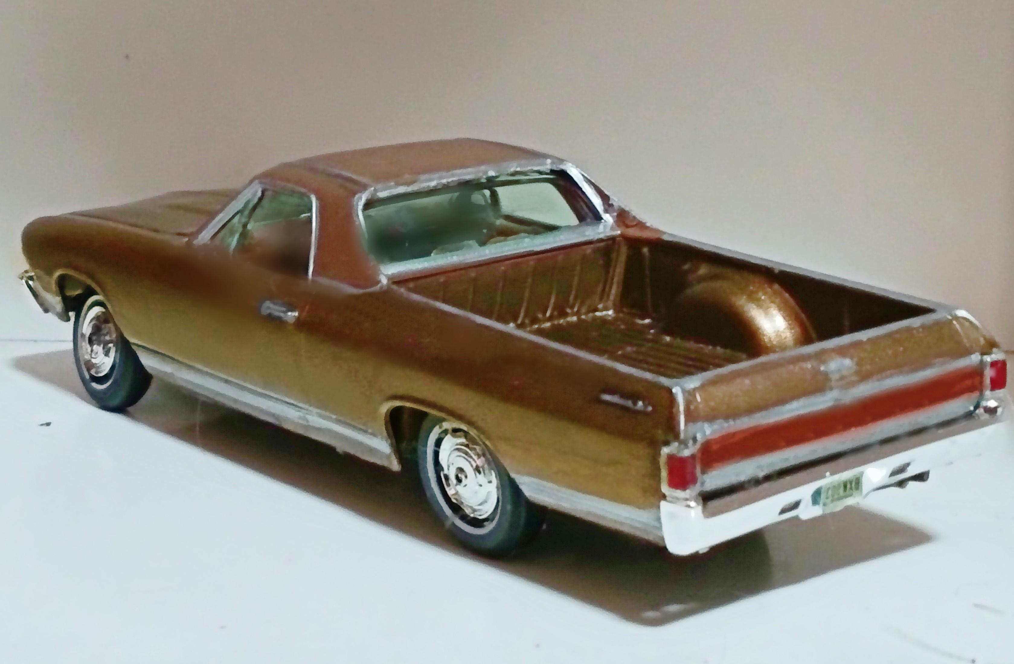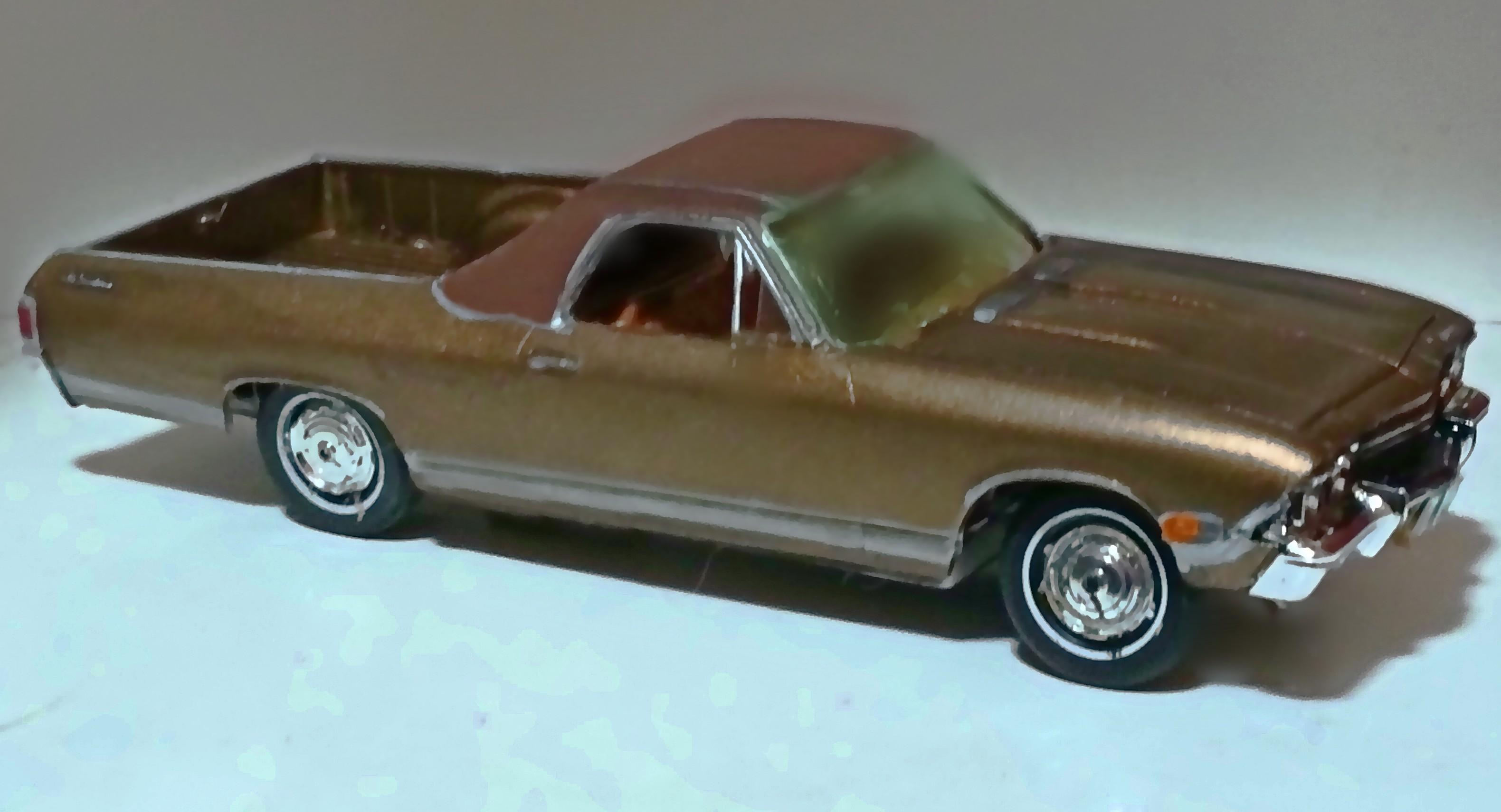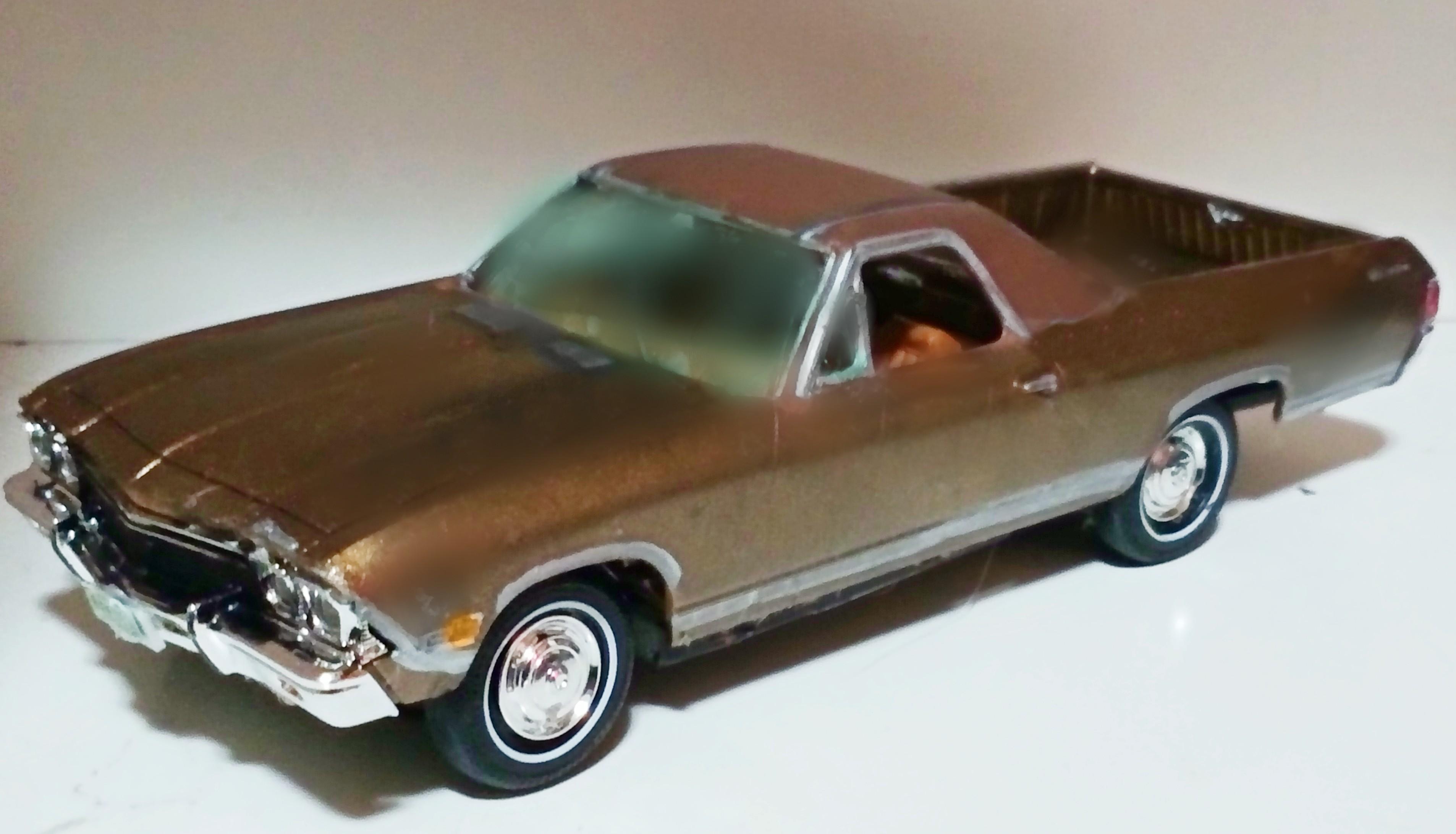 Finished 1/25 scale AMT '68 Chevy El Camino. I converted this kit to a 307/TH350 powered, Burnished Brown with saddle top/interior and SoftRay tinted glass, bench seat interior, non-SS example with full stainless steel hubcaps and whitewall Firestone Supreme tires. There was no clearance for the air filter on the carburetor, so I glued the hood shut reluctantly to make a promo-style or curbside build.