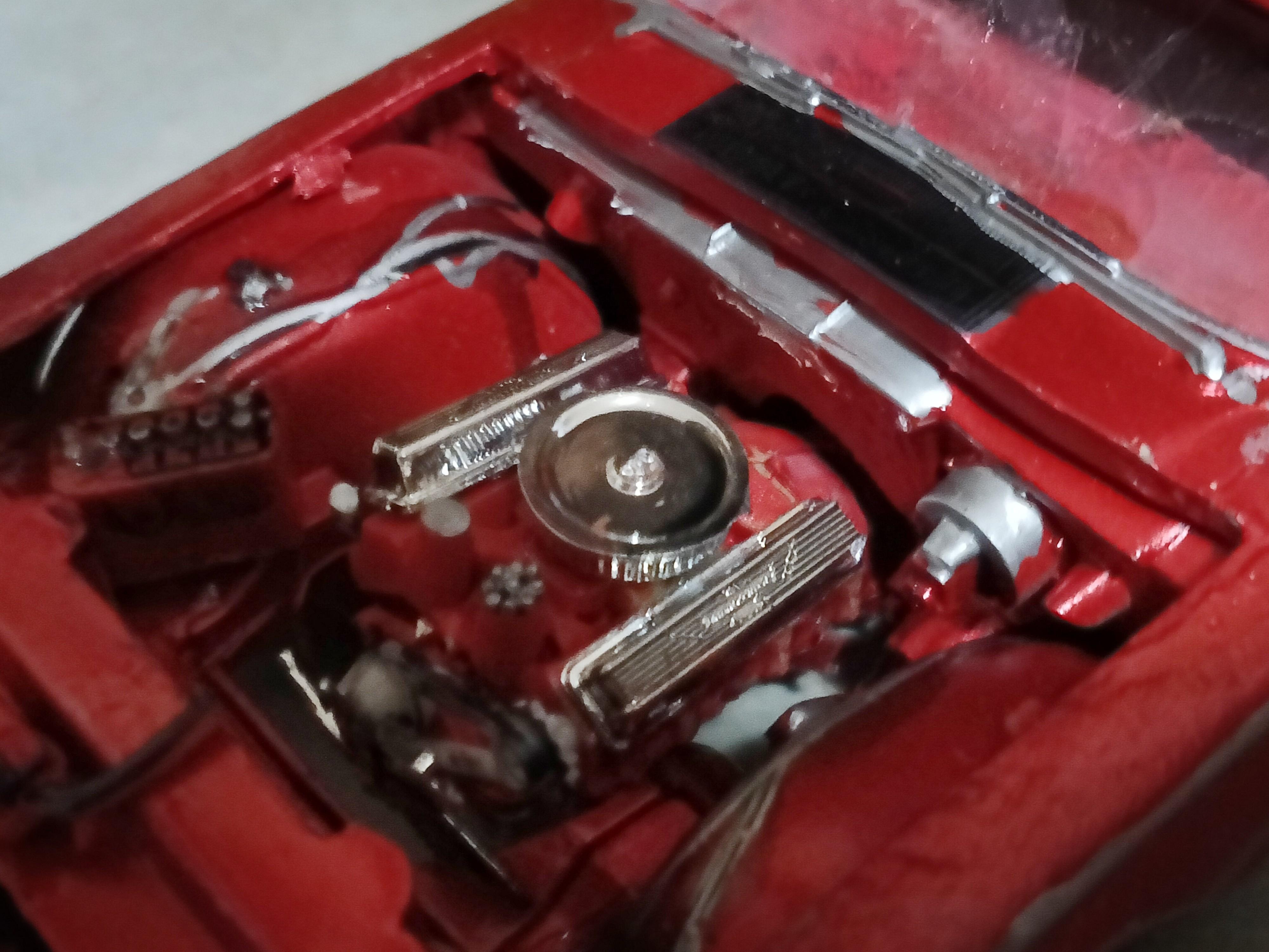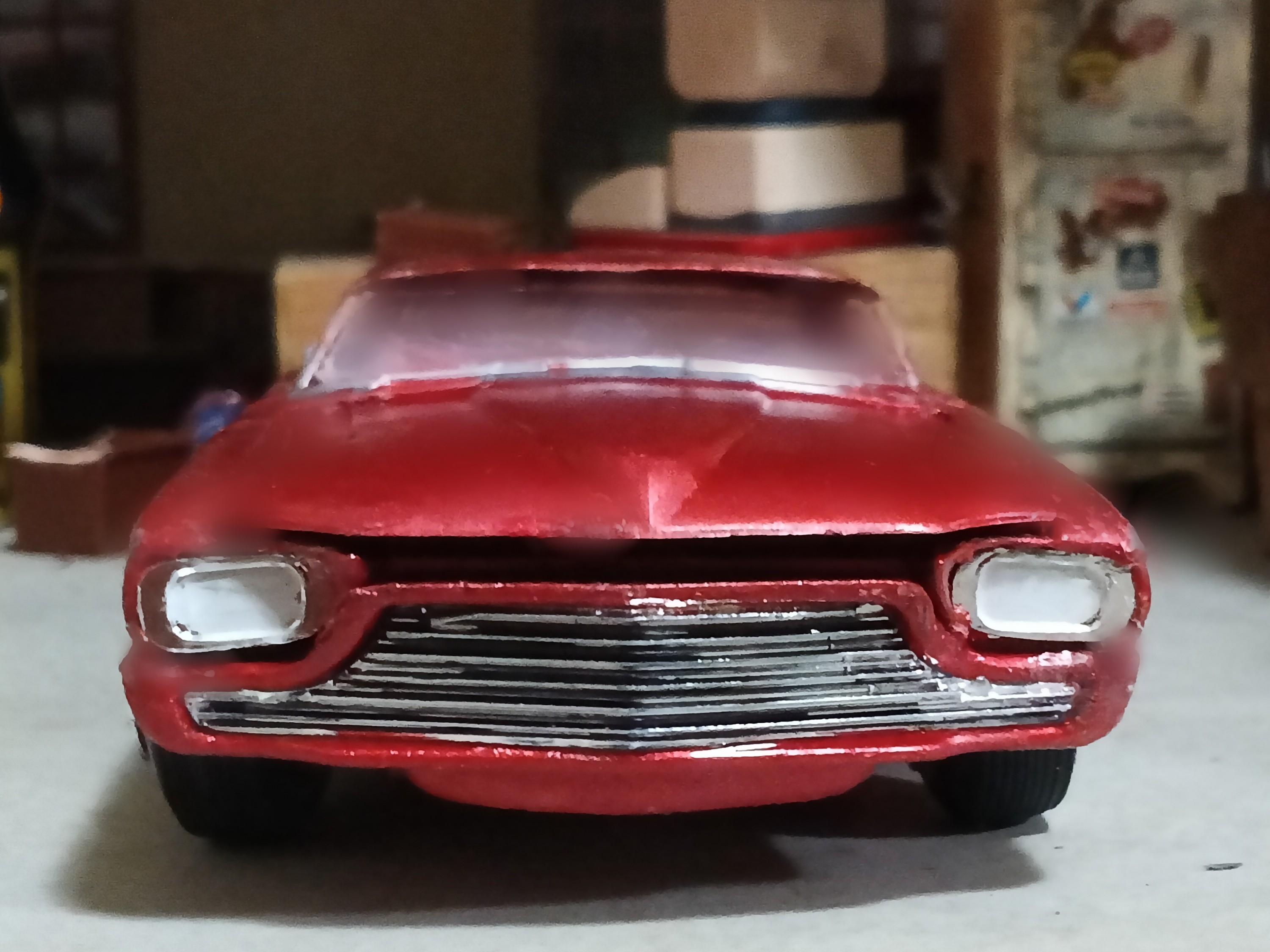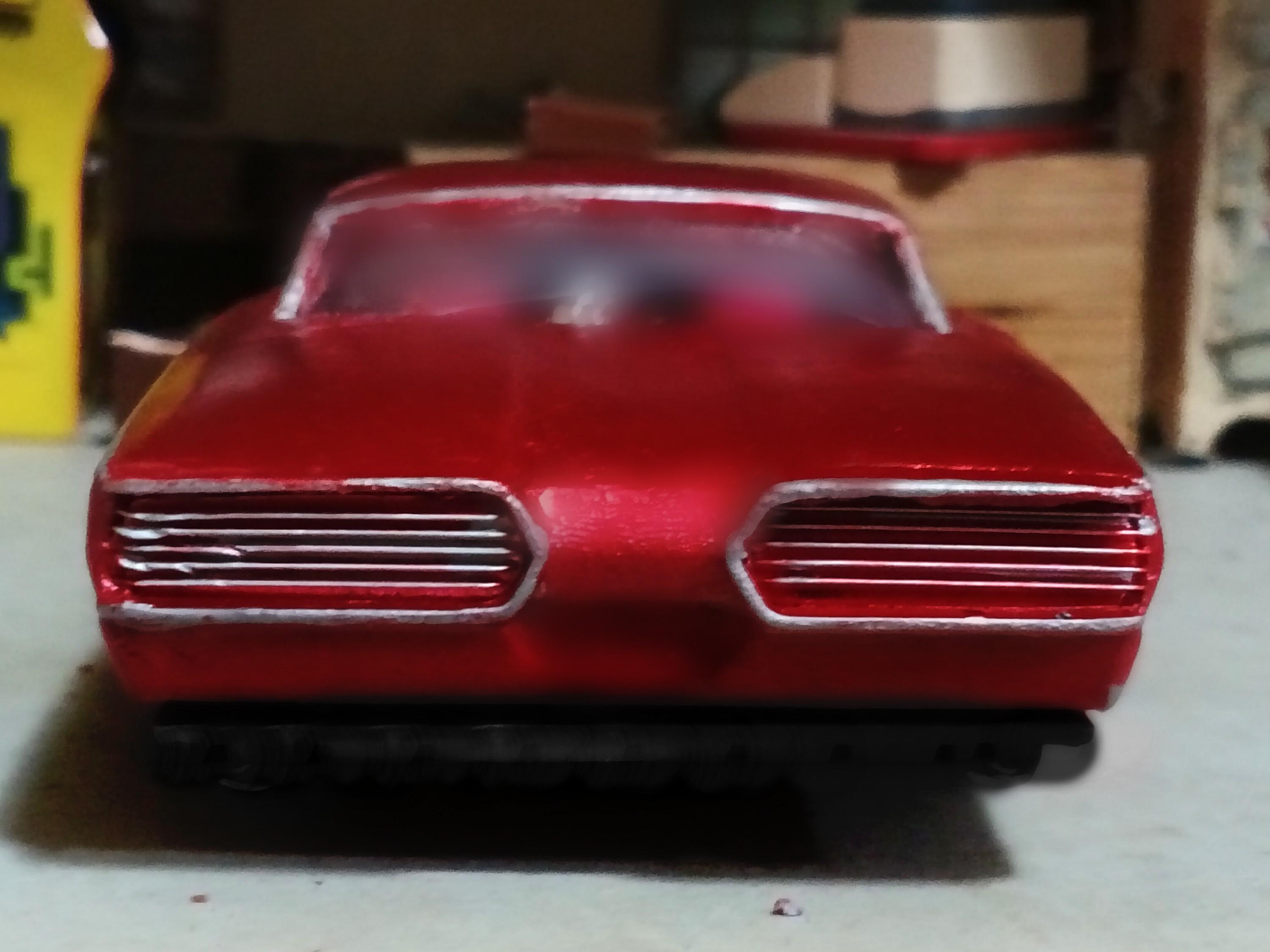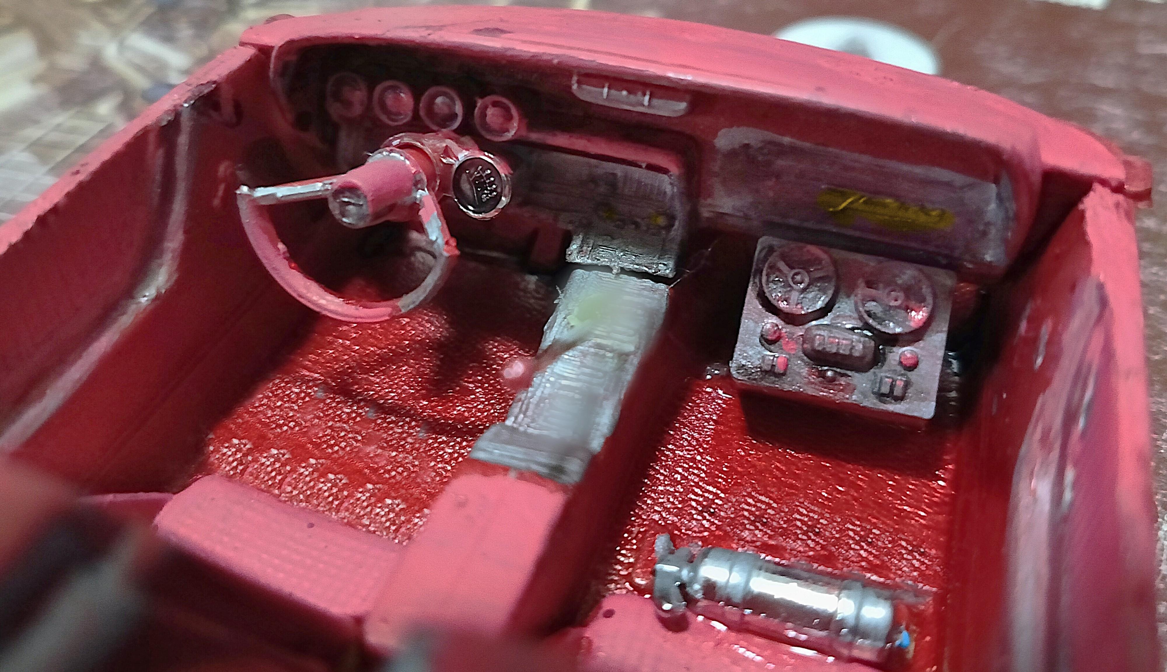 Primered/sealed and mocked up on wheels/tires. A steering shaft and lots of chrome will occupy the underhood area and decorate the 428 big block V8. Since these photos, I sanded it a bit more and laid down a coat of Tamiya metallic red.