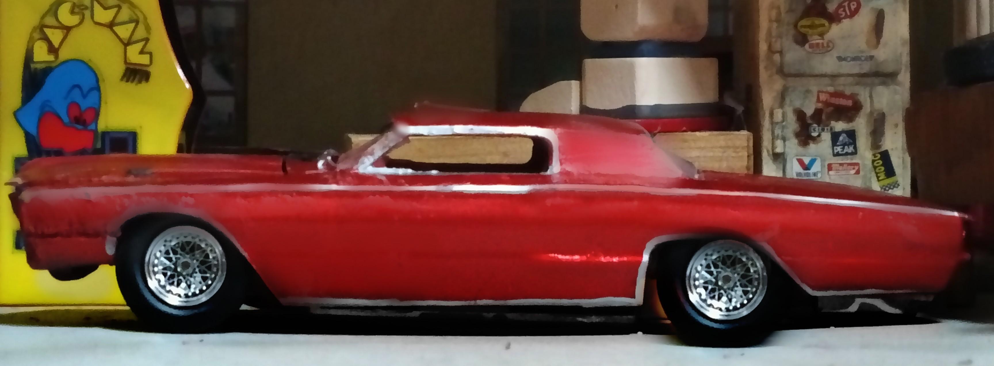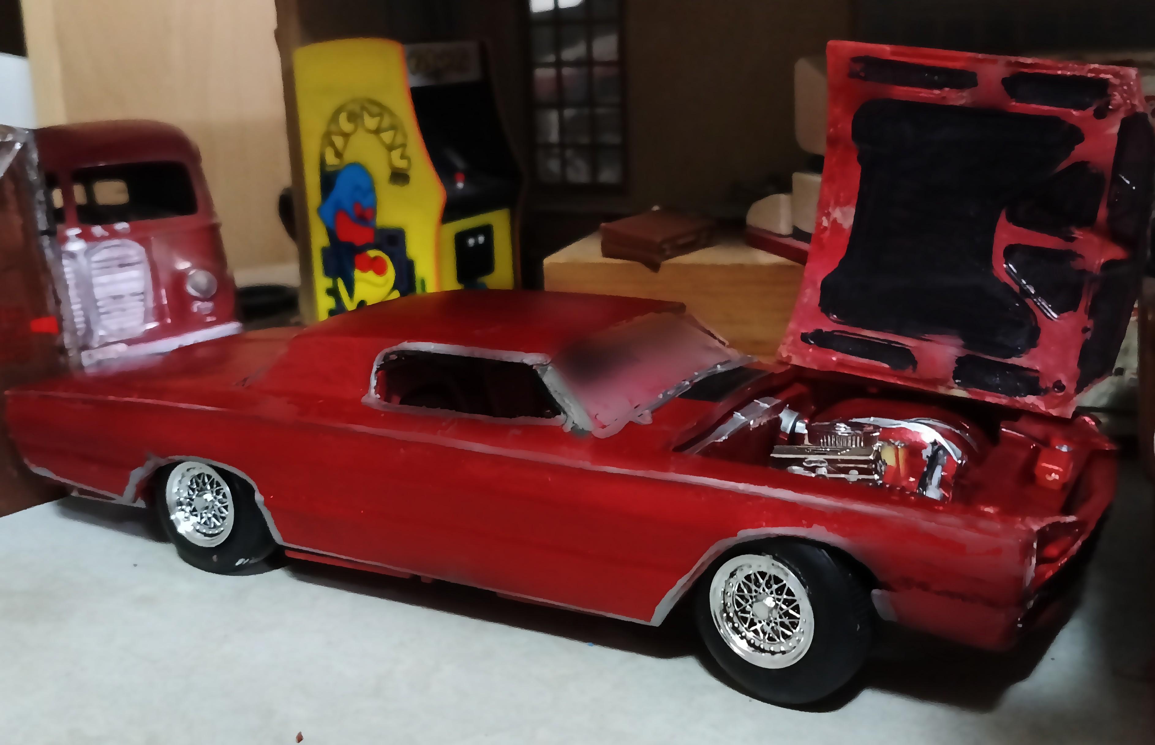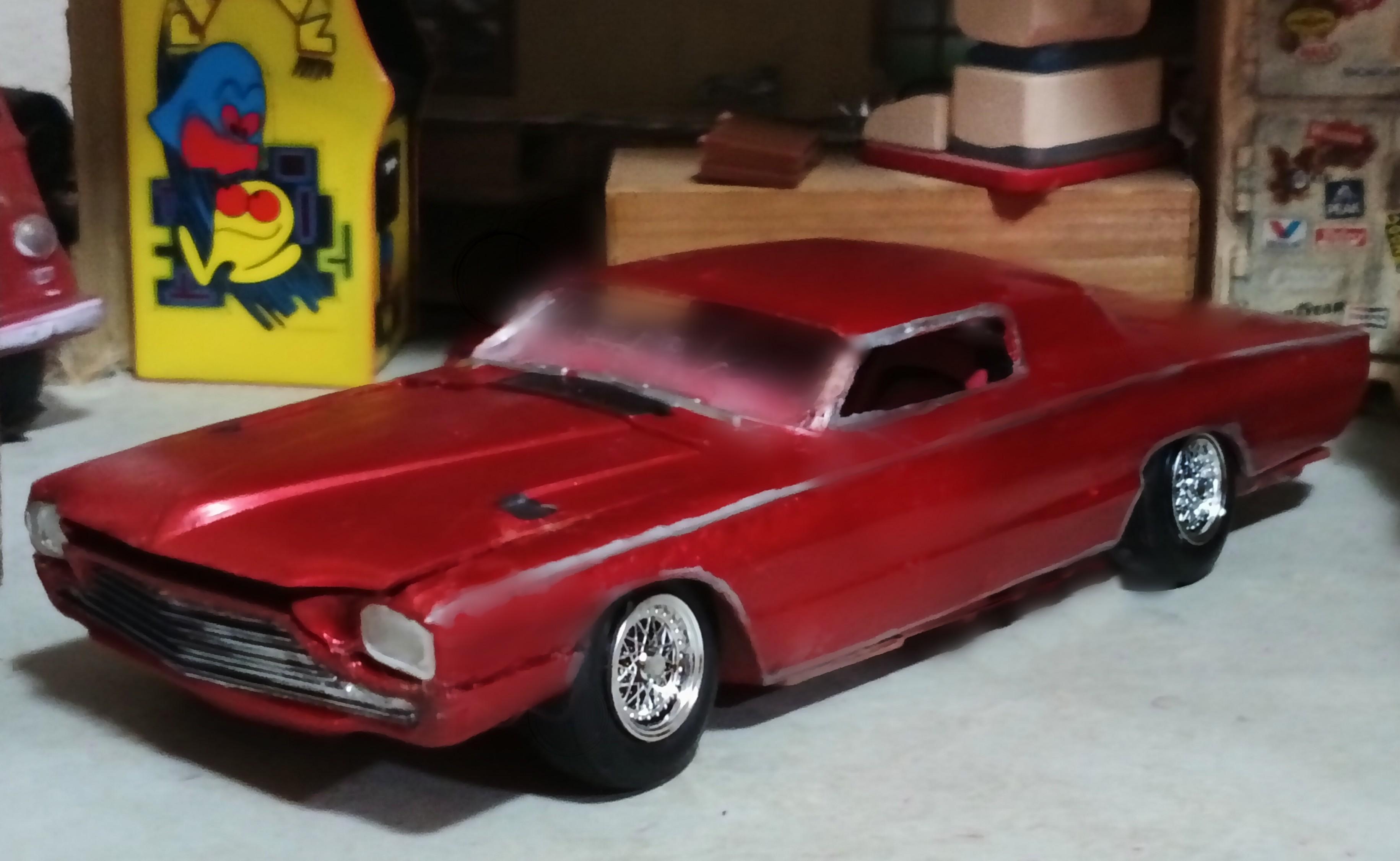 Finished build of AMT's Walmart exclusive Customizing Series '66 Thunderbird as a 70s era full custom with my first effort at a chopped top (it went well enough that I want to attempt a chopped AMT '53 Studebaker also, using kit supplied top/glass this time), the front glass switched for rear with custom rear glass, and almost every part worked over. Paint is Tamiya Color metallic red.