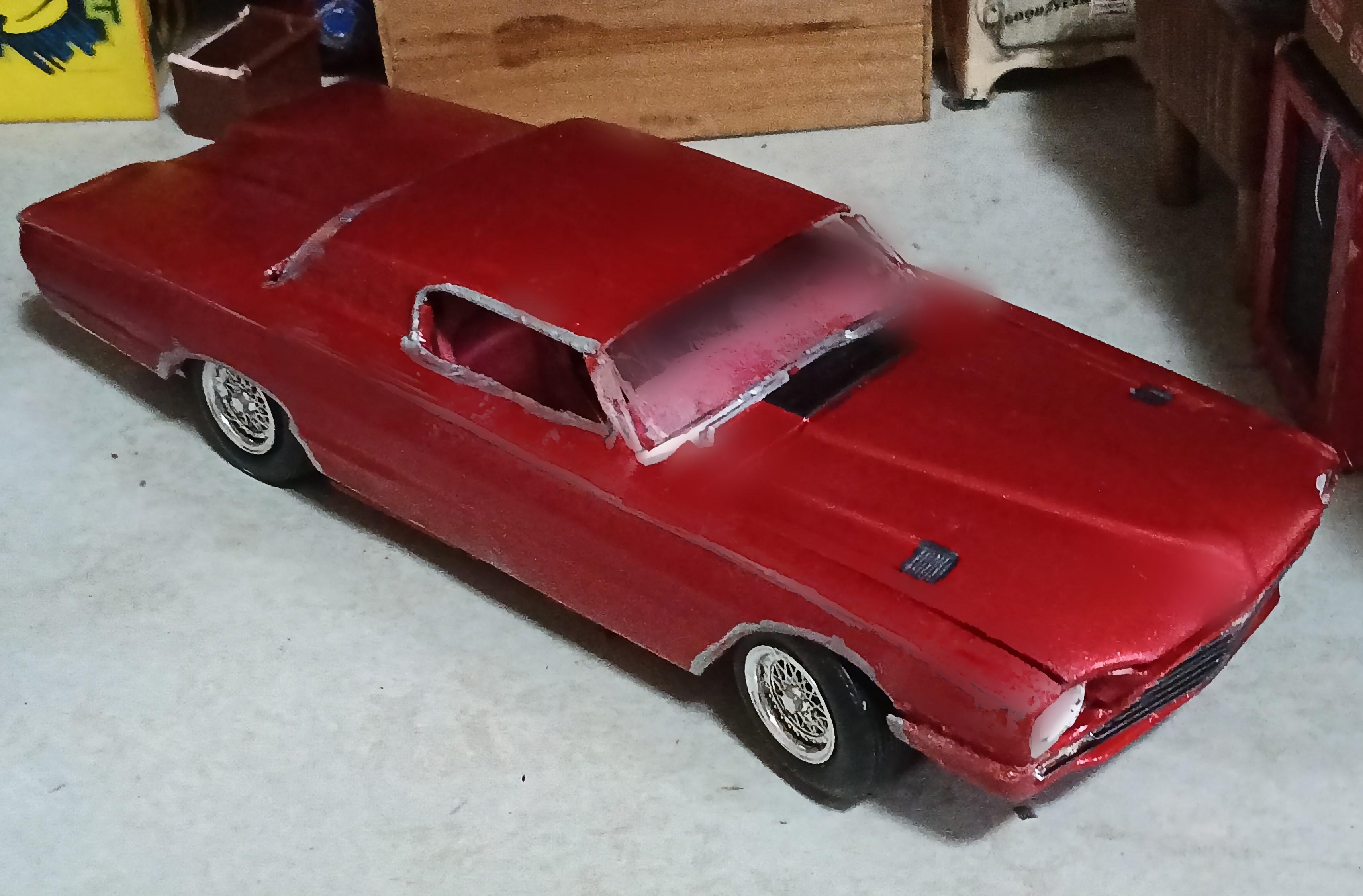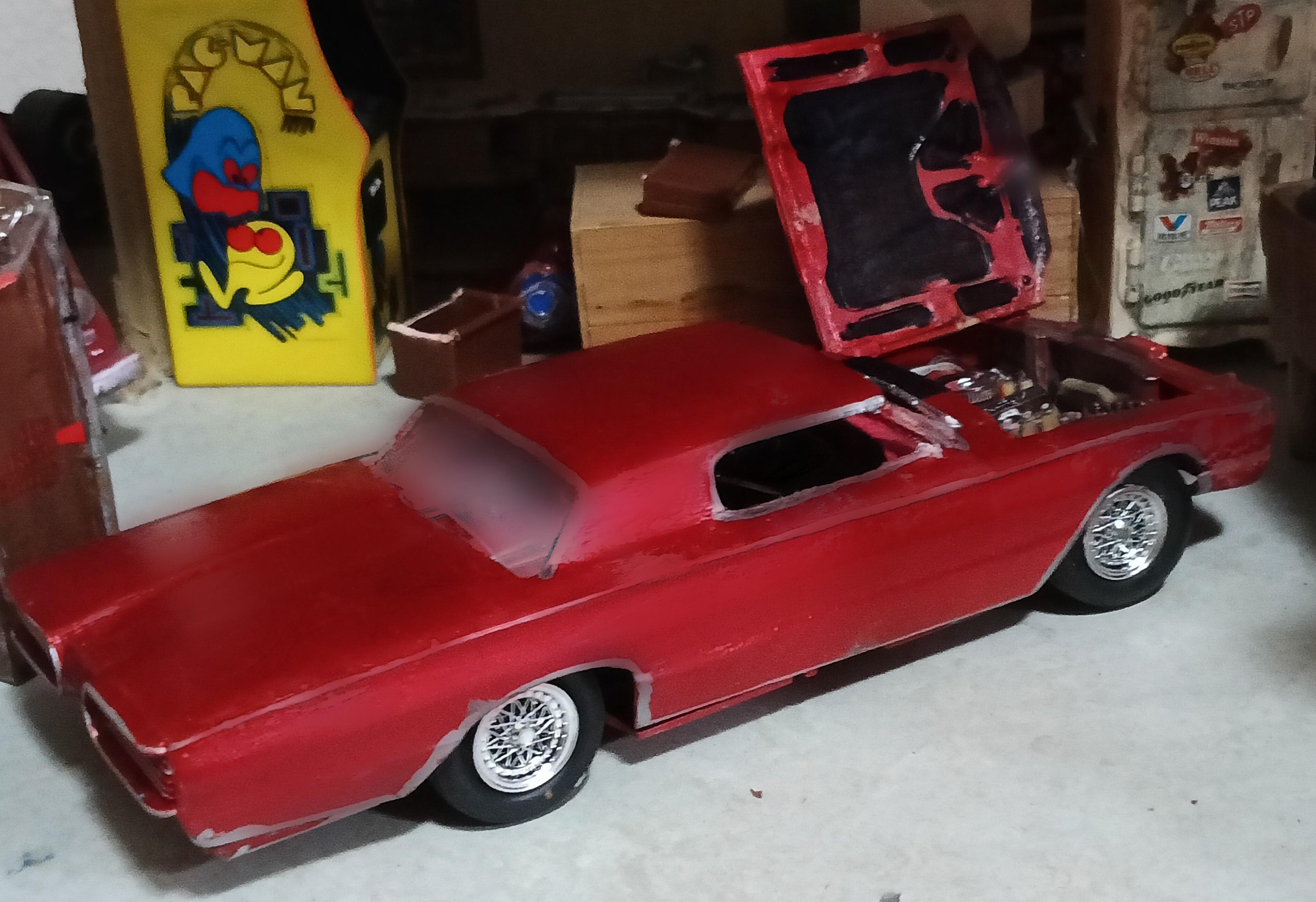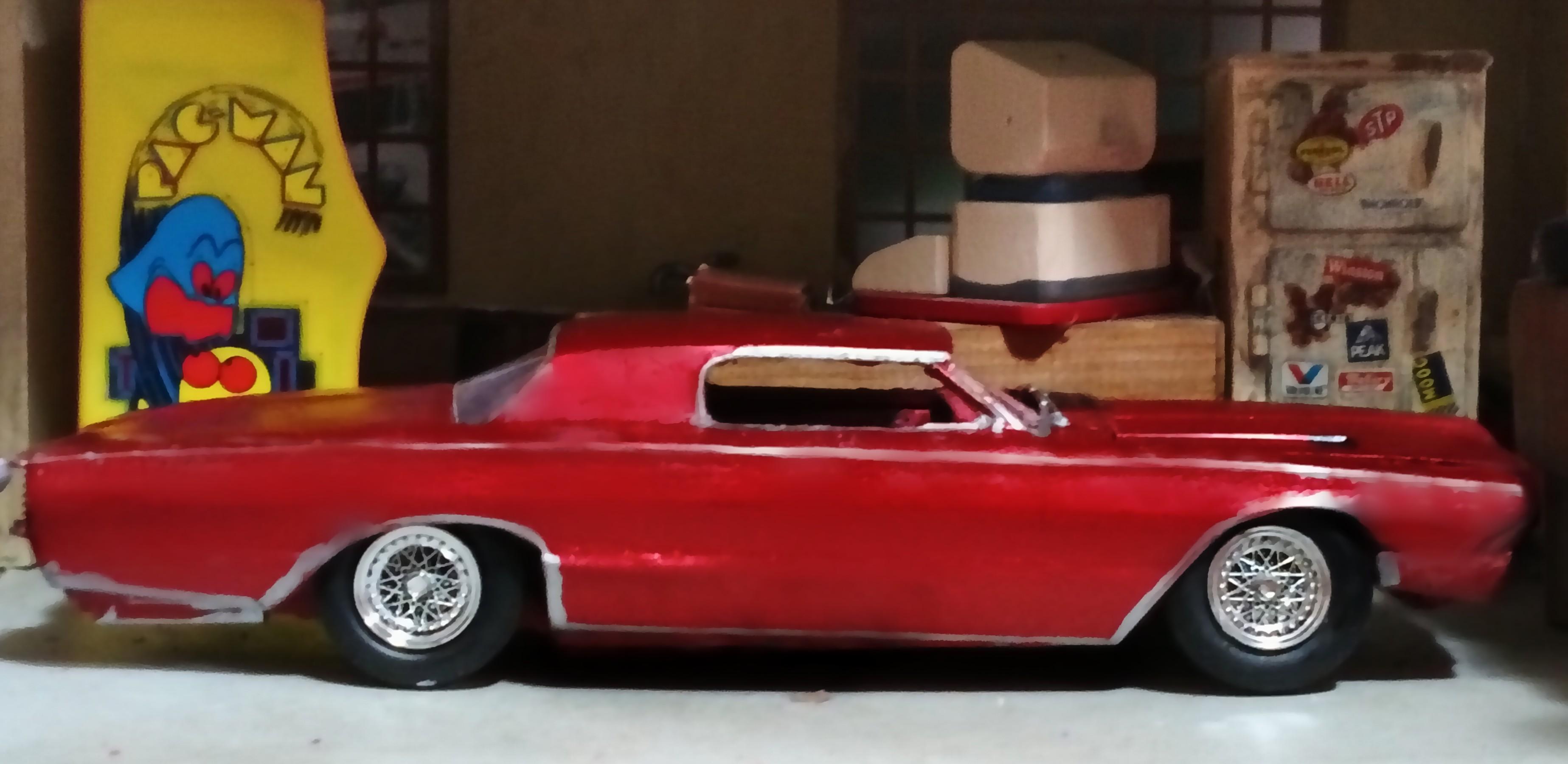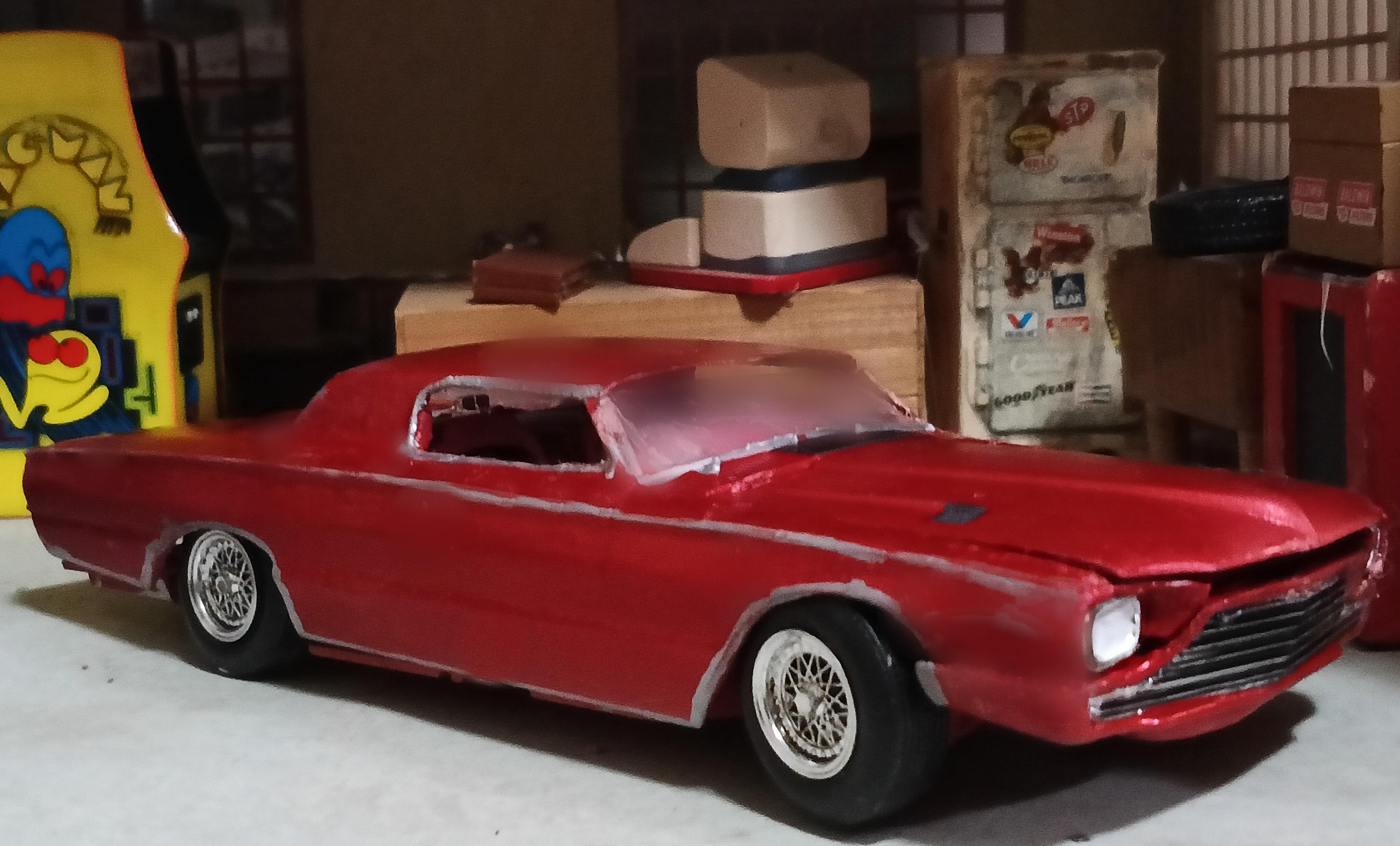 Finished build of AMT's Walmart exclusive Customizing Series '66 Thunderbird as a 70s era full custom with my first effort at a chopped top (it went well enough that I want to attempt a chopped AMT '53 Studebaker also, using kit supplied top/glass this time), the front glass switched for rear with custom rear glass, and almost every part worked over. Paint is Tamiya Color metallic red.