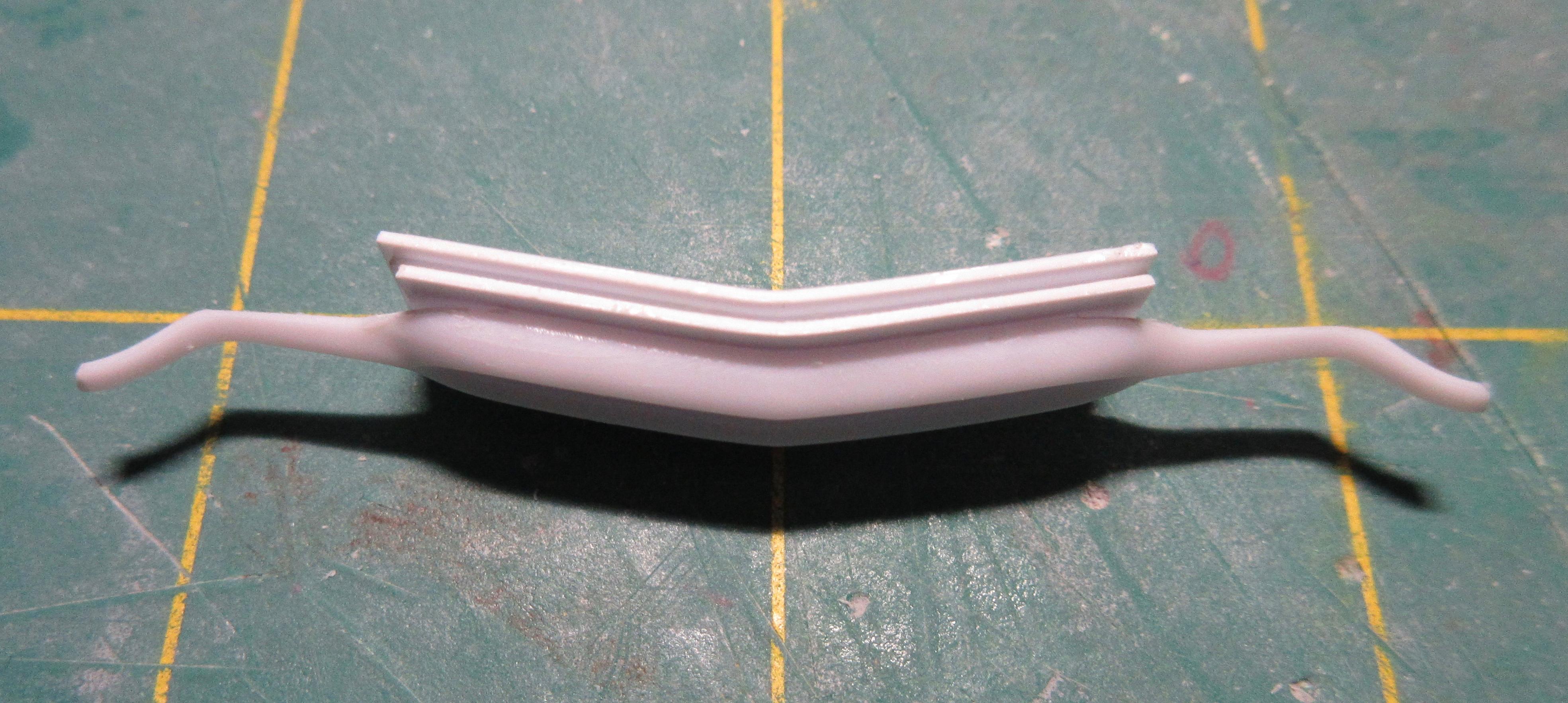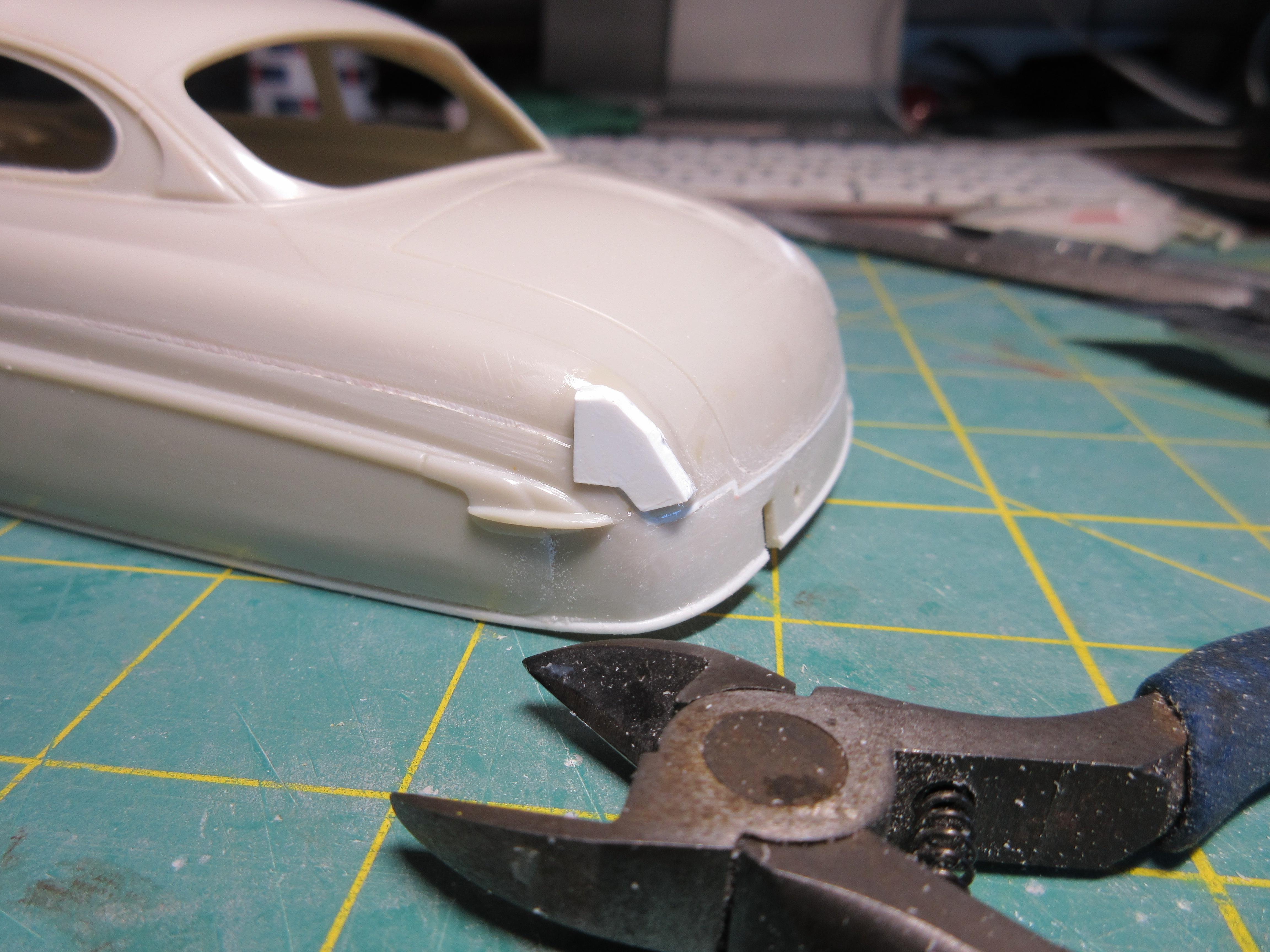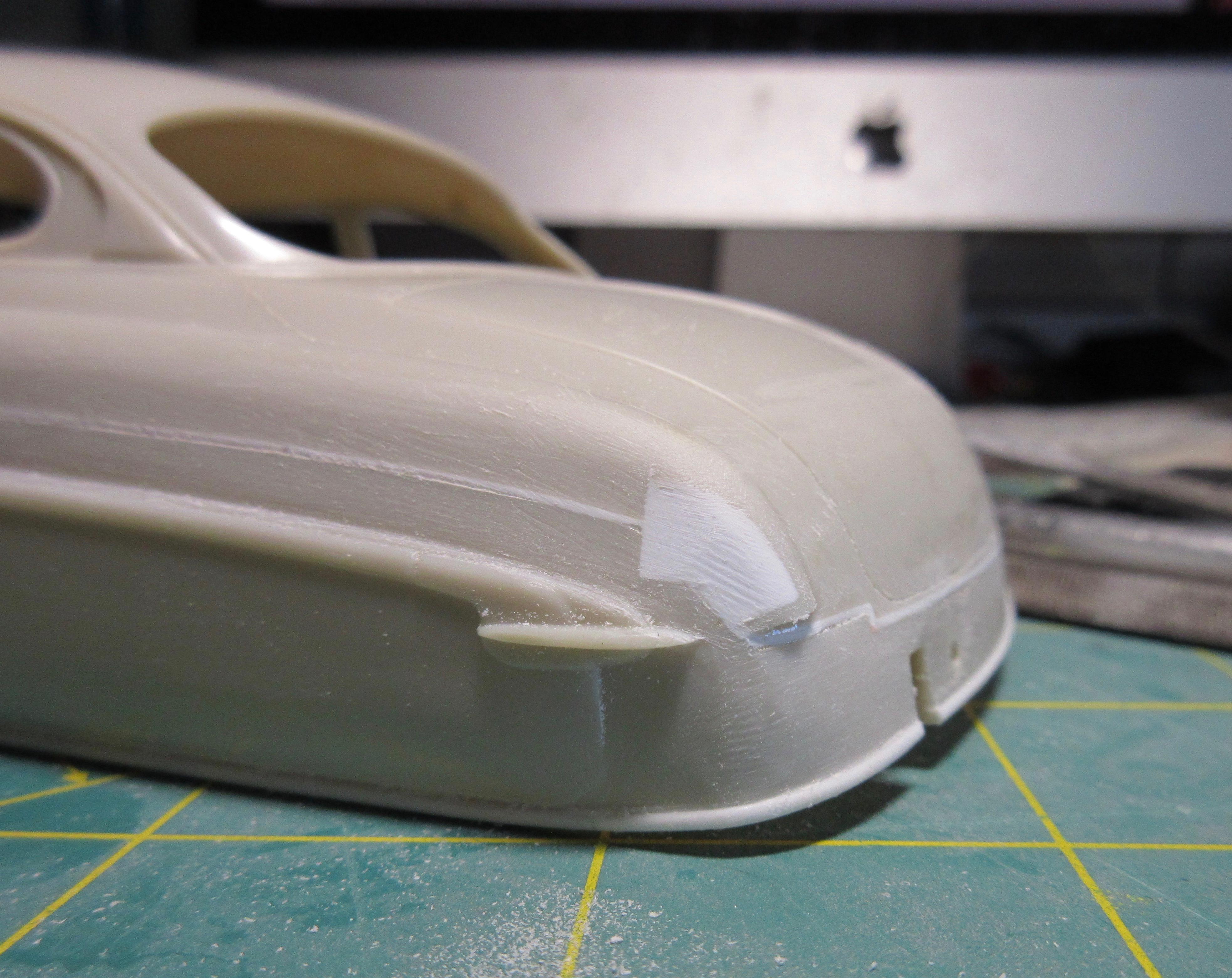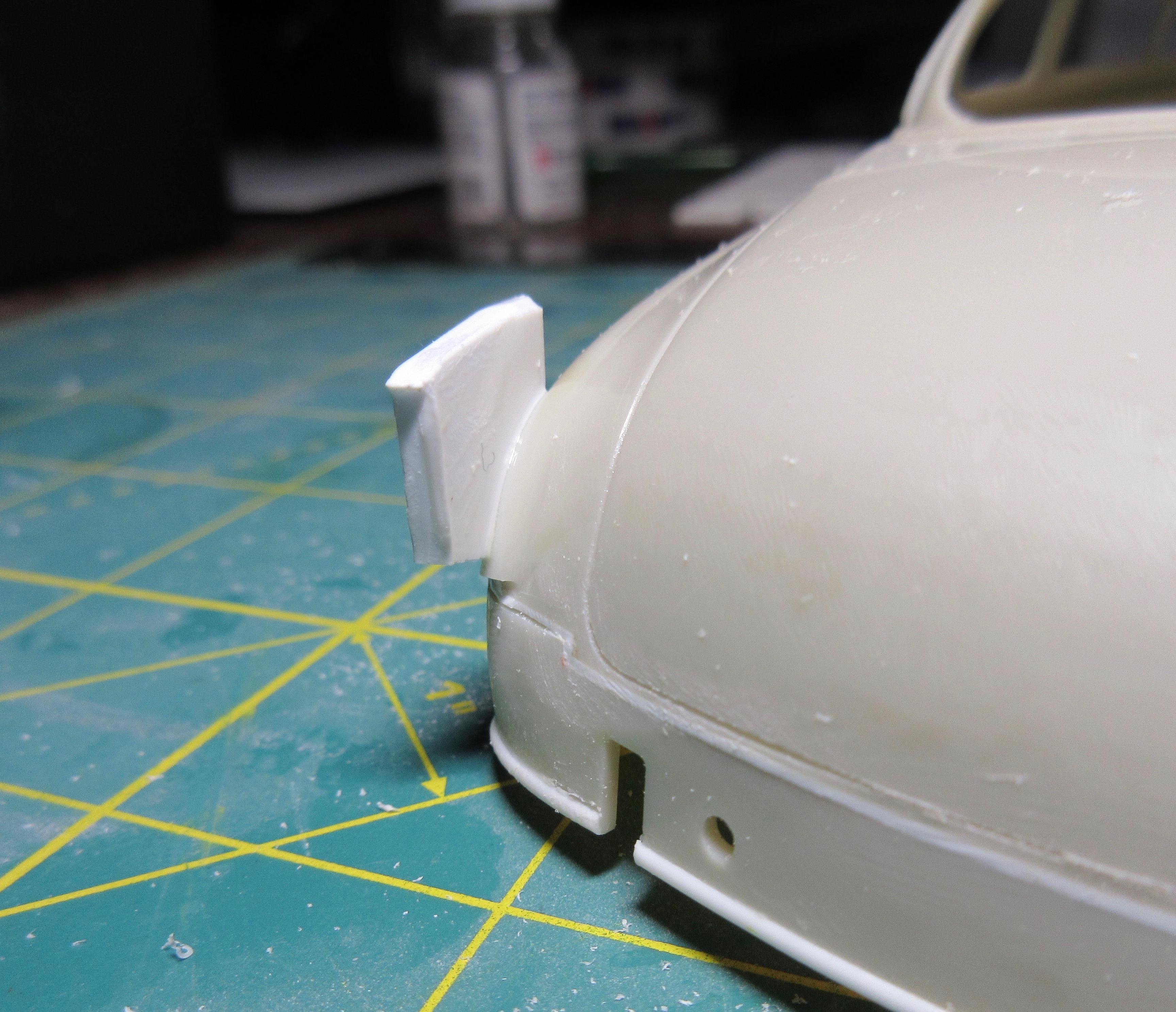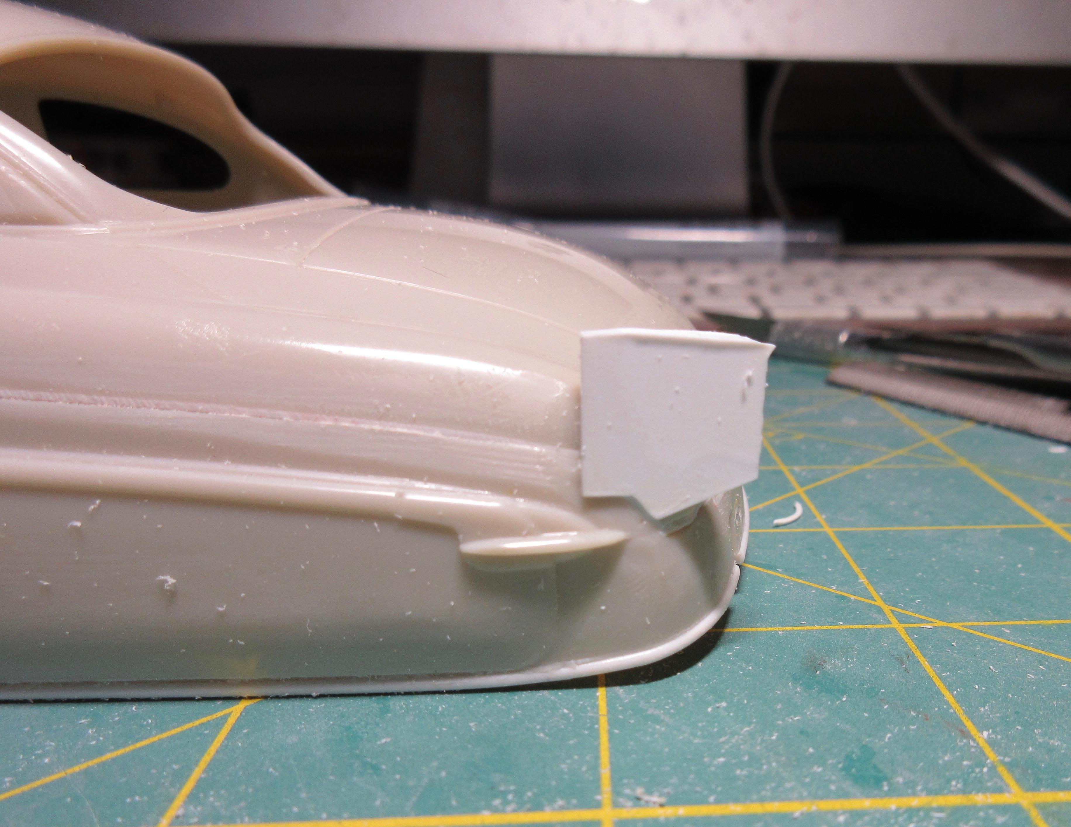 Got some work done on this. I decided instead of trying to get the small sections of .040 1/2 round, at the rear, to match the existing lower rocker trim, I decided to just remove it all and replace it with .040 half round. It was easier than trying to match what was there and it is all consistent now and looks good: I filled the hole in the trunk lid. Just needs shaping: I had to fill the fuel door before I could fit the taillight bezels. I didn't want to cut out too much as I wanted to be able to easily reshape it to look stock. It was an odd shape to fill, I used a piece of .080 sheet. It wasn't that bad to shape in the end, just an odd shaped piece: Another shot of the filler piece. I left lots of extra. To install the filler piece, I cut out the the fuel filler door area, creating a corner. I trued the majority with a knife to create a flat surface for the sheet to glue too. You can see it's a nice tight fit: Next I used my side cutters to bring it down as much as I could before shaping with a knife and file: And here the filler piece is rough shaped. I'll fine tune it before adding the taillight bezels. It still needs to be curved and contoured to the body shape: I cut the taillight bezels free from the trim bar intended for the rear. I have rough shaped them in the picture, cutting away excess trim. They will be further shaped and reduced when fitted to the body: And here you can see the taillights glued in place. The fuel door filler and side of the car has been final shaped: These taillight bezels were really hard to fit. It required a lot of cutting away of a little material, fitting and repeating. I thought I had one side done, and glued it on, tried to match the other side but it came out different (thinner). So I glued the other side on, took off the first side and matched it to the second taillight. It was a process. I'm glad it's done. I did my best to get them both in the same location and level and square. I don't believe they are perfect, but they are as close as I could get them: One last shot of the taillight bezels in place. I find it's a game of close enough when doing custom work. I question if the model body and related parts are perfectly symmetrical (I've run into several model bodies that weren't the same side to side, but you can't tell unless you measure), if my cuts and modifications are perfectly symmetrical, and if my eyes are seeing it correctly (I wear glasses with progressive lenses and correction for astigmatisms). I take a lot of measurements to double check locations of parts but find it's a matter of splitting the difference so it looks right, rather than being perfect. But I think I got the bezels in locations I can live with: I also started on the grill bar. I didn't get a picture, but the back of the grill center has an angled indent. So I filed the back of the grill bar to create a flat surface for the two ends, leaving the center to be filled. You can see the grill has been glued to some sheet stock in the center: Here you can see what I mean. The center angles in and needs to be filled out then trued with a file before I can start building up the back of the grill bar. I used 3 layers of .020 sheet: Here the sheets of plastic have been trued with a file and the whole grill bar has been glued to a piece of .118 sheet that will require shaping. The ends look funny now, but will be removed during final shaping: I had to build up the grill bar from the back so it will sit forward in the grill cavity where I want it. After shaping, I will most likely need to add even more sheet stock to the back to get it to sit where I want it. All the extra plastic also helps to create a nice strong piece: Thanks for stopping by and having a look! Edit: After these pics were taken, I wound up cutting the driver's side taillight off and moving it in slightly toward center. It just didn't look quite right, too far from the trunk panel line. Not sure if I got it right, but this is were it stands right now. Here's a pic of it: Second Edit: I removed the driver's side taillight one last time and repositioned it slightly. I think I got it where I want it now. This was a real effort, but I think it's good now. No picture. Will post pics later as more work progresses!