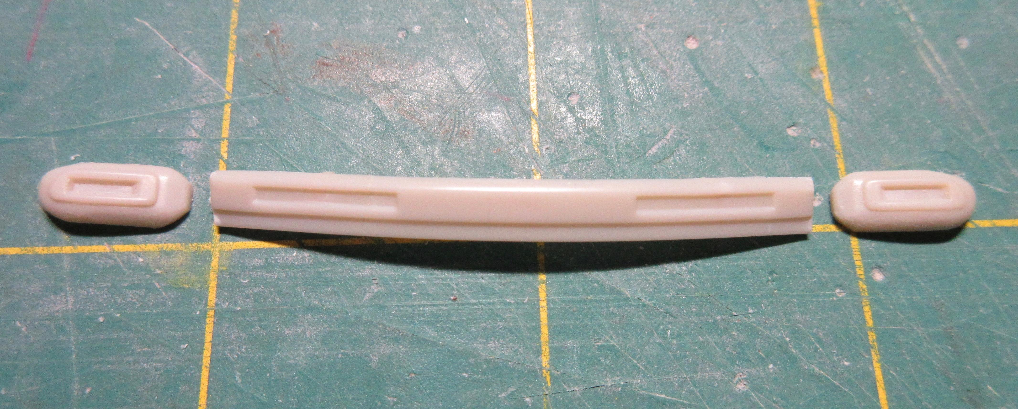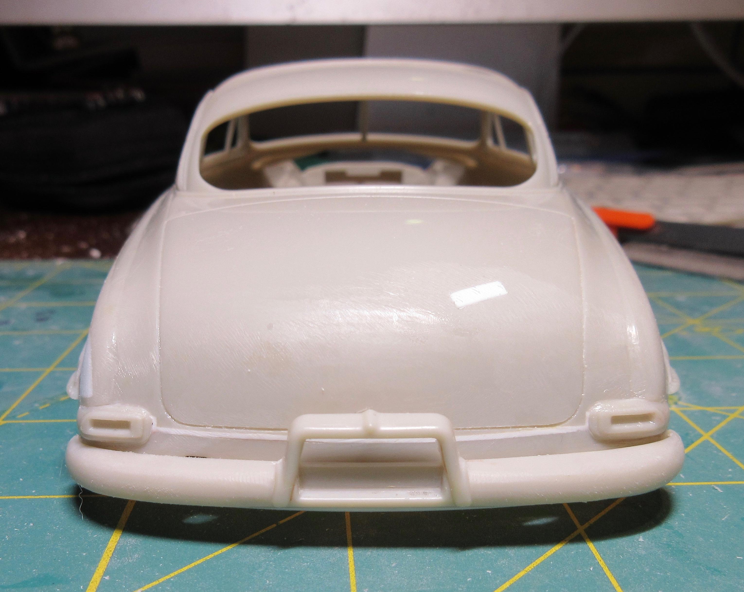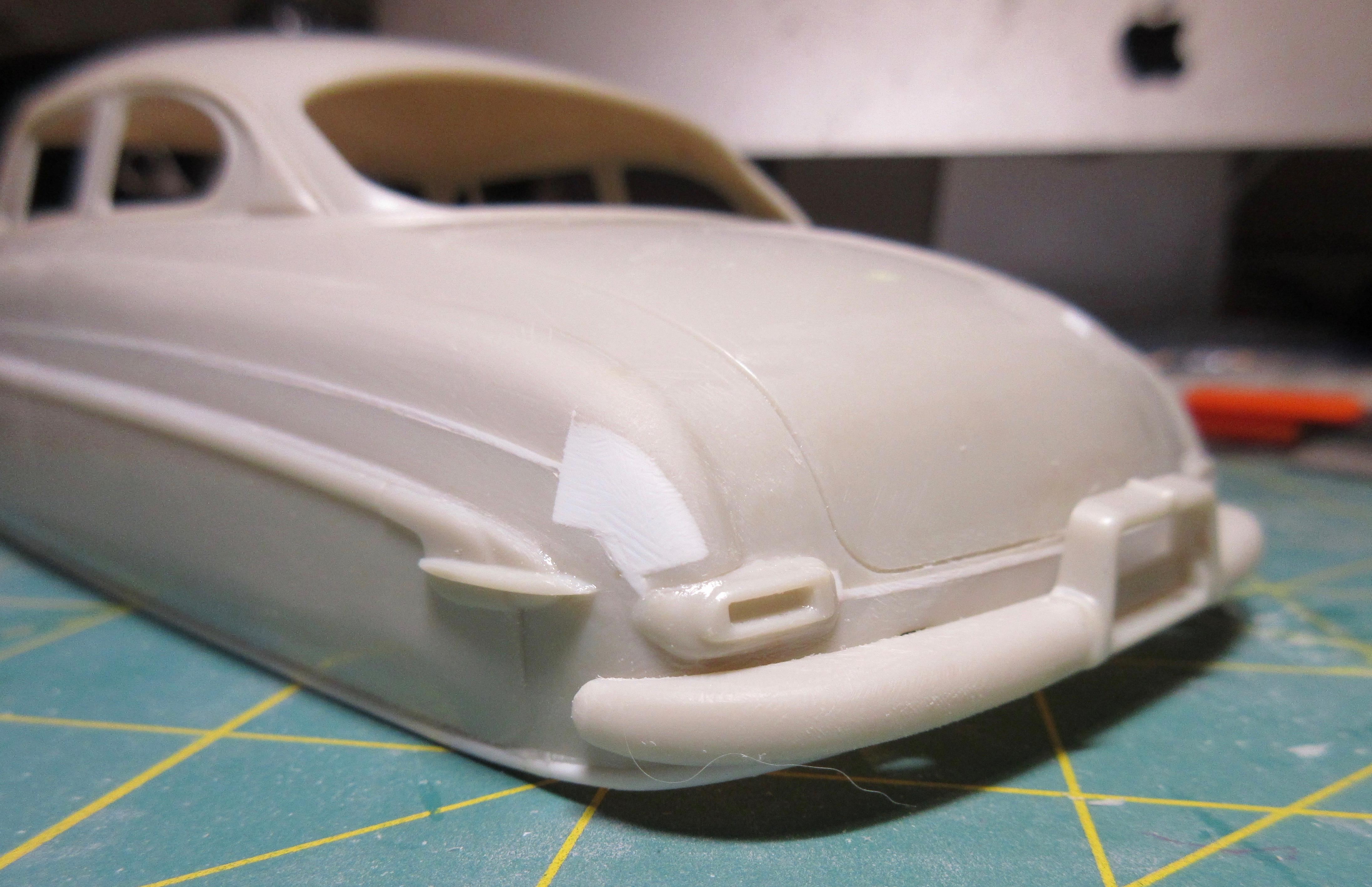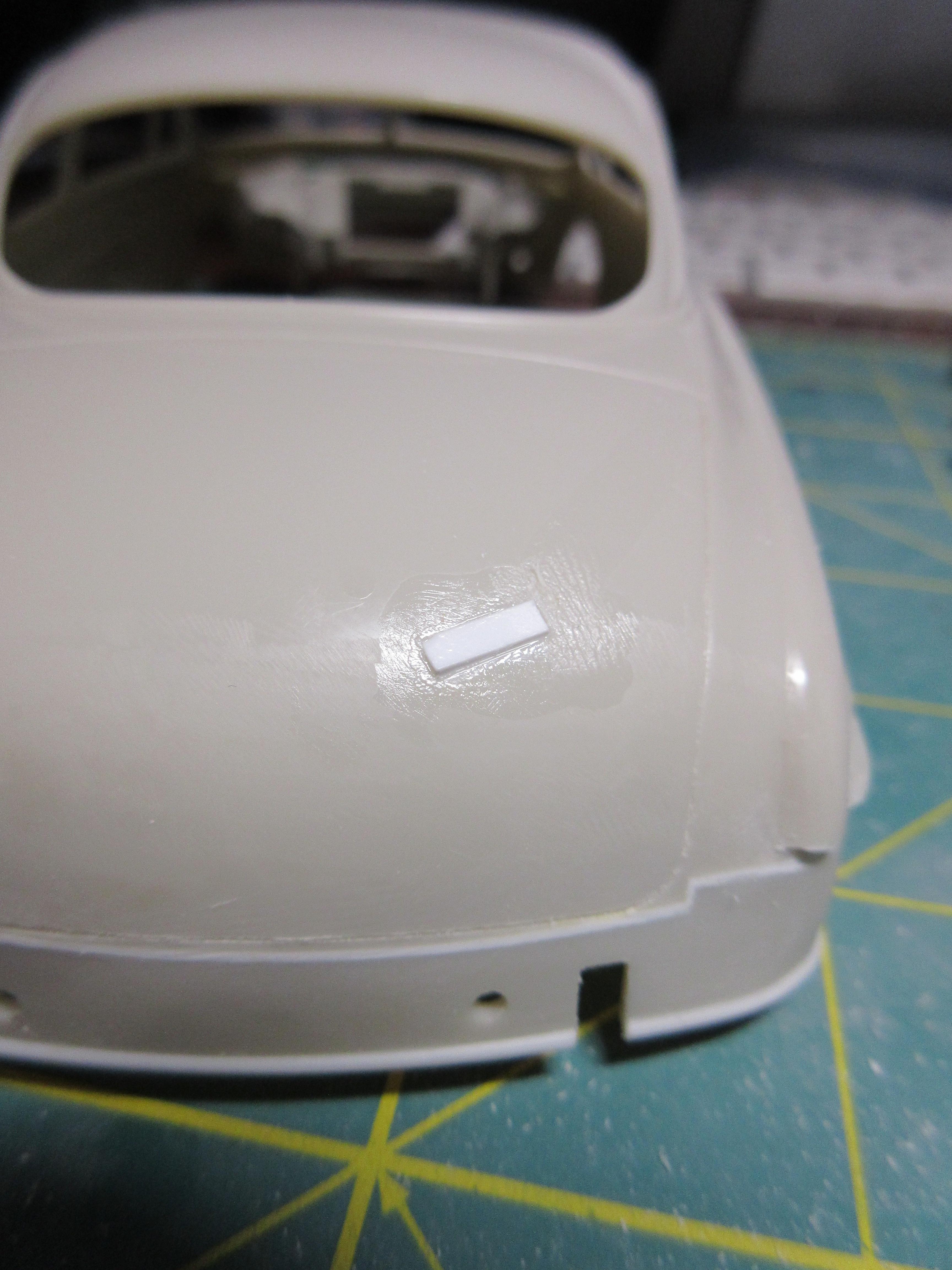 Got some work done on this. I decided instead of trying to get the small sections of .040 1/2 round, at the rear, to match the existing lower rocker trim, I decided to just remove it all and replace it with .040 half round. It was easier than trying to match what was there and it is all consistent now and looks good: I filled the hole in the trunk lid. Just needs shaping: I had to fill the fuel door before I could fit the taillight bezels. I didn't want to cut out too much as I wanted to be able to easily reshape it to look stock. It was an odd shape to fill, I used a piece of .080 sheet. It wasn't that bad to shape in the end, just an odd shaped piece: Another shot of the filler piece. I left lots of extra. To install the filler piece, I cut out the the fuel filler door area, creating a corner. I trued the majority with a knife to create a flat surface for the sheet to glue too. You can see it's a nice tight fit: Next I used my side cutters to bring it down as much as I could before shaping with a knife and file: And here the filler piece is rough shaped. I'll fine tune it before adding the taillight bezels. It still needs to be curved and contoured to the body shape: I cut the taillight bezels free from the trim bar intended for the rear. I have rough shaped them in the picture, cutting away excess trim. They will be further shaped and reduced when fitted to the body: And here you can see the taillights glued in place. The fuel door filler and side of the car has been final shaped: These taillight bezels were really hard to fit. It required a lot of cutting away of a little material, fitting and repeating. I thought I had one side done, and glued it on, tried to match the other side but it came out different (thinner). So I glued the other side on, took off the first side and matched it to the second taillight. It was a process. I'm glad it's done. I did my best to get them both in the same location and level and square. I don't believe they are perfect, but they are as close as I could get them: One last shot of the taillight bezels in place. I find it's a game of close enough when doing custom work. I question if the model body and related parts are perfectly symmetrical (I've run into several model bodies that weren't the same side to side, but you can't tell unless you measure), if my cuts and modifications are perfectly symmetrical, and if my eyes are seeing it correctly (I wear glasses with progressive lenses and correction for astigmatisms). I take a lot of measurements to double check locations of parts but find it's a matter of splitting the difference so it looks right, rather than being perfect. But I think I got the bezels in locations I can live with: I also started on the grill bar. I didn't get a picture, but the back of the grill center has an angled indent. So I filed the back of the grill bar to create a flat surface for the two ends, leaving the center to be filled. You can see the grill has been glued to some sheet stock in the center: Here you can see what I mean. The center angles in and needs to be filled out then trued with a file before I can start building up the back of the grill bar. I used 3 layers of .020 sheet: Here the sheets of plastic have been trued with a file and the whole grill bar has been glued to a piece of .118 sheet that will require shaping. The ends look funny now, but will be removed during final shaping: I had to build up the grill bar from the back so it will sit forward in the grill cavity where I want it. After shaping, I will most likely need to add even more sheet stock to the back to get it to sit where I want it. All the extra plastic also helps to create a nice strong piece: Thanks for stopping by and having a look! Edit: After these pics were taken, I wound up cutting the driver's side taillight off and moving it in slightly toward center. It just didn't look quite right, too far from the trunk panel line. Not sure if I got it right, but this is were it stands right now. Here's a pic of it: Second Edit: I removed the driver's side taillight one last time and repositioned it slightly. I think I got it where I want it now. This was a real effort, but I think it's good now. No picture. Will post pics later as more work progresses!
