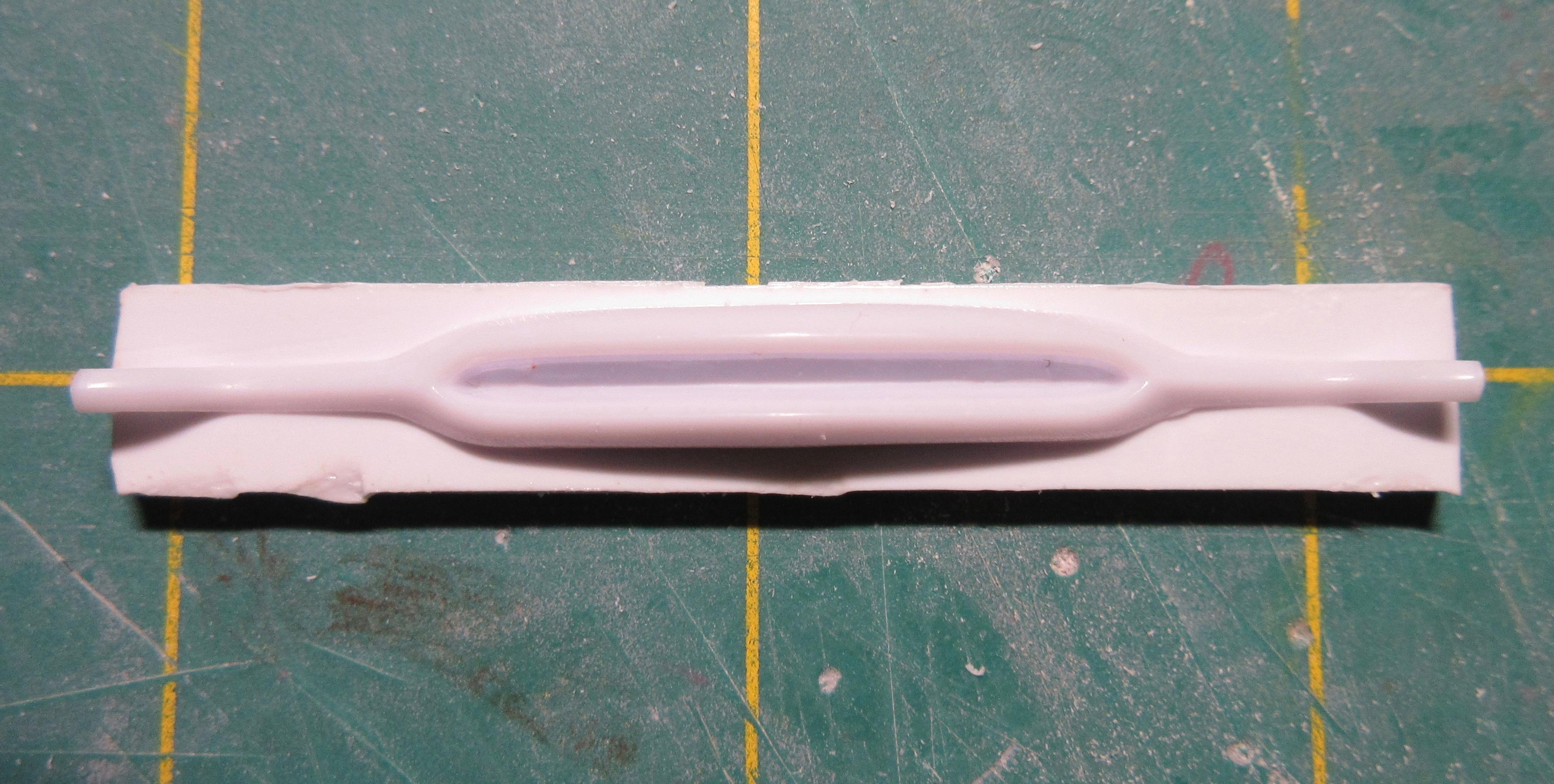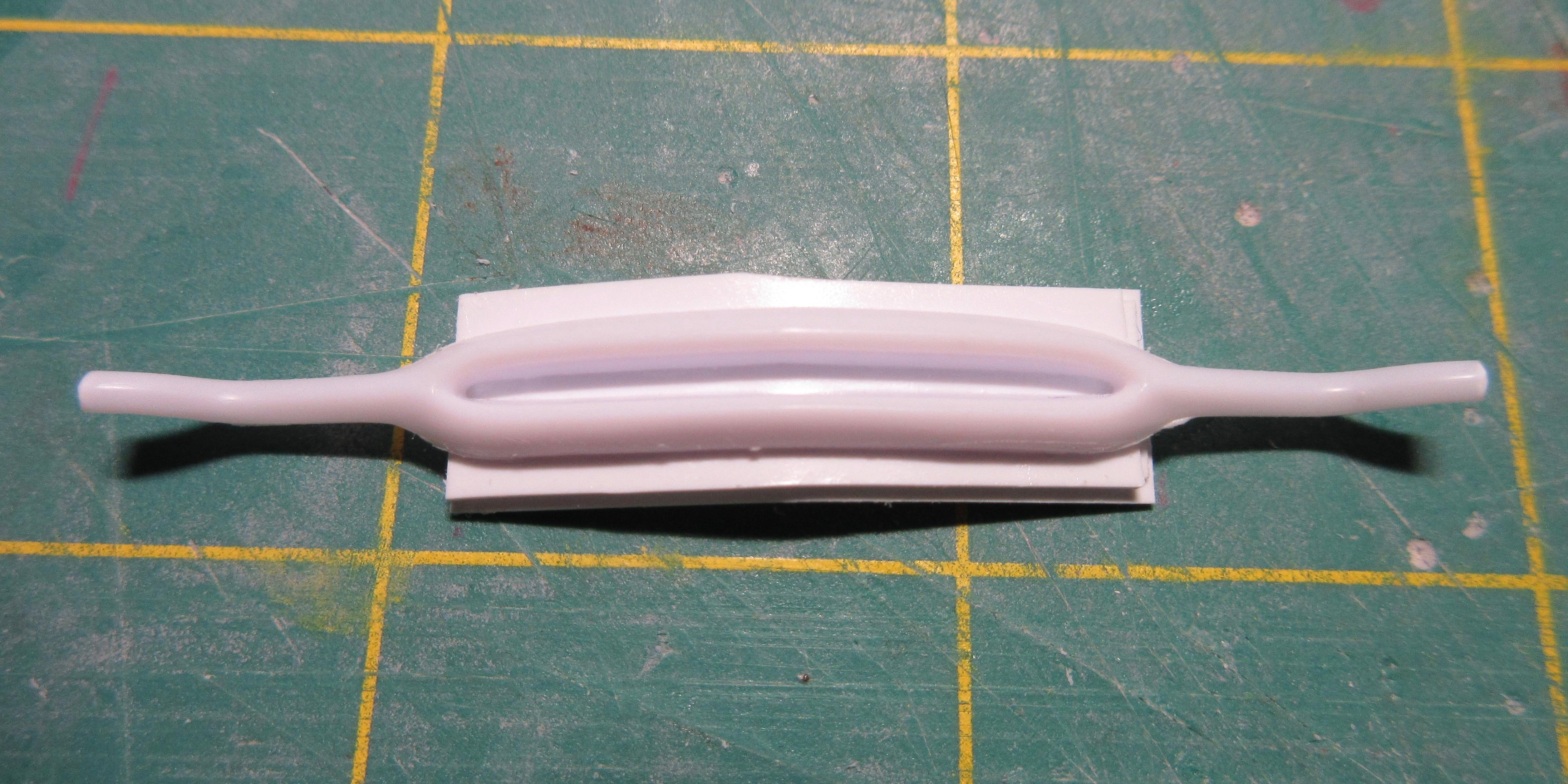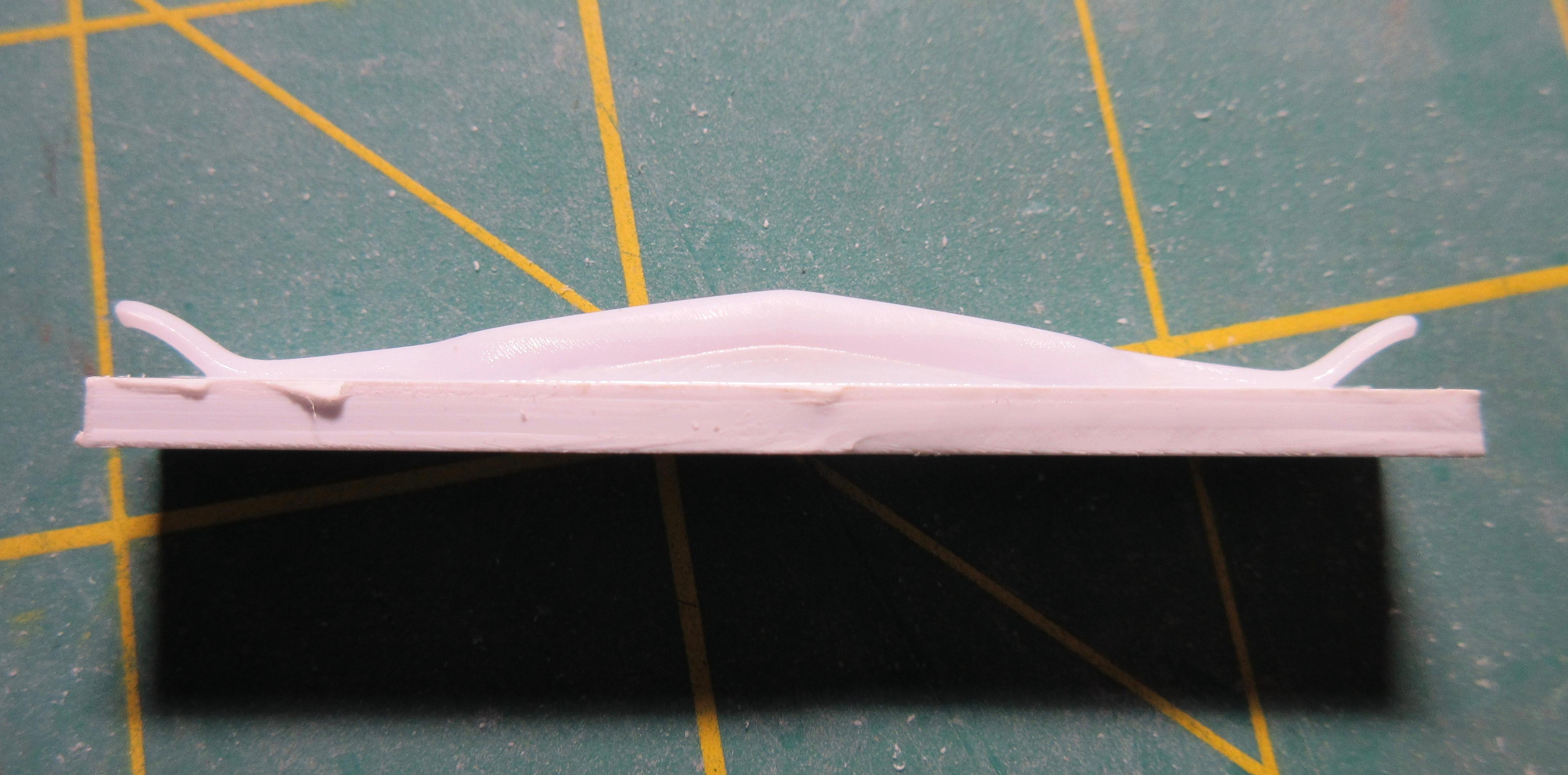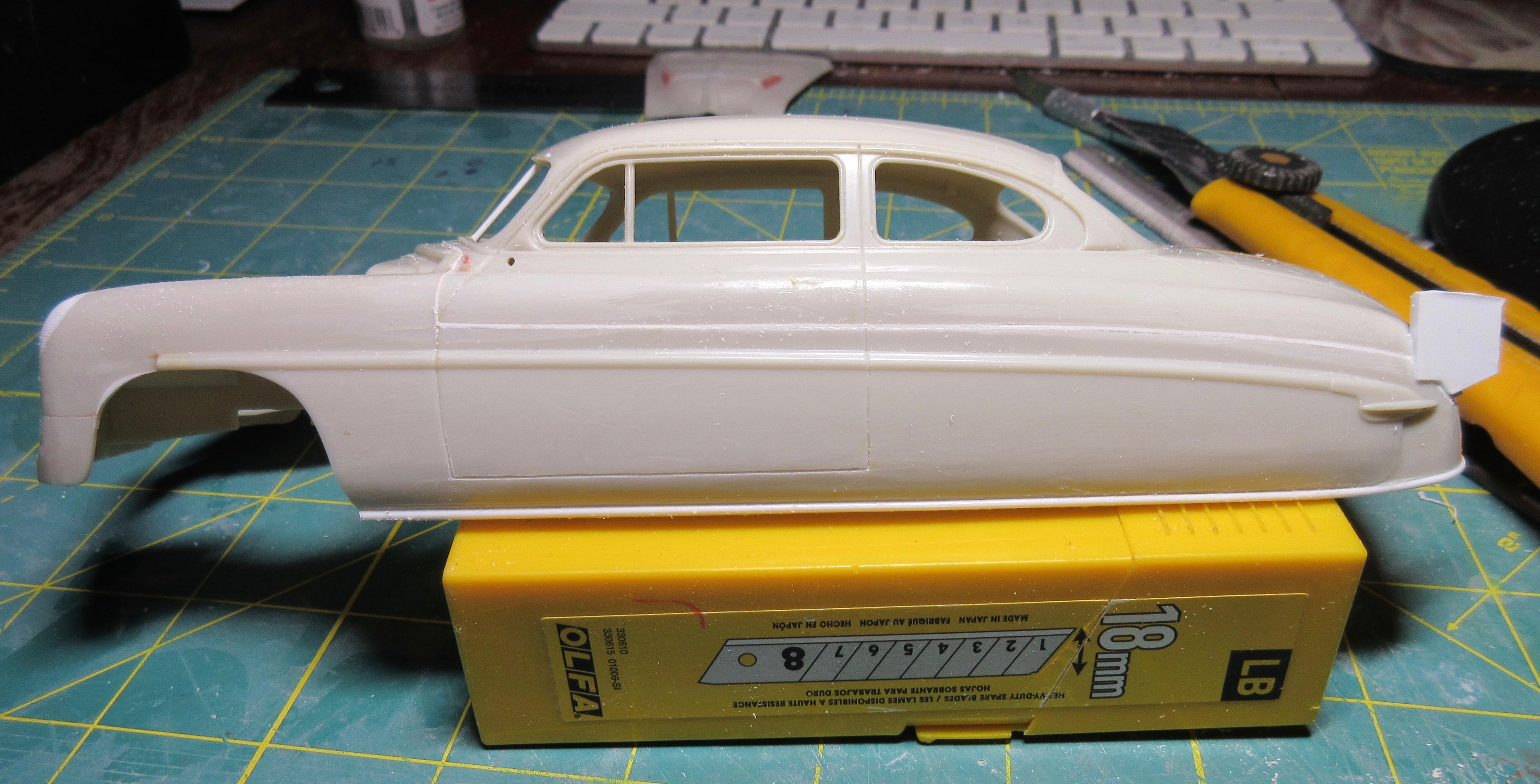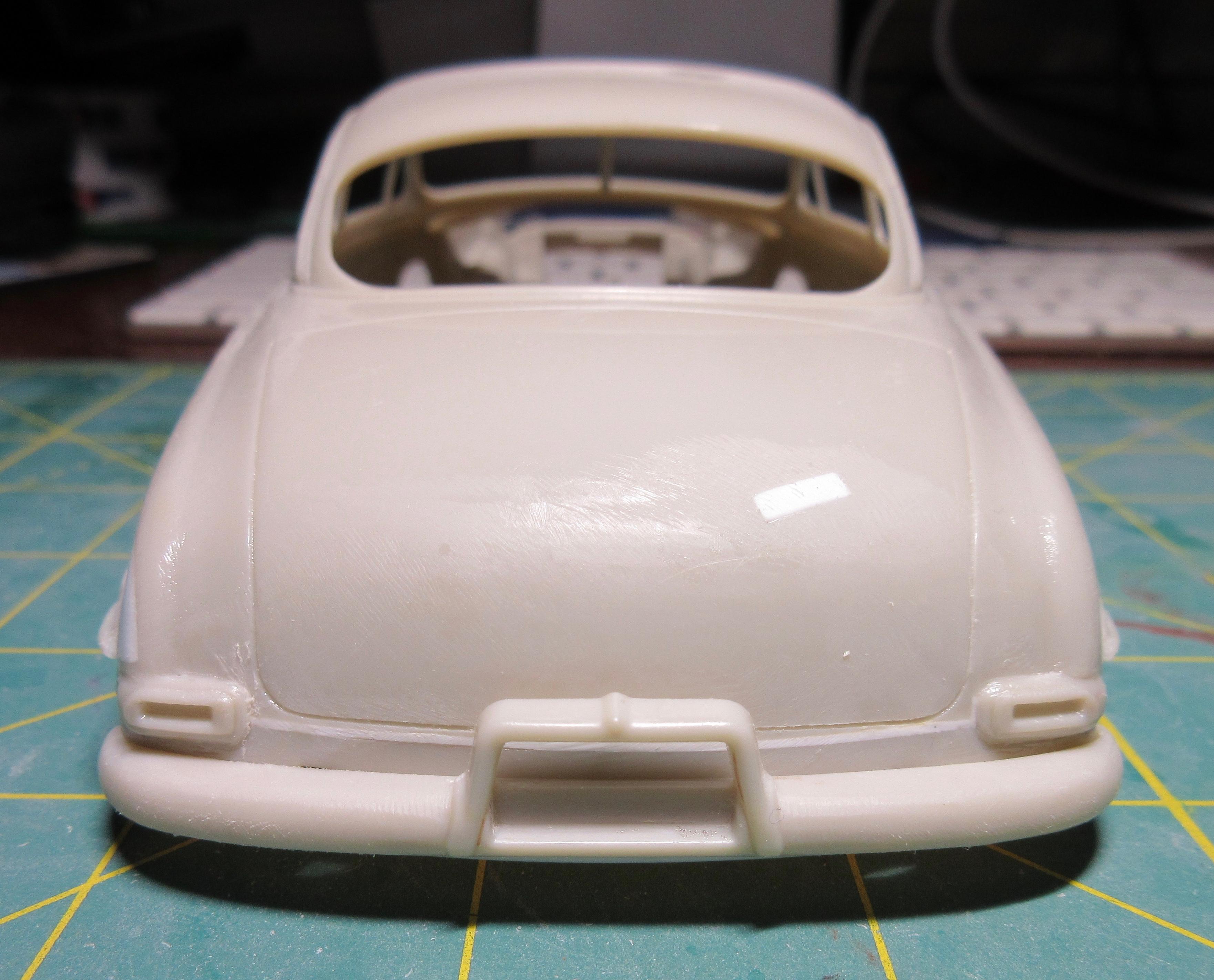 Got some work done on this. I decided instead of trying to get the small sections of .040 1/2 round, at the rear, to match the existing lower rocker trim, I decided to just remove it all and replace it with .040 half round. It was easier than trying to match what was there and it is all consistent now and looks good: I filled the hole in the trunk lid. Just needs shaping: I had to fill the fuel door before I could fit the taillight bezels. I didn't want to cut out too much as I wanted to be able to easily reshape it to look stock. It was an odd shape to fill, I used a piece of .080 sheet. It wasn't that bad to shape in the end, just an odd shaped piece: Another shot of the filler piece. I left lots of extra. To install the filler piece, I cut out the the fuel filler door area, creating a corner. I trued the majority with a knife to create a flat surface for the sheet to glue too. You can see it's a nice tight fit: Next I used my side cutters to bring it down as much as I could before shaping with a knife and file: And here the filler piece is rough shaped. I'll fine tune it before adding the taillight bezels. It still needs to be curved and contoured to the body shape: I cut the taillight bezels free from the trim bar intended for the rear. I have rough shaped them in the picture, cutting away excess trim. They will be further shaped and reduced when fitted to the body: And here you can see the taillights glued in place. The fuel door filler and side of the car has been final shaped: These taillight bezels were really hard to fit. It required a lot of cutting away of a little material, fitting and repeating. I thought I had one side done, and glued it on, tried to match the other side but it came out different (thinner). So I glued the other side on, took off the first side and matched it to the second taillight. It was a process. I'm glad it's done. I did my best to get them both in the same location and level and square. I don't believe they are perfect, but they are as close as I could get them: One last shot of the taillight bezels in place. I find it's a game of close enough when doing custom work. I question if the model body and related parts are perfectly symmetrical (I've run into several model bodies that weren't the same side to side, but you can't tell unless you measure), if my cuts and modifications are perfectly symmetrical, and if my eyes are seeing it correctly (I wear glasses with progressive lenses and correction for astigmatisms). I take a lot of measurements to double check locations of parts but find it's a matter of splitting the difference so it looks right, rather than being perfect. But I think I got the bezels in locations I can live with: I also started on the grill bar. I didn't get a picture, but the back of the grill center has an angled indent. So I filed the back of the grill bar to create a flat surface for the two ends, leaving the center to be filled. You can see the grill has been glued to some sheet stock in the center: Here you can see what I mean. The center angles in and needs to be filled out then trued with a file before I can start building up the back of the grill bar. I used 3 layers of .020 sheet: Here the sheets of plastic have been trued with a file and the whole grill bar has been glued to a piece of .118 sheet that will require shaping. The ends look funny now, but will be removed during final shaping: I had to build up the grill bar from the back so it will sit forward in the grill cavity where I want it. After shaping, I will most likely need to add even more sheet stock to the back to get it to sit where I want it. All the extra plastic also helps to create a nice strong piece: Thanks for stopping by and having a look! Edit: After these pics were taken, I wound up cutting the driver's side taillight off and moving it in slightly toward center. It just didn't look quite right, too far from the trunk panel line. Not sure if I got it right, but this is were it stands right now. Here's a pic of it: Second Edit: I removed the driver's side taillight one last time and repositioned it slightly. I think I got it where I want it now. This was a real effort, but I think it's good now. No picture. Will post pics later as more work progresses!