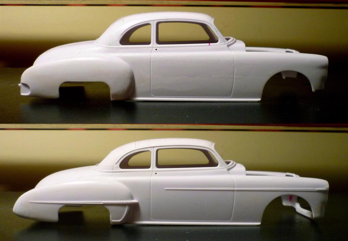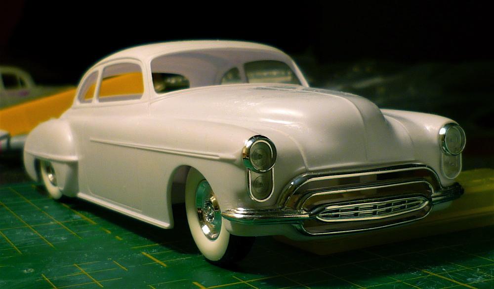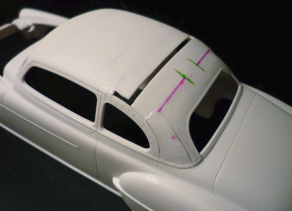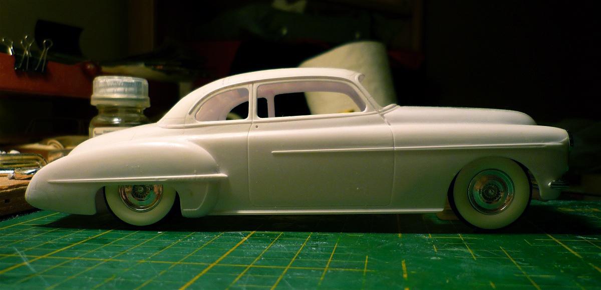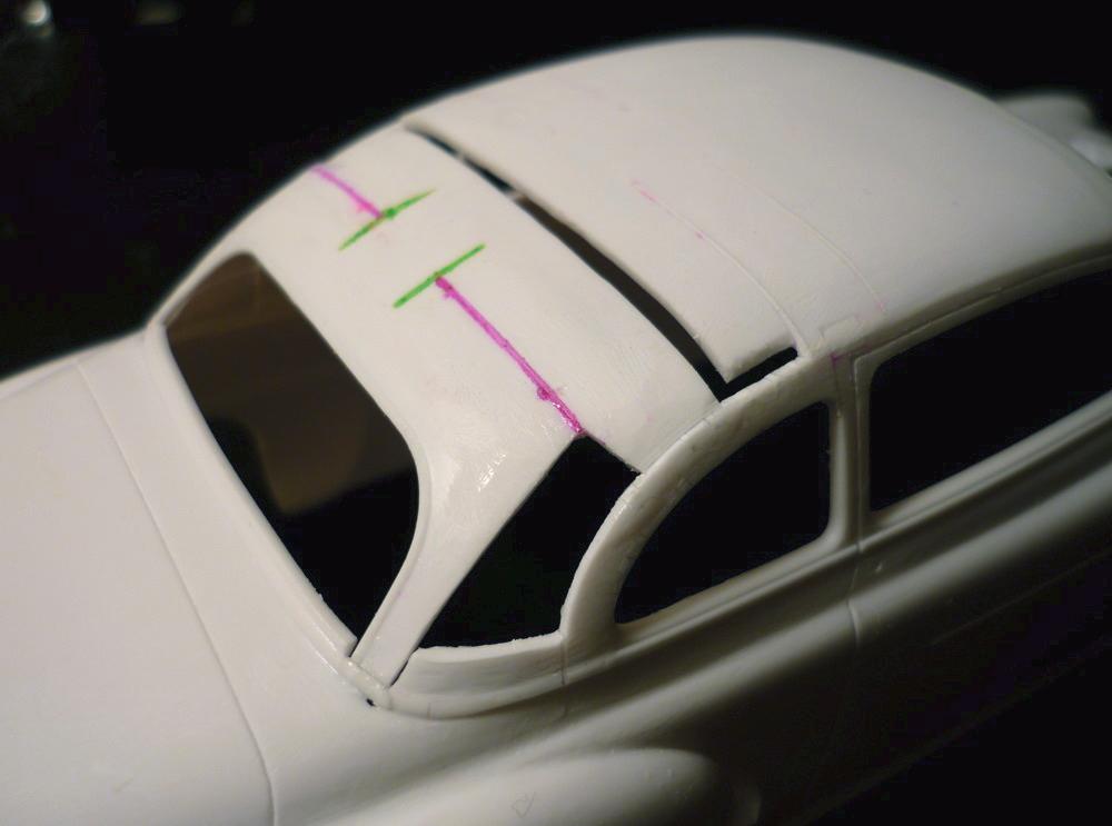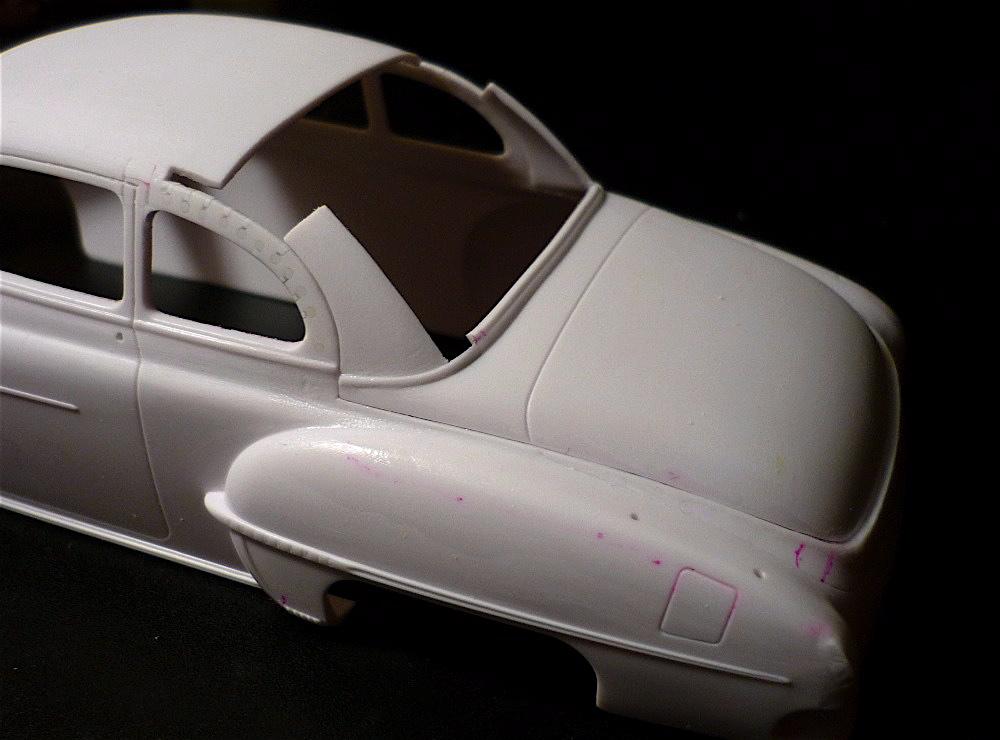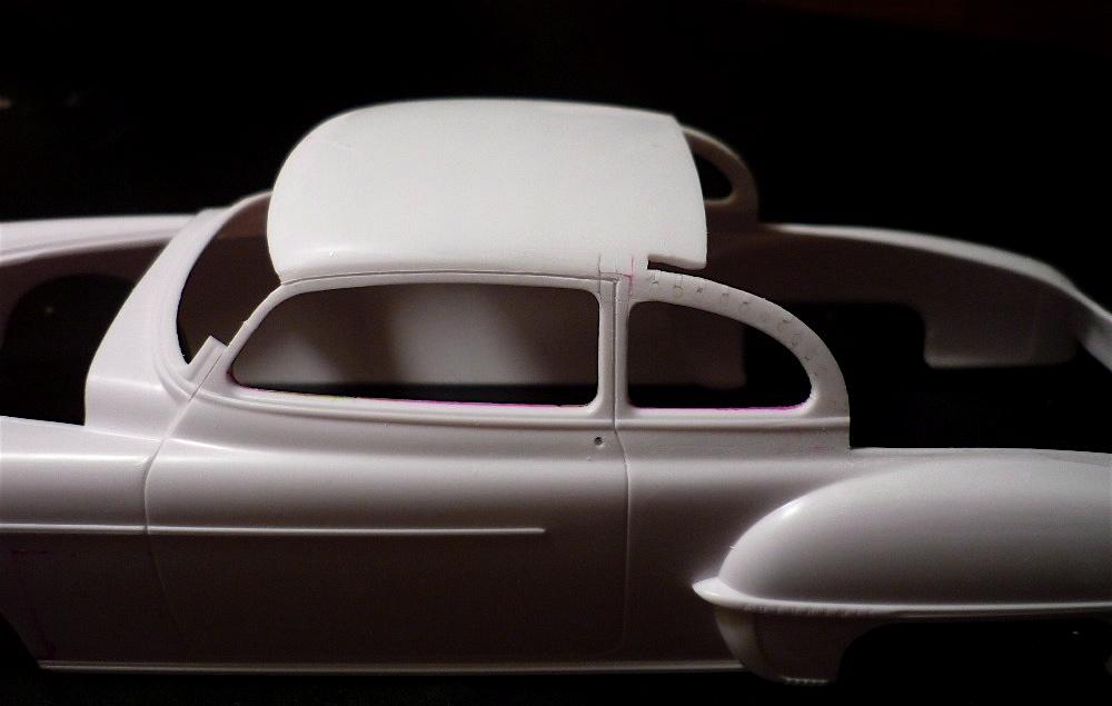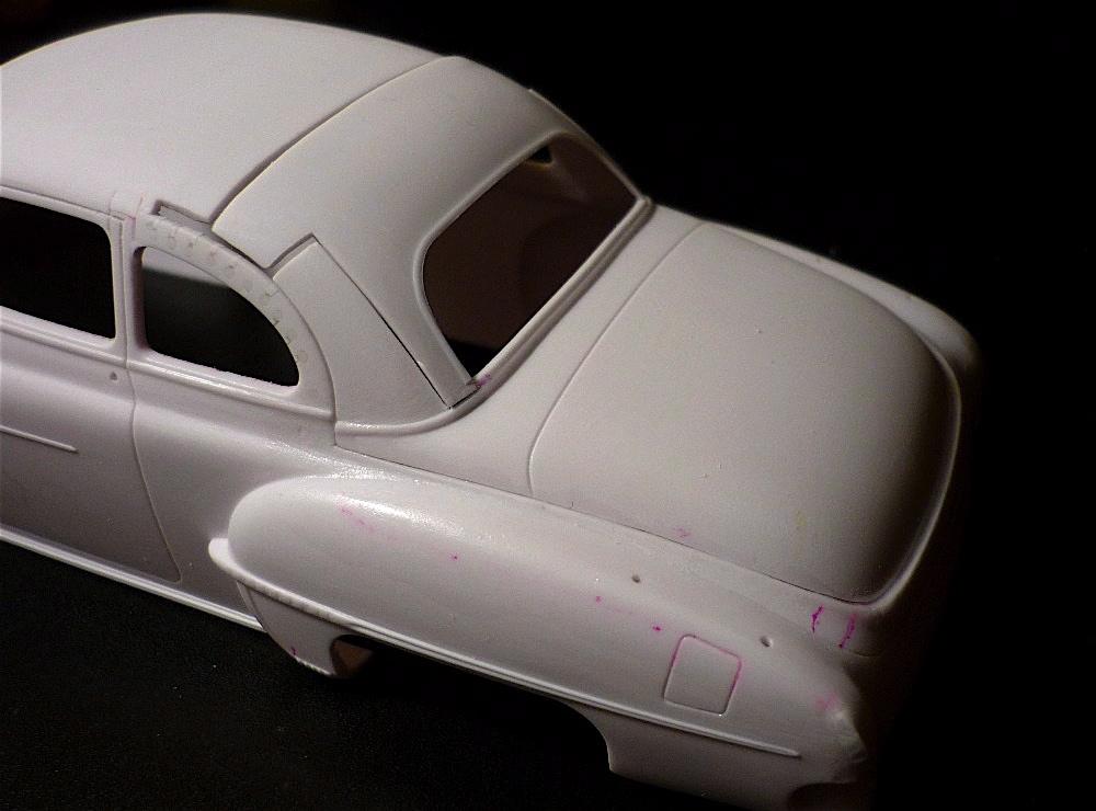I dug out this old build of a 50 Olds to spray some primer on it. I took some pictures of the top chop when I did it, then some mock up pics. This is how I did the chop: I chopped the windshield 1 1/4 scale inches. I chopped the overall height of the roof two inches so I pushed the windshield up into the roof slightly so it doesn't look too chopped. Drip rail has been removed for the chop and will be added back on later: I took the whole rear section of the car off. I wound up sectioning the trunk area 1 inch. You can see I have drilled several holes in the 1/4 window frames. That is so they will bend and flex while I lay the roof forward and down 2 inches: Here's a better shot of the roof before lowering. I cut a groove in the roof, and let the B pillar slide up into the roof for a sturdier joint. I cut the A pillar to match how much lower I wanted the roof. And the frame of the 1/4 window is very flexible at this point and will bend to accommodate the movement of the roof: And here is the roof lowered 2 inches. The roof has been moved forward to line up the A pillar. Then the B pillar is fit to the roof where it naturally lands in its new location. I cut a channel in the roof for the B pillar to slide up into and filled the remainder. I have filled all the wholes in the 1/4 window, but the holes allowed me to create a new curve that flowed with the new lower silhouette as it was lowered and moved forward: Here you can see the top of the windshield frame back in place. I had to split it in the center as the center naturally wanted to dip when reattached. So I split it, that solved the problem. I wound up angling each side of the windshield frame up slightly to create a curve to the top of the window frame similar to stock. A filler piece was required behind the frame to blend it with the crown of the roof. You can see I have trial fit the rear section. Some relief cuts and filler pieces will be required. A shot of the A pillars all glued up. You can see how moving the windshield up into the crown of the roof reduces the forehead of the roof significantly. Cutting the door and the windshield frames in different places (staggered) creates a lot more surface area for gluing and a much stronger joint in my opinion: Later I'll address the misaligned trim at the base of the rear of the roof and will also have to blend the trunk and create new panel lines. Here's the rear roof section trial fit. I cut it so I could slide the roof section behind the trim at the base of the roof for a better, stronger joint: I had to cut out the sail panels to fit the rear roof section. The marker lines are where I'll cut to relax the crown and get everything to fit nicely: You can see some relief cuts I have made and filled to relax the slope of the roof so it will blend with the rear section. The rear section and the sail panels have been glued up. The rear window was chopped 1 scale inches (combined with the sectioning of the trunk it is in effect, brought down 2 inches but it remains more open looking, like the windshield, to keep the top feeling airy and light). just need to fill gaps now and sand joints and add a drip rail and the roof is done: With the major body modification out of the way, it's time for a mock-up. Headlights from the Revell Predicta Kit were fitted with the '50 Oldsmobile bezels modified to fit. I wanted to keep the Olds bezels to lay over the Predicta custom headlights to keep the front end looking like a '50 Oldsmobile instead of falling toward a too radical look. The grill bumper assembly is a combination of 2 '50 Oldsmobile bumper/grilles, some .040" half round plastic stock and the '53 Pontiac grill from the Revell '49 Mercury kit. I used Bare Metal Foil to cover up all the joints. I made a pan to match the new grill: It's starting to look like a kustom: With the drip rail put back on, it really anchors the roof. It's sitting on Modelhaus 284 tires with Chrysler Turbine wheels with a slight speedboat stance. You can see how the 1 inch section job and moving the windshield into the roof really lighten things up along with the extended fenders: You can see I fixed the trim at the base of the roof and cut new panel lines for the trunk. I extended the rear fenders quite a bit, like 6 inches or so. Then I cut taillights into the ends with lines to indicate a custom bezel and custom lens. They'll be covered in bare metal foil and the lens painted clear red when done: And a close up of the taillight cut into the fender. I made a roll pan for the rear to give it a clean, smoothed out look: And lastly, a comparison of the stock roof to the chopped roof and sectioned trunk. Big difference. But the chop still maintains the feel of the stock roof even though it has been significantly altered. The extended rear fenders also add length to the main body elongating the overall look: Thanks for looking... Primer pics to come!