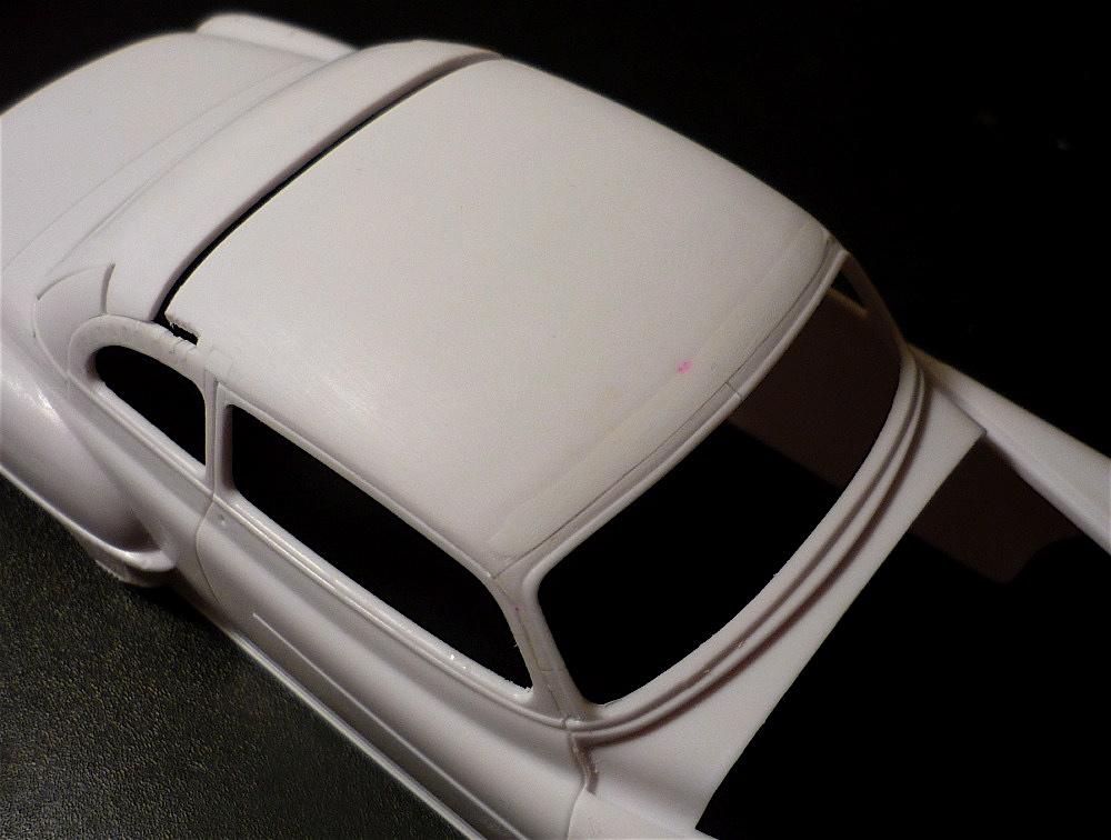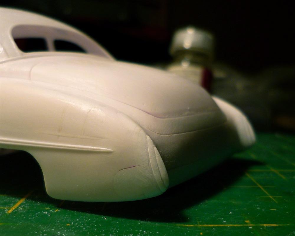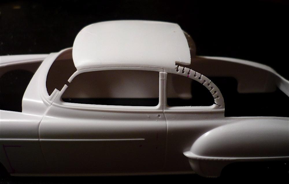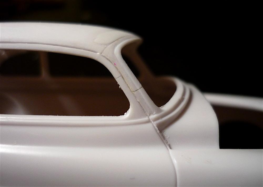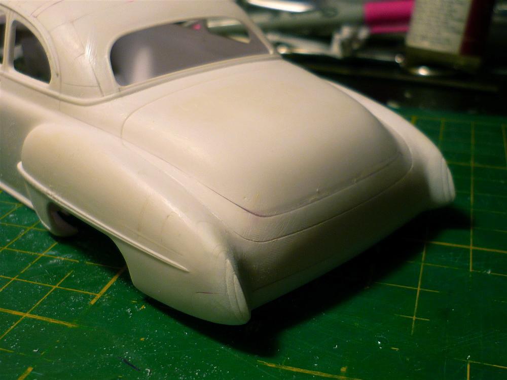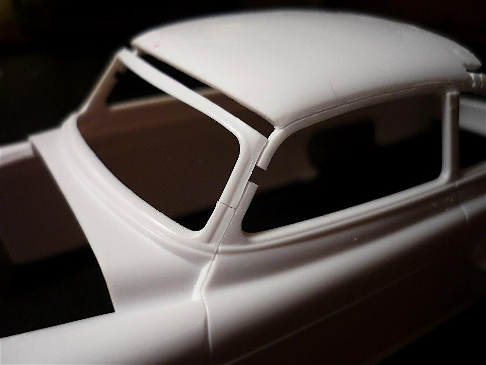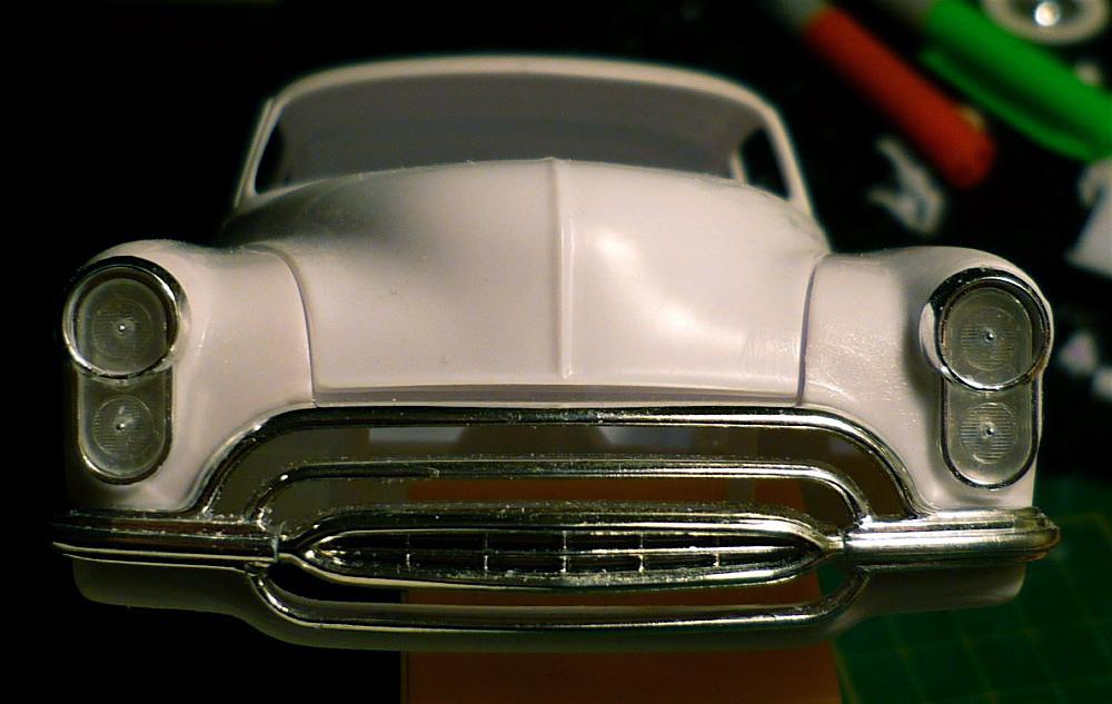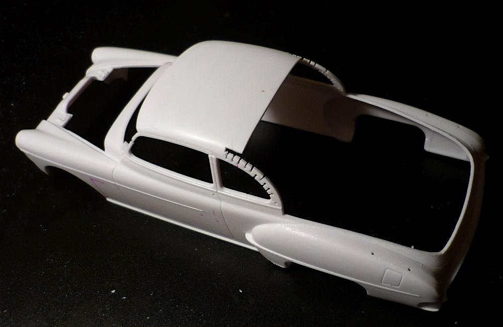 I dug out this old build of a 50 Olds to spray some primer on it. I took some pictures of the top chop when I did it, then some mock up pics. This is how I did the chop: I chopped the windshield 1 1/4 scale inches. I chopped the overall height of the roof two inches so I pushed the windshield up into the roof slightly so it doesn't look too chopped. Drip rail has been removed for the chop and will be added back on later: I took the whole rear section of the car off. I wound up sectioning the trunk area 1 inch. You can see I have drilled several holes in the 1/4 window frames. That is so they will bend and flex while I lay the roof forward and down 2 inches: Here's a better shot of the roof before lowering. I cut a groove in the roof, and let the B pillar slide up into the roof for a sturdier joint. I cut the A pillar to match how much lower I wanted the roof. And the frame of the 1/4 window is very flexible at this point and will bend to accommodate the movement of the roof: And here is the roof lowered 2 inches. The roof has been moved forward to line up the A pillar. Then the B pillar is fit to the roof where it naturally lands in its new location. I cut a channel in the roof for the B pillar to slide up into and filled the remainder. I have filled all the wholes in the 1/4 window, but the holes allowed me to create a new curve that flowed with the new lower silhouette as it was lowered and moved forward: Here you can see the top of the windshield frame back in place. I had to split it in the center as the center naturally wanted to dip when reattached. So I split it, that solved the problem. I wound up angling each side of the windshield frame up slightly to create a curve to the top of the window frame similar to stock. A filler piece was required behind the frame to blend it with the crown of the roof. You can see I have trial fit the rear section. Some relief cuts and filler pieces will be required. A shot of the A pillars all glued up. You can see how moving the windshield up into the crown of the roof reduces the forehead of the roof significantly. Cutting the door and the windshield frames in different places (staggered) creates a lot more surface area for gluing and a much stronger joint in my opinion: Later I'll address the misaligned trim at the base of the rear of the roof and will also have to blend the trunk and create new panel lines. Here's the rear roof section trial fit. I cut it so I could slide the roof section behind the trim at the base of the roof for a better, stronger joint: I had to cut out the sail panels to fit the rear roof section. The marker lines are where I'll cut to relax the crown and get everything to fit nicely: You can see some relief cuts I have made and filled to relax the slope of the roof so it will blend with the rear section. The rear section and the sail panels have been glued up. The rear window was chopped 1 scale inches (combined with the sectioning of the trunk it is in effect, brought down 2 inches but it remains more open looking, like the windshield, to keep the top feeling airy and light). just need to fill gaps now and sand joints and add a drip rail and the roof is done: With the major body modification out of the way, it's time for a mock-up. Headlights from the Revell Predicta Kit were fitted with the '50 Oldsmobile bezels modified to fit. I wanted to keep the Olds bezels to lay over the Predicta custom headlights to keep the front end looking like a '50 Oldsmobile instead of falling toward a too radical look. The grill bumper assembly is a combination of 2 '50 Oldsmobile bumper/grilles, some .040" half round plastic stock and the '53 Pontiac grill from the Revell '49 Mercury kit. I used Bare Metal Foil to cover up all the joints. I made a pan to match the new grill: It's starting to look like a kustom: With the drip rail put back on, it really anchors the roof. It's sitting on Modelhaus 284 tires with Chrysler Turbine wheels with a slight speedboat stance. You can see how the 1 inch section job and moving the windshield into the roof really lighten things up along with the extended fenders: You can see I fixed the trim at the base of the roof and cut new panel lines for the trunk. I extended the rear fenders quite a bit, like 6 inches or so. Then I cut taillights into the ends with lines to indicate a custom bezel and custom lens. They'll be covered in bare metal foil and the lens painted clear red when done: And a close up of the taillight cut into the fender. I made a roll pan for the rear to give it a clean, smoothed out look: And lastly, a comparison of the stock roof to the chopped roof and sectioned trunk. Big difference. But the chop still maintains the feel of the stock roof even though it has been significantly altered. The extended rear fenders also add length to the main body elongating the overall look: Thanks for looking... Primer pics to come!