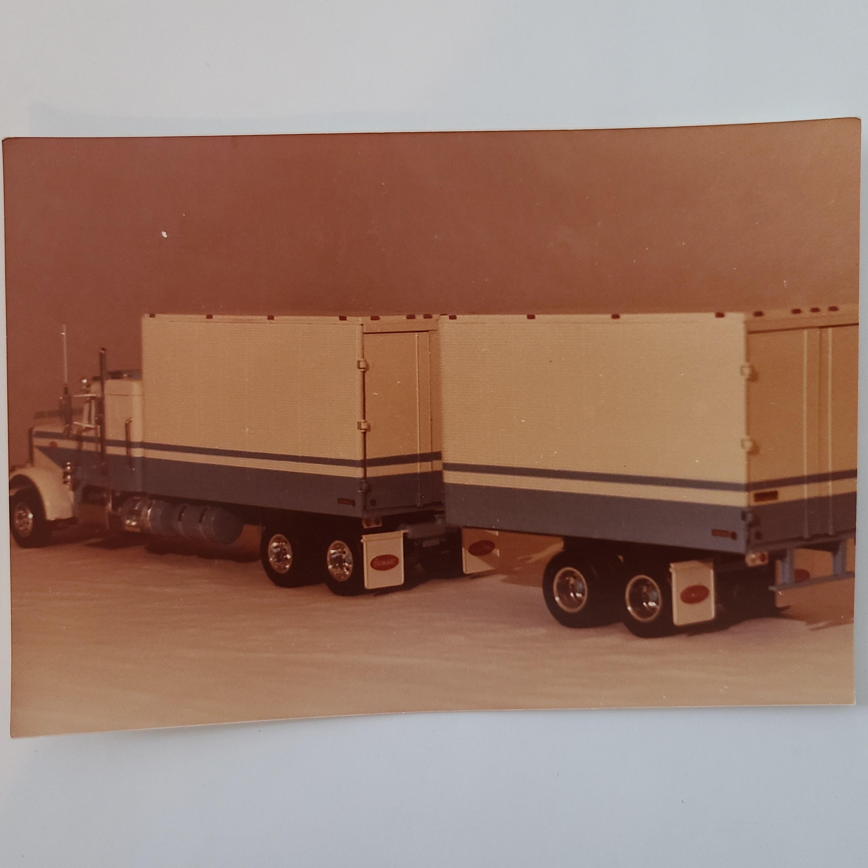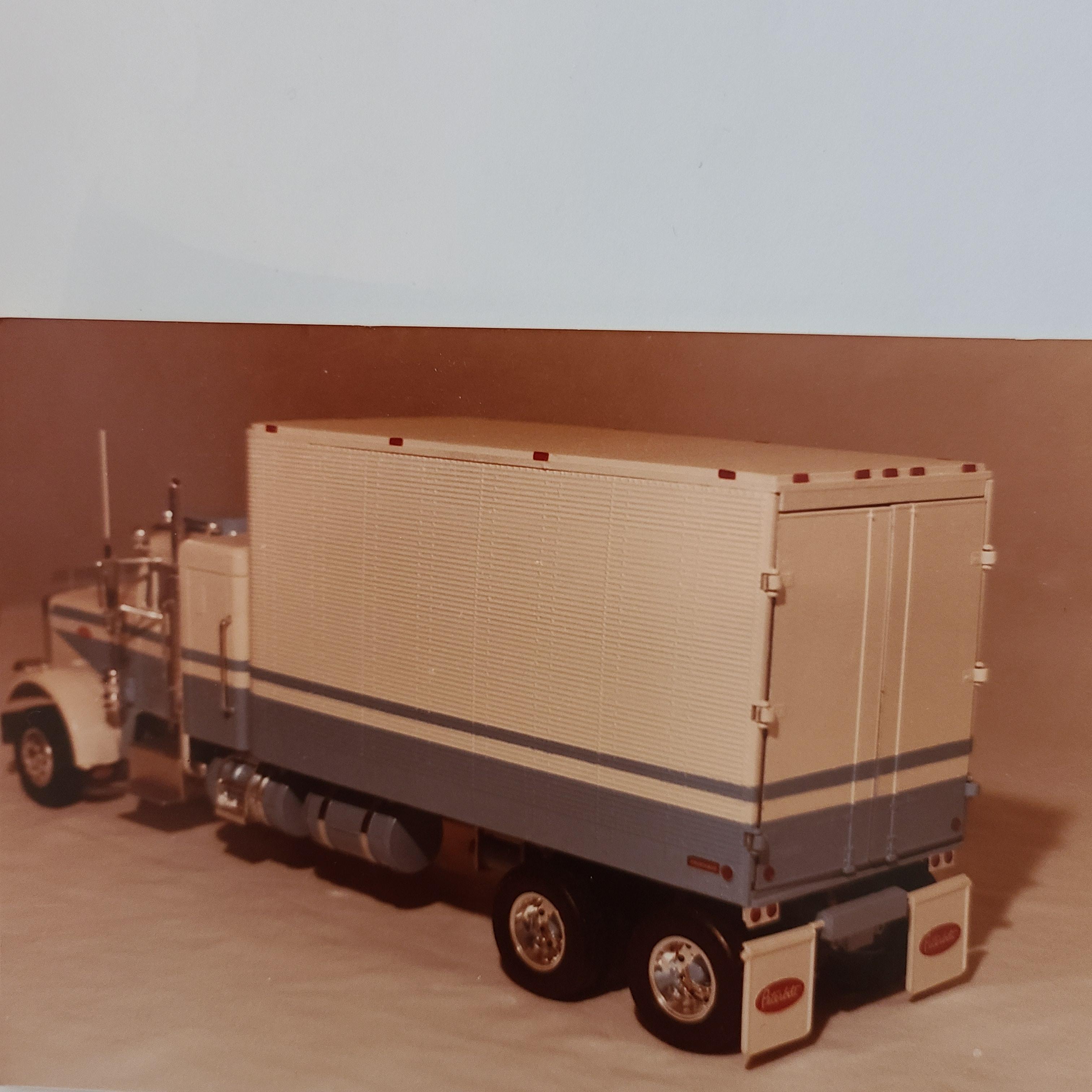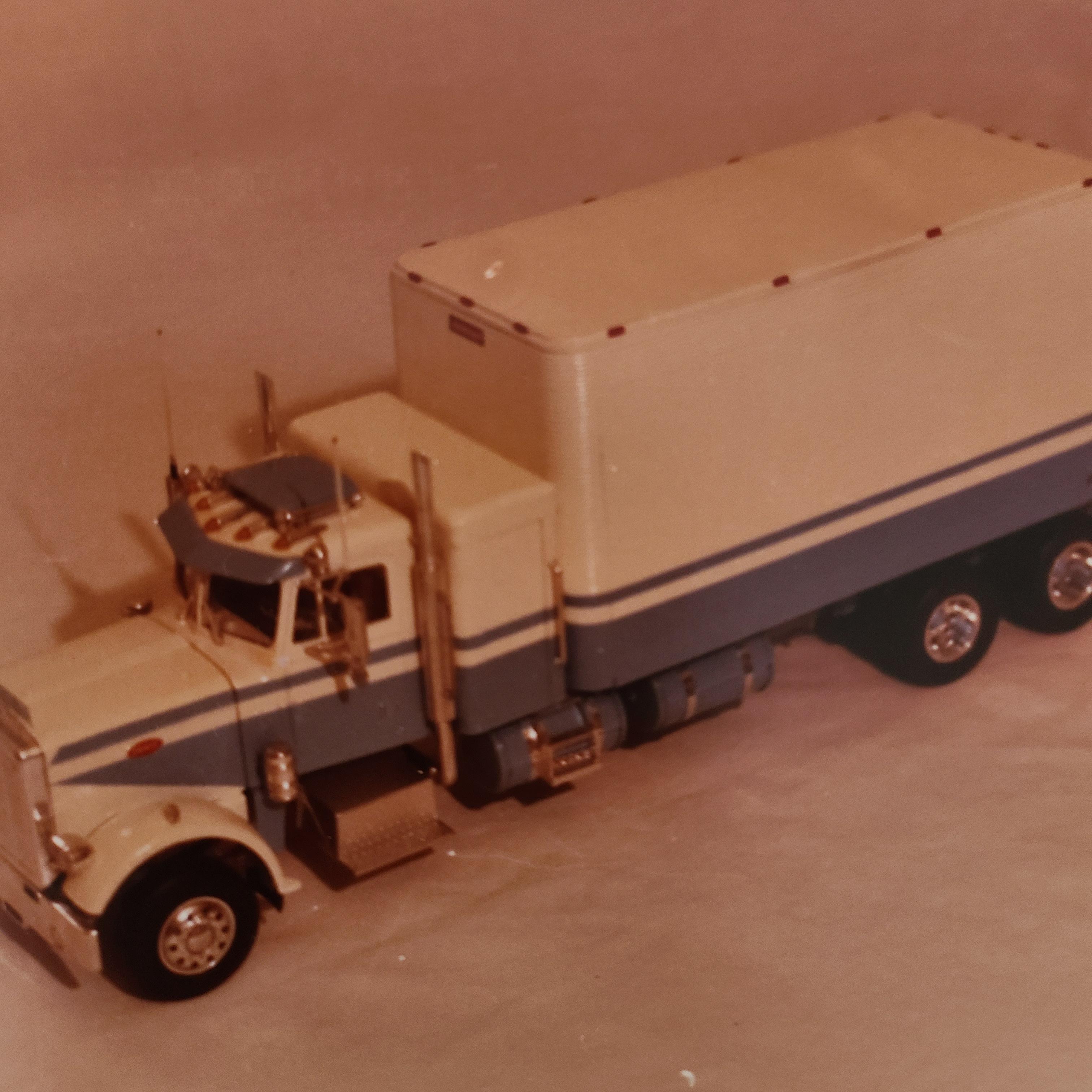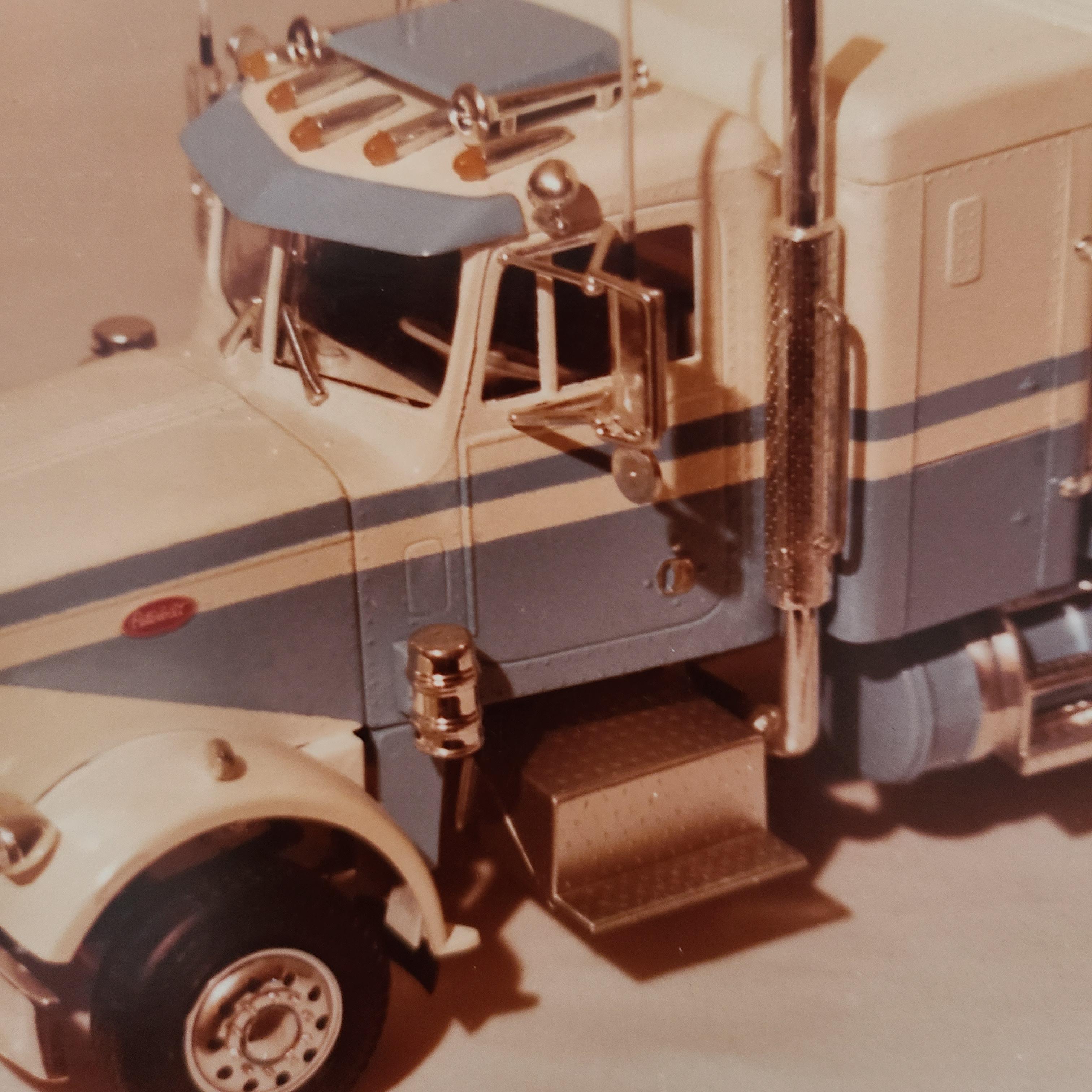 In the short time I've been a part of this forum, I've seen others post builds from some time ago. In that spirit and to give those interested a little background into my modeI building, I found these pictures of a Peterbilt from 77' to 79'. Somewhere in that time frame. Oldest model I have pics of. First AMT issue when they went from "California Hauler" to "Cross Country Hauler". First time two tone painting and cutting trailers up. After having bought mine nearly 50 years ago, I see that kit has been reissued as well as the trailer.