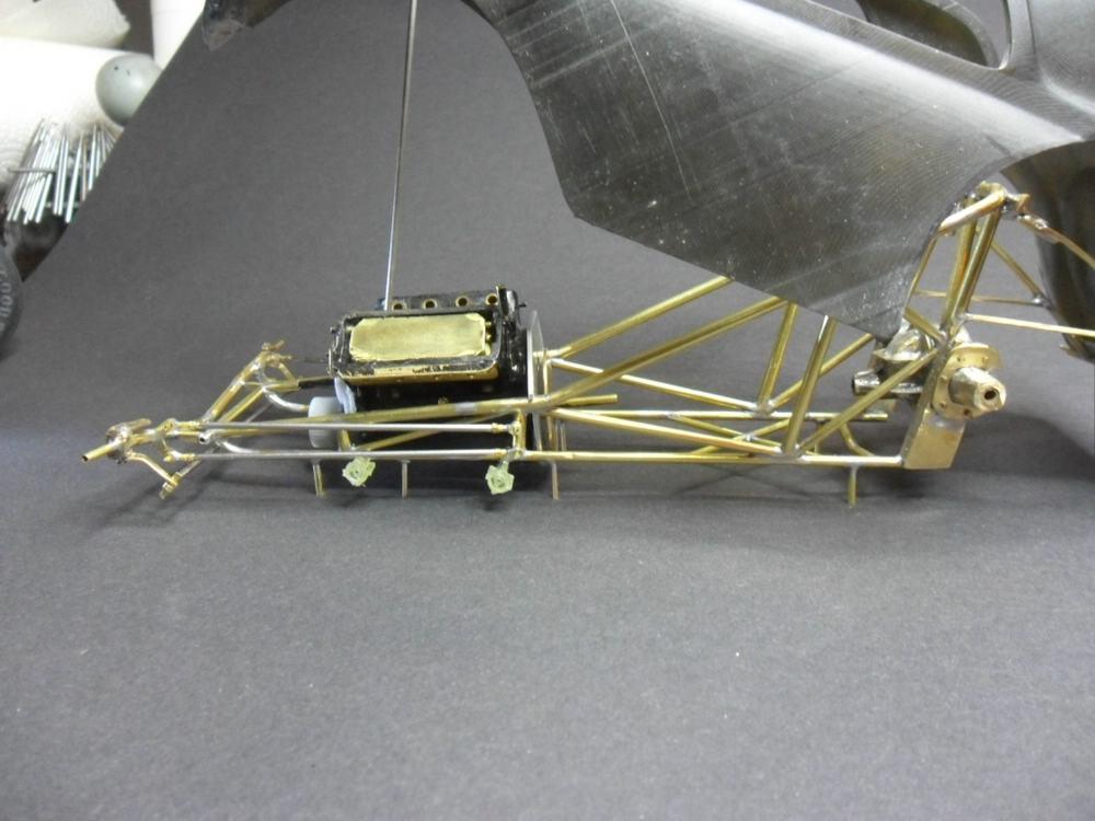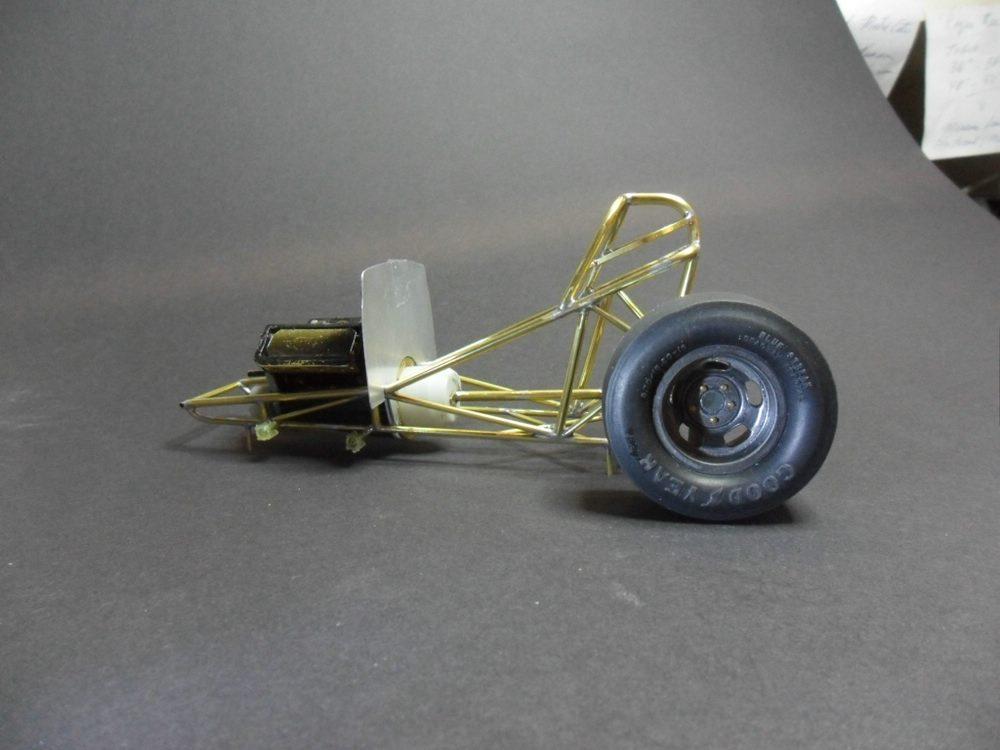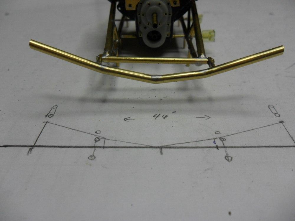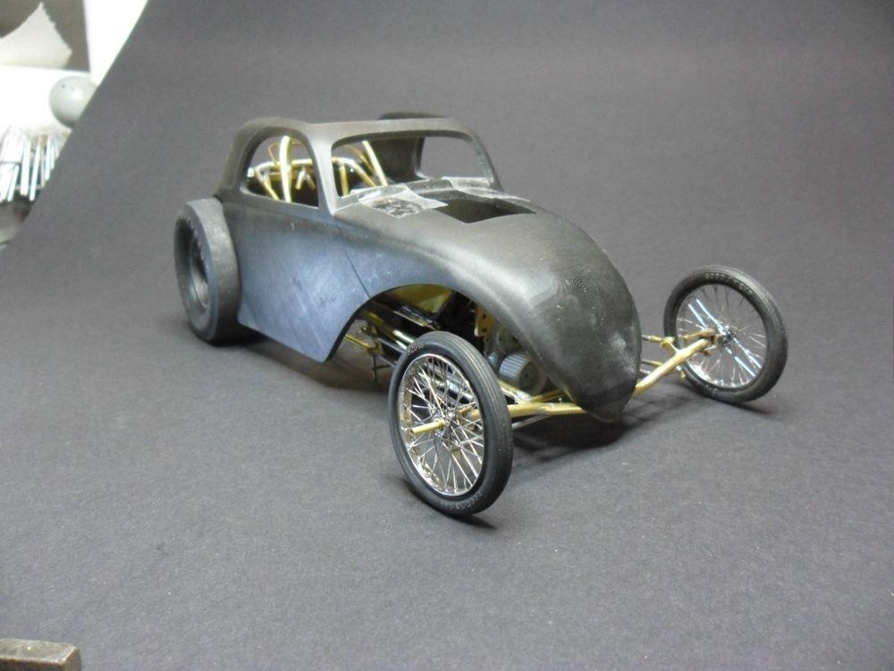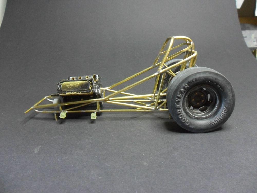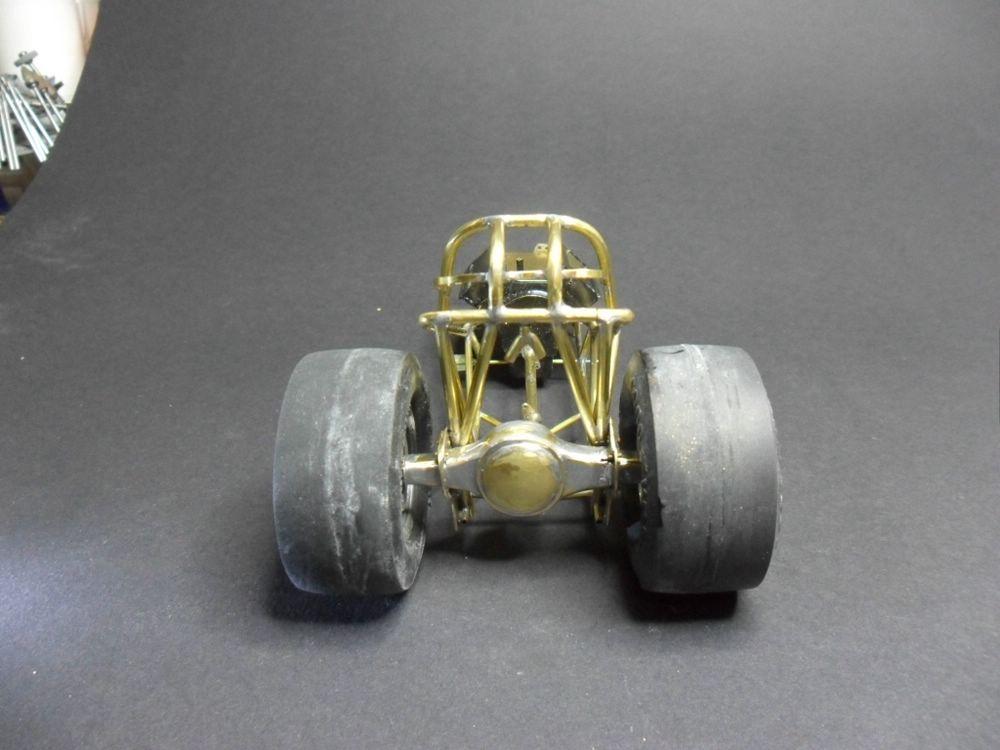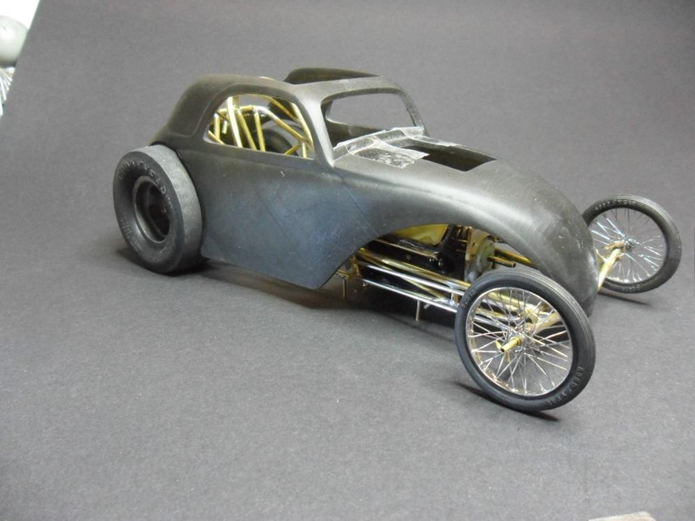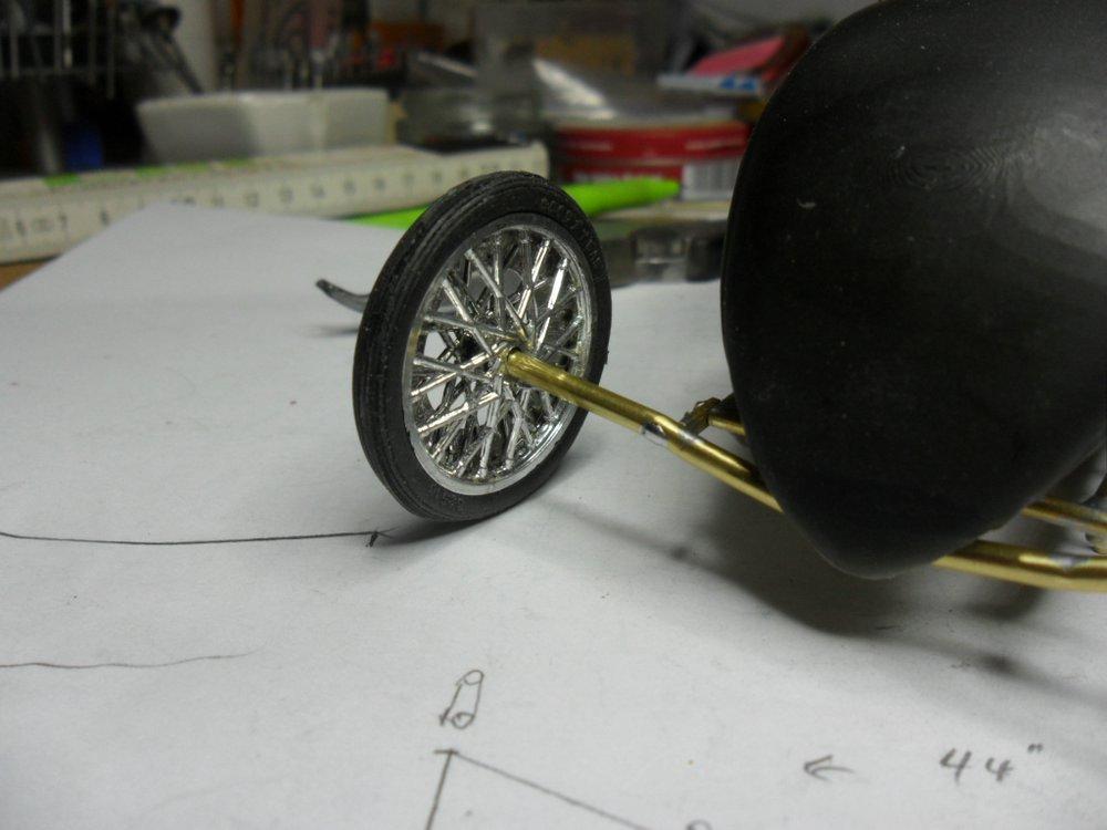 Moving on now, getting the front axle set up to the chassis. This model is a true scale, 94" WB from back in the day. Things get really tight up front. Of course, the hood nose needed massaging. Only needing a low stance for this model. Please look.... PS: the shown crummy spoked wheels up front are only for getting things sized up. Thanks for looking. Mike..