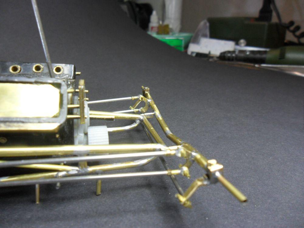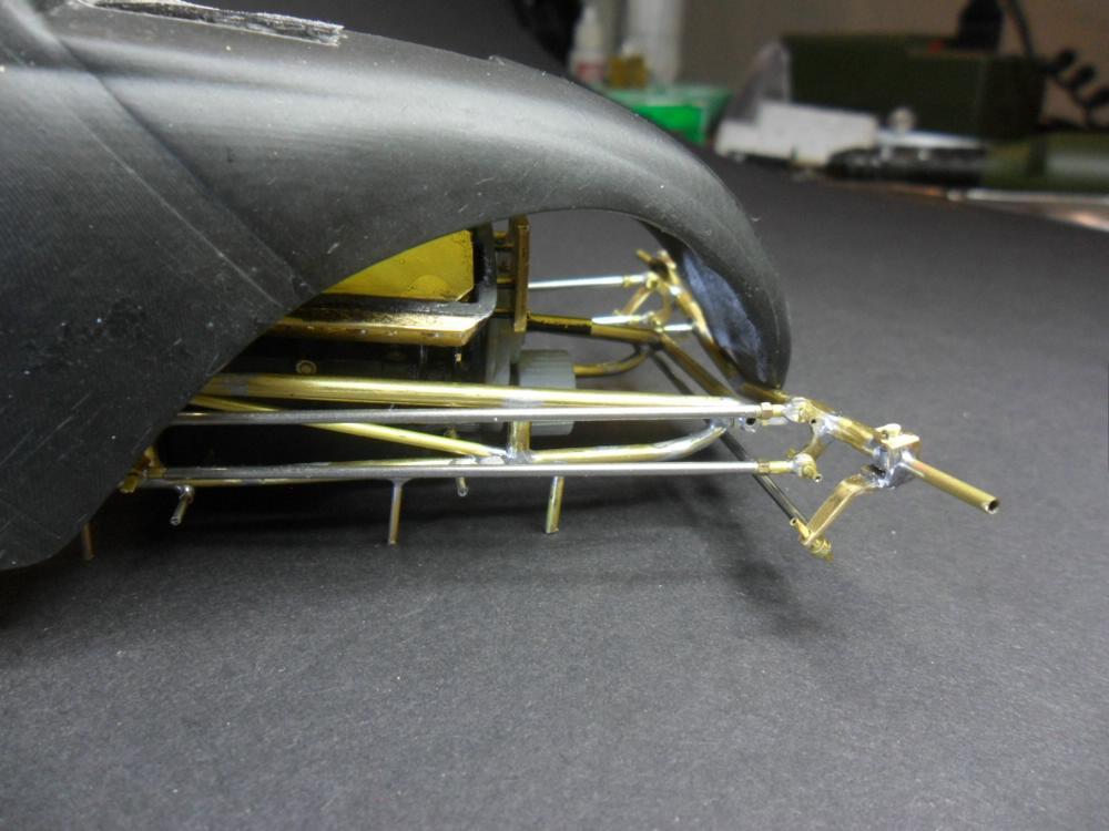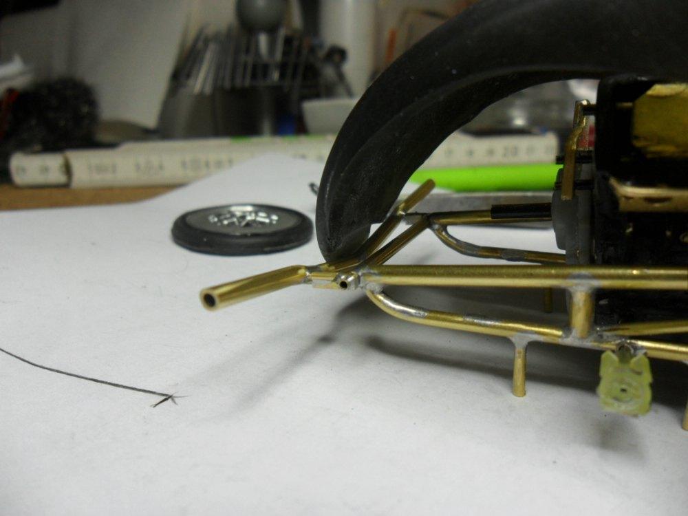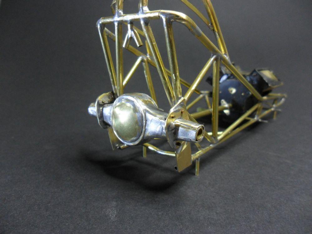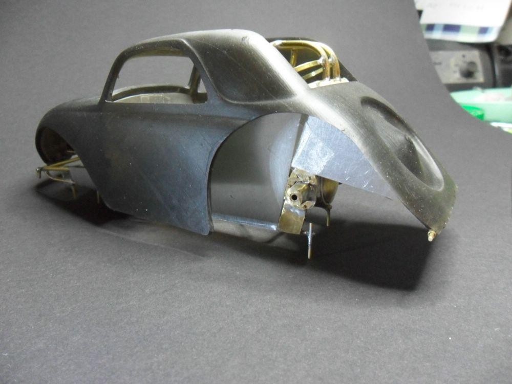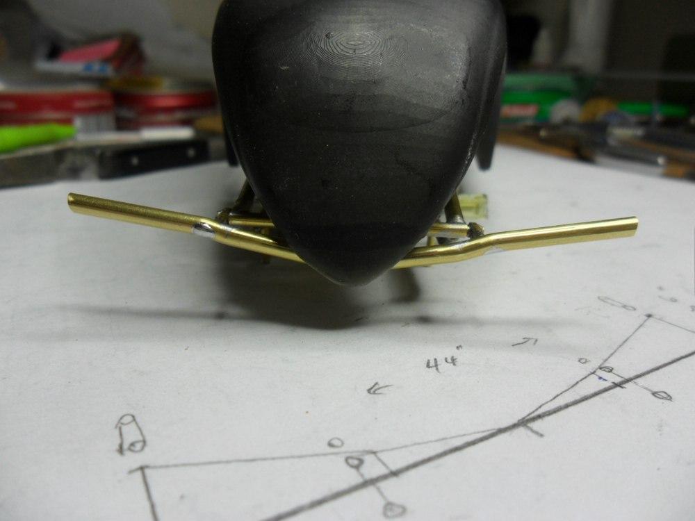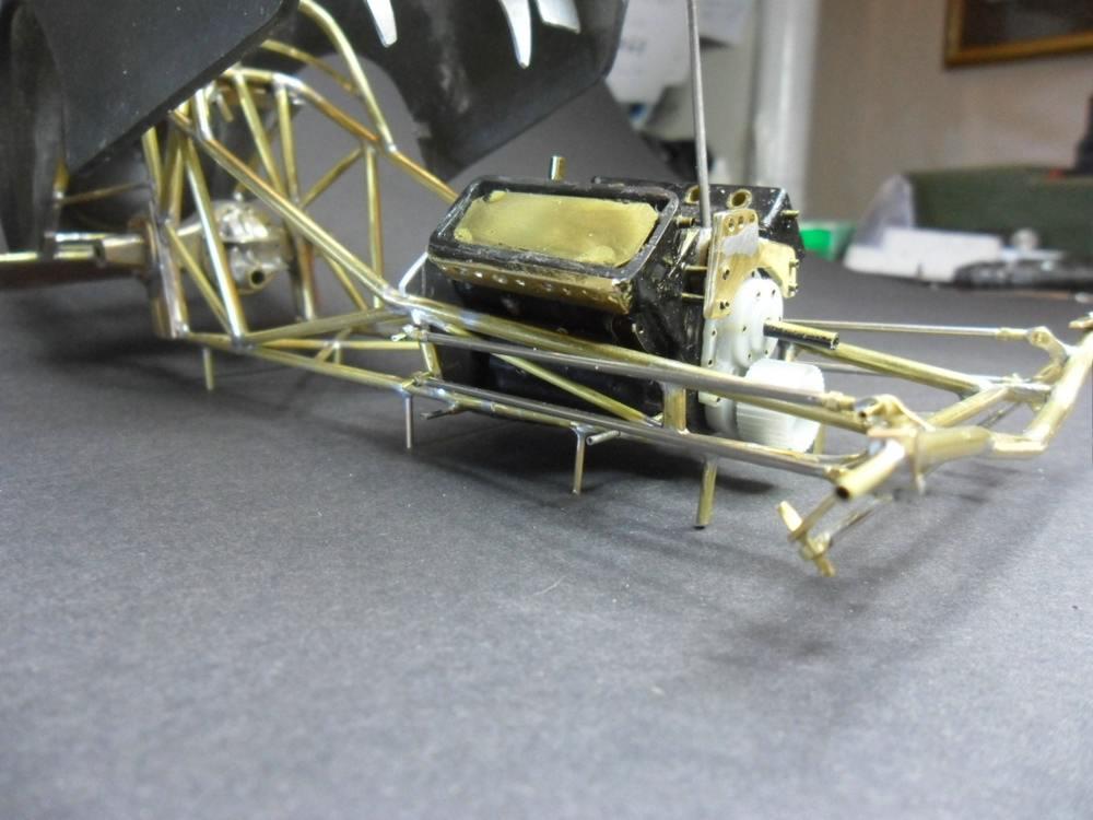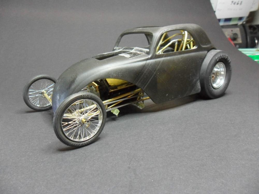 Moving on now, getting the front axle set up to the chassis. This model is a true scale, 94" WB from back in the day. Things get really tight up front. Of course, the hood nose needed massaging. Only needing a low stance for this model. Please look.... PS: the shown crummy spoked wheels up front are only for getting things sized up. Thanks for looking. Mike..