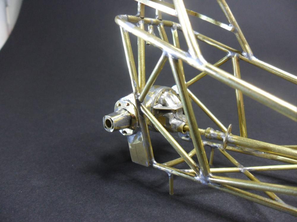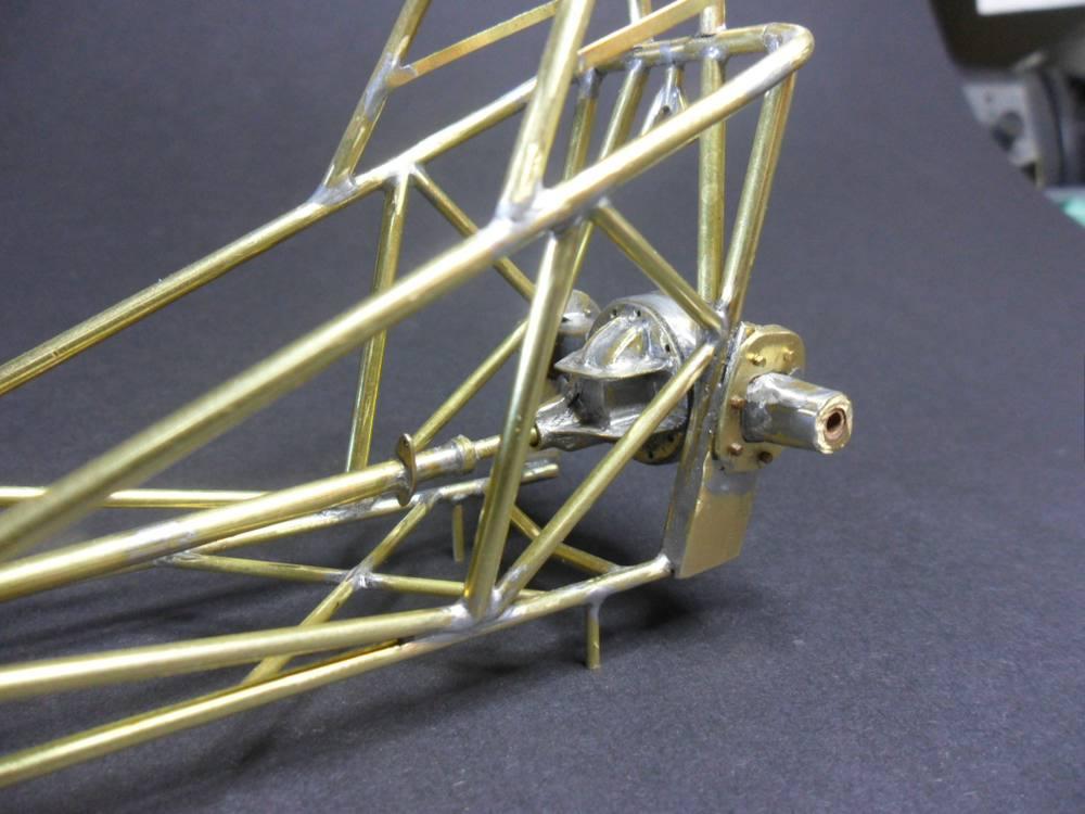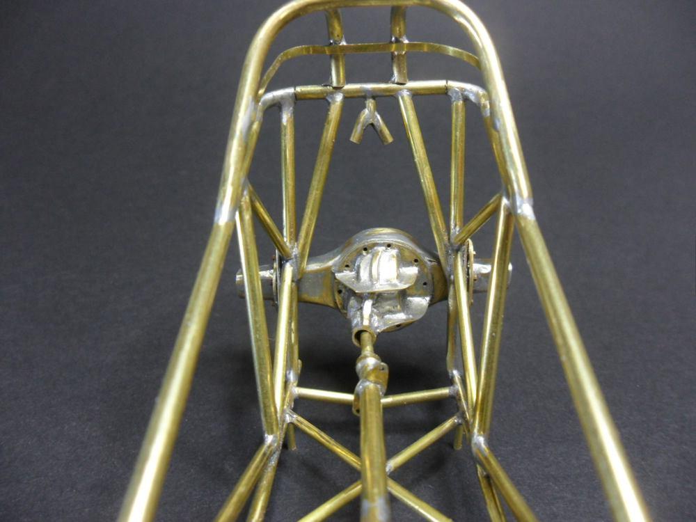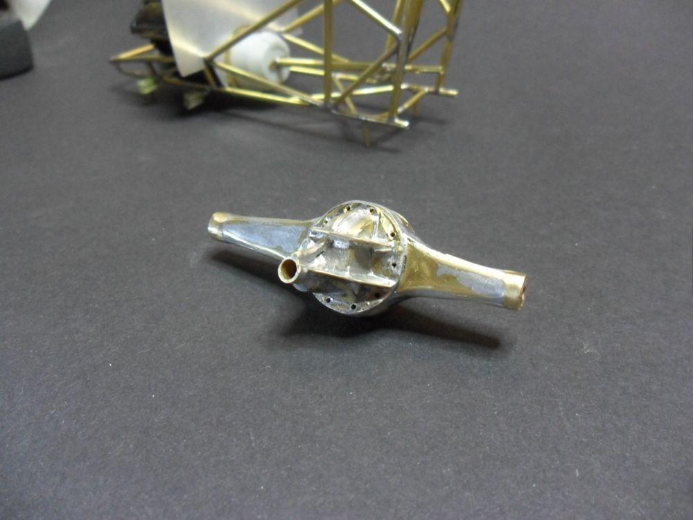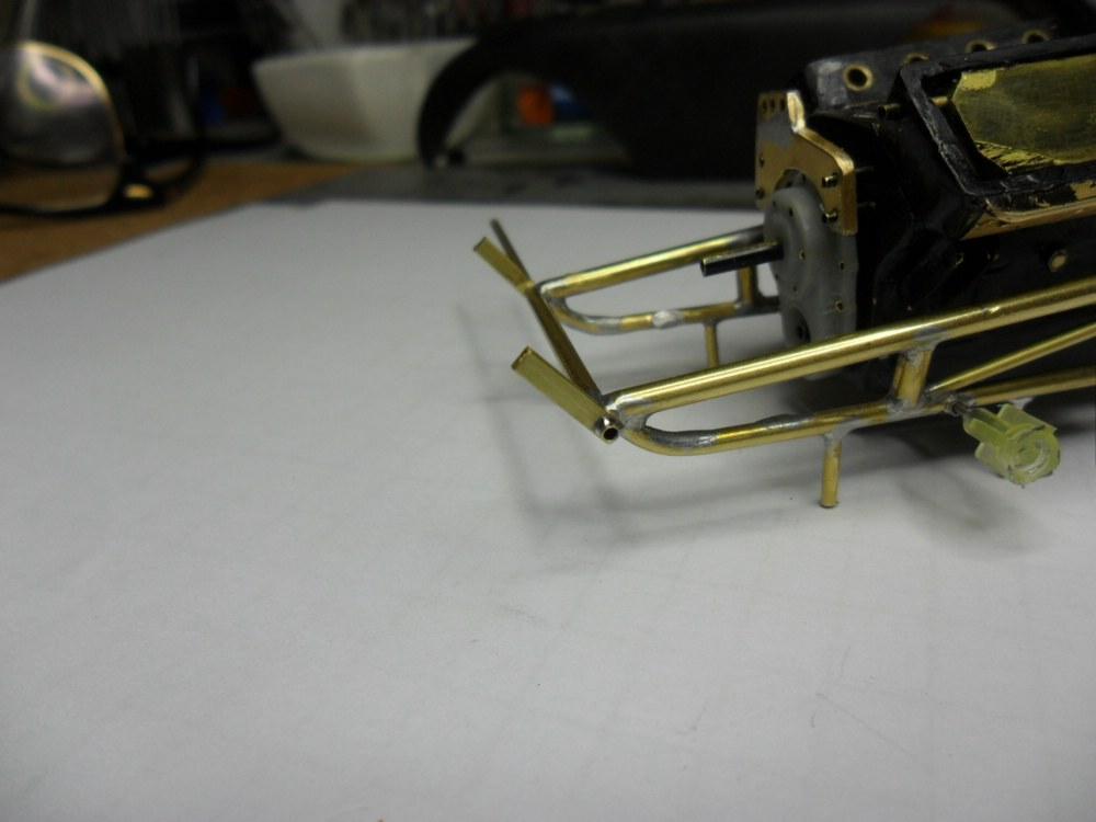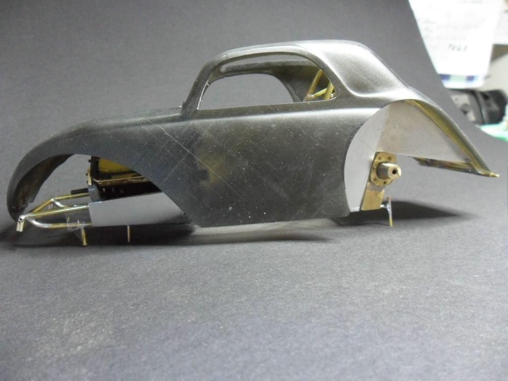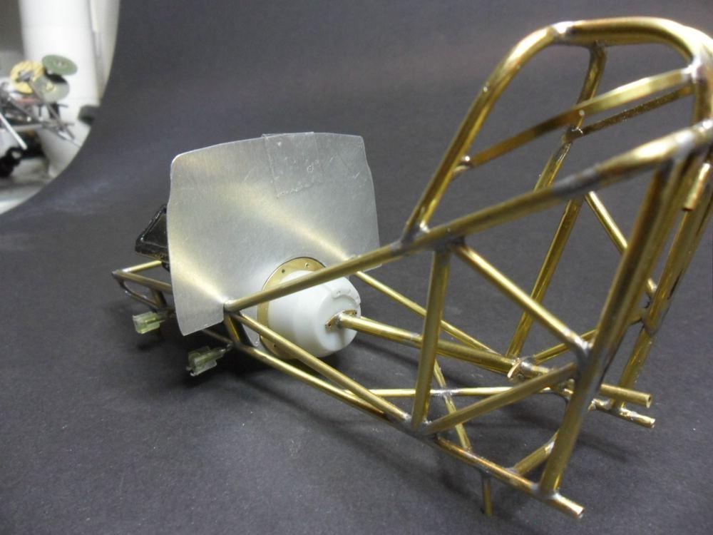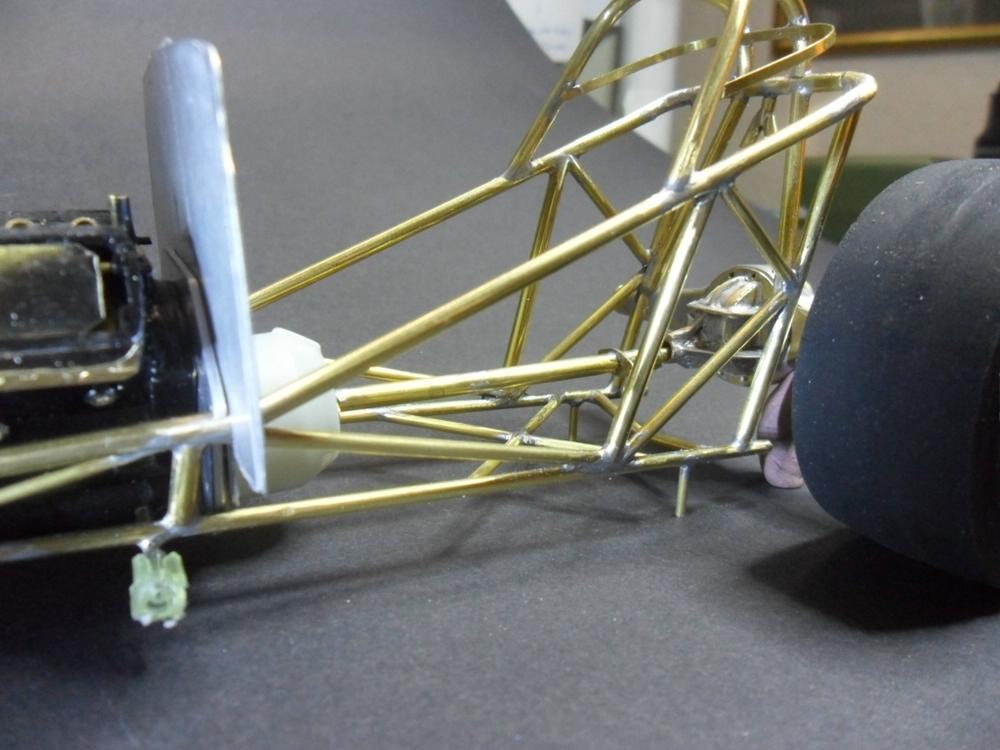 Moving on now, getting the front axle set up to the chassis. This model is a true scale, 94" WB from back in the day. Things get really tight up front. Of course, the hood nose needed massaging. Only needing a low stance for this model. Please look.... PS: the shown crummy spoked wheels up front are only for getting things sized up. Thanks for looking. Mike..