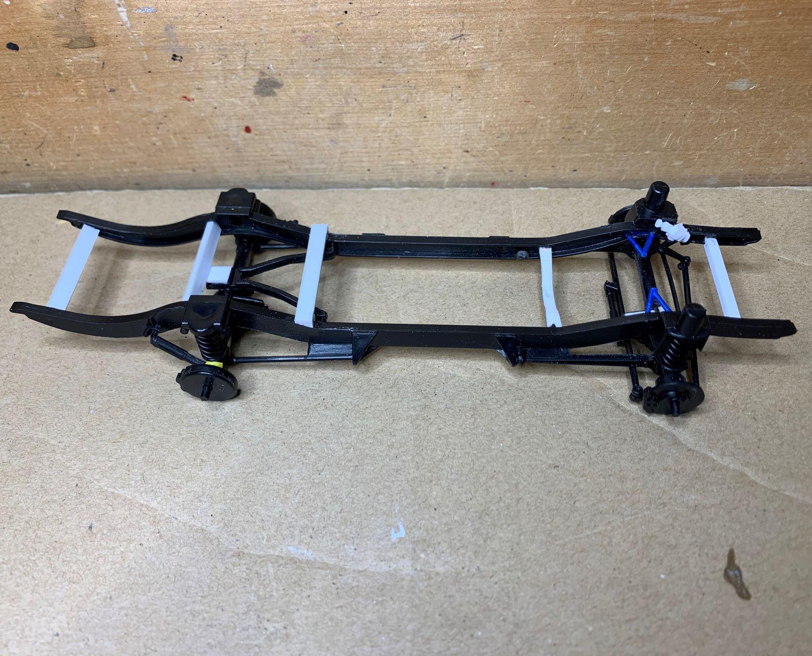 So when I decided to cut the hood open, and make the inner fenders and firewall, I made them a bit taller than the way the kit was designed, which was curbside. This would allow me to have a body lift kit, sort of, as the frame will now sit a bit lower, body a bit higher. That meant the interior would be too deep, so I made the rear compartment, which I plan to have painted sheet metal to match the body, and added that to the body. I can put spacers on the underside of the rear compartment floor to keep the frame level, but mounted to the front as planned. That might explain some of the pictures in the post above!