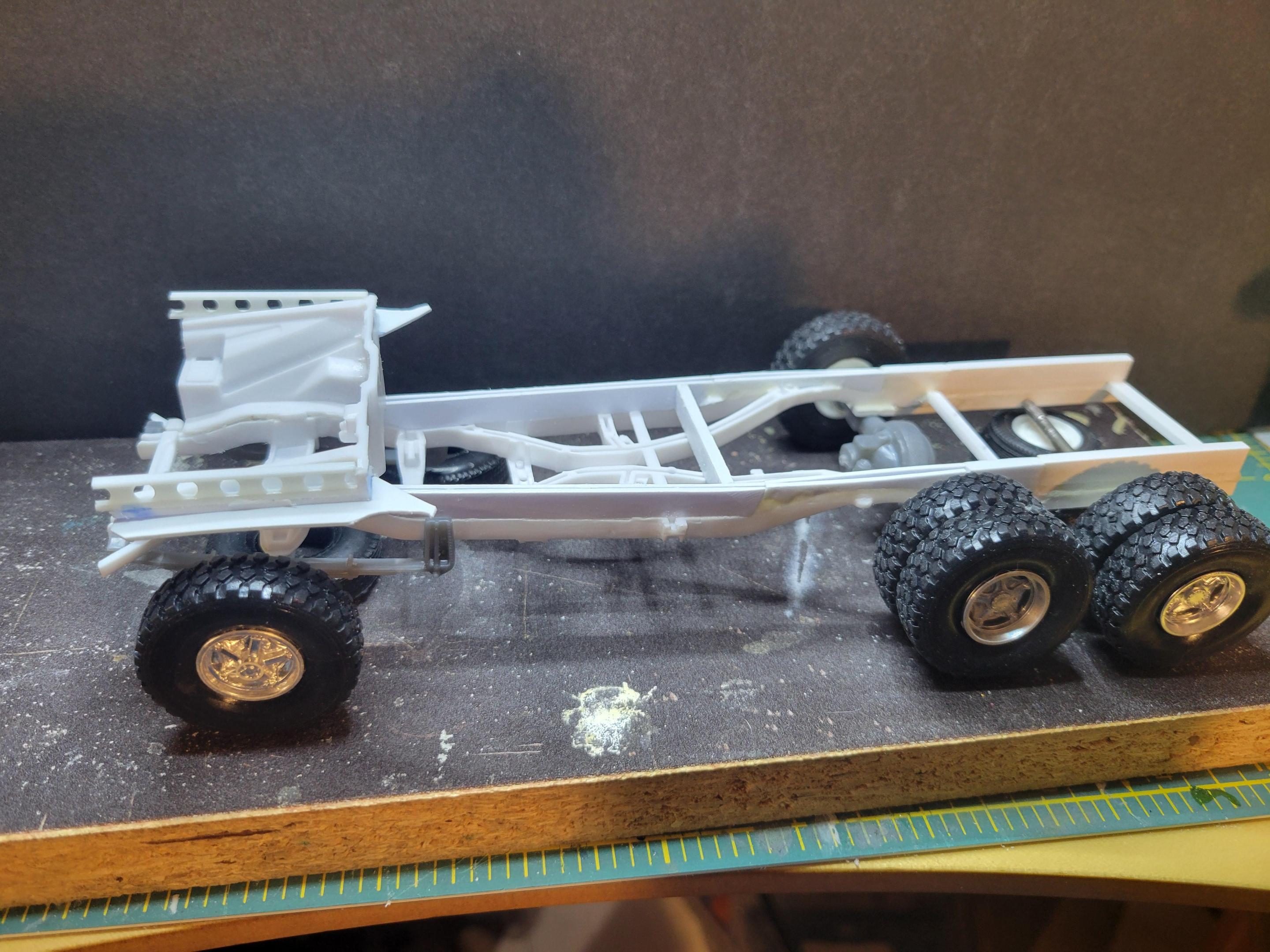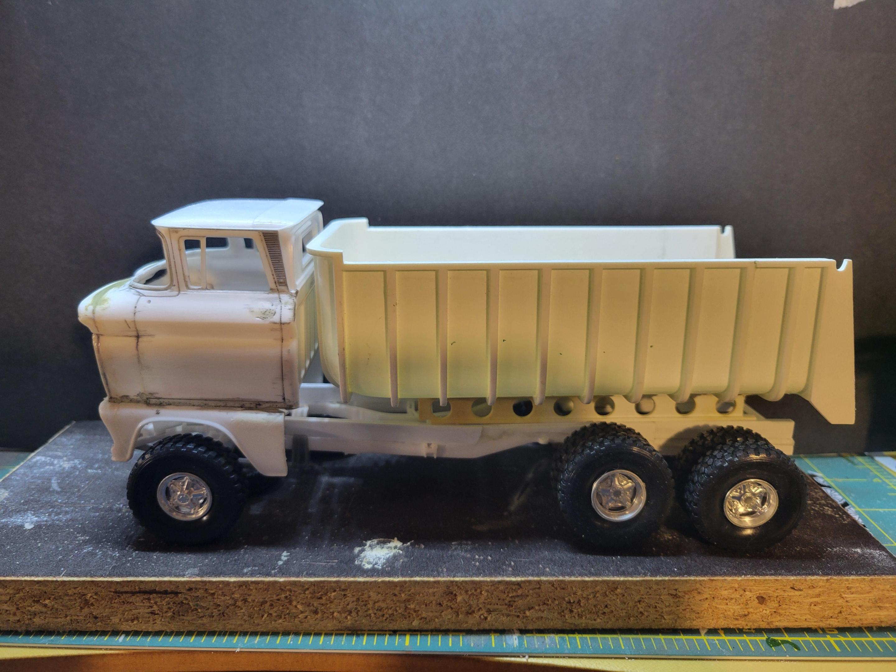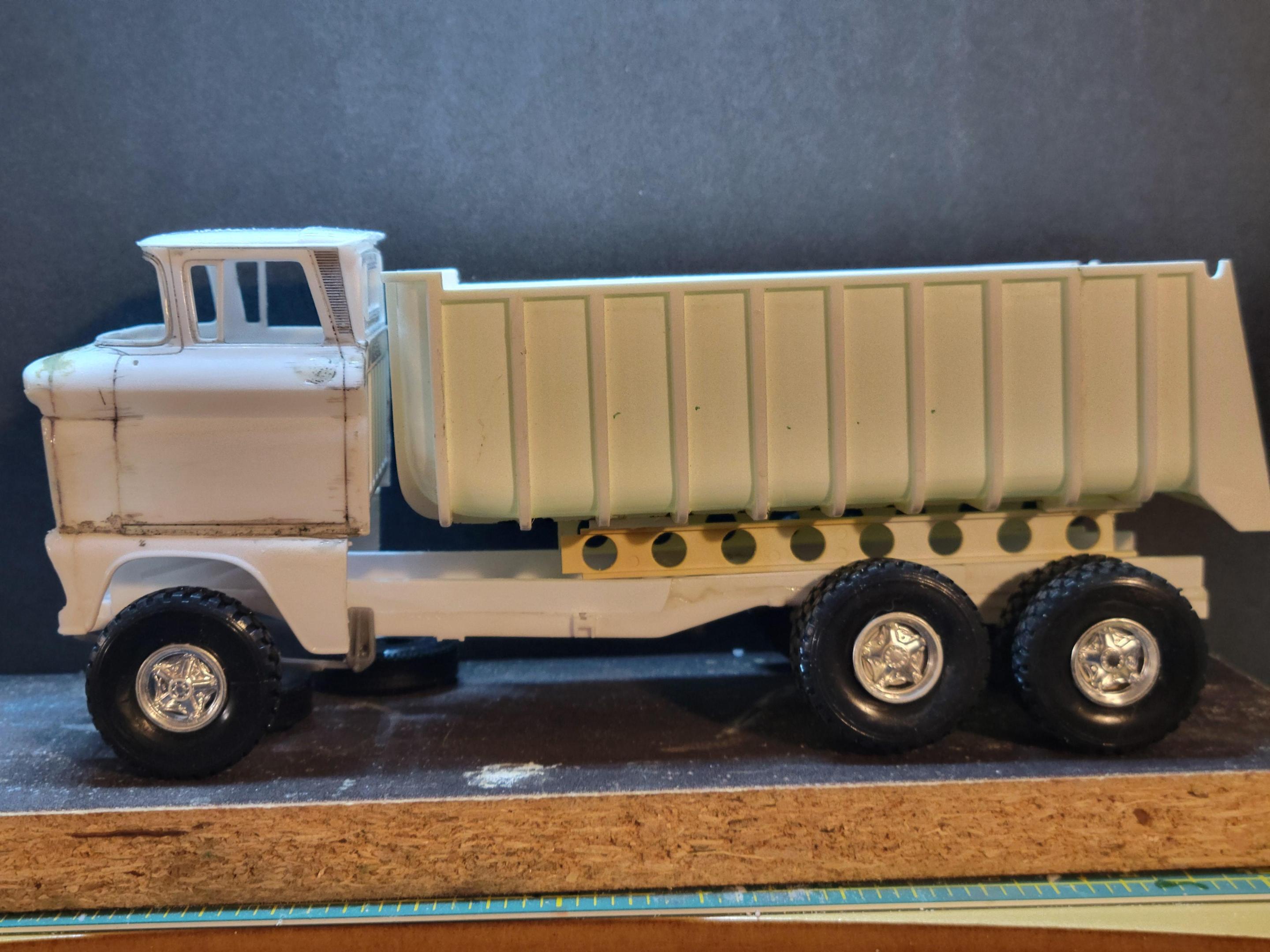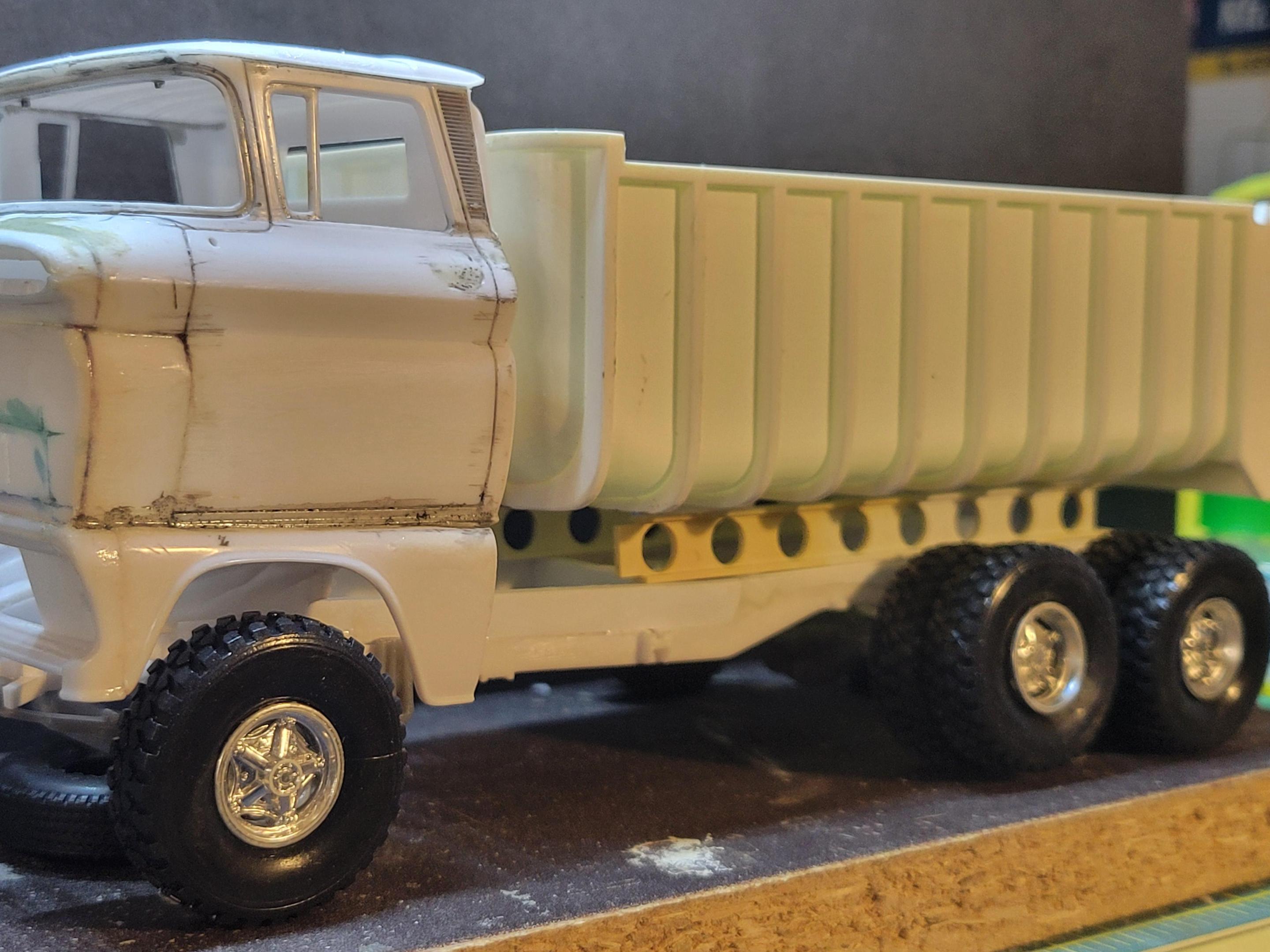 13. I've been working on this lately . I'm trying to finish before February. I was trying to keep it all parts from the 60 chev pickup but the frame looked way too small for the dump bucket , I was also going to keep it single rear axle but it looks way better as a tandem set up . Eventually this will have a theme and be part of a diorama . I'll post pics of it mocked up with the tandem setup later .