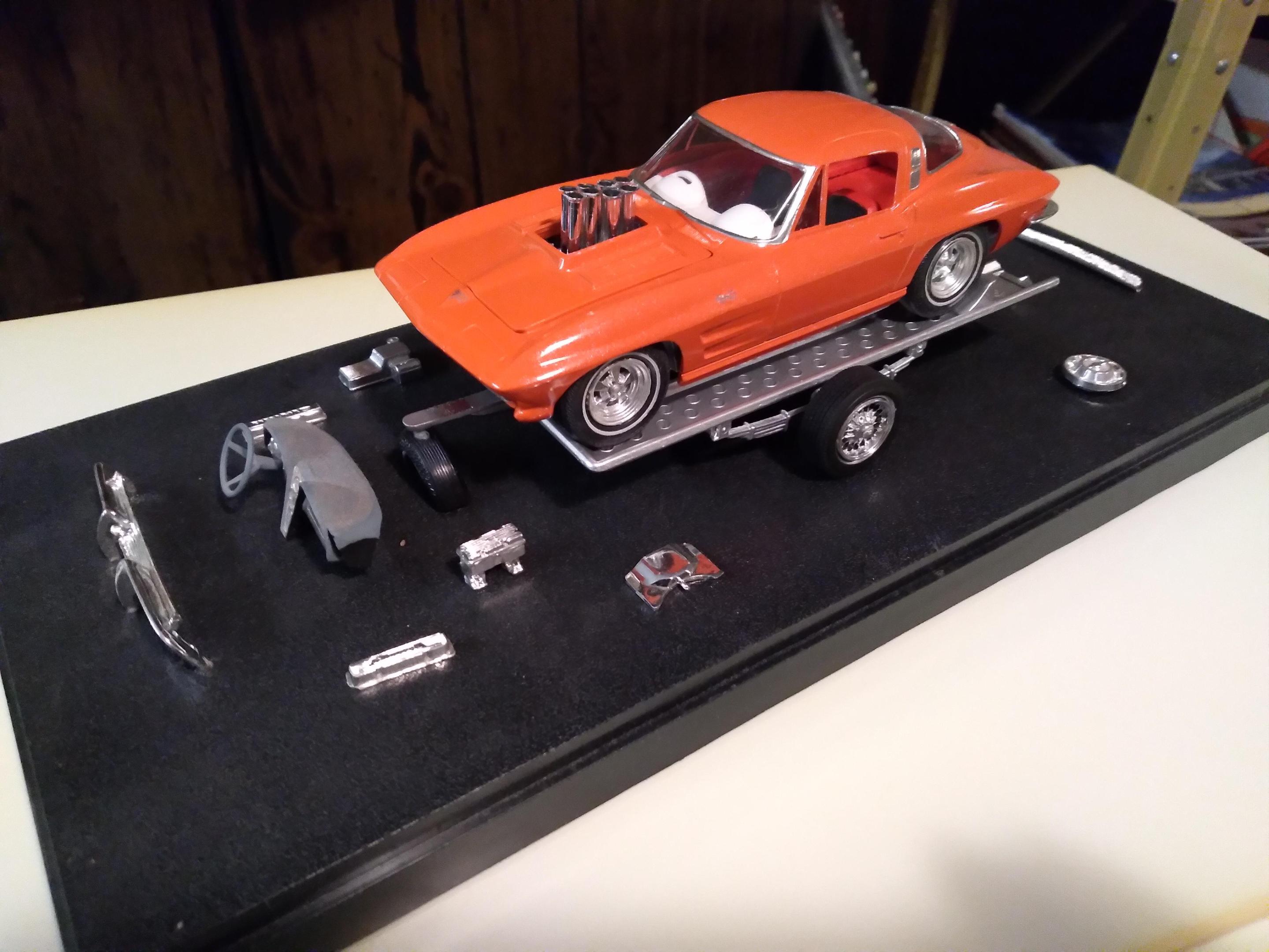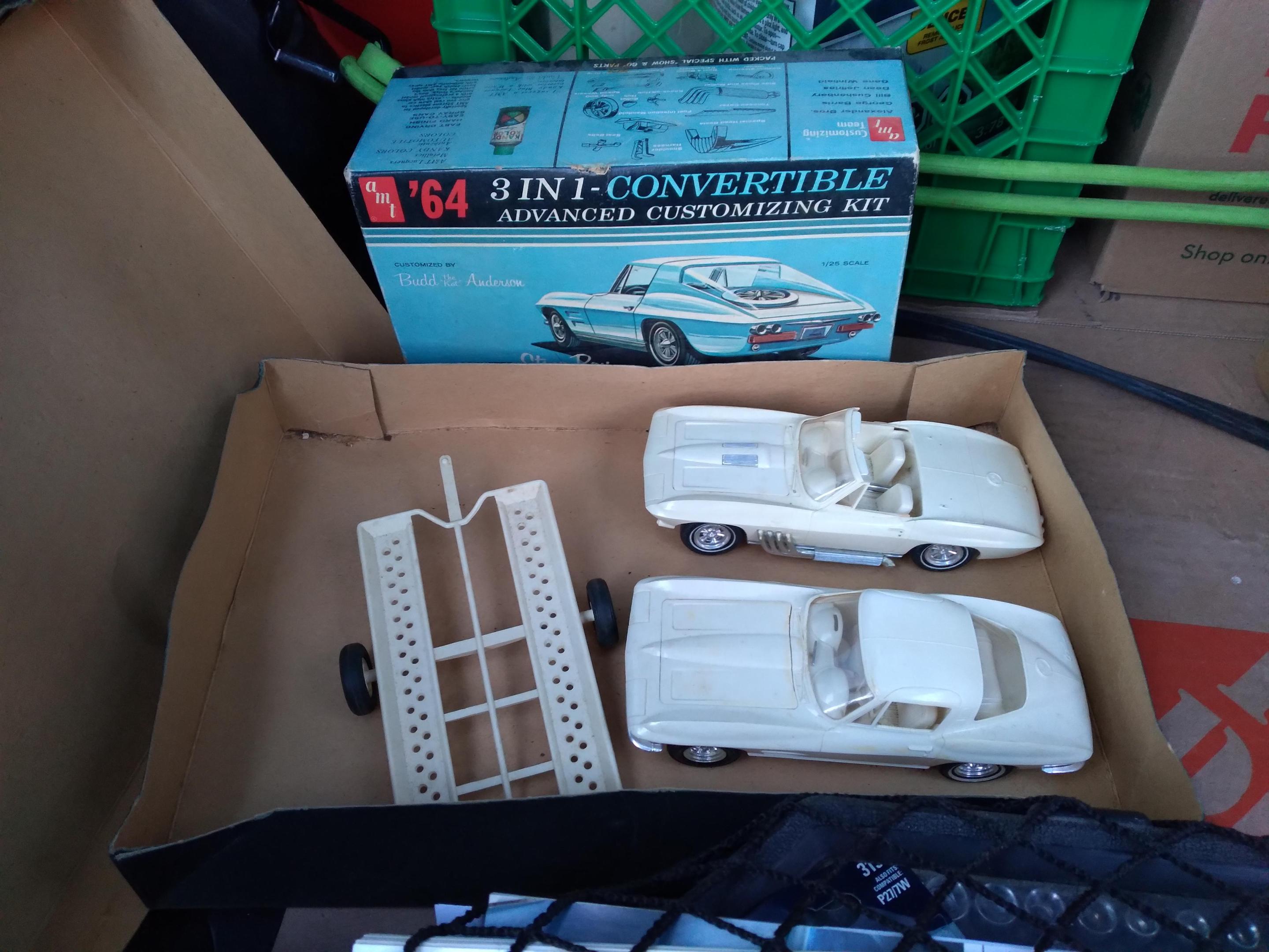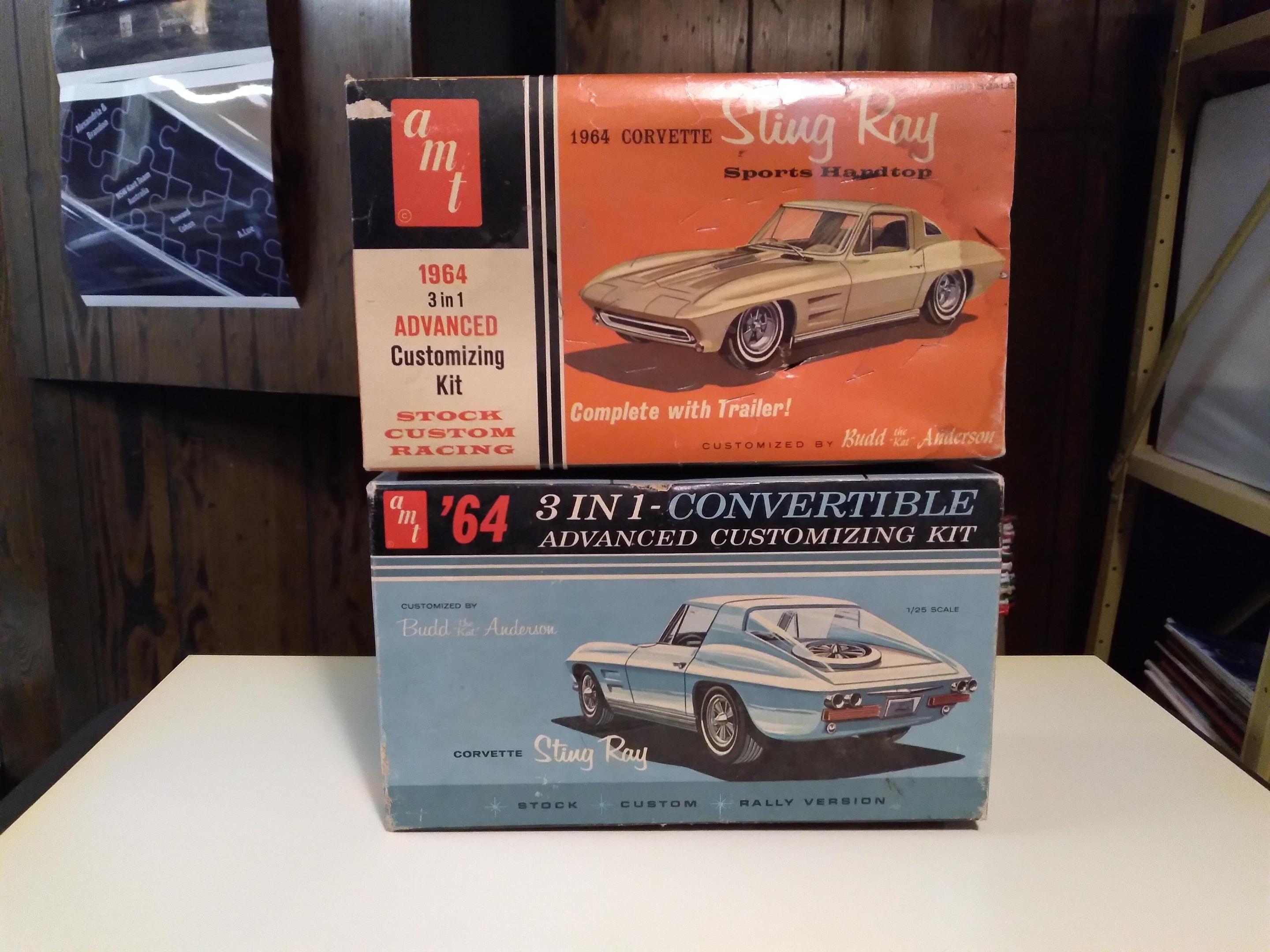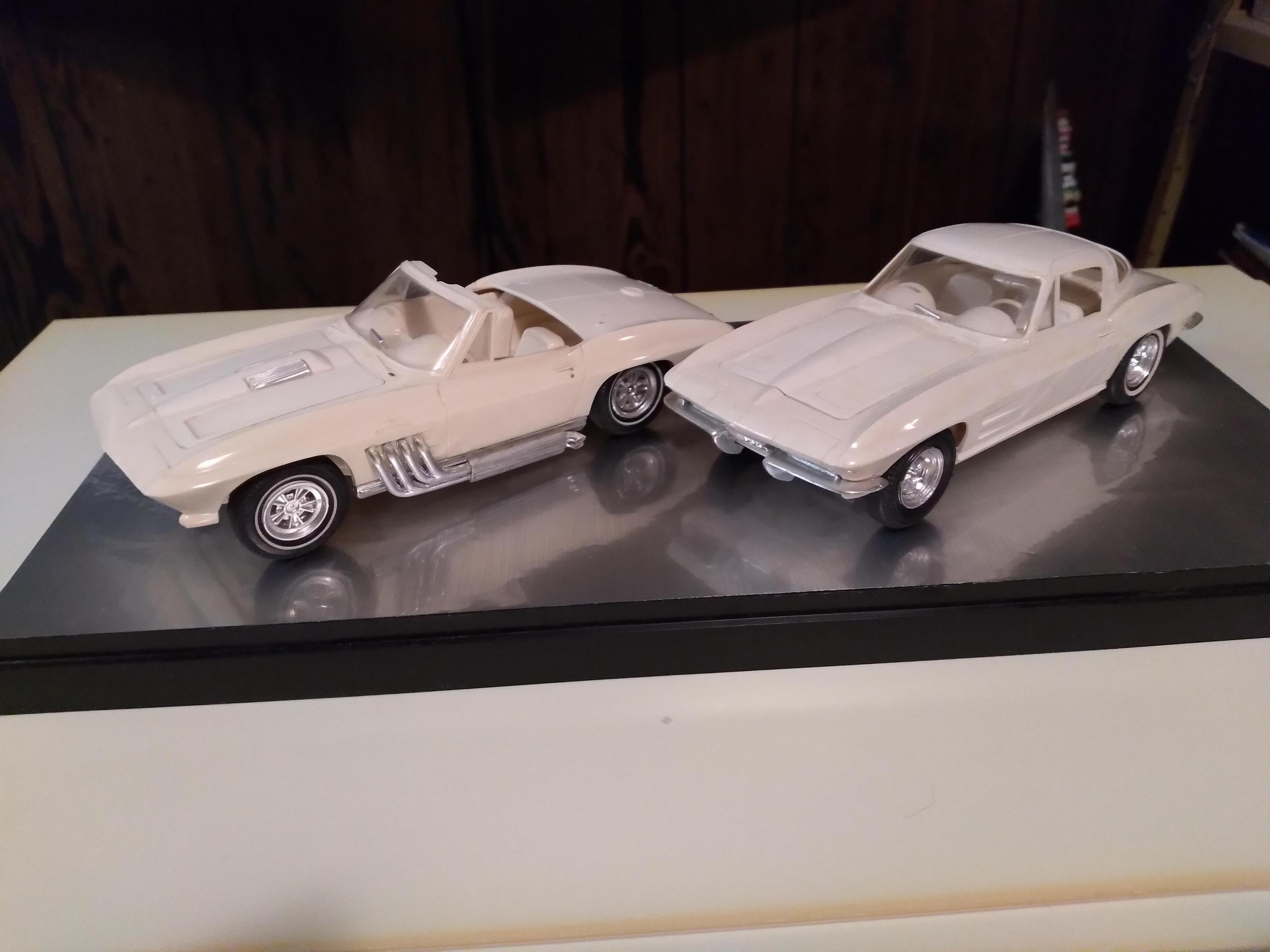 Here are a few more of my original AMT 63 & 64 Corvettes The first white one was a glue bomb, so much glue that the rear window post melted, hence the scoop (from a GT40). The convertible is one of 2 with rotating headlights, the other being the car from T.H.E.CAT, being restored. The red is a slightly modified coupe with some spare parts on the display base. Then my newest finds mounted together.