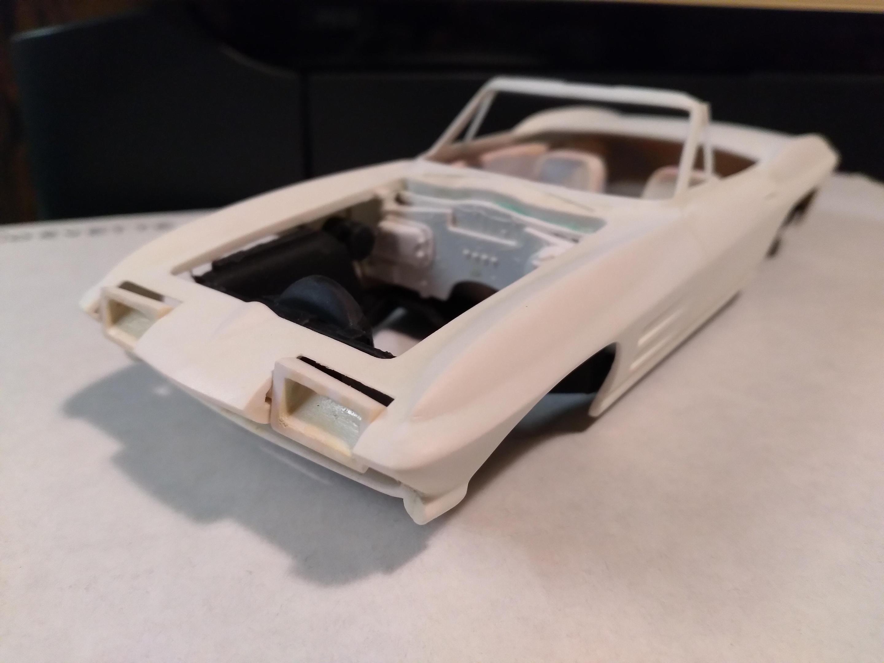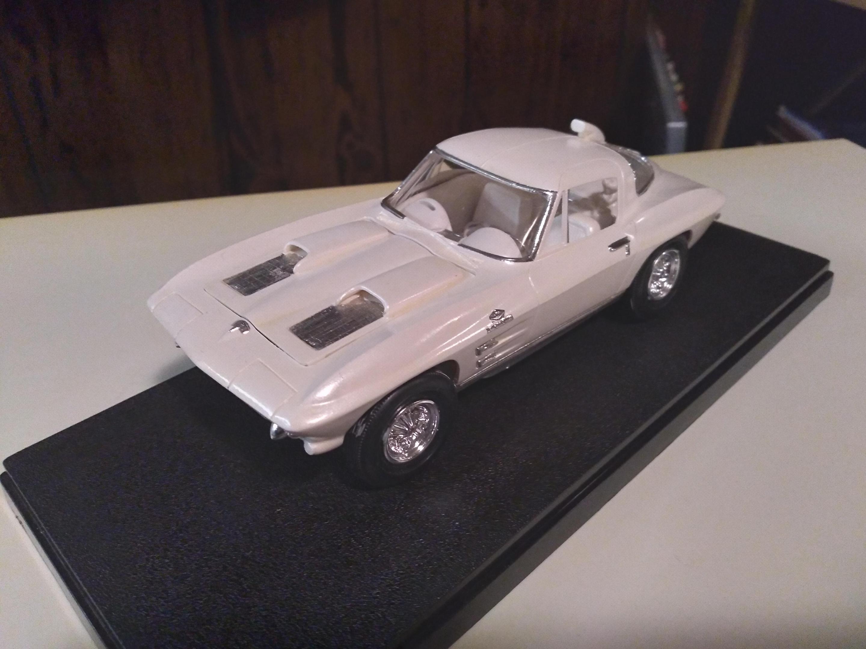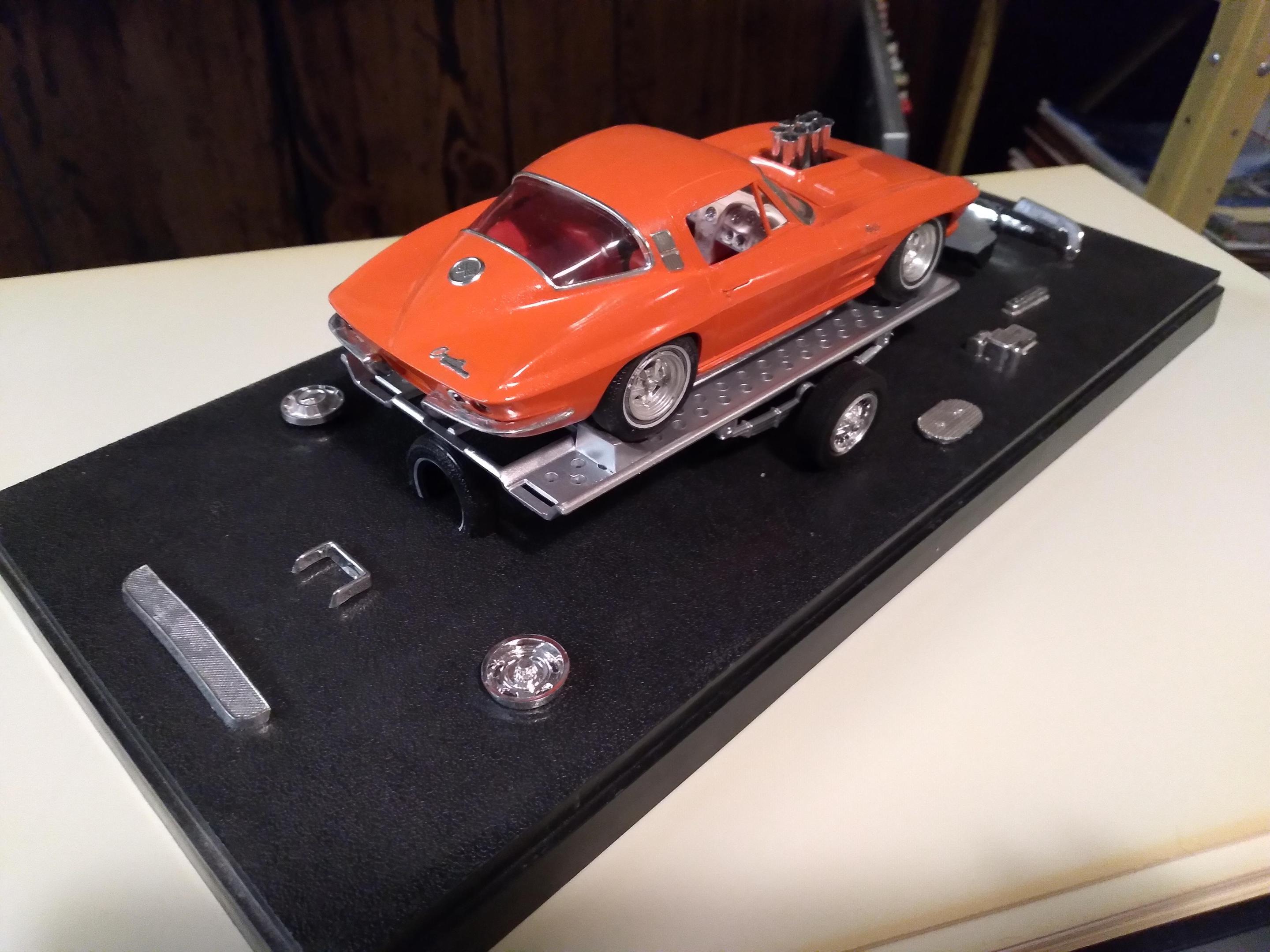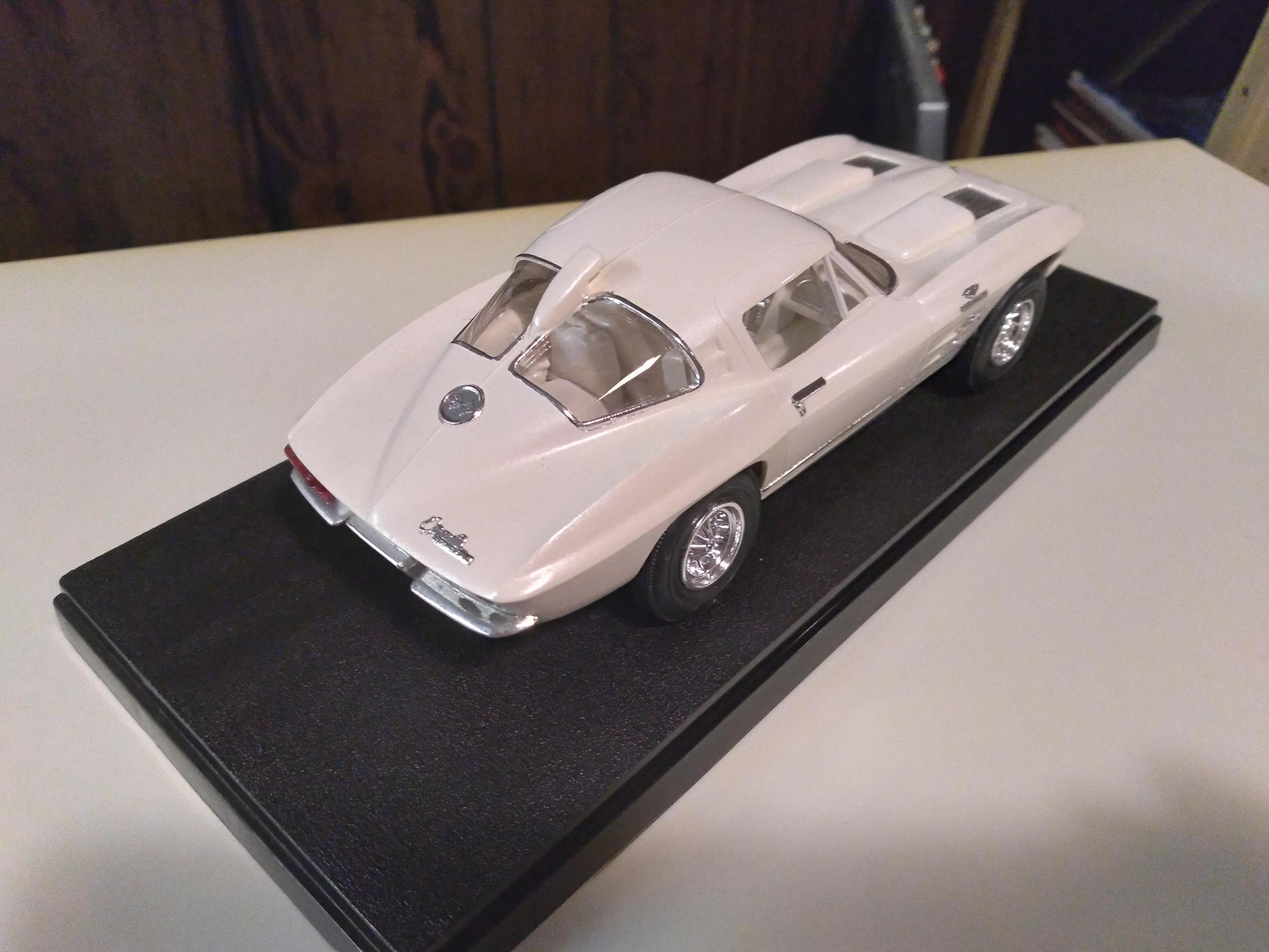 Here are a few more of my original AMT 63 & 64 Corvettes The first white one was a glue bomb, so much glue that the rear window post melted, hence the scoop (from a GT40). The convertible is one of 2 with rotating headlights, the other being the car from T.H.E.CAT, being restored. The red is a slightly modified coupe with some spare parts on the display base. Then my newest finds mounted together.
