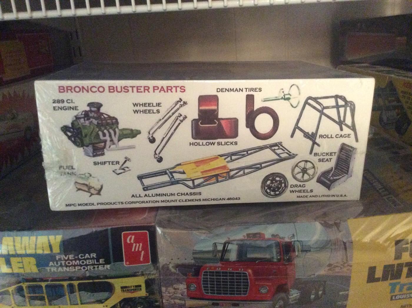 This is a fake, "what if" box I bought off Ebay. I went a lil further and purchased a resin body, resin front wheels, the Bronco Buster decals and a Polar Lights funny car kit (minus the body), put all of it in the box and then had the box sealed.