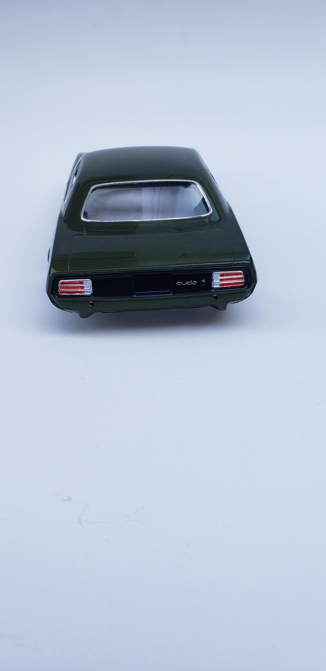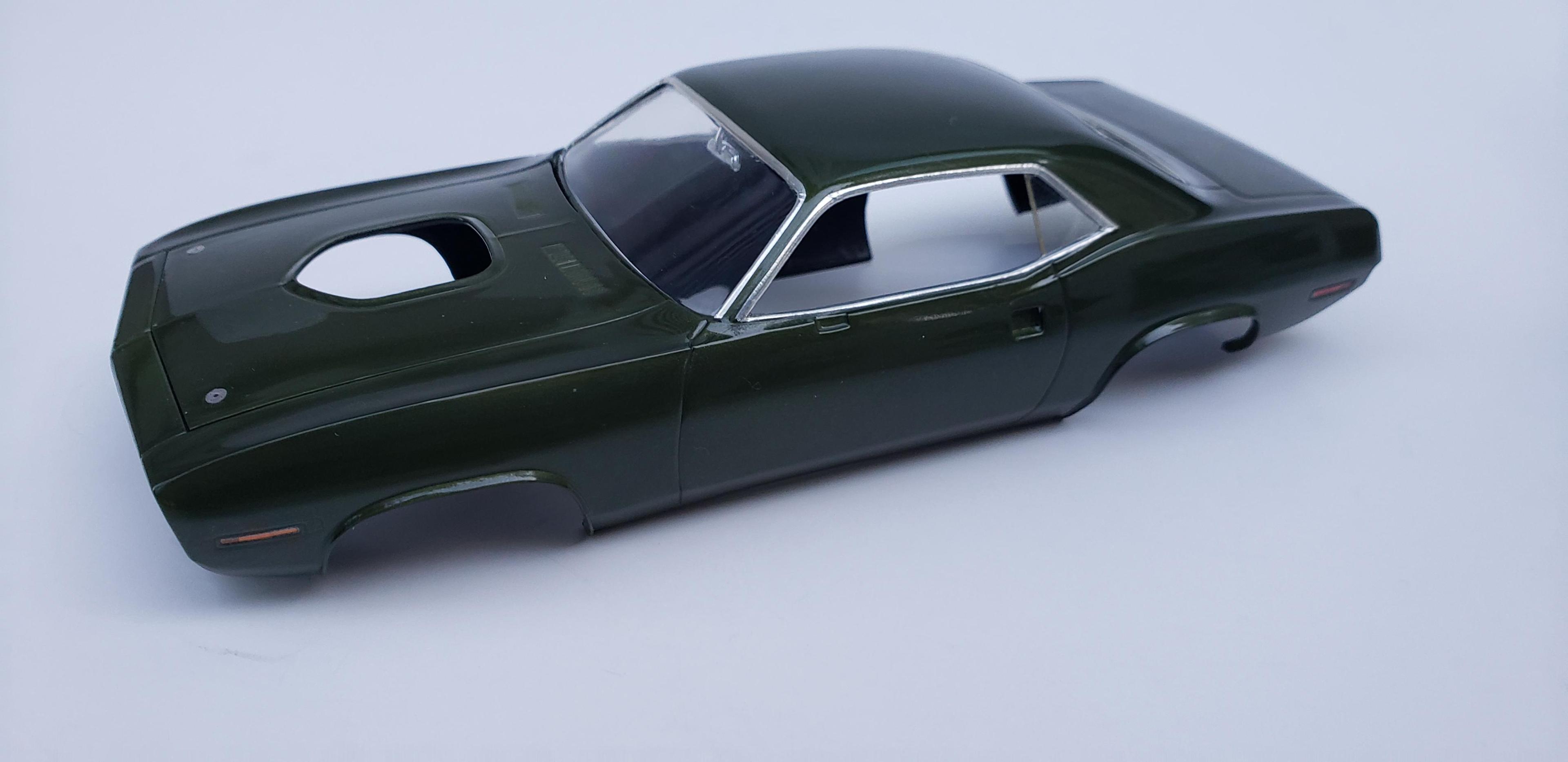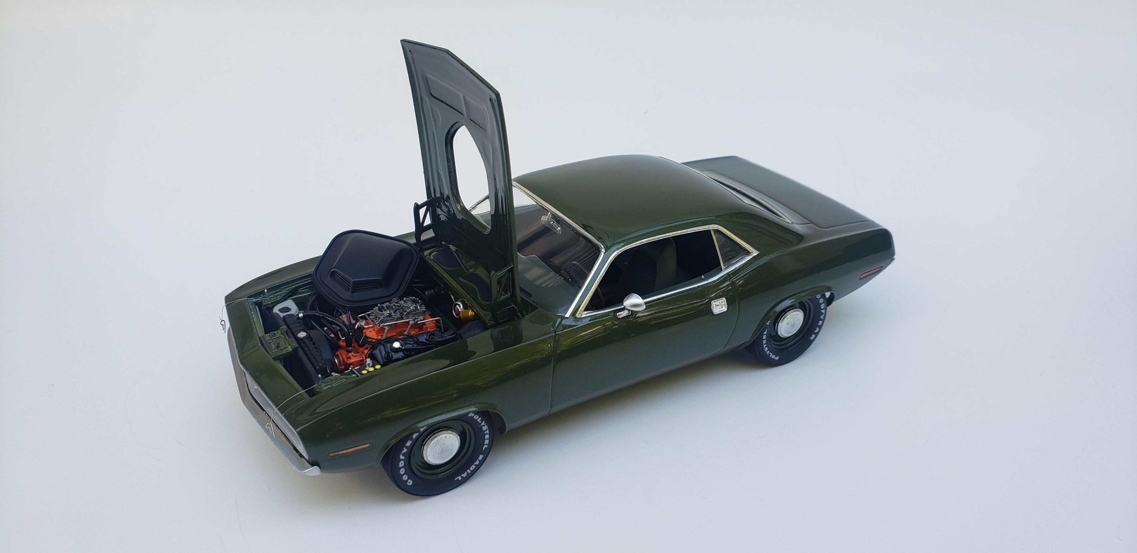 Done enough. Paint is Model Car World Ivy Green Metallic with 2k clear polished out, some parts off the MCG 71 Cuda photoetch sheet, two different Tamiya green acrylics for the interior, detail master hard line #1 for the fuel line and carb linkage, Replicas and Miniatures of Maryland distributor, Fireball Modelworks carbs and wheels, thin aluminum sheet with RB Motion bolt and washer for the heater hose clamp, MCG seat belt buckles This was a fun and aggrevating build. Windows being a bit of trouble being really close to the window frames with little to no wiggle room. Taillights didn't fit right. I made a mistake with roll pan and installed it on the body for paint which made me have to trim some chassis stuff. It doesn't show on the final completion. Still gotta touch up that left taillight Hope you all enjoy