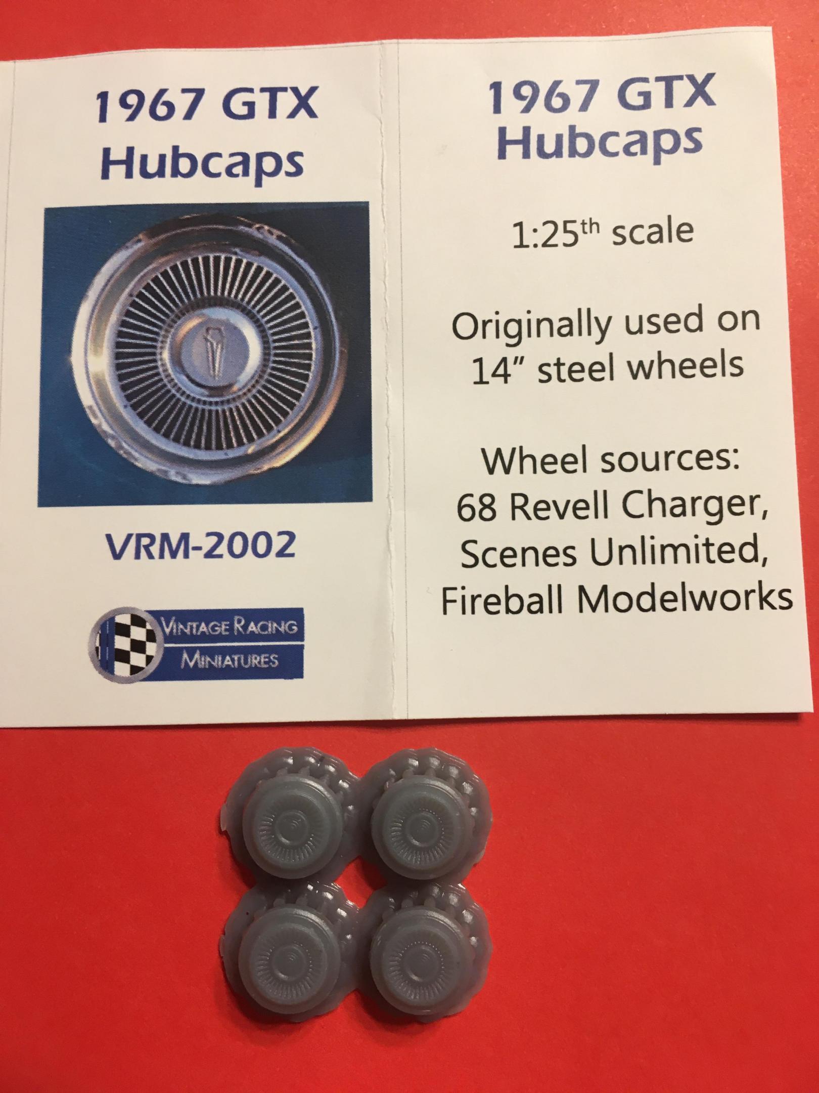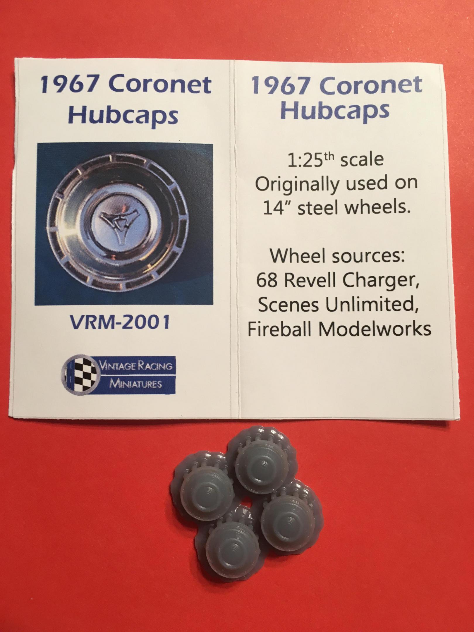 Hey All, Vintage Racing Miniatures is releasing 3D printed dogdish hubcaps for the '67 Coronet and GTX. There are a few sets on Ebay now until I can get t he website updated and more shipping boxes show up. I have other hubcaps for the '68 Dart, 70-72 Maverick, and wheel covers for the '67 and '69 Mustang and others in progress.