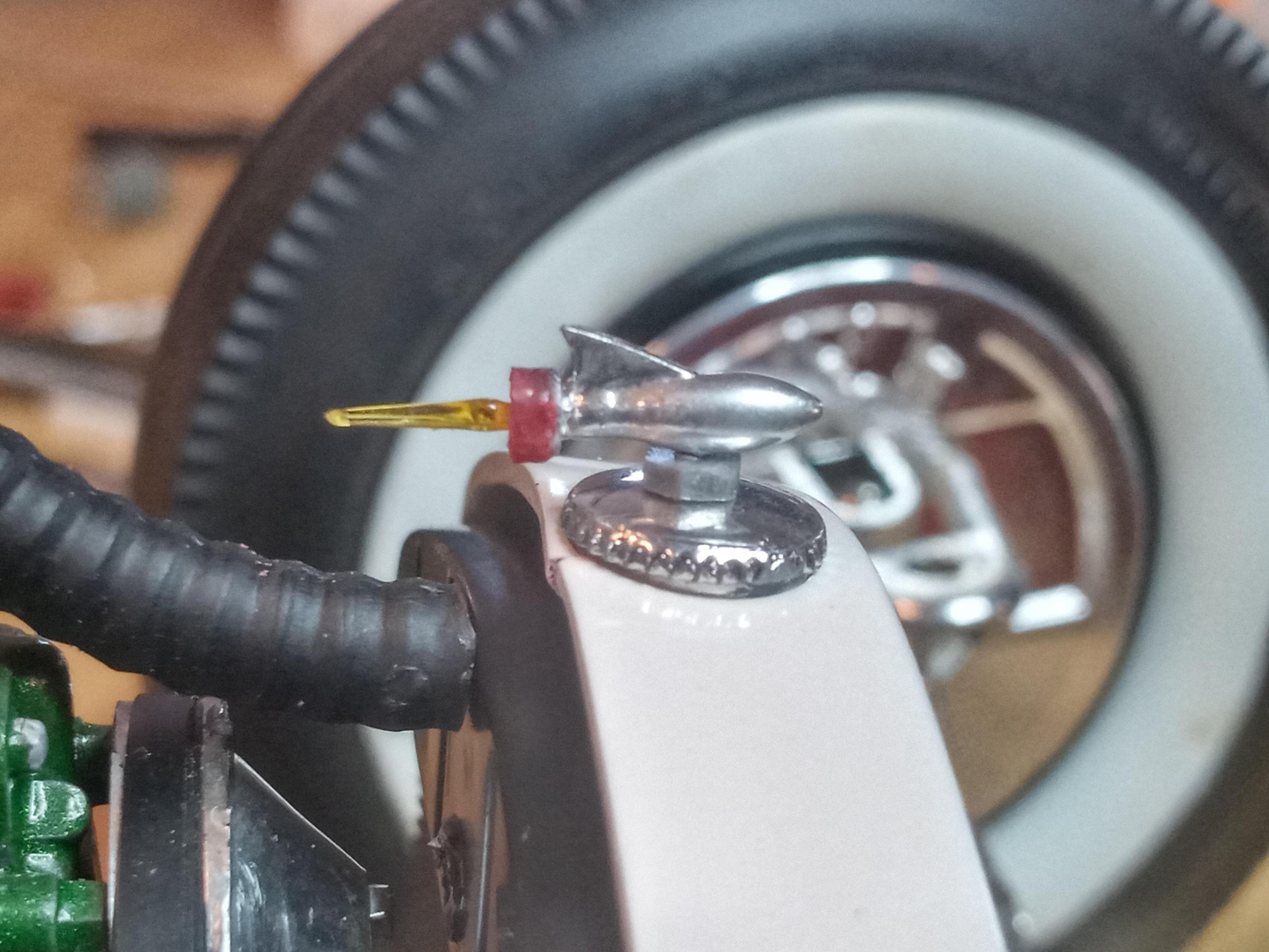The radiator mascot is a piece of translucent red sprue chucked into a Dremel and shaped with sanding sticks. Scrap styrene fin and a stretched amber sprue flame. Coated with Gundam marker chrome.