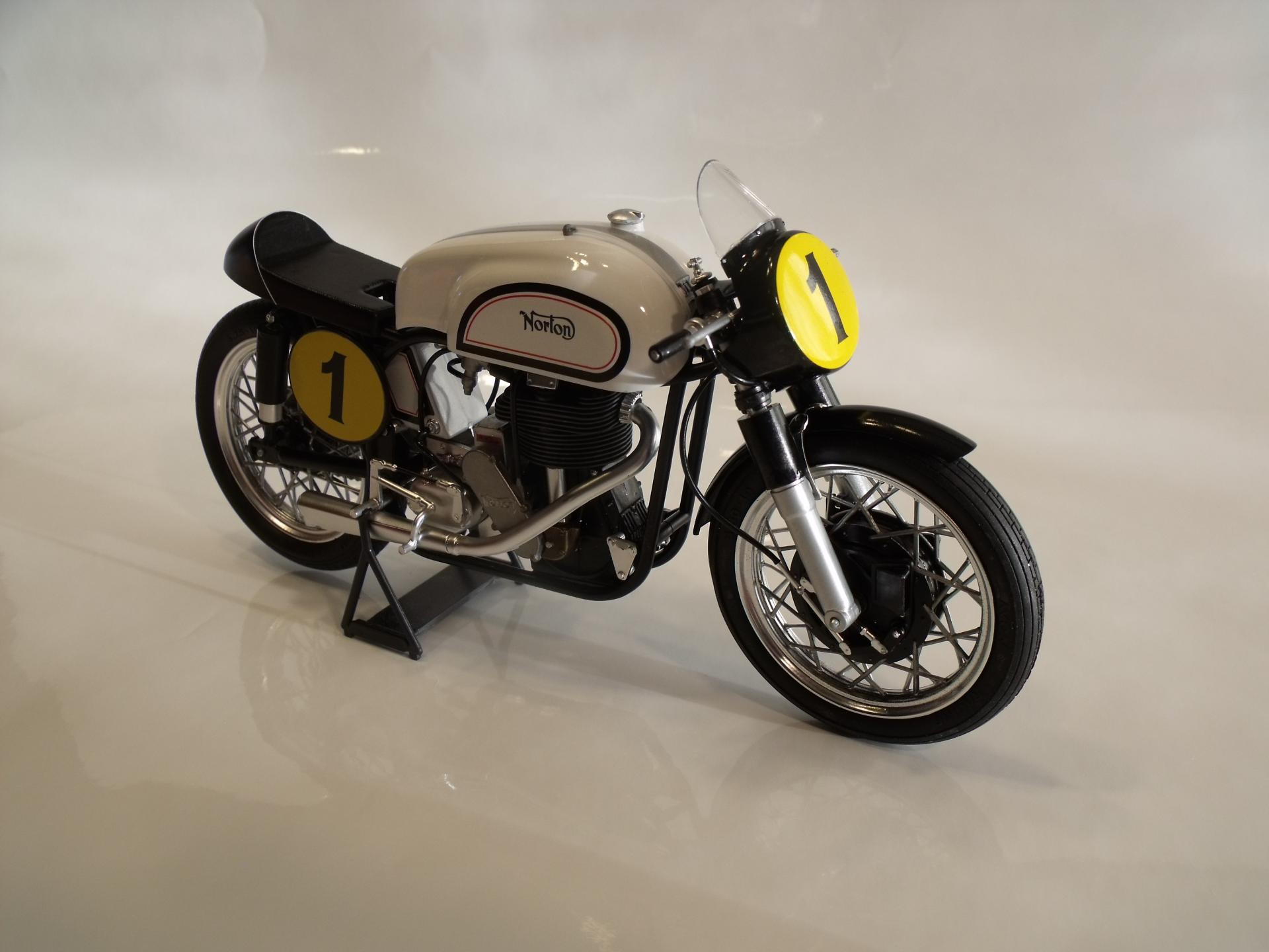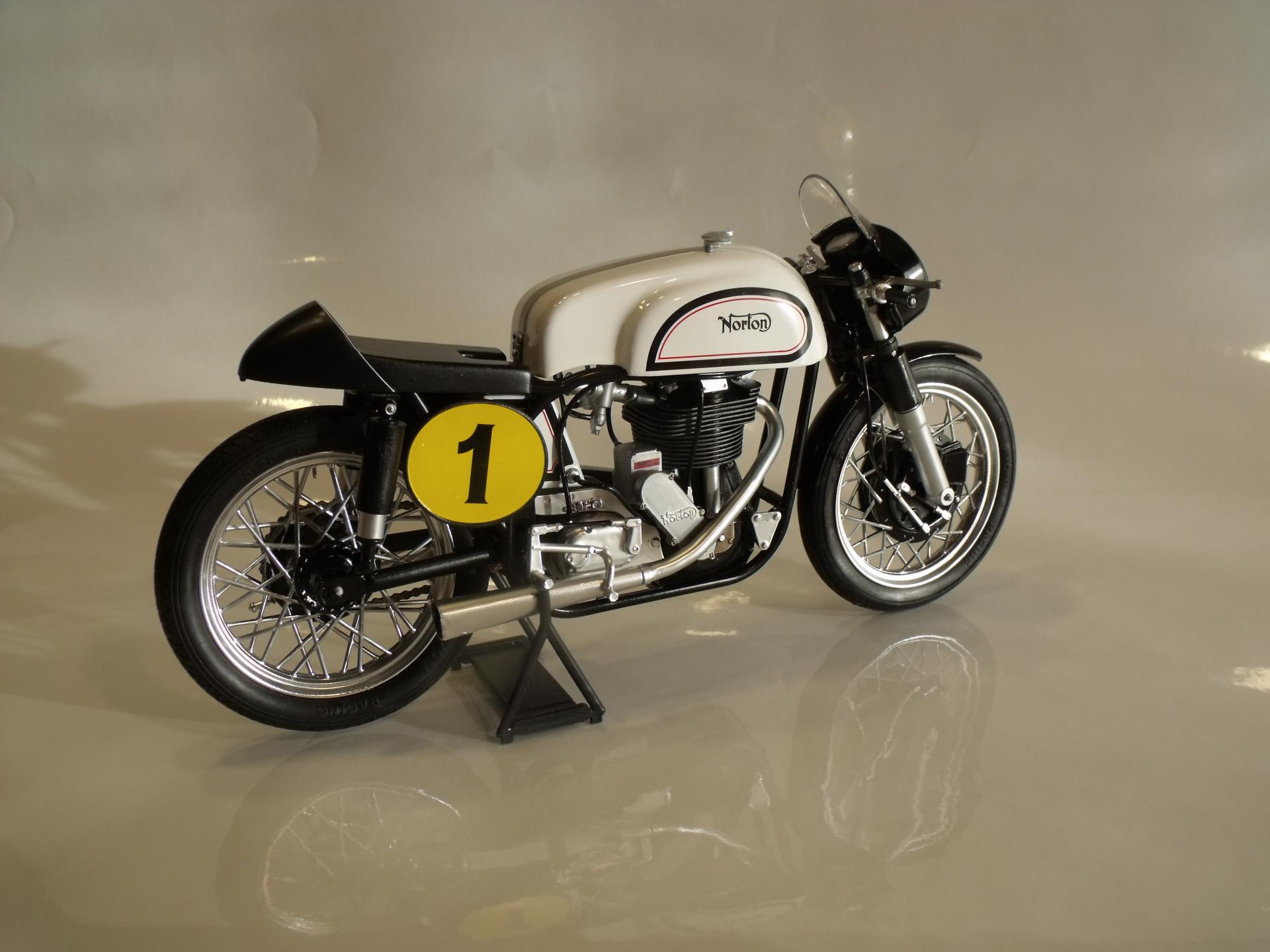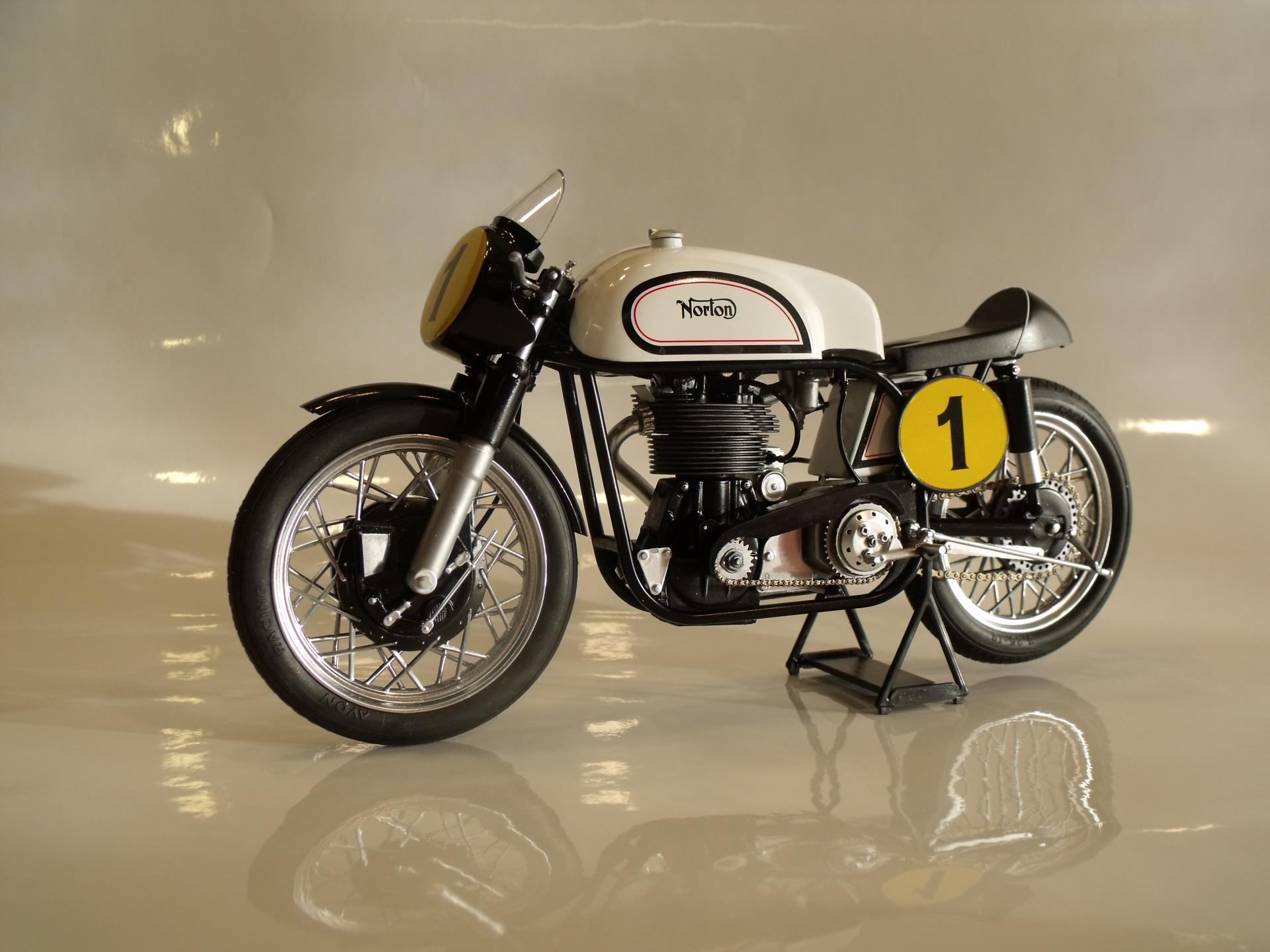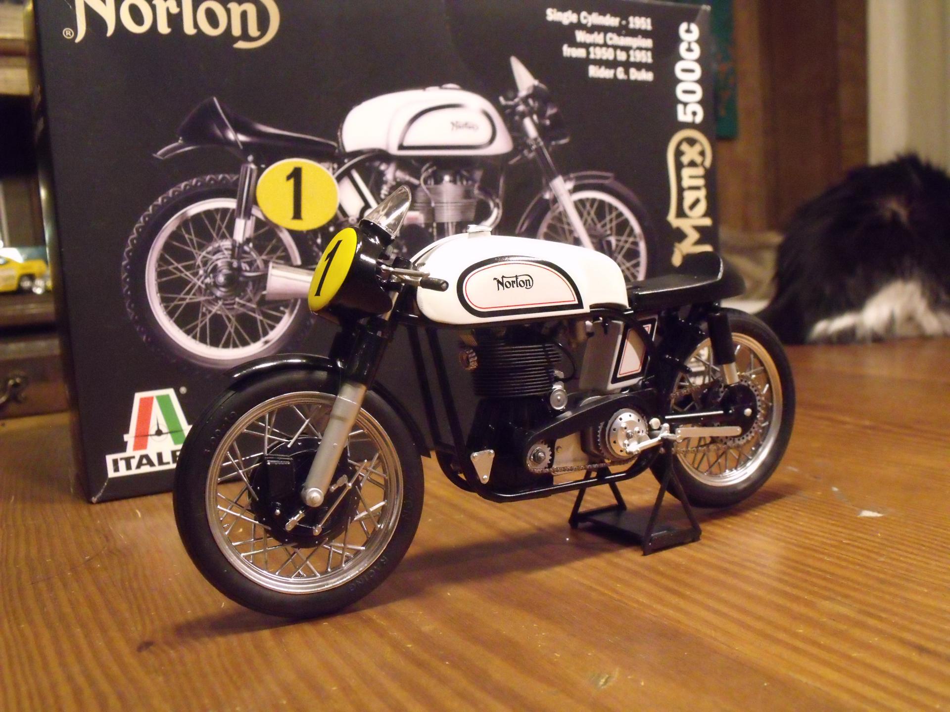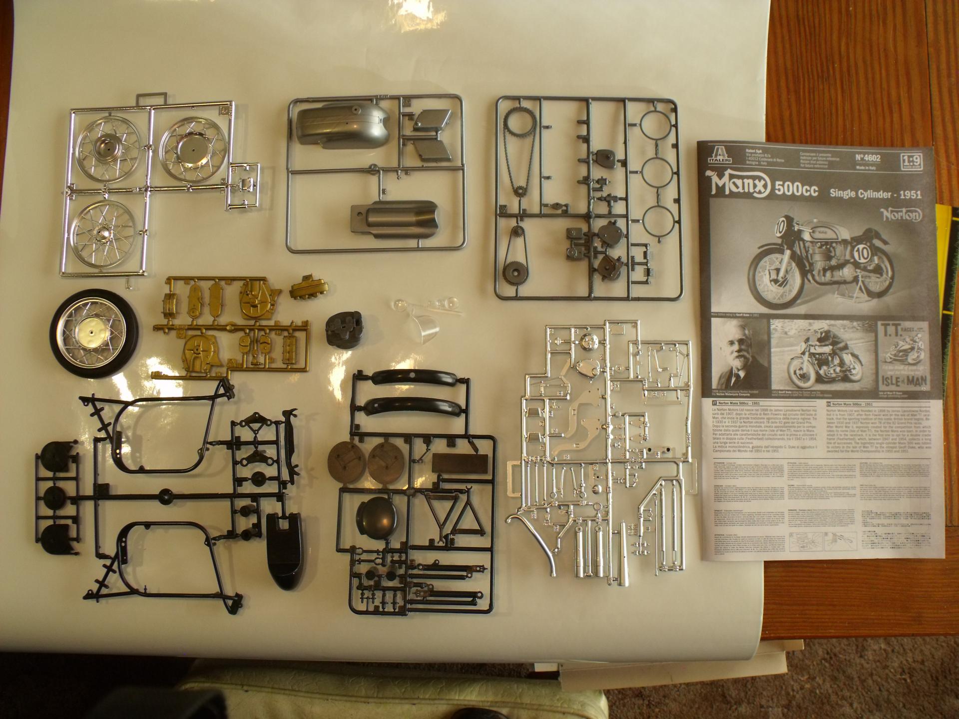 'll put this at about 80 percent done. It's a bit of a challenge, tolerances are really tight. I've given up on perfect alignment between the engine and the frame. Worked well in mock up. One major issue that wasn't self induced was with the chrome. The wheels and front fender bracket are coated with a semi flat clear. I sprayed this tree with Tamiya clear to brighten the rims, flat coating just the spokes with a brush. The other tree came in a matte finish, I didn't coat this one and the chrome flaked off in huge chunks as I worked with it. Just handling the tree caused a lap full of glitter. I stripped most of it and redid them with various metallic shades. A lot of it wouldn't have been chrome on the 1:1 anyway. Some fit is quite precise. A few mounting holes had to be radiused to accept the locator pins. I could do without working shocks as there have been some compromises in scale to get these into model form, the forks are bigger in diameter than they should be. On the plus side, the engraving is awesome for a kit from 1964. I love the subject matter. Obviously state of the art for the time, it has held up well. I think the original price was around $80. I got this from Tower Hobbies for 29.99. I think $80 would have been overpriced. Photoetched wheels would be an awesome addition. -