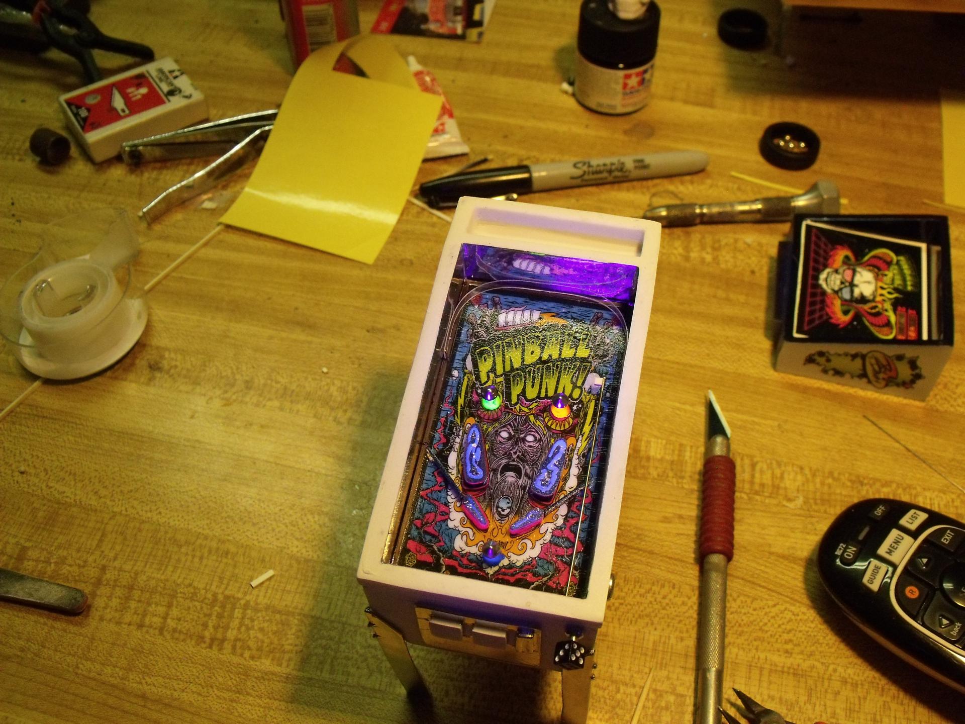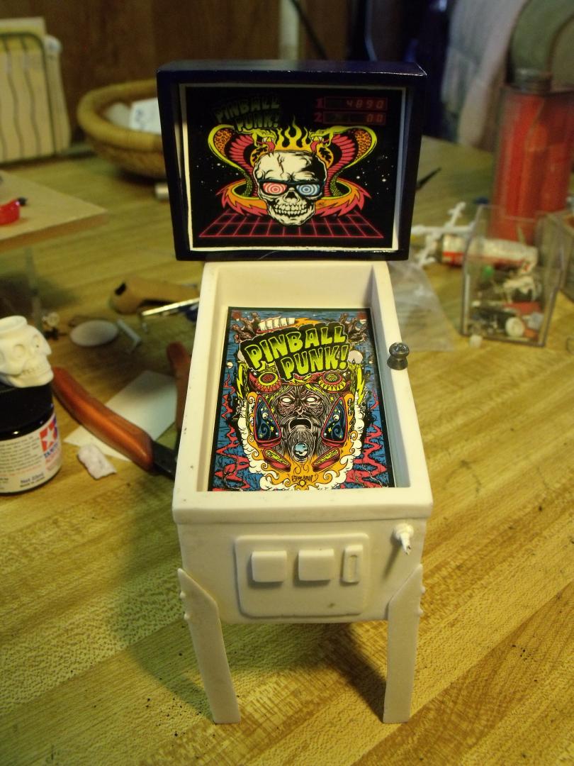I've never outsourced part of a project before, but my son started painting figures a little while ago and has already surpassed my skills in this area. I'd like to have some of his work, (and since he used to ask me to paint his figures) so I mailed the monster to him. This is the pinball machine. One of the proposed pellet bumpers is sitting up on the edge. I'll need to paint the sides of the upper structure white before the side decals go on. The decal issue introduced itself as I pulled the thing from the paper. I grabbed a piece of white sign vinyl and fit it into place while the decal was still on the wet paper then reapplied.