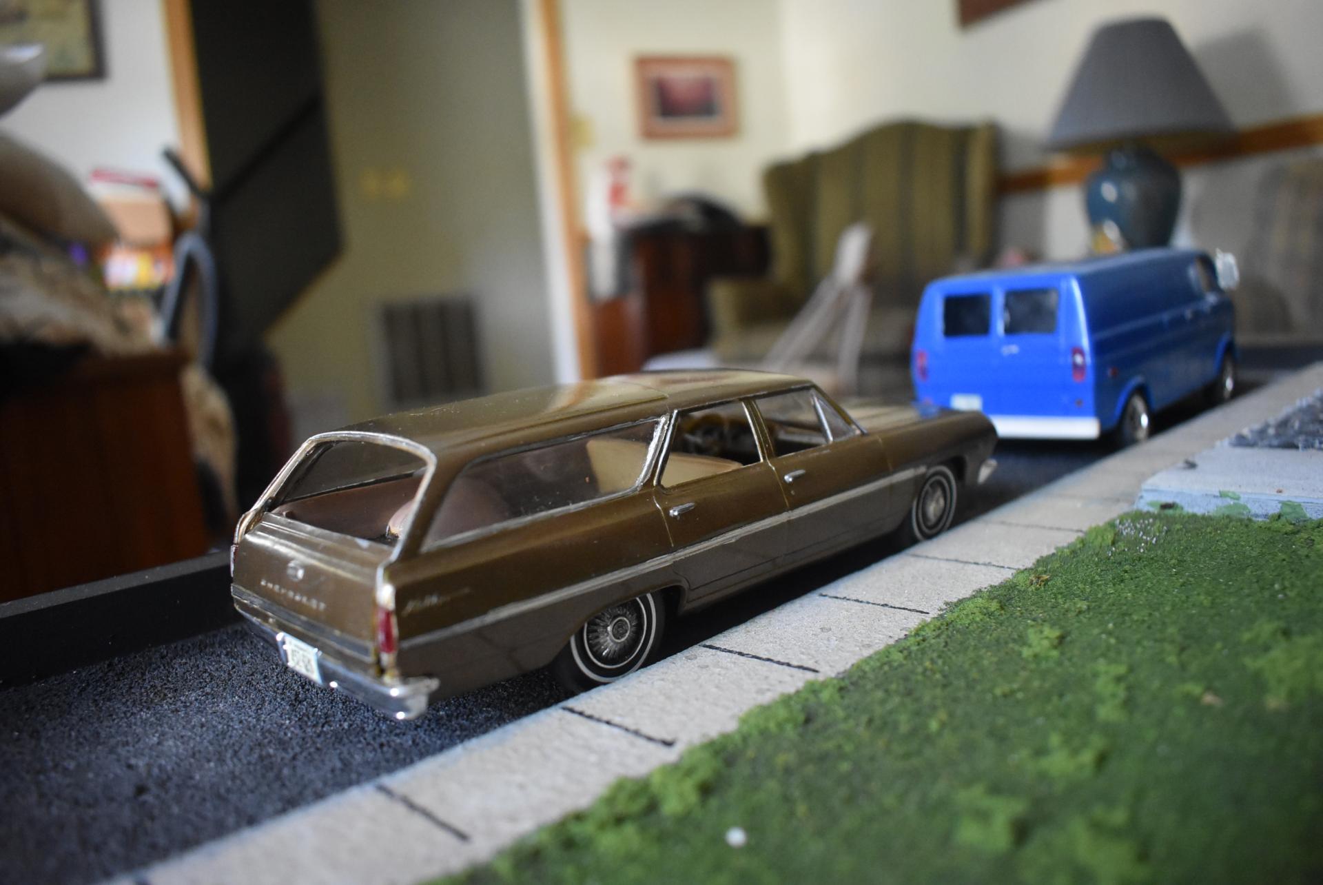 Here's a look back on A M T's 1965 Chevelle Malibu wagon , out of the box , well cept for a recent addition of AMT Parts pack tires , Virginia license plates for 1972 , Richmond City decal and an inspection sticker . The paint is Model master and it's akin to a early 70's Chrysler color