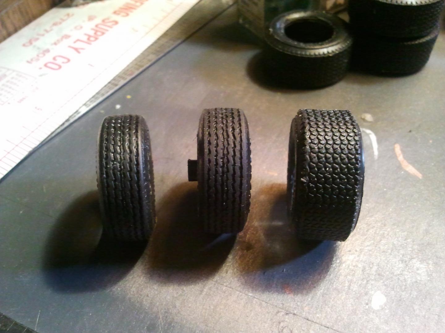 24. Unfortunately for every 3 steps I take forward, I seem to always take at least one step backwards. I masked off and painted the under hood area black the other day, and somehow I managed to get some black paint on my shiny paint job. I guess I should have painted the back first and masked that off and painted the body after, as I usually do. Oh well, live and learn. I managed to clean it up and get everything back to where I was before. I decided to mock everything up last night, and discovered that while the tires from the Joker Goon car fill out the wheel wells, they do it a little bit too much, in the rear they hit the fenders. So I dug through the parts box, and found a set that I think will work better. The tires on the left side of the photo are the ones that I originally had on the model. The ons on the right are the ones from the Joker Goon car. The one in the middle is the one I'm going with. They seem to be very similar in size to the originals, but the wheel backs I am using this time will push them out a little further (I hope!).