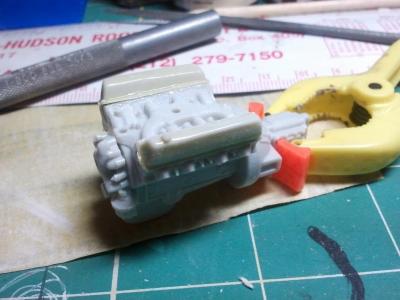 Engine and transmission have been painted, along with carburator, oil filter, fuel pump, starter, fan, fan belt, and alternator. Oil filter and carburator have been glued to engine, and a length of wire has been added as a fuel line between the fuel pump and carburator. Up next is distributor and plug wires. Also, interior pieces have been painted their base color. -