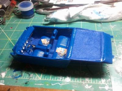Progress so far: re-painted and re-assembled the engine. Added plug wires (yeah, they're a little big) and a parts-box carb. Moving on to the interior, which was pretty clean to start with, I've started by painting some brown to represent wood on the dash and console. Still need to clean up the edges a little. Plan on flocking the carpeting and adding additional details. More to follow...