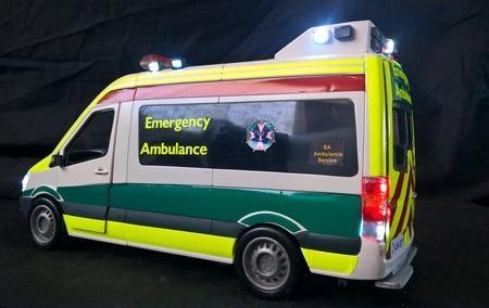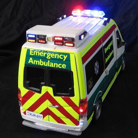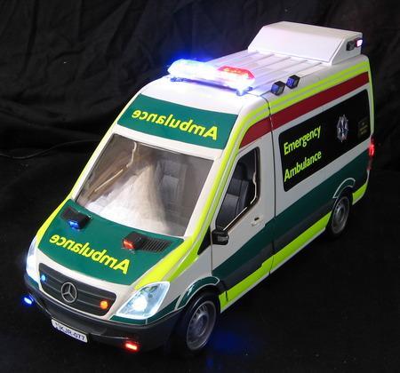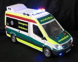 This project started 18 months ago with the design, construction and the making of electronic circuit boards for the flashing lights and siren. The body is, in the main, a model Sprinter ambulance with an entirely different roof styling. (see first pic) The original roof was discarded and the rear cabin body modified and partly scratch built. The whole original model was completely stripped and repainted. The final red, green and yellow colour panels are self-adhesive reflective sheets of thin PVC material. The colours are those of the SA Ambulance Service.The rear, front and side flashing lights are made from discarded calculator buttons fitted with Fresnel lenses, as are the 7 spot lights. A total of 56 high intensity LEDs and 10 standers intensity LEDs are used for the lighting. Opening of doors switches ON interior lights. The rear view mirrors are fitted with amber LEDs and Fresnel lenses. For a more detailed view of construction and a video clip, use the following link: http://s254.photobucket.com/user/Robbo2008_70/library/Mercedes%20Sprinter%20Amb%202014?sort=6&page=1 Cheers from Robbo.