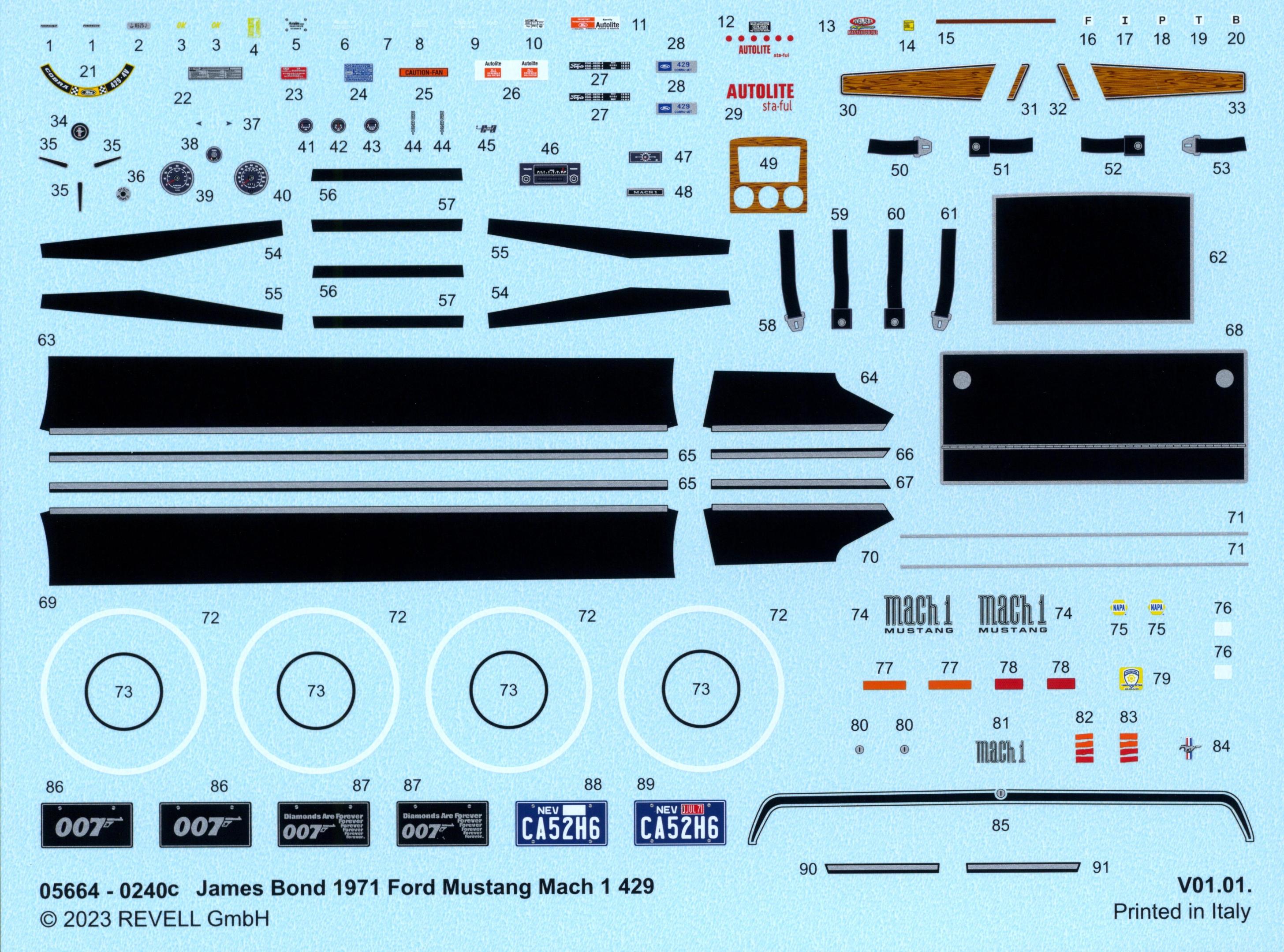I got the Mach1 kit last week, here are a few shots of the new parts: Hood (no latches) Front bumper / rear panel / rear valance: 429 Engine: Steel wheels with hubcaps and trim rings: tampo printed tires (same than on Boss 351): Some parts used on this kit variant were already in the Boss351 kit (gas cap, fan shroud) Here is the decal sheet: Note the small black rings used for the hubcaps. I don't know why the whitewall decals are included...