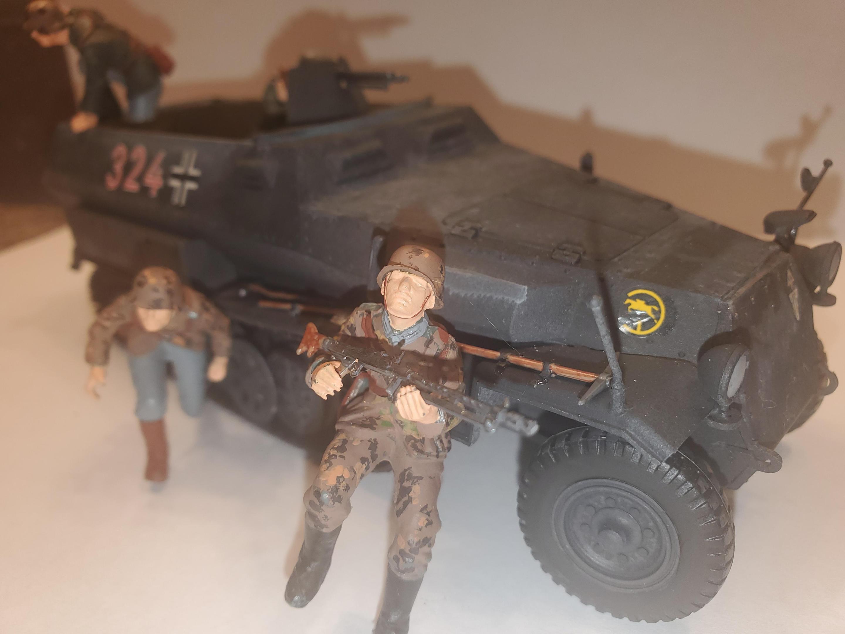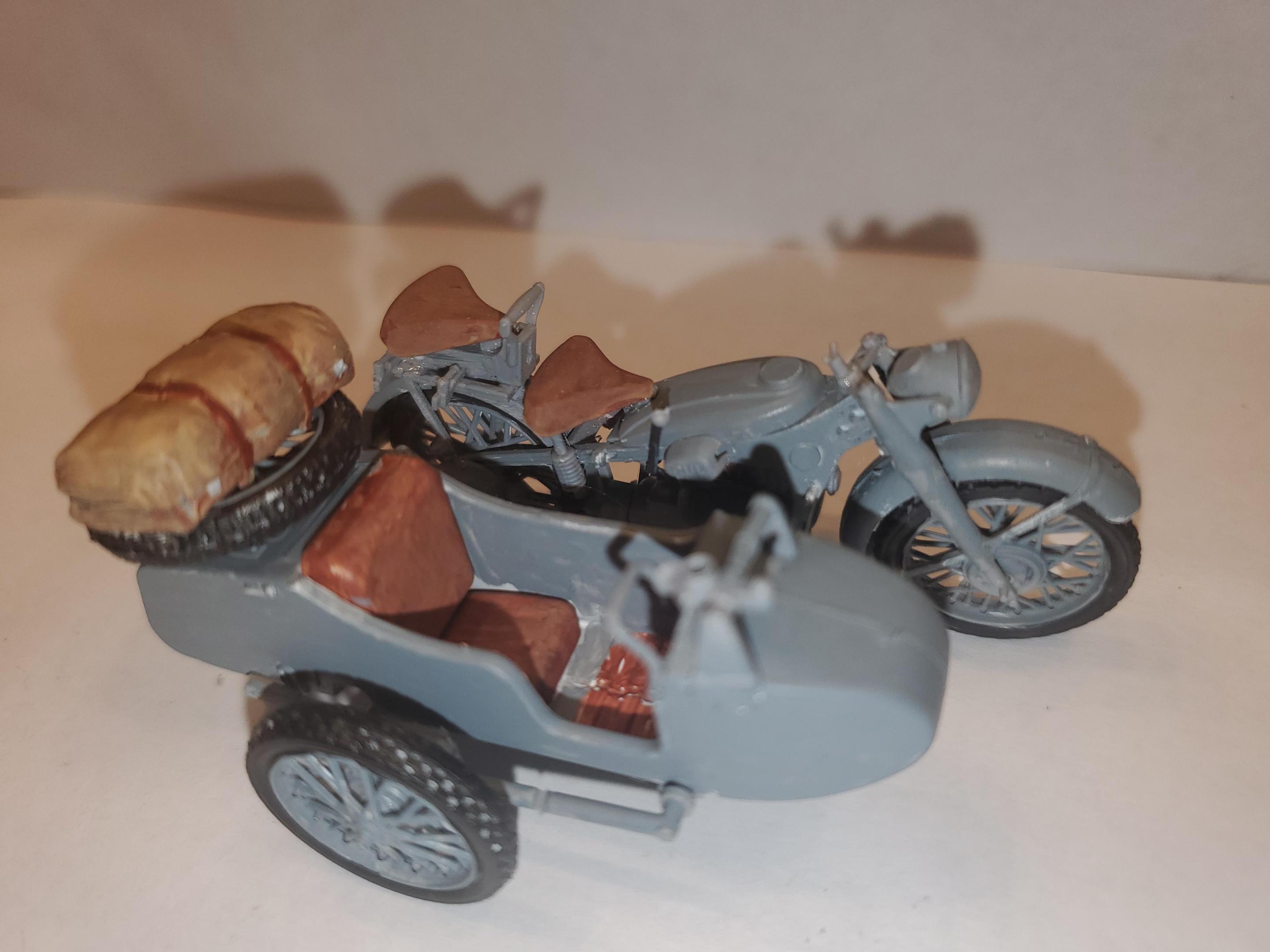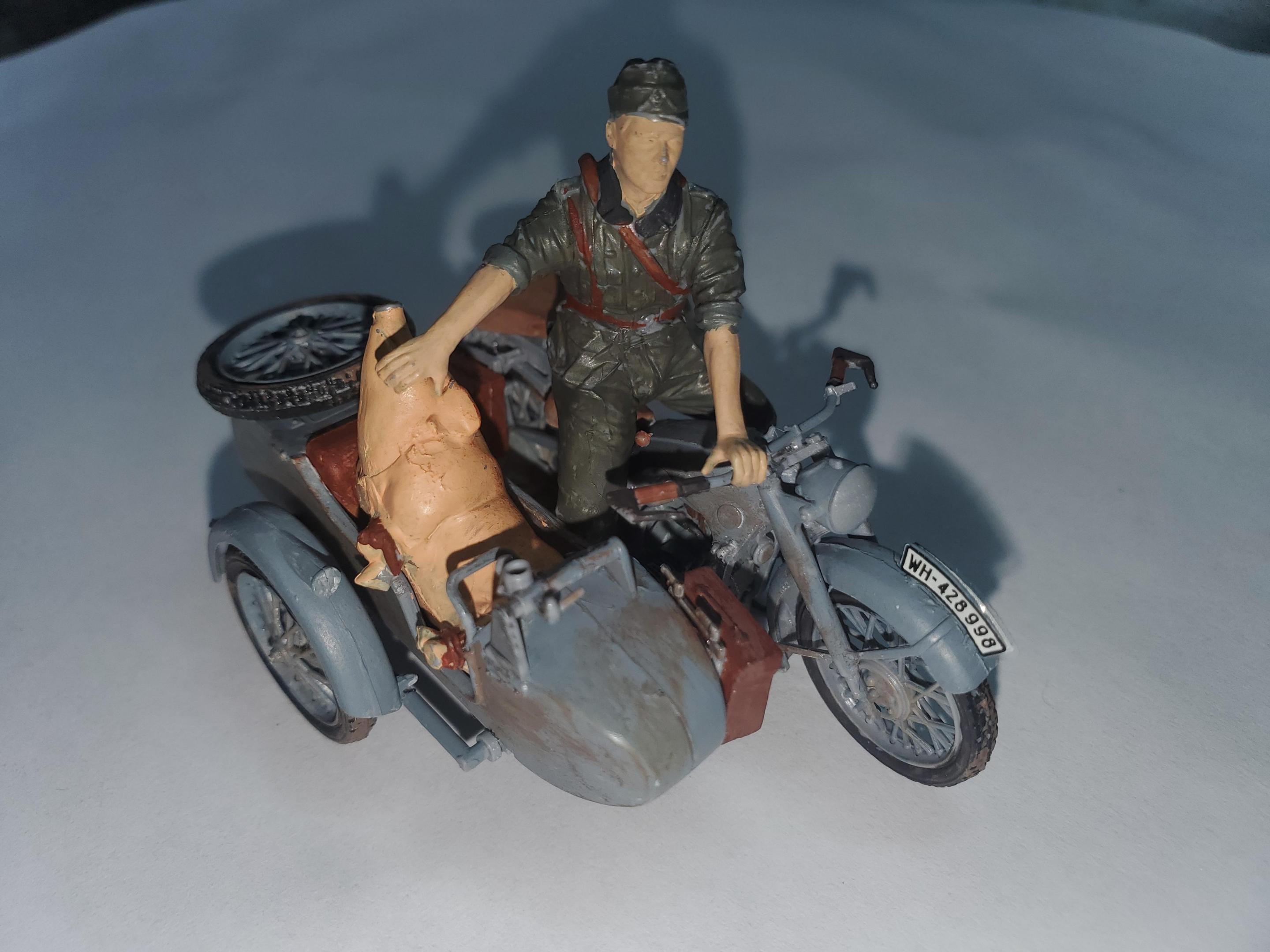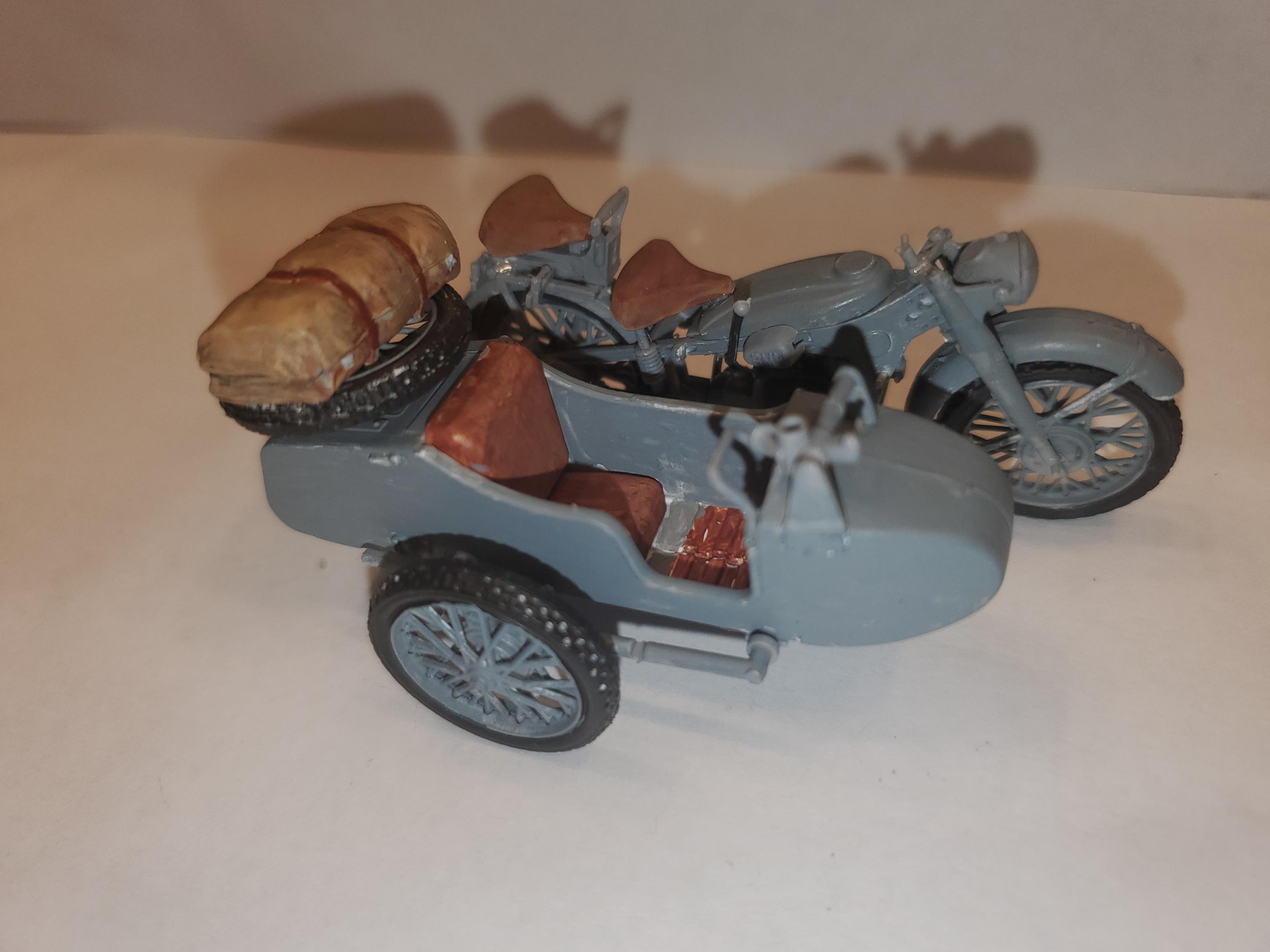 it is 1/35 scale it is a pretty cool kit, what really sold me on it was the crew you can build it with two soldiers in full battle array, or one slightly more laid back soldier, bringing home the bacon the odd thing is that one of the drivers has his hands molded to the handle bars, and one does not so im going to have to leave the handle bars loose if i want to be able to switch out between the two