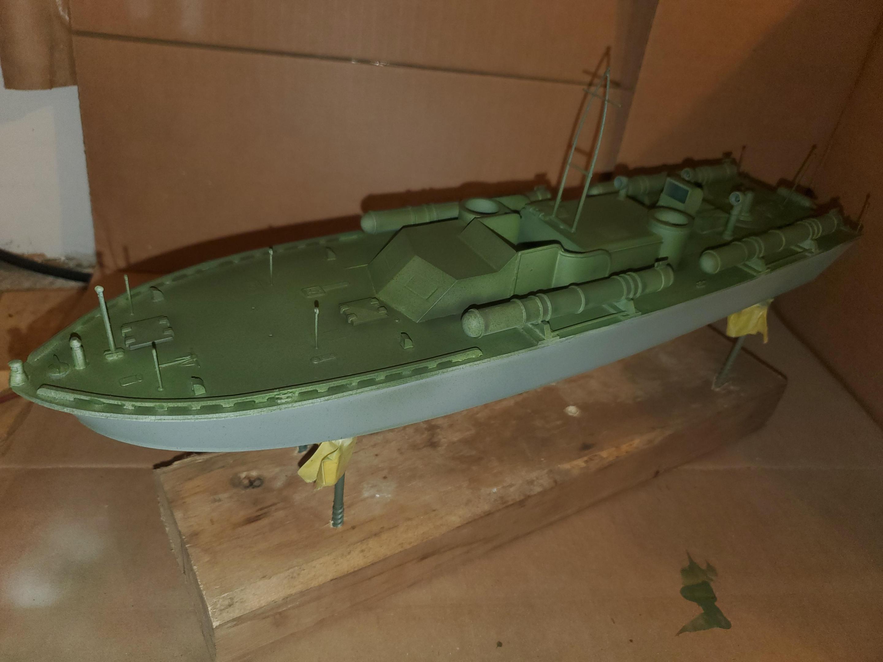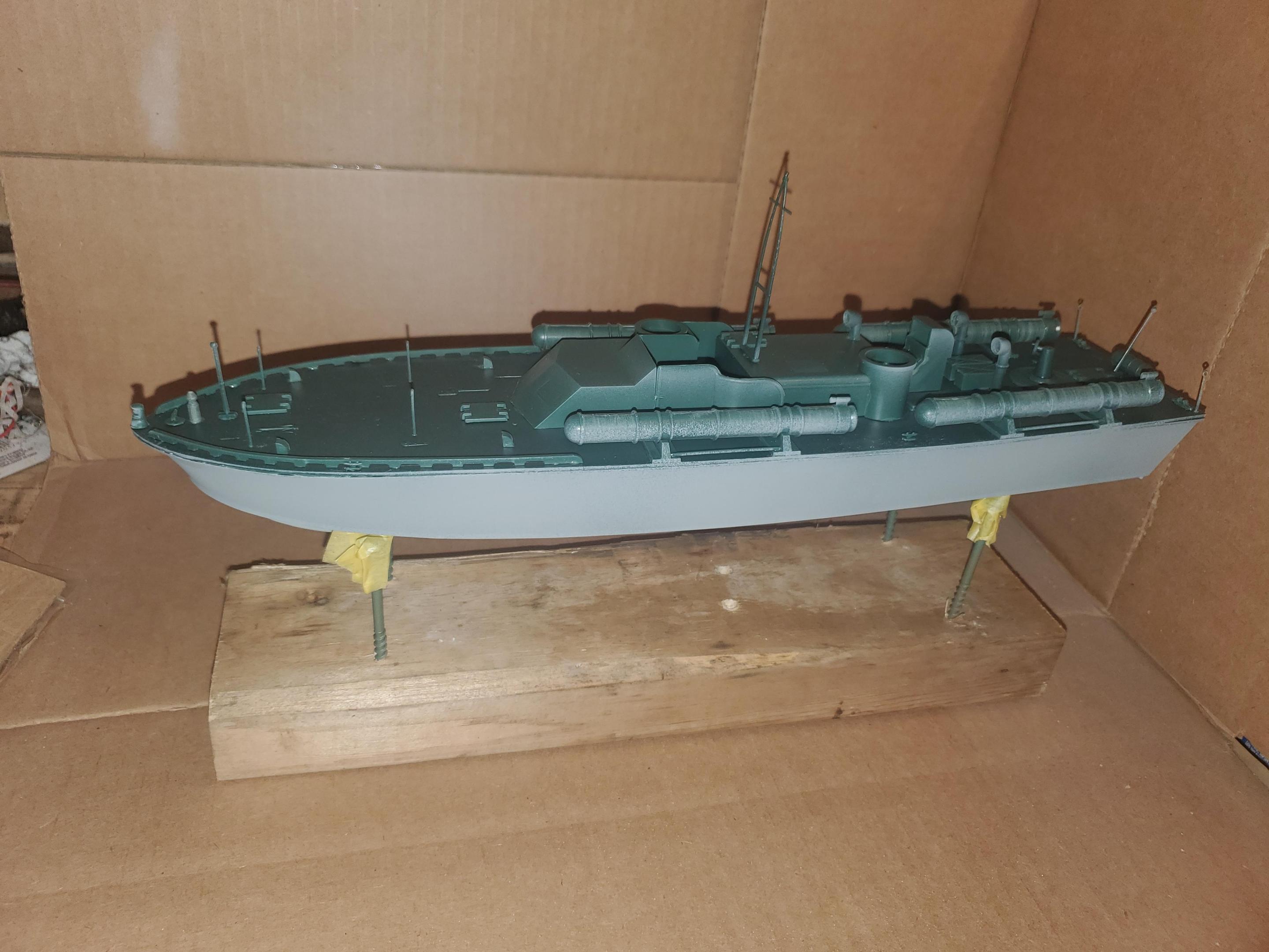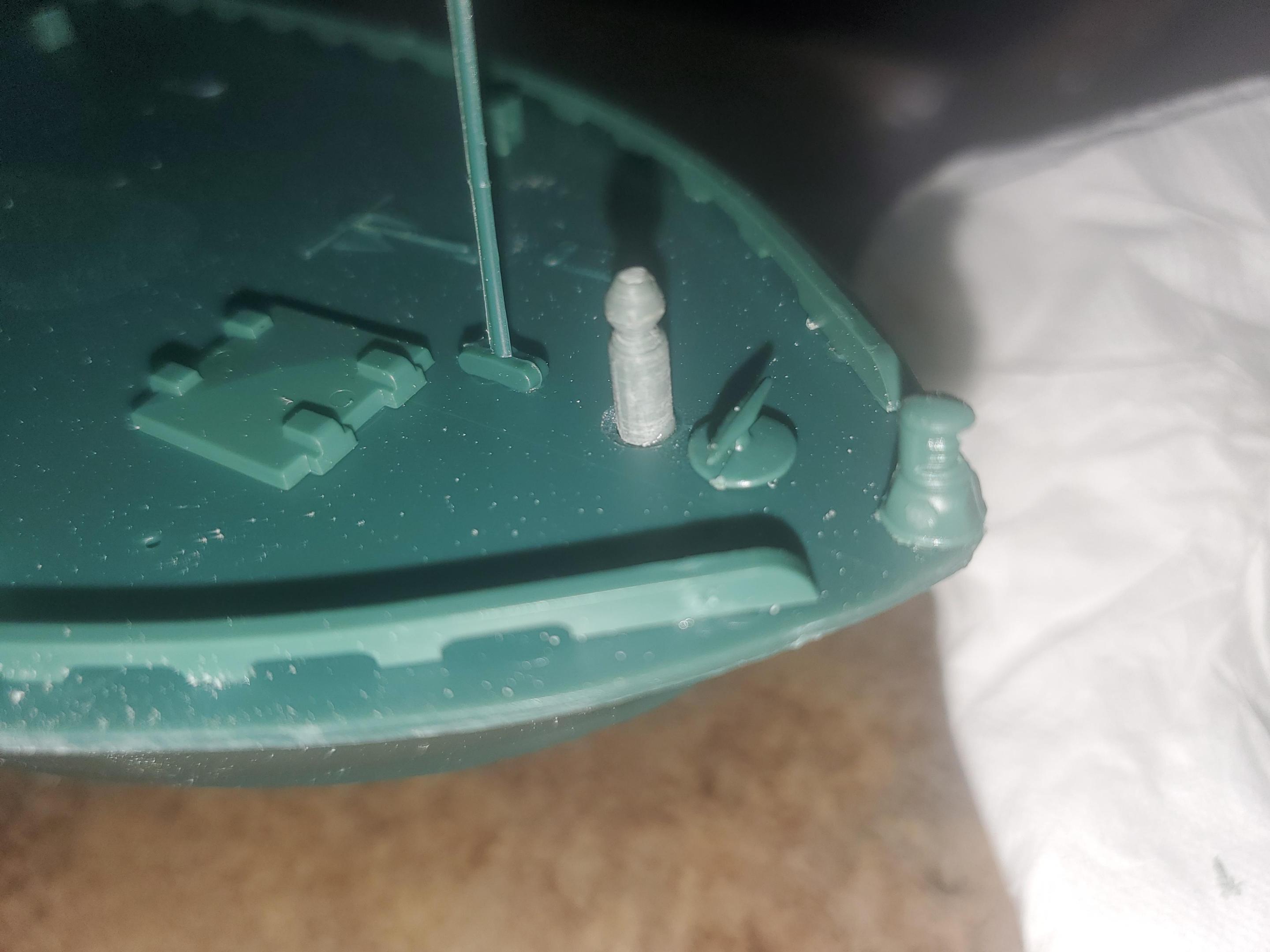 Picked up this reissue of the old Lindberg kit, mostly because I build it once ages ago and thought I'd build it again This kit is marketed as the one JFK commanded, but I have no plans of building a replica of that one There is quite a bit of flash on here, and at some point it was an RC kit, so there were two holes that needed to be addressed I'm particularly pleased with the way I fixed the front hole, that post looks like it's part of the anchor windlass and it belongs on there I also drilled out the fresh air vents which were very crude My biggest issue now is, will I paint it Grey, as delivered l, or paint it green as they were painted in the field ? (Two different 109 kits, only put up for color comps)