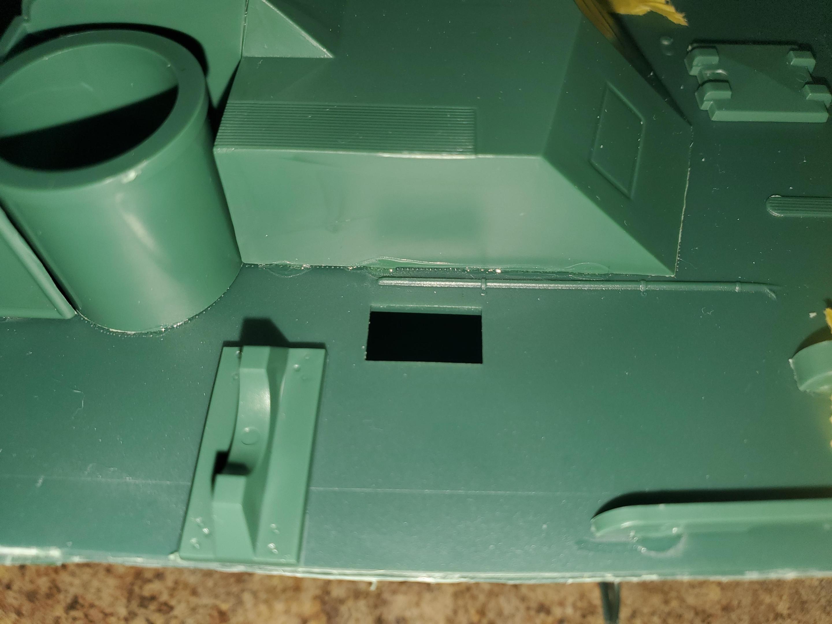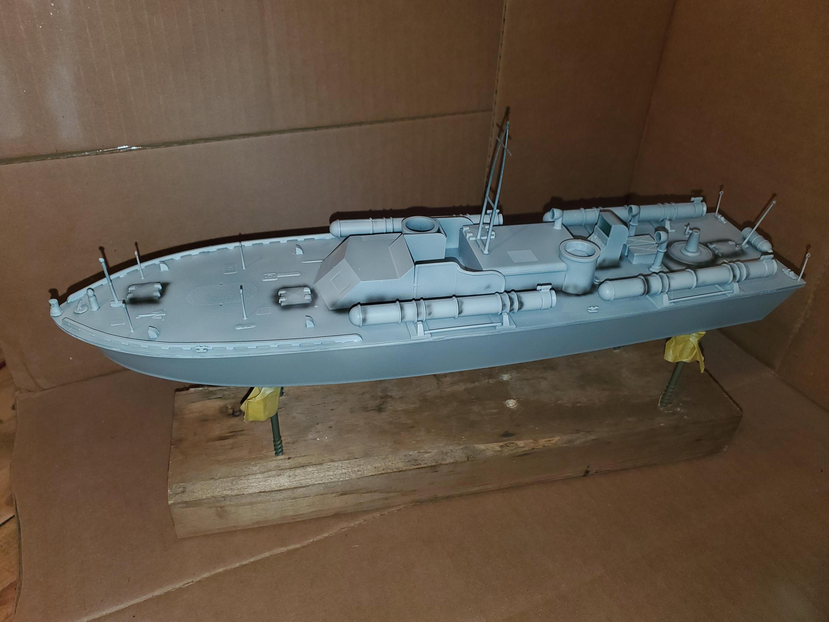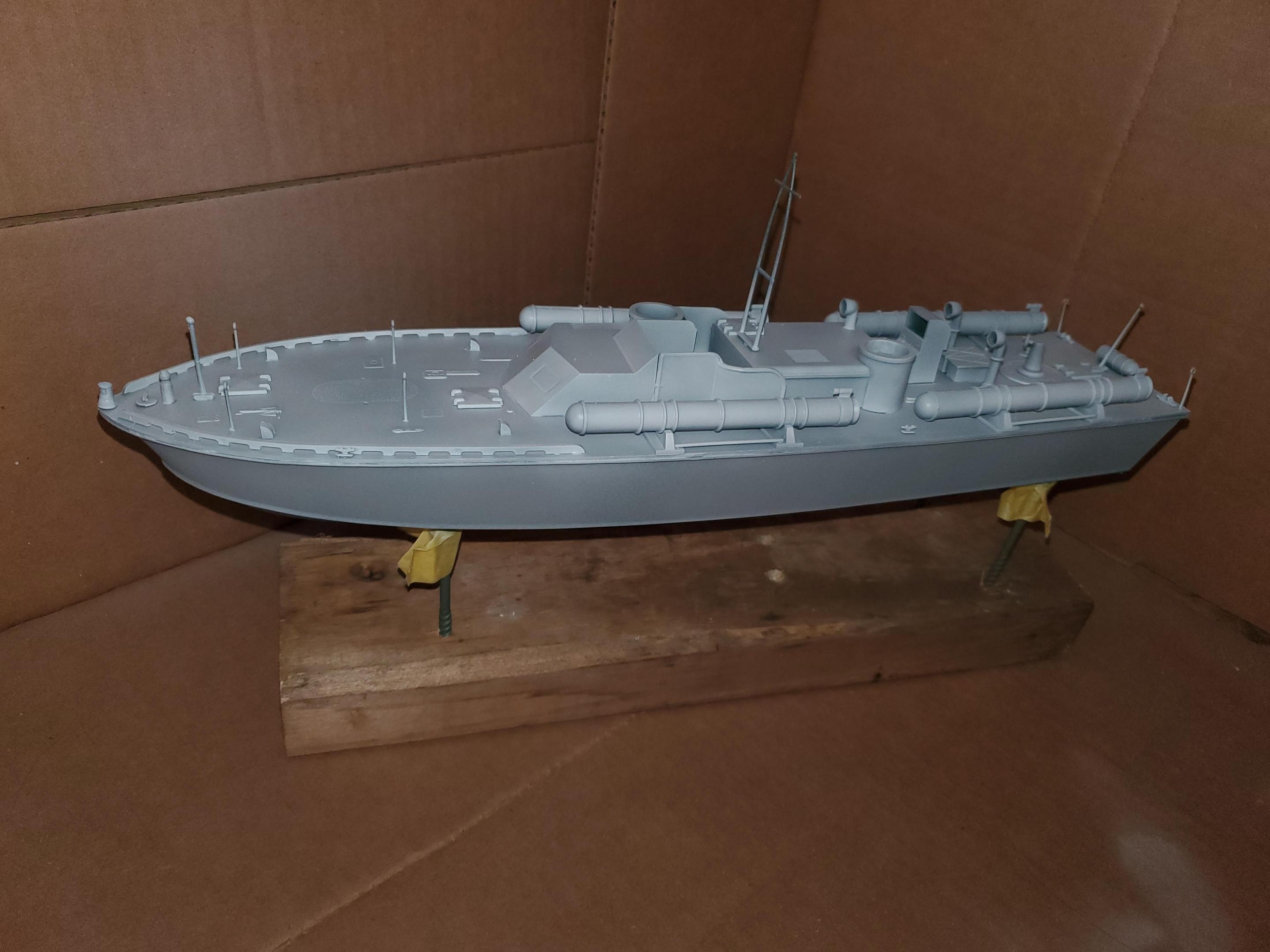 Picked up this reissue of the old Lindberg kit, mostly because I build it once ages ago and thought I'd build it again This kit is marketed as the one JFK commanded, but I have no plans of building a replica of that one There is quite a bit of flash on here, and at some point it was an RC kit, so there were two holes that needed to be addressed I'm particularly pleased with the way I fixed the front hole, that post looks like it's part of the anchor windlass and it belongs on there I also drilled out the fresh air vents which were very crude My biggest issue now is, will I paint it Grey, as delivered l, or paint it green as they were painted in the field ? (Two different 109 kits, only put up for color comps)