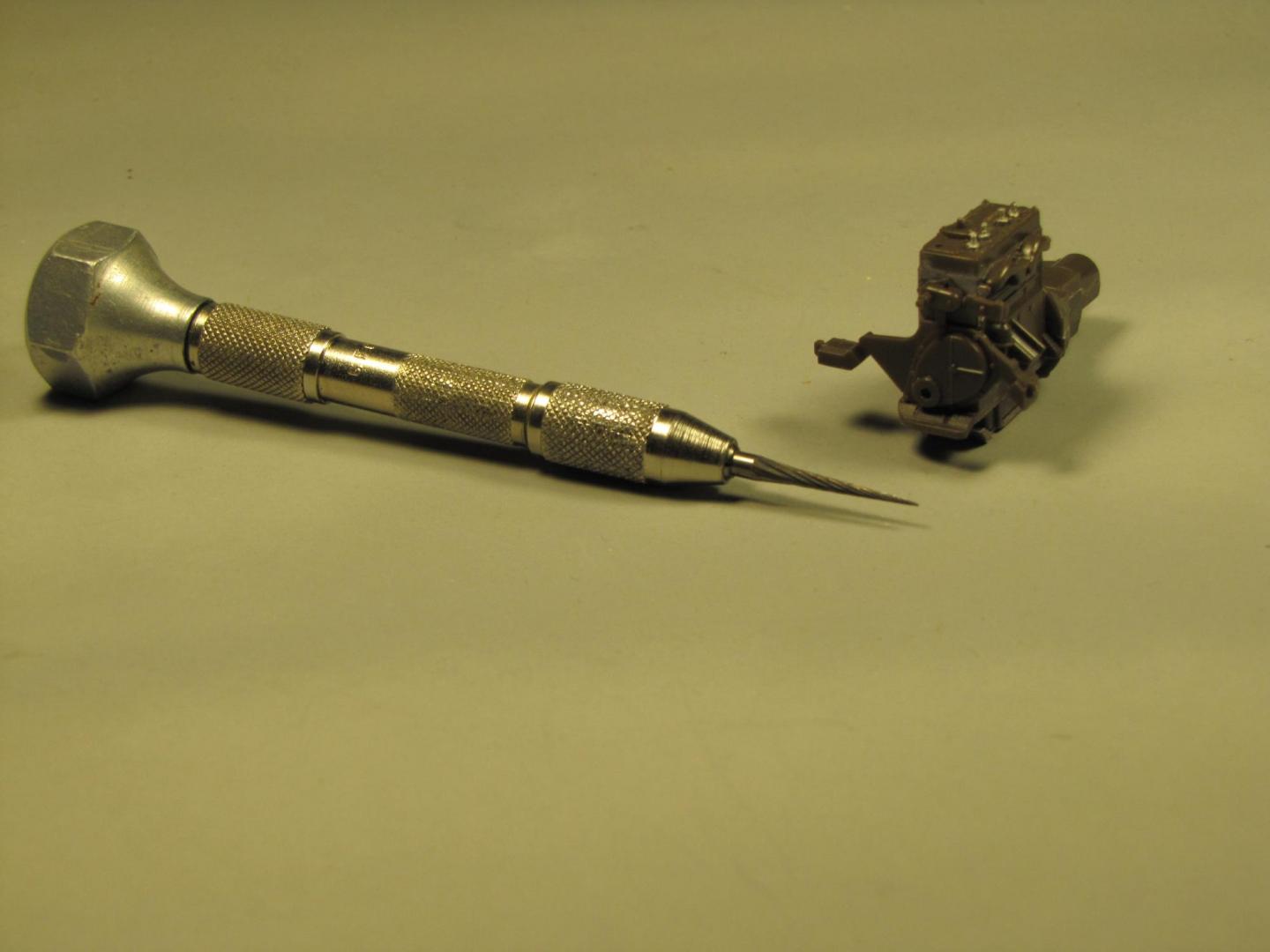 Well, so much for the vaunted accuracy of a Hasegawa kit! While this model kit is pretty amazing in most all of its details, they did miss molding sparkplugs into the cylinder head! When researching Jeep engines for both paint colors and detailing, I had come across a picture of a freshly restored rebuild, that had yet to have plugs installed--rather the rebuilder had inserted orange plastic seals into the sparkplug holes to keep dirt and debris out--Hasegawa must have seen the same picture, as THAT's what they tooled into the cylinder head. No problem, as I have a pretty fair stock of OOP R&D Unique white metal spark plugs. Only trouble is, a #61 drill bit is too small for the size of the shank on the bottom of these plugs--thankfullly I have this long, 1/8" shank tapered HS steel cutter, which when fitted into a pin-vise allowed me to gently enlarge the drilled holes:
