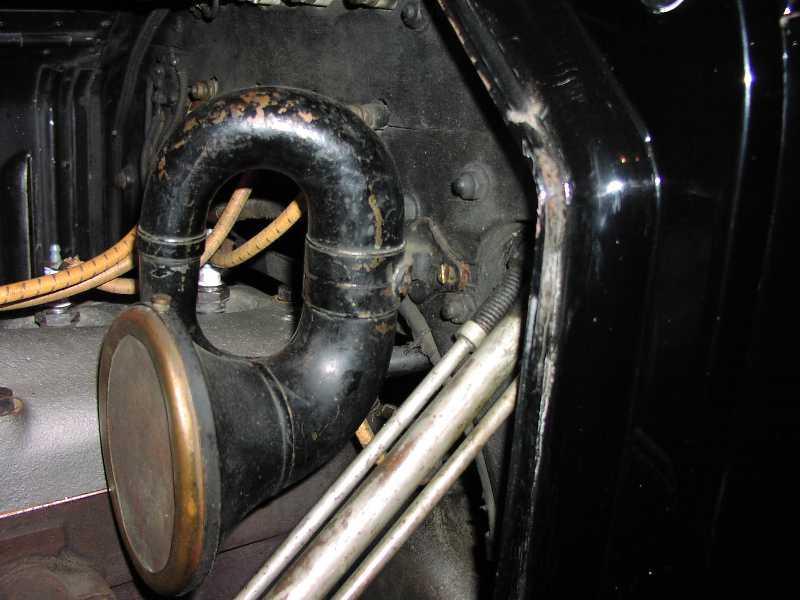 1915 Model T horns were under the hood, mounted to the dashboard (what we call the firewall is, in fact, referred to internally in the industry as the dashboard--that thingie with all the gauges inside the body is the instrument panel!). This was pretty much at the end of the "Bulb Horn" air actuated horn, where the horn squawked when the driver squeezed a large rubber bulb located next to him inside the car. 1915 Model T horn, mounted where it was, on the dashboard: -