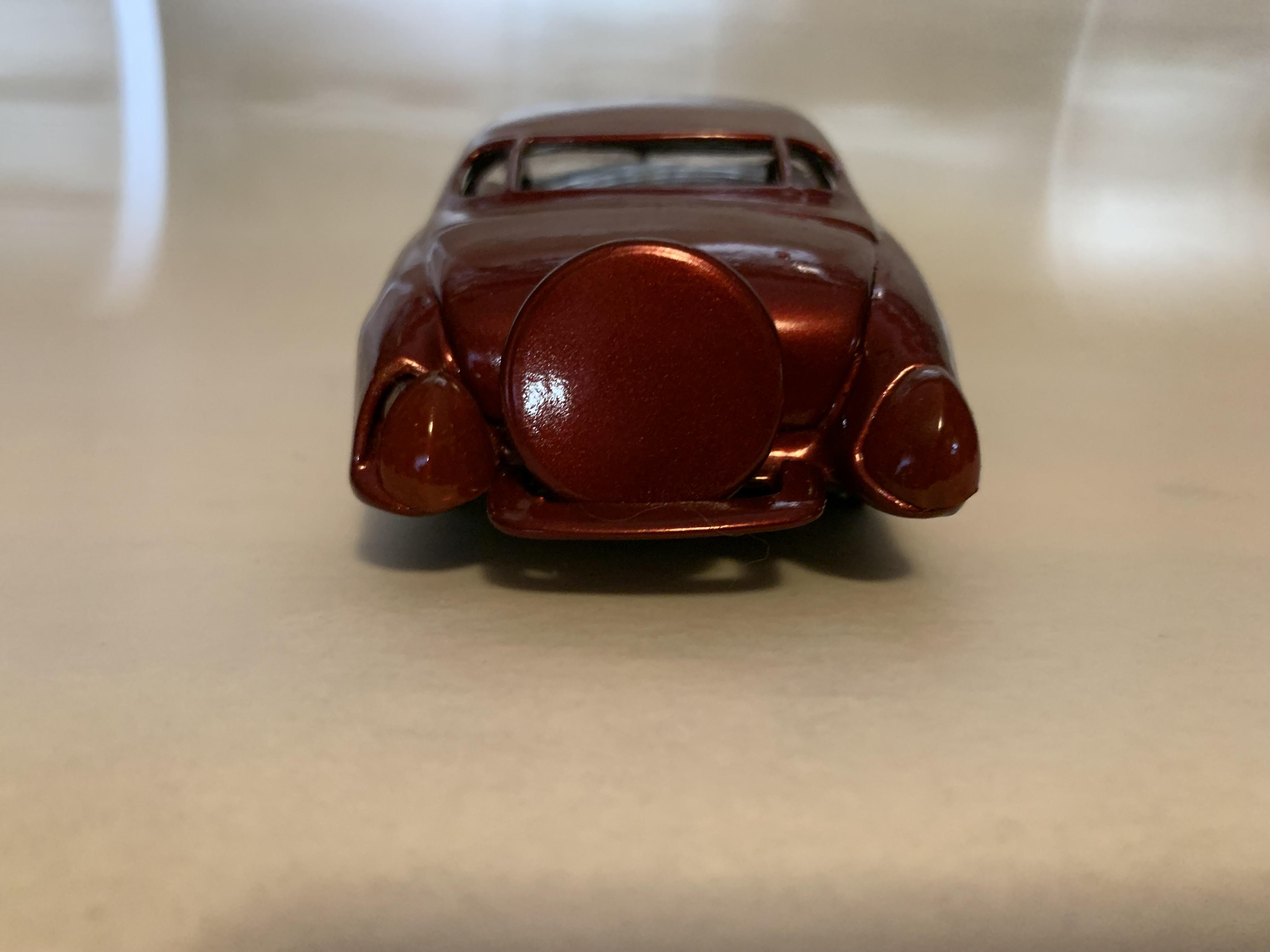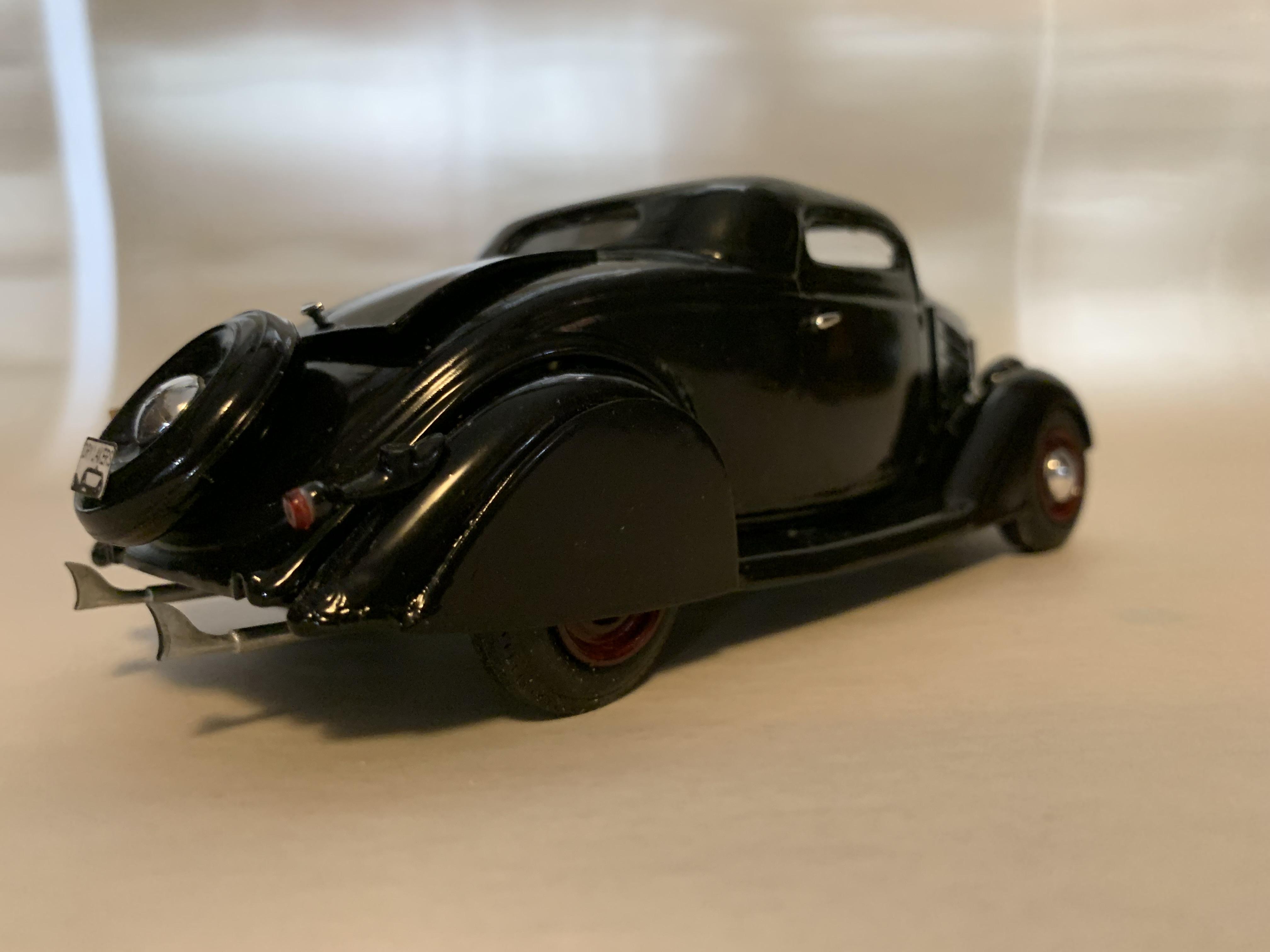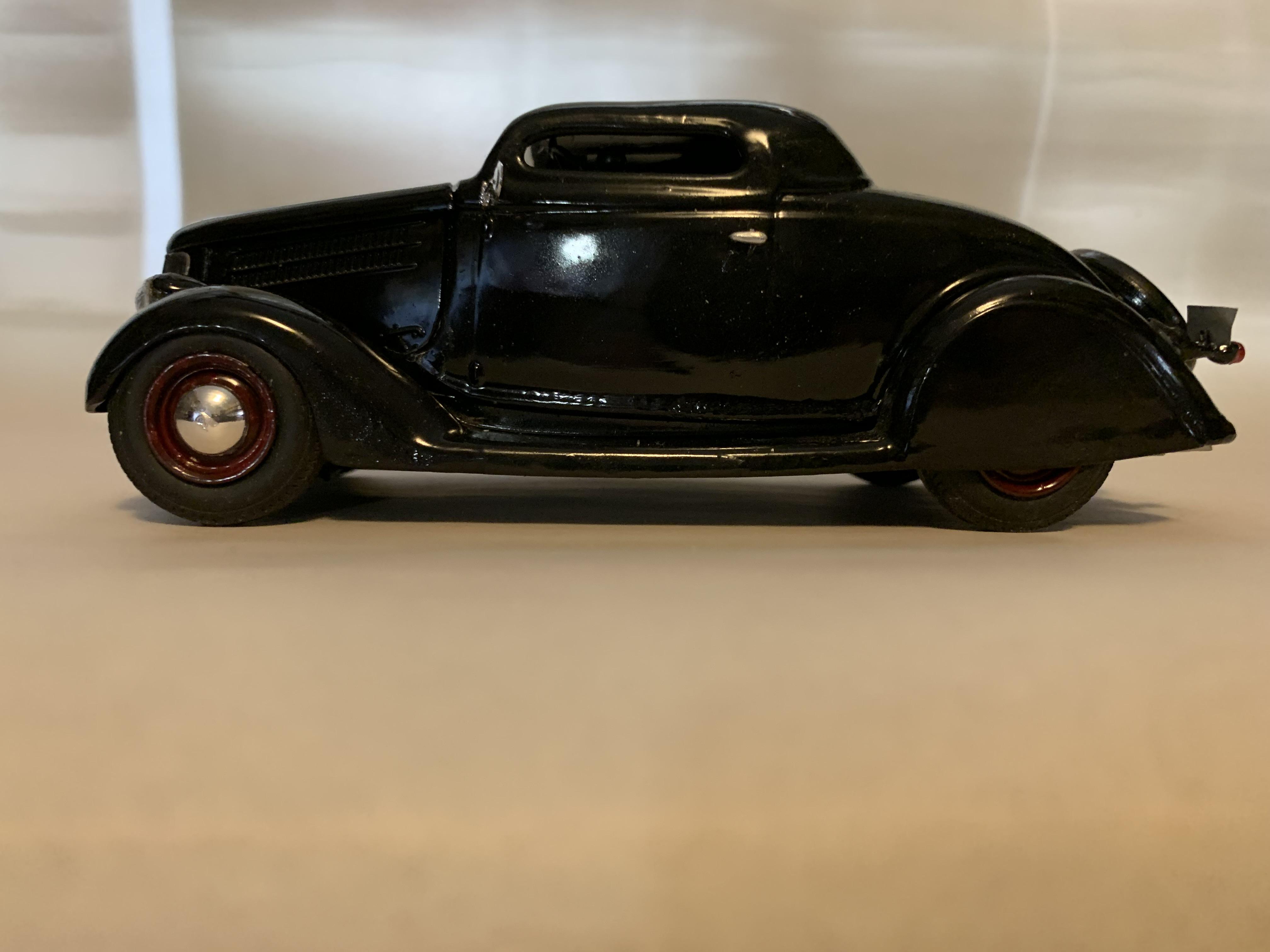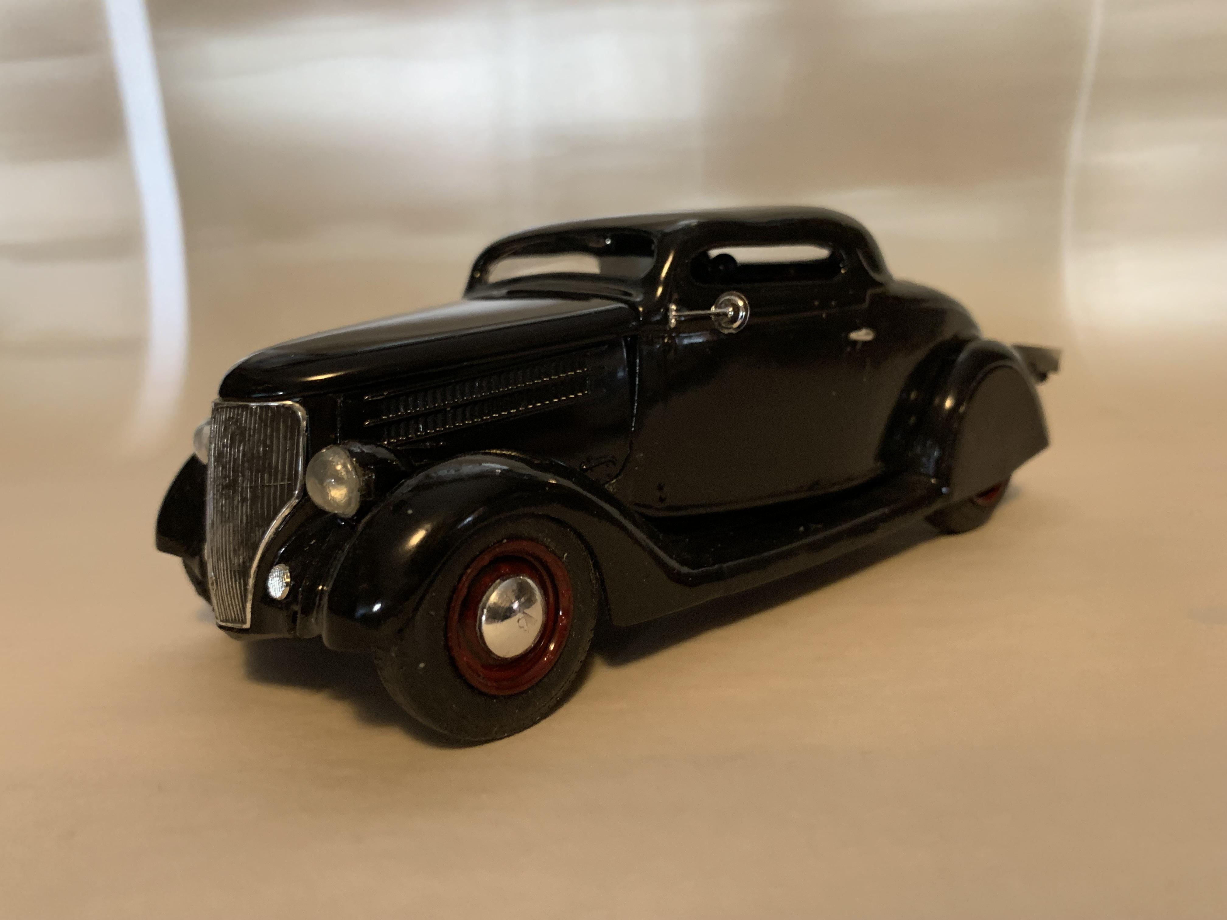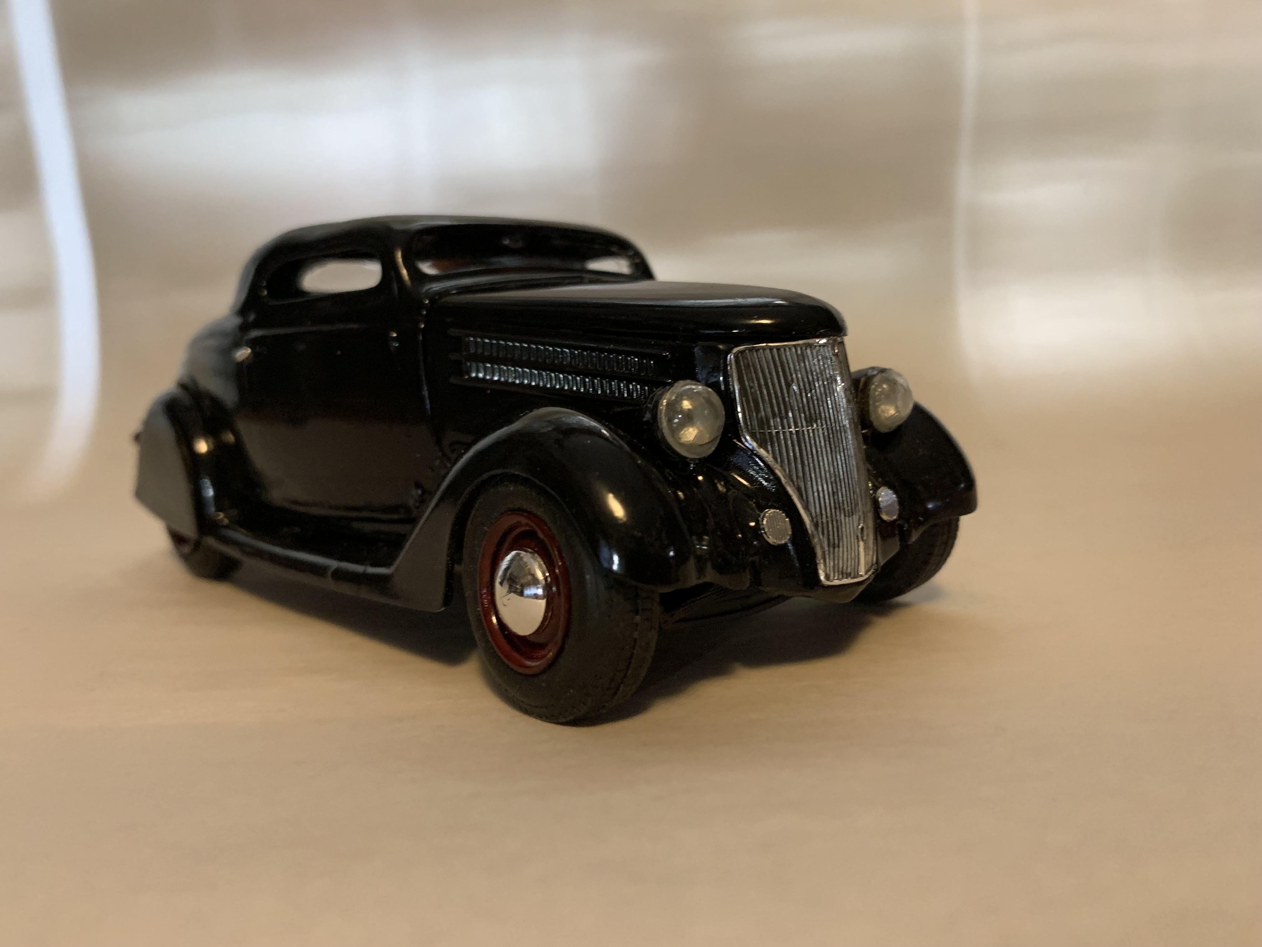 1936 Ford 3 window coupe chopped to 6-1/4" scale height. Will be a post war customized hot rod, updated with disc brakes. -