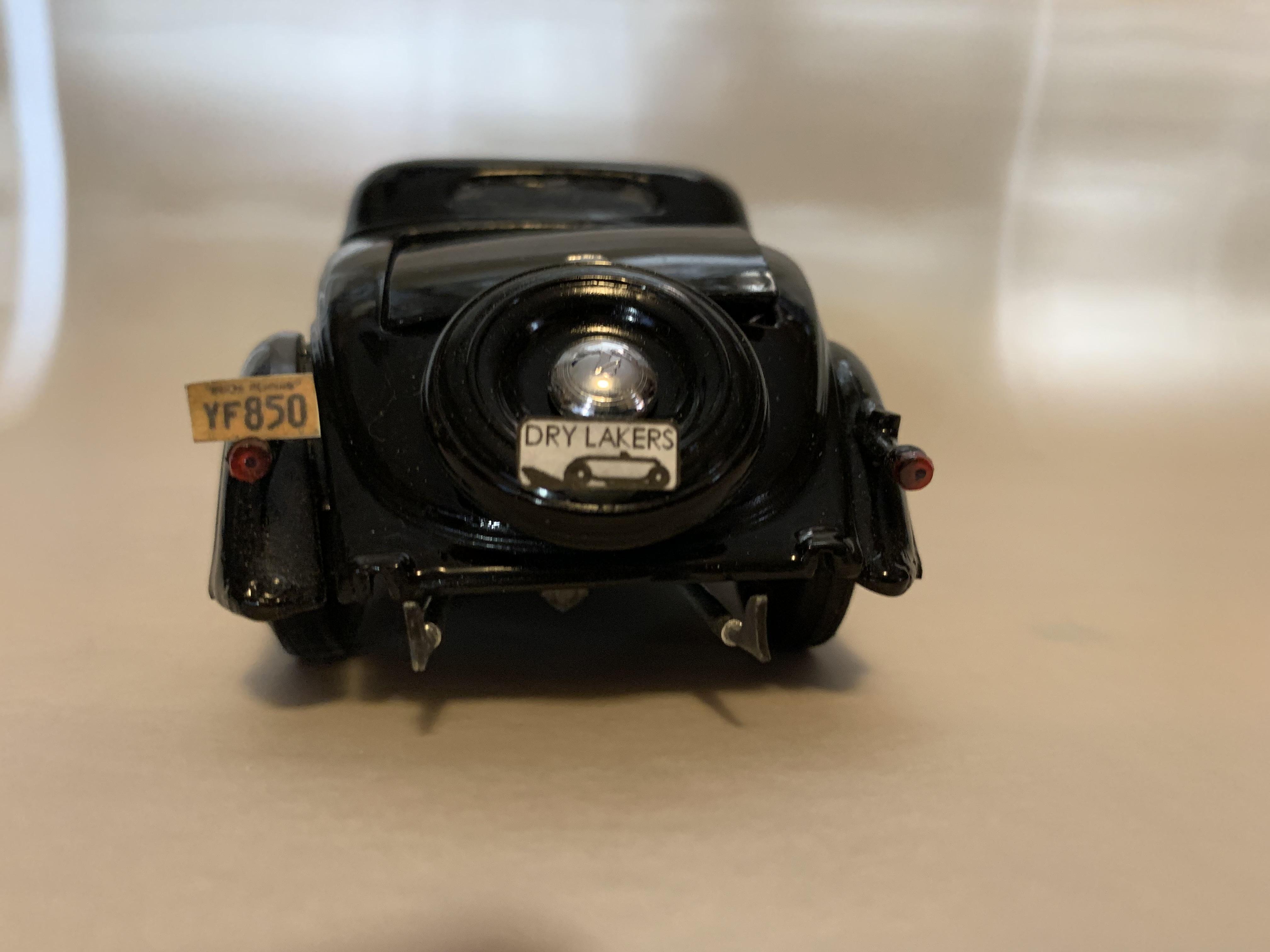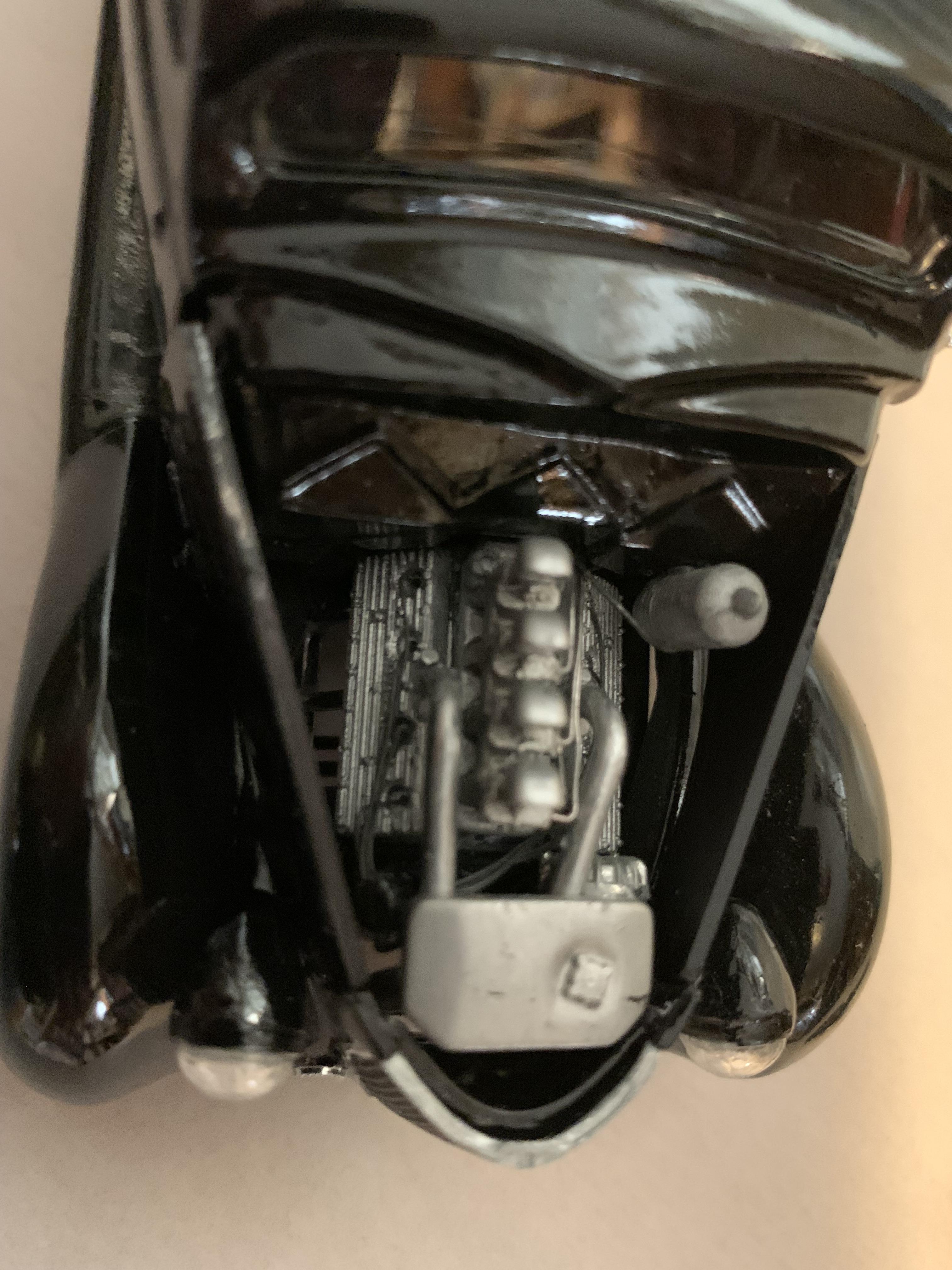I got this as a built model at the HCMA flea market- painted pink and white! It had the original AMT chopped top which I chopped further to a scale 6-1/4 inches. Added a 3D printed flathead with Navarro heads and 4 carbs, also replaced the rear end with a quick change and added disk brakes. Dual exhausts have fishtails. Rumble seat removed and converted to a trunk. Scratch built fender skirts, and working on a gloss black paint job. Pix include comparisons of the stock, kit chopped, and final top chop. Interior includes a tach in the center of the dash and a necker knob on the steering wheel. painted some goodies for the trunk- gas, oil, and water cans, a tool box, and a jack. Also a preliminary mock up.
