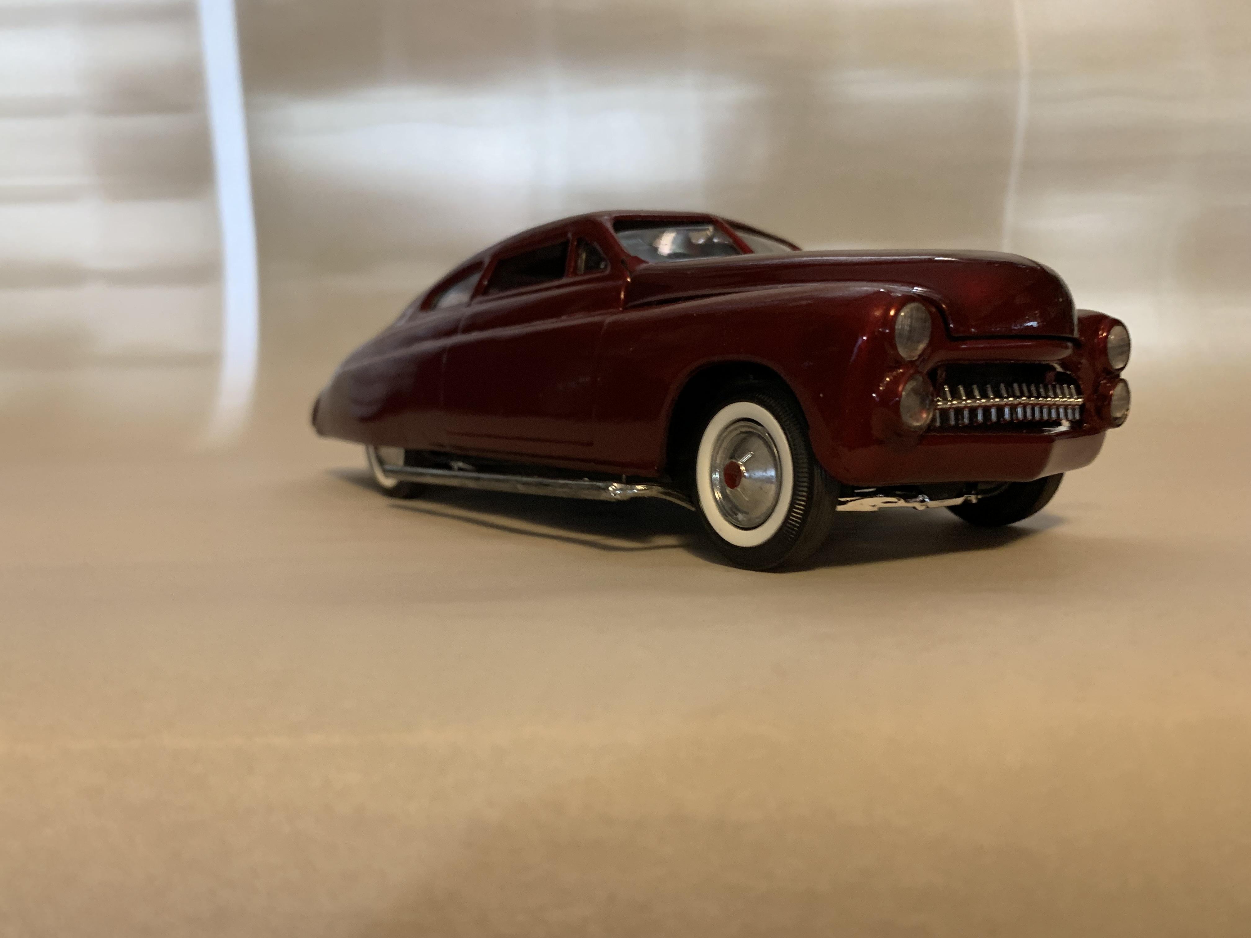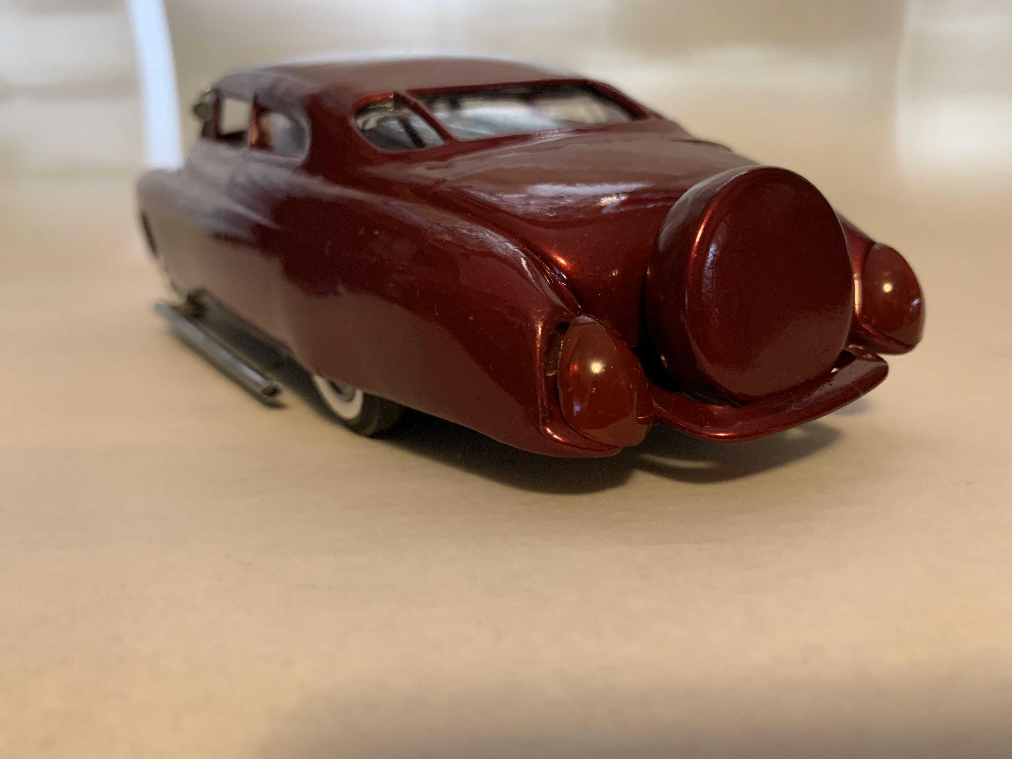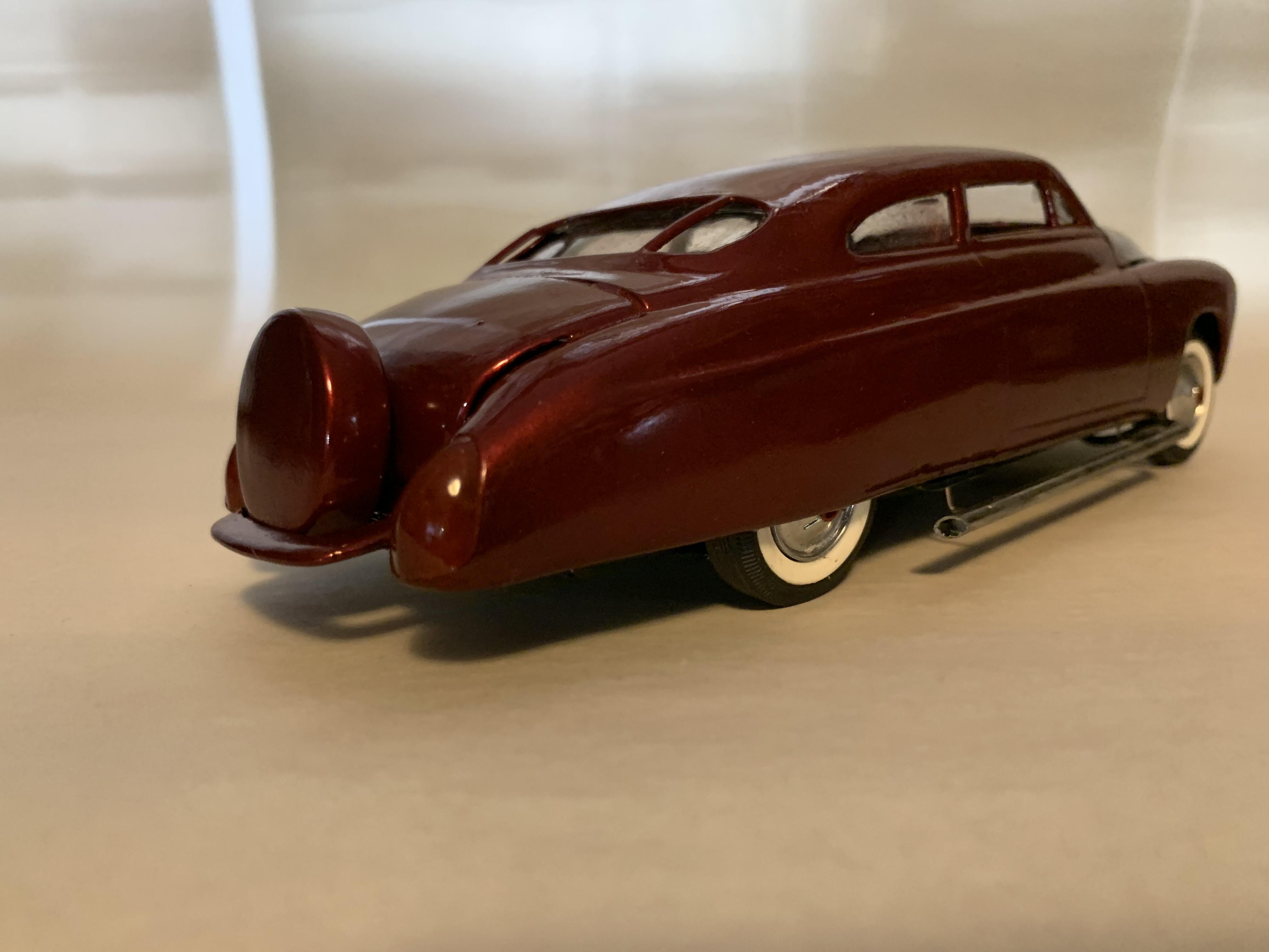 Number 7 in the stash bash- AMT 1949 Mercury which I got in trade several years ago. Most of the body mods were done by the original builder but I am going to turn it into my own creation. The tail lights are one of my additions- they are headlight bezels from a styline nose piece from the original AMT 1957 Thunderbird with the headlight lenses painted red. I also plan on adding a continental kit, turning it into a Mercury Continental. With the chopped roof, the rear end looked a bit stubby, so this will lengthen it out. Engine will be the Mercury flathead with Offenhause heads and two carbs with a teardrop air cleaner from Replicas and Miniatures. Grille will be the Corvette grille from the AMT 57 Chevy.