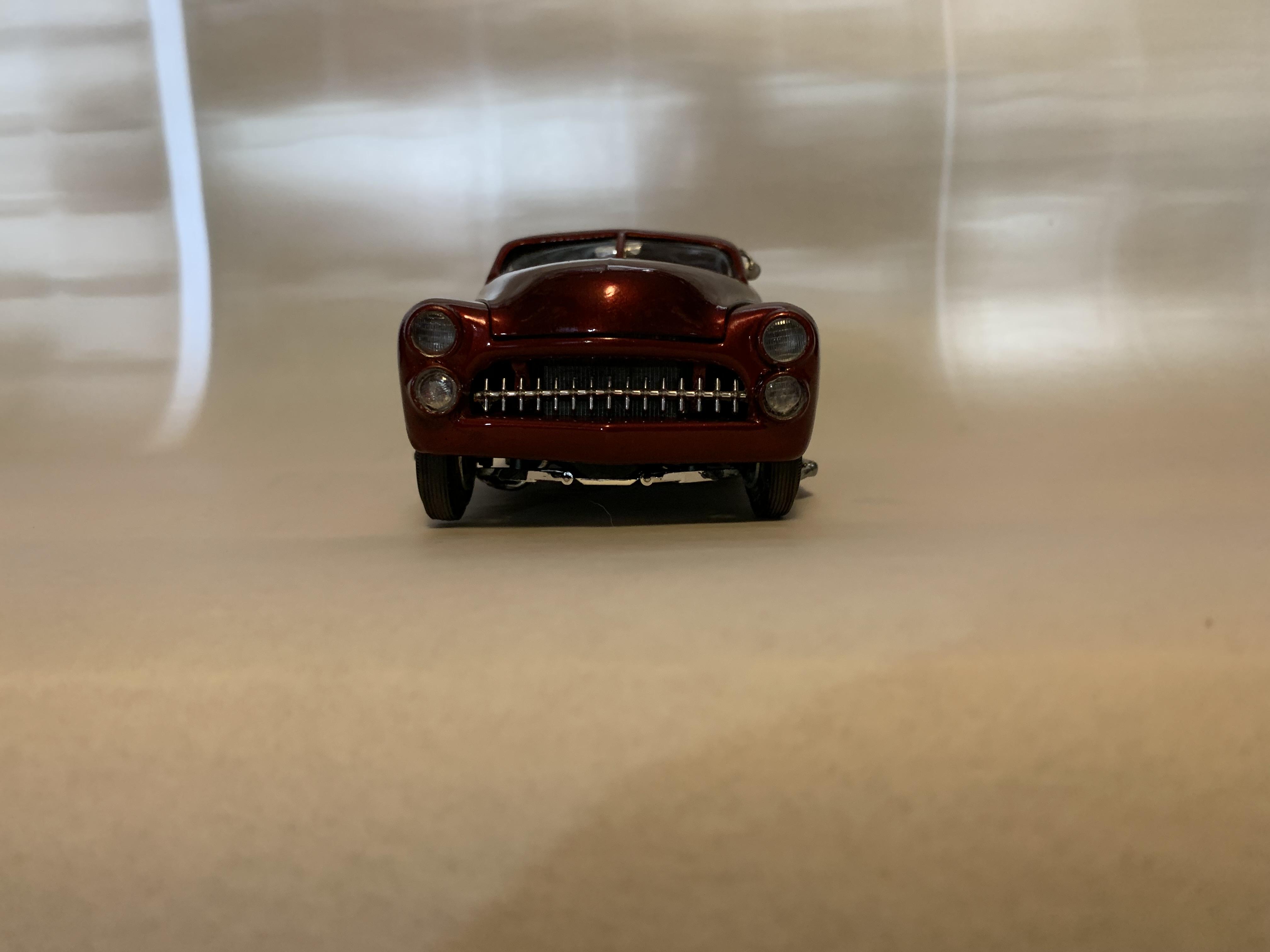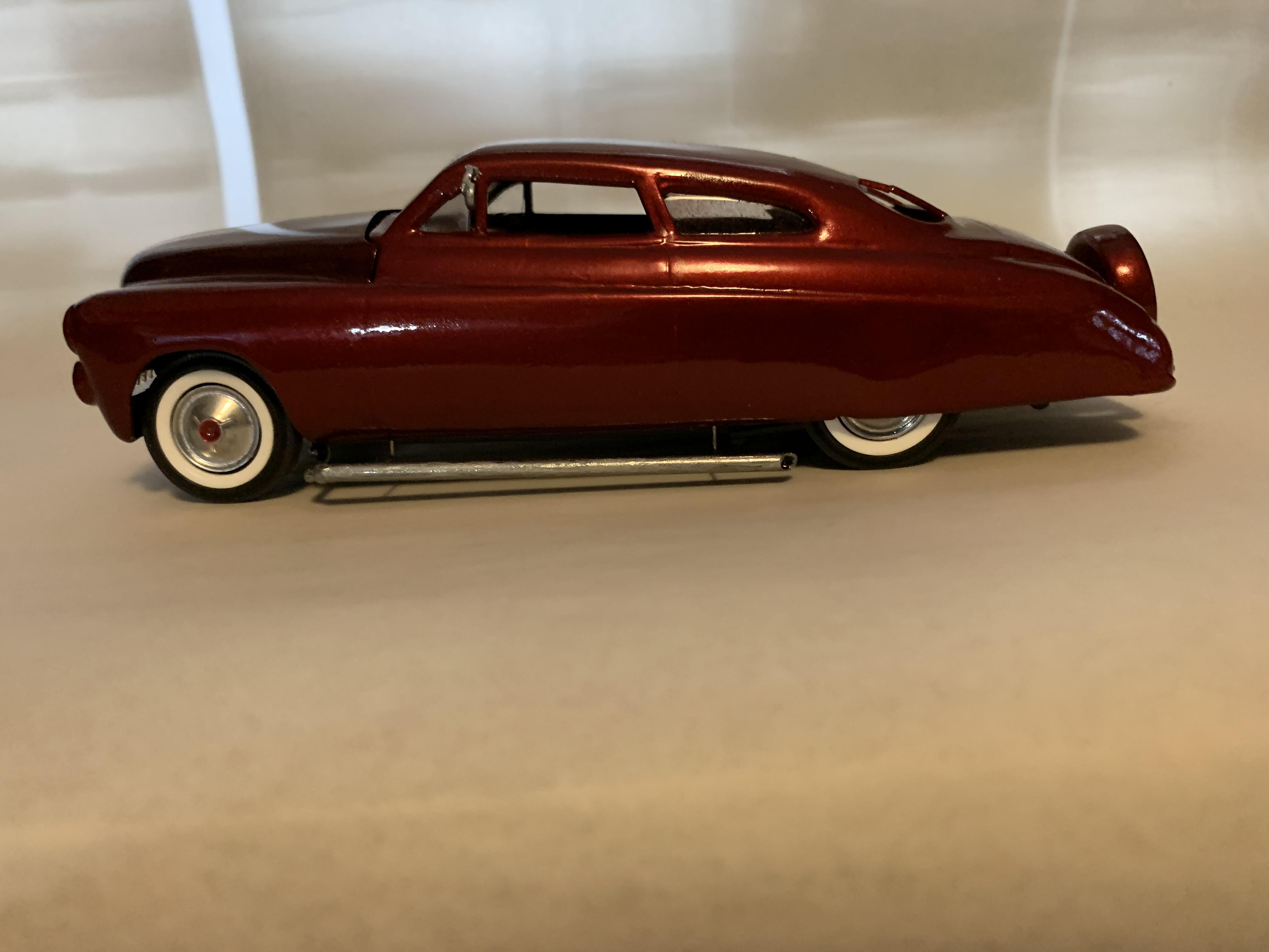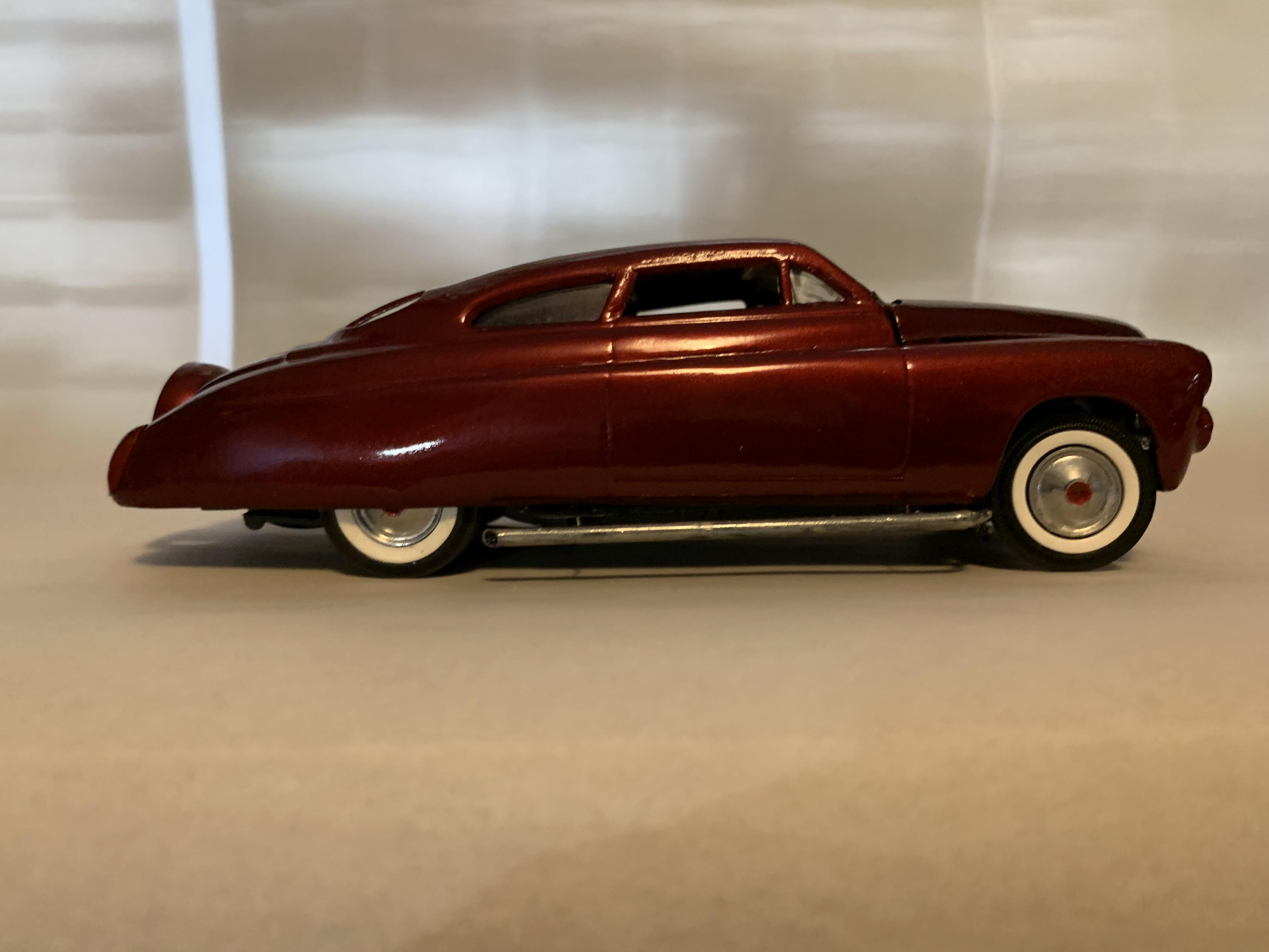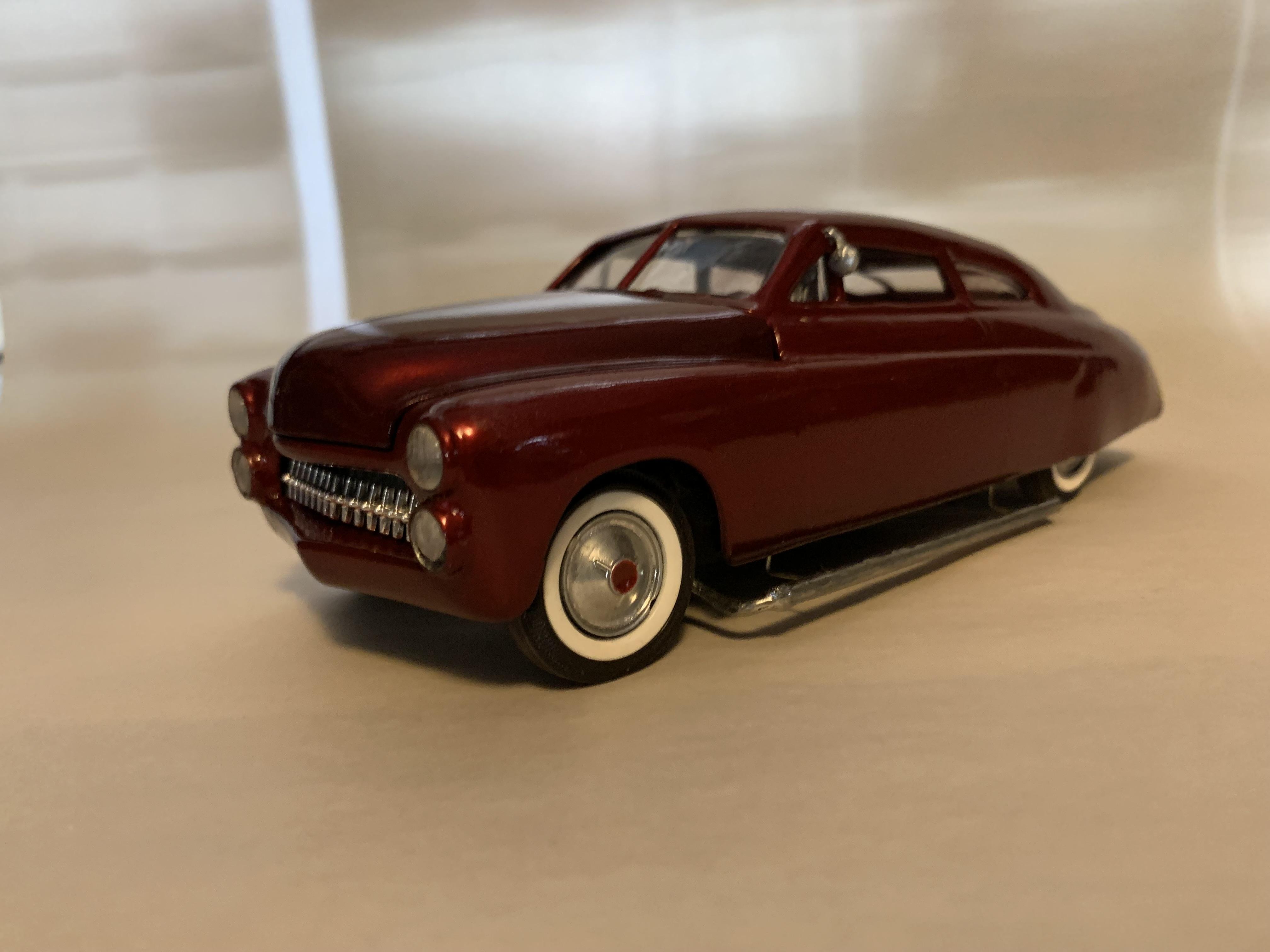 Number 7 in the stash bash- AMT 1949 Mercury which I got in trade several years ago. Most of the body mods were done by the original builder but I am going to turn it into my own creation. The tail lights are one of my additions- they are headlight bezels from a styline nose piece from the original AMT 1957 Thunderbird with the headlight lenses painted red. I also plan on adding a continental kit, turning it into a Mercury Continental. With the chopped roof, the rear end looked a bit stubby, so this will lengthen it out. Engine will be the Mercury flathead with Offenhause heads and two carbs with a teardrop air cleaner from Replicas and Miniatures. Grille will be the Corvette grille from the AMT 57 Chevy.