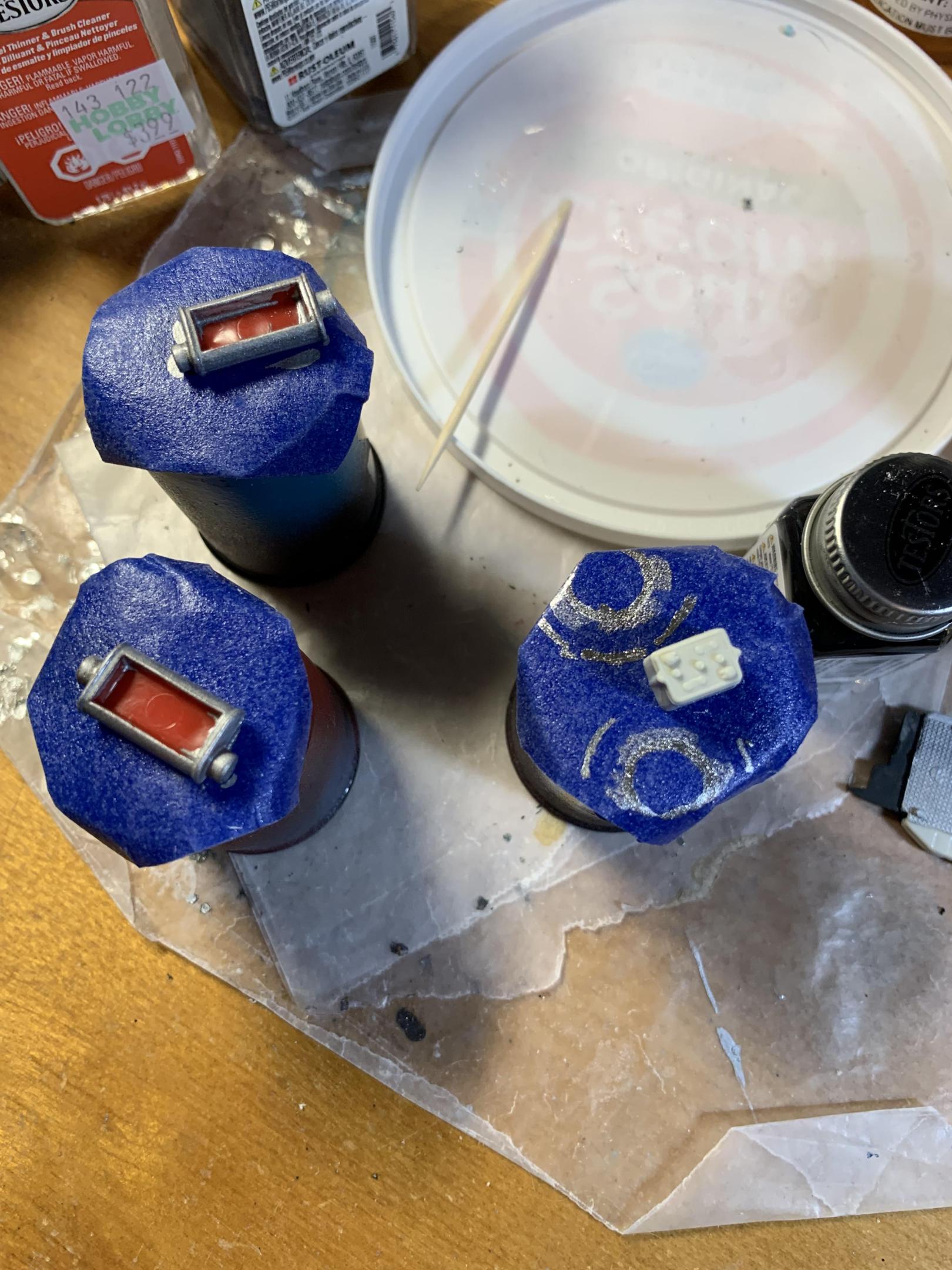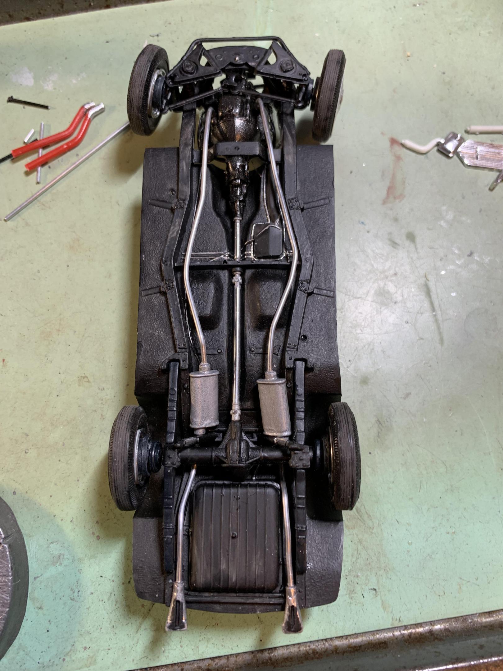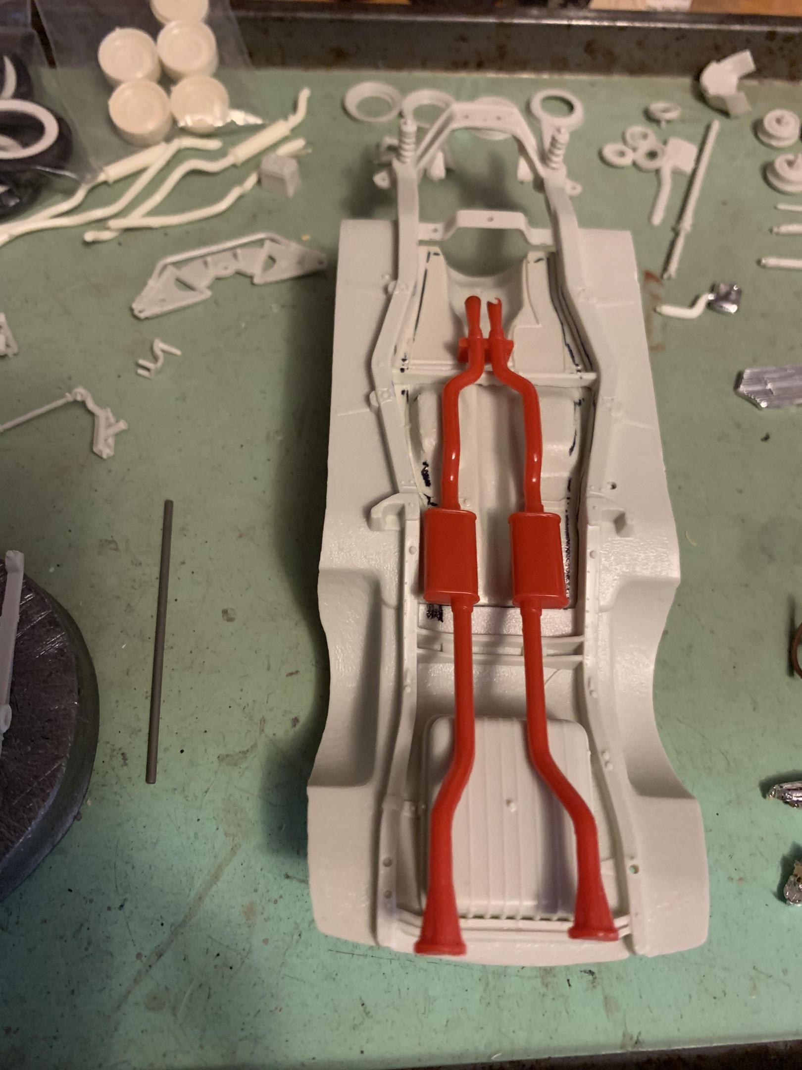 Chassis is almost done- now to start on the dual exhausts! Began painting the mufflers- need to drill holes for attachment pins for the rest of the system.