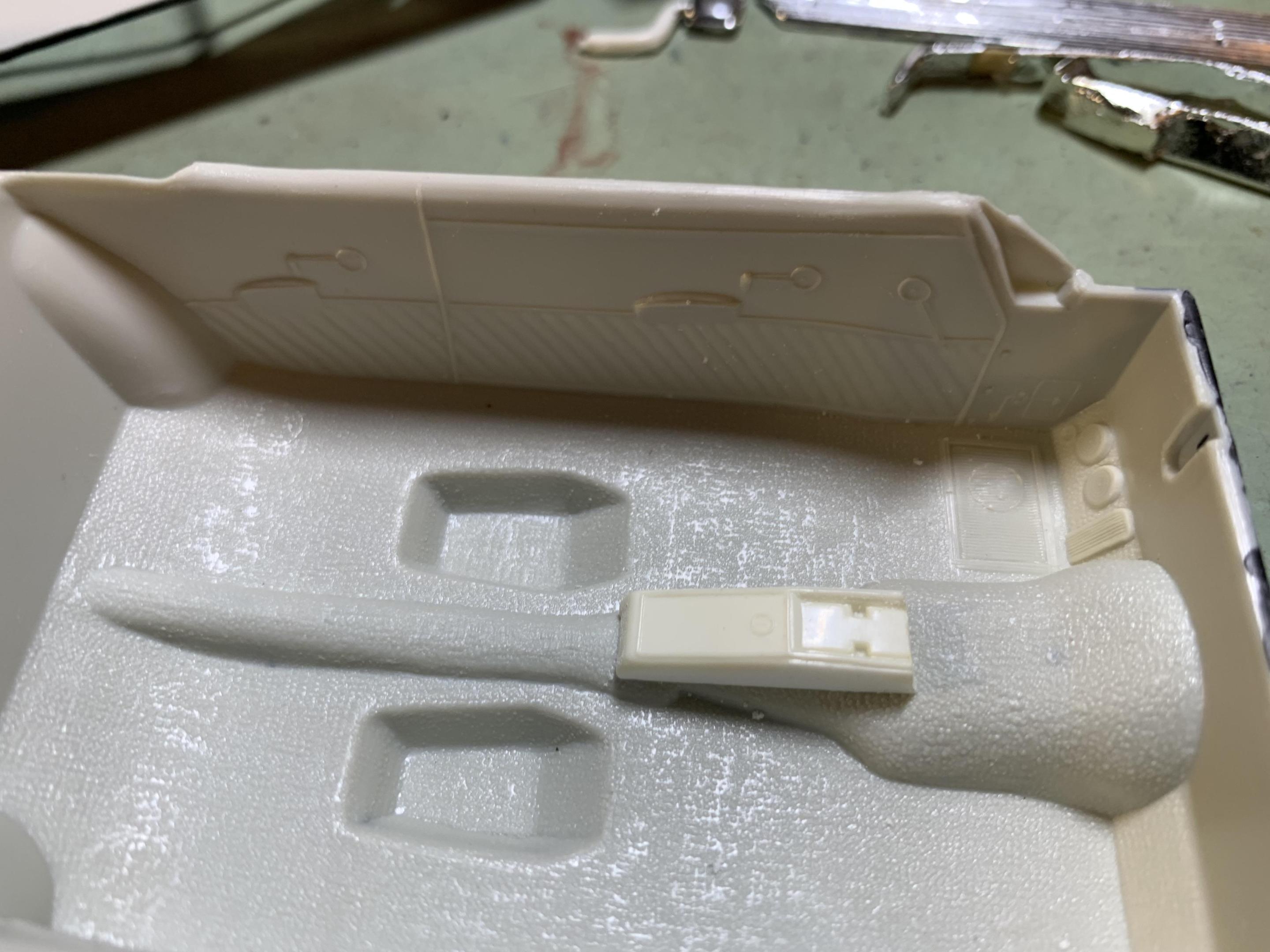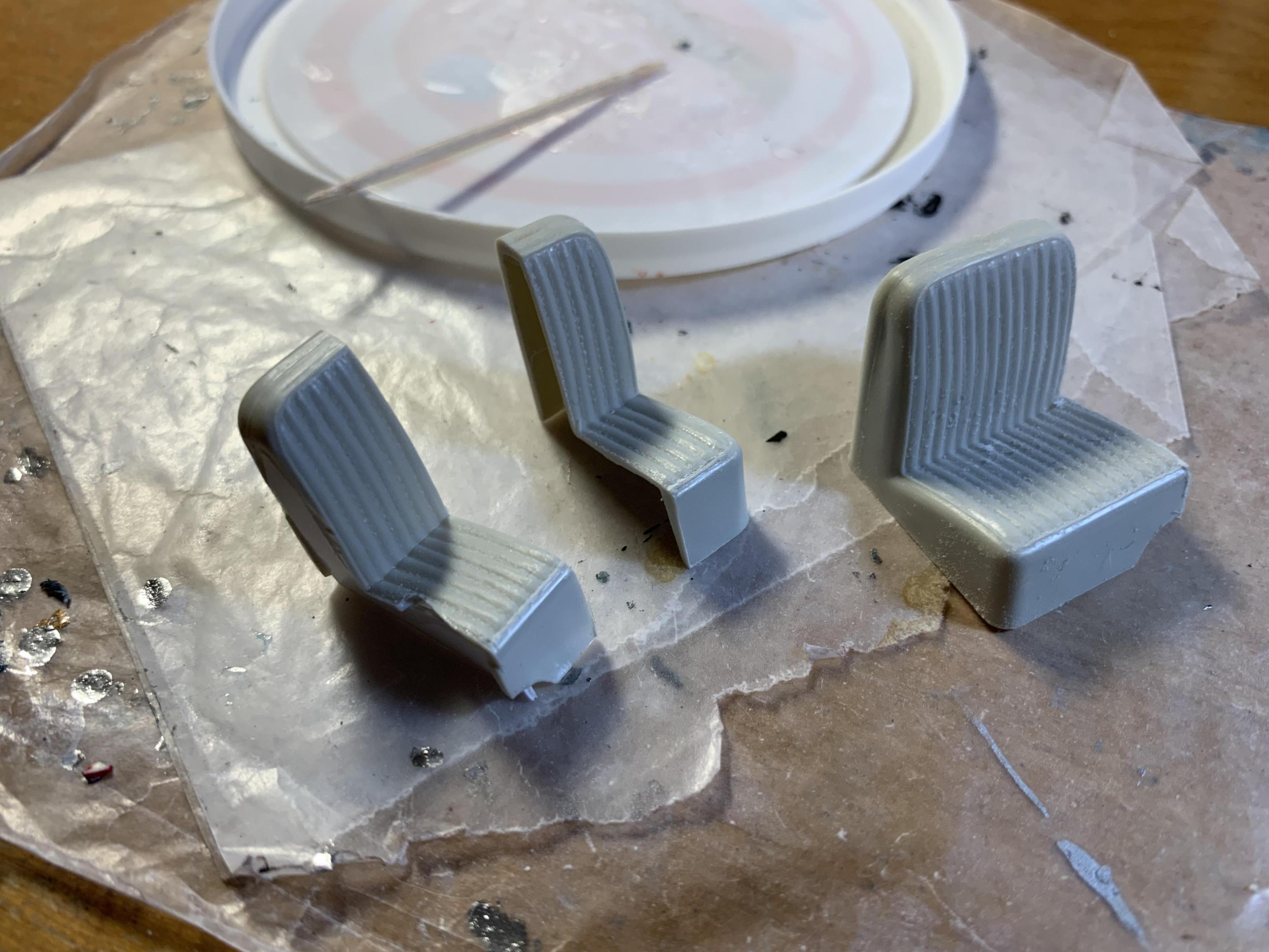 Began working on the interior. The bench seat from the 53 Stude was cut in two, then on half was also cut in two, then sanding was begun to reduce the width. Once the right width is established, the other half will be altered to match. Also started adding filler to the inside surface that was cut, using liquid styrene cement for the first bond. Will reinforce that with superglue, then putty and sand. The width will have to be further reduced to fit next to the center console, which was found in the stash and adapted. Looks like the interior sides will be sanded to be much thinner and proper tuck'n'roll and other features will be built up . More pix when I get more done!