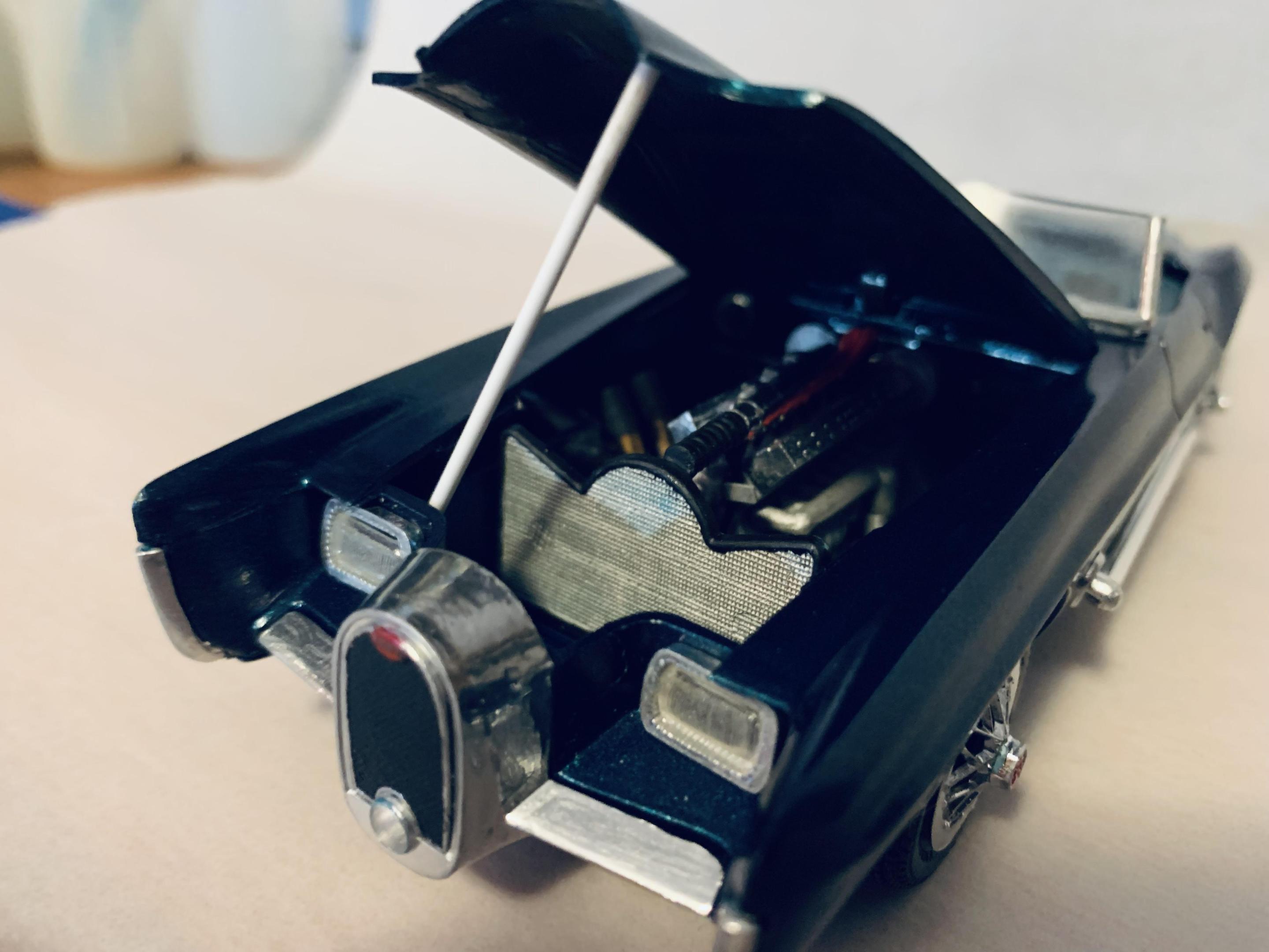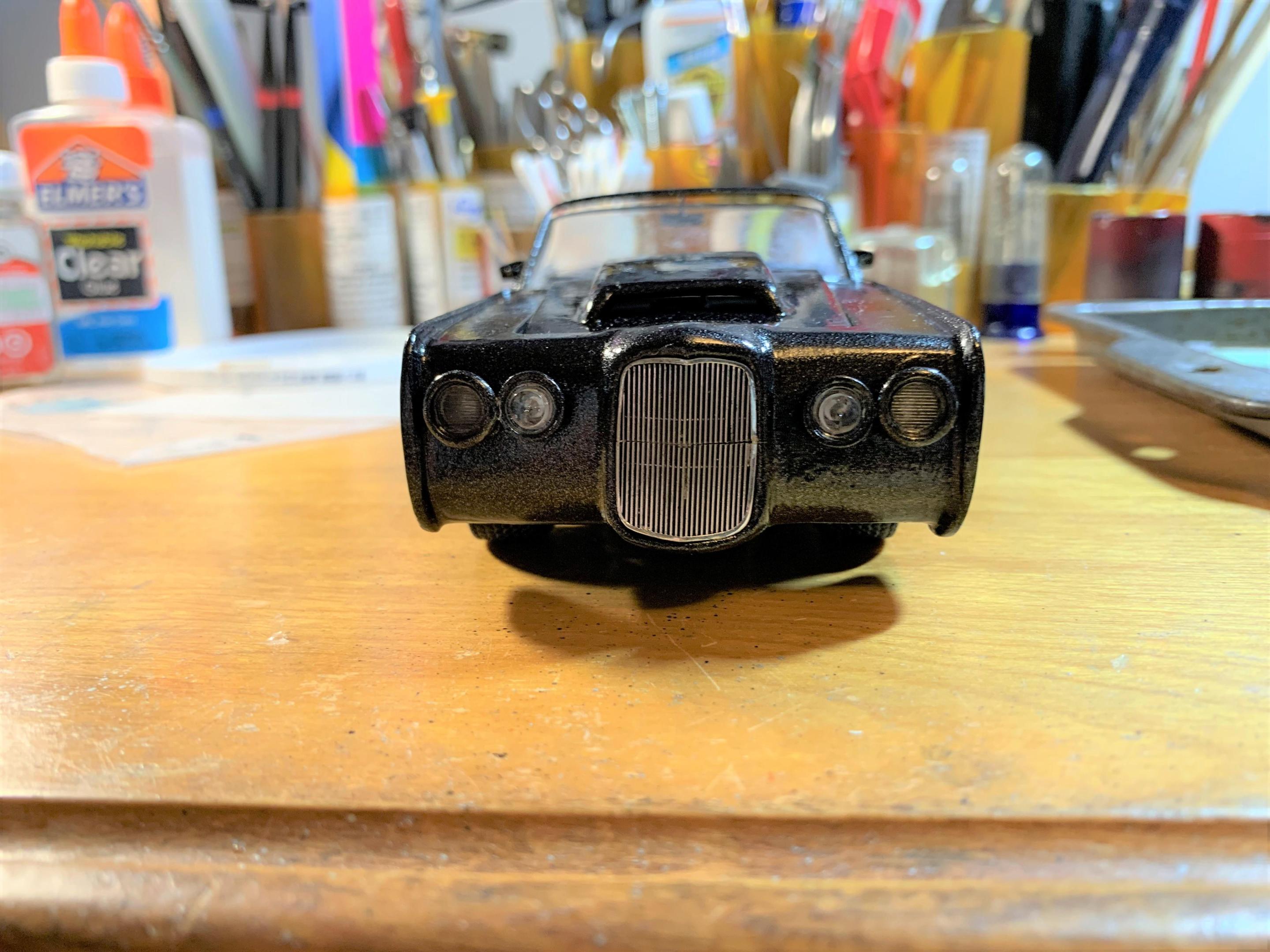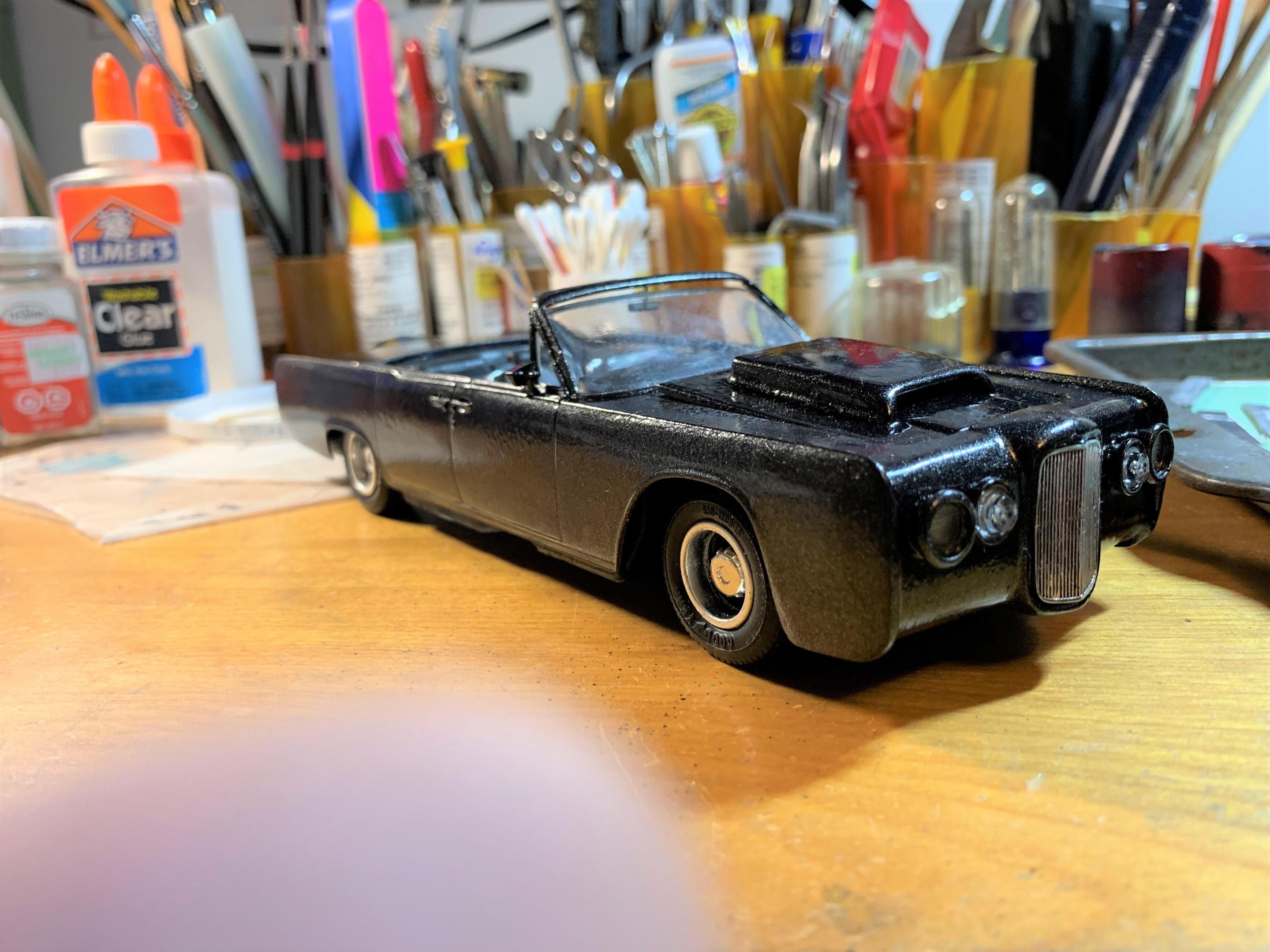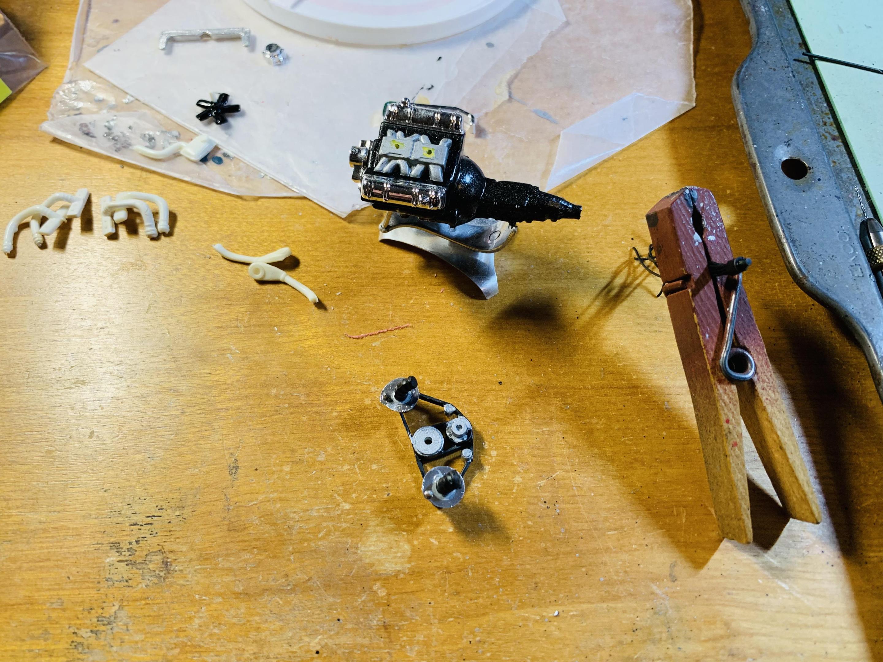 Progress! 600 cubic inch, 1000 hp, dohc, double supercharger engine with dual 4bbl carbs! interior done, chassis being paint detailed, wire wheels, body work nearly done- just some refining to accomplish. This will be my first airbrushed model- kandy metallic black!