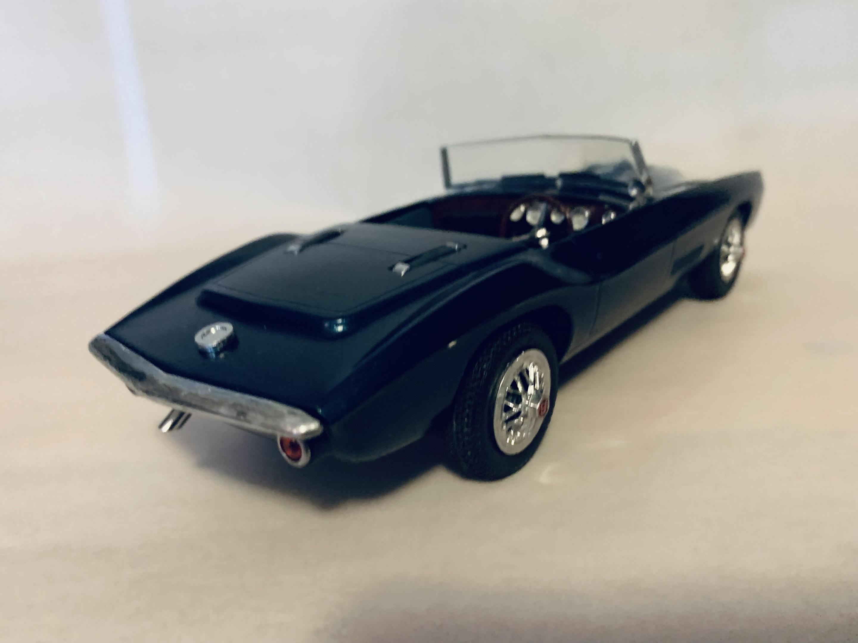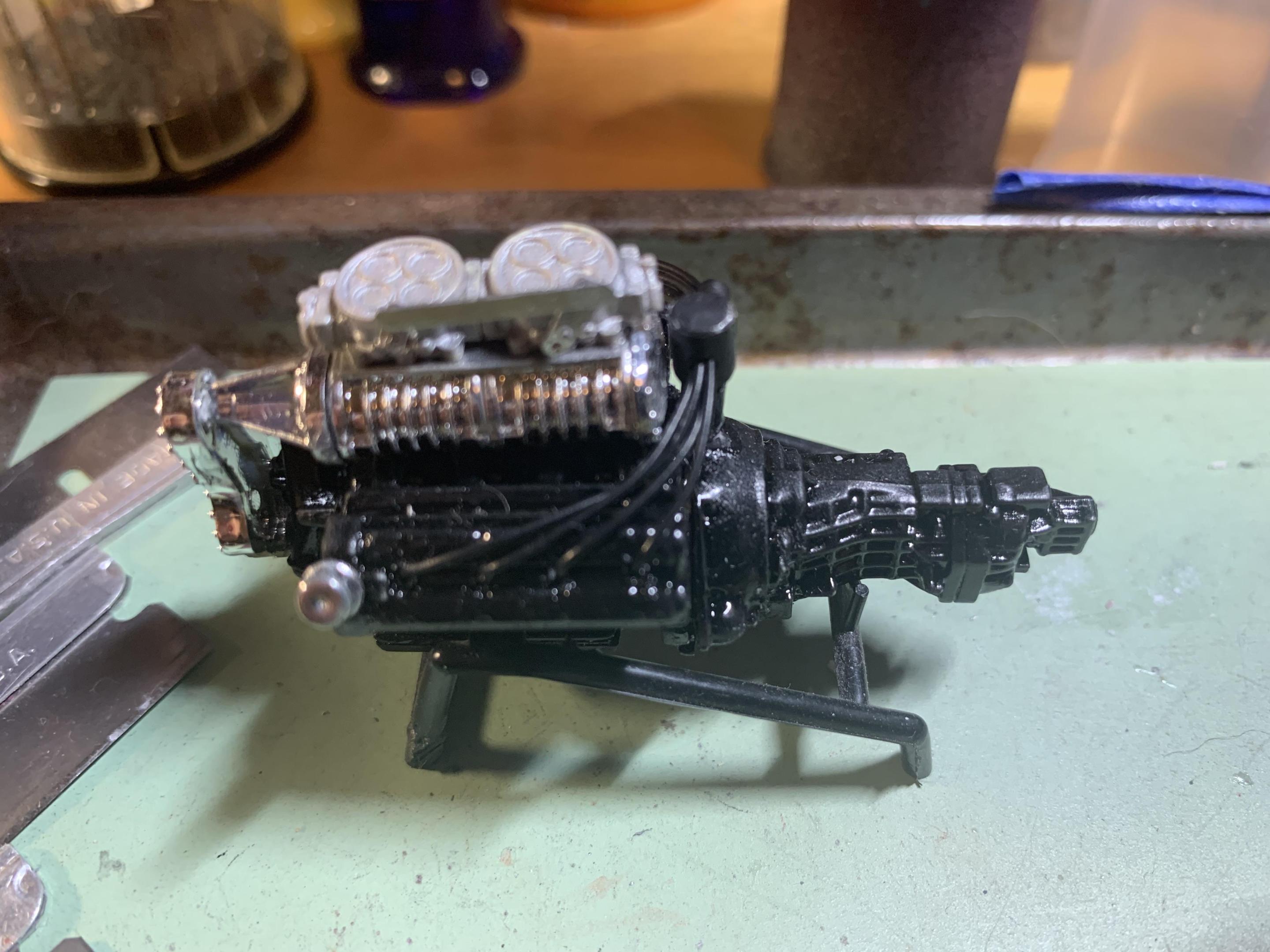 Started with the Monogram 427 side oiler, added dohc heads from a Corvette, a Viper transmission, and two blowers from the AMT 57 Chevy.