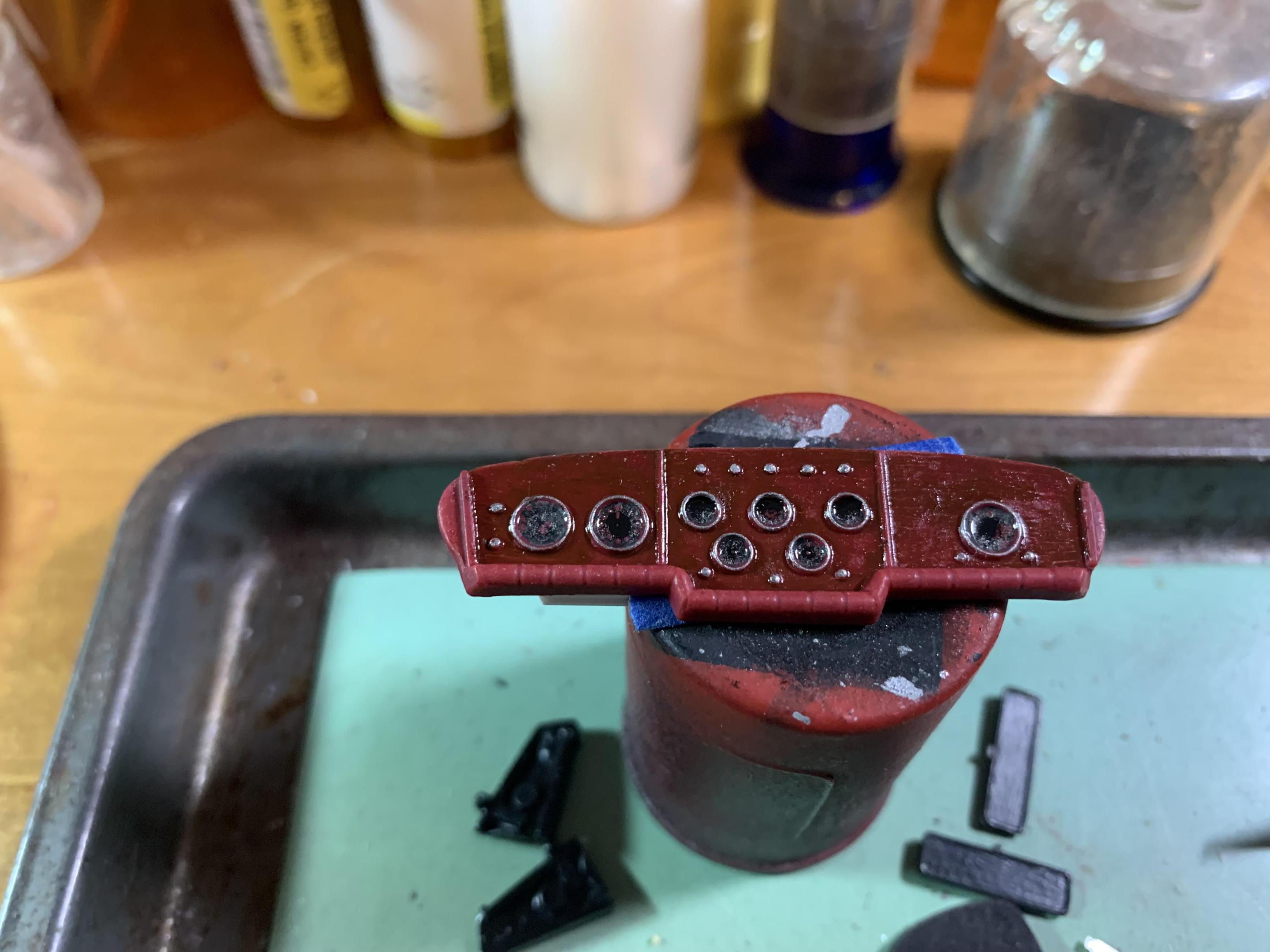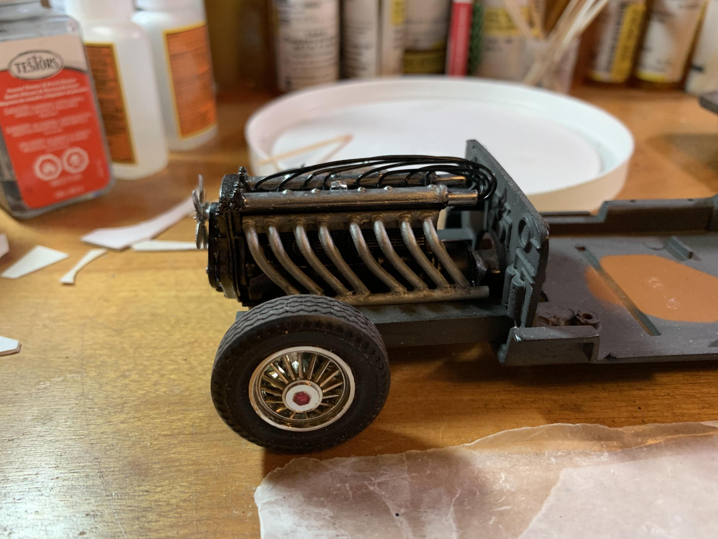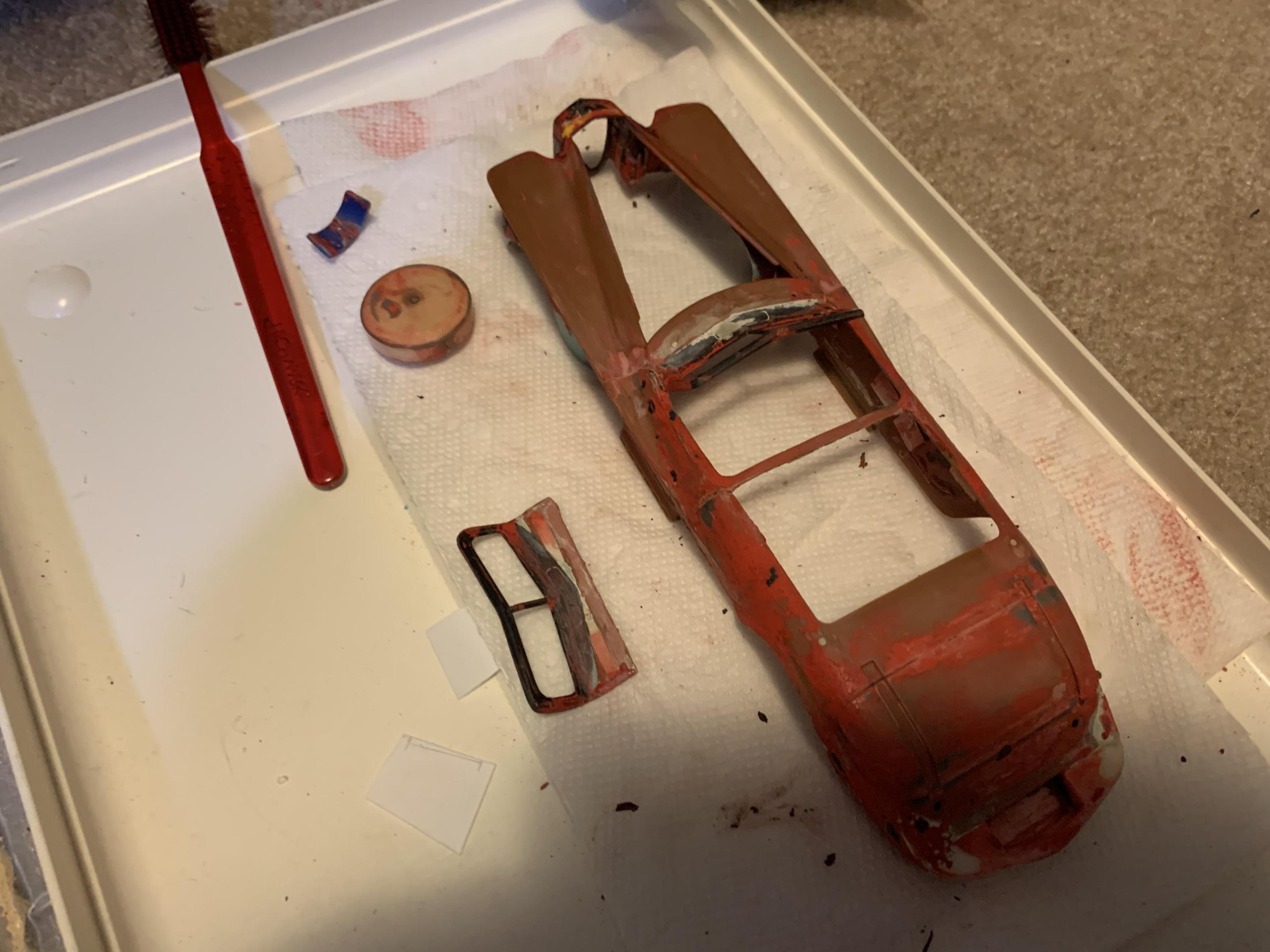 18. Still working on it, had a paint snafu so into the Easy-off- hope it won't eat all the putty work! Went to a black primer because the red didn't work out, but the paint didn't like this stuff (Rustoleum). Got the exhaust sorted out, also working on the interior.