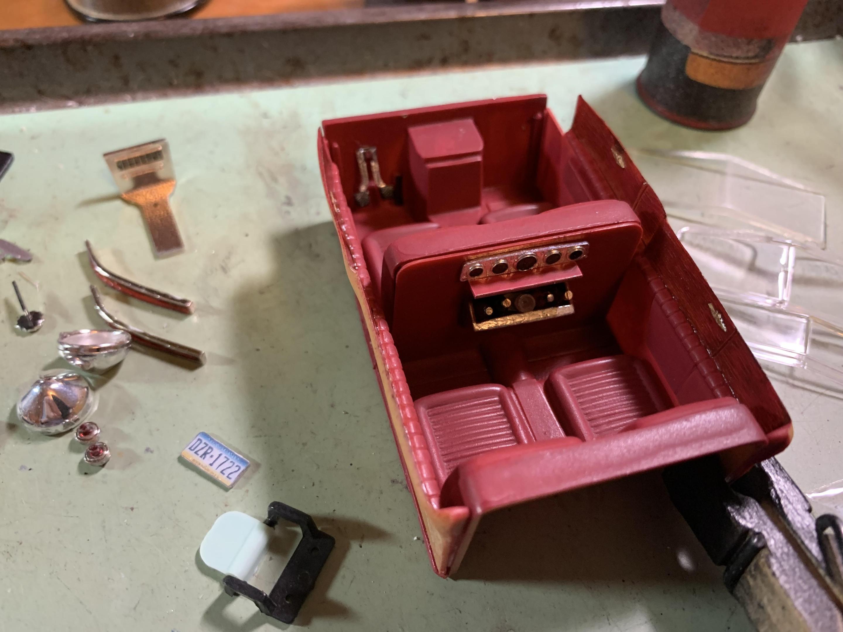 17. Well, the Easy-off bath removed most of the paint, and also loosed some parts- the rear cowl and windscreen will have to reinstalled with better support, and the grille surround pretty much came apart so will have to be rebuilt. The engine with the exhaust sorted out fits well in the chassis. The interior is coming along- the bar in the back with auxiliary gauge panel are looking good- inspired by the Burk's Law Rolls with the bar in the back! Once the body dries out I will remove the last of the paint, do some rebuilding, and then some putty work- a chance to do things better!