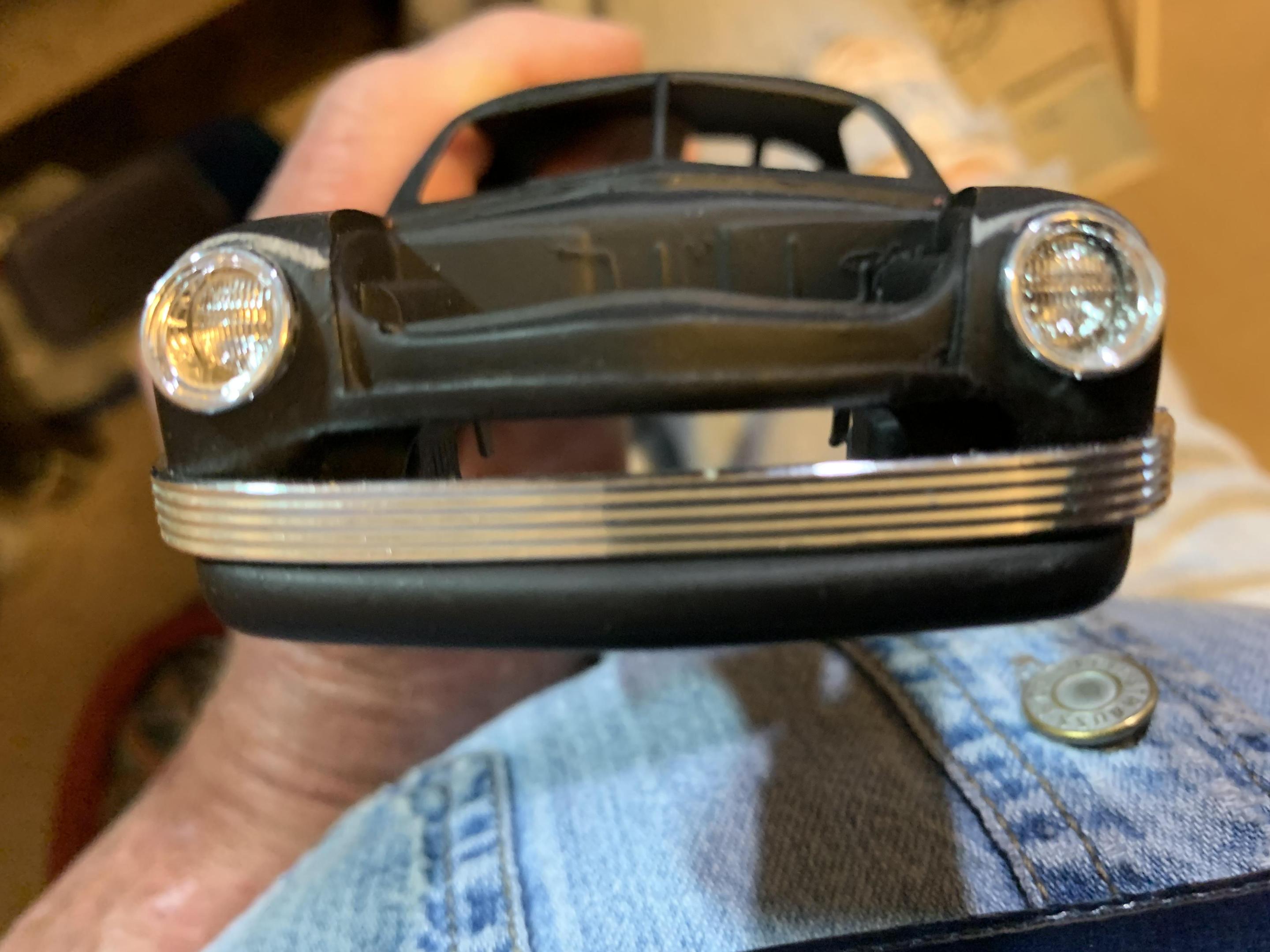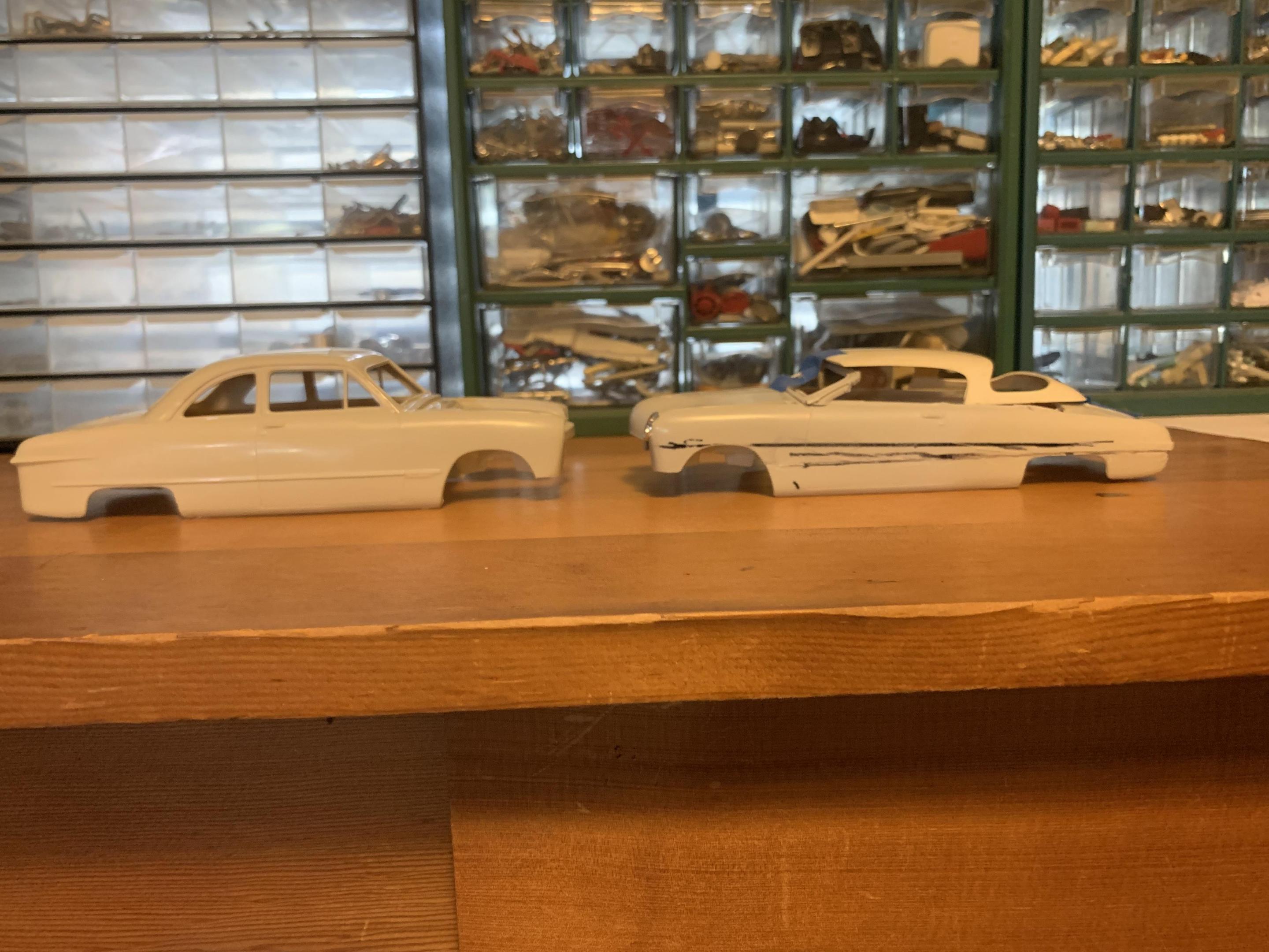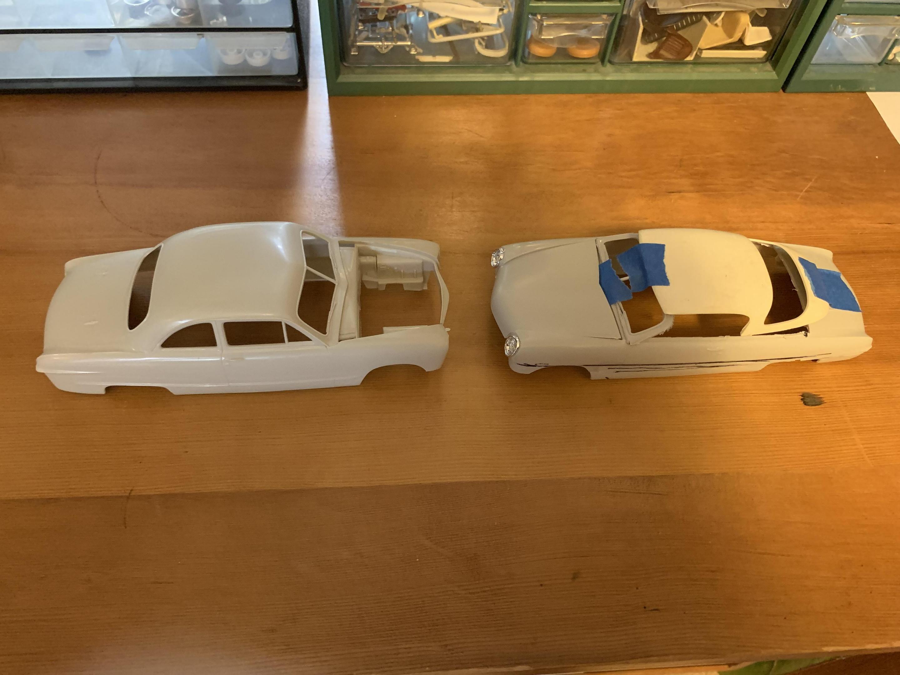 Decided to customize a 1949 Ford. Sectioned on a slant to reduce the height of the rear fenders. In the parts stash I found a coupe top and glass from the AMT 1957 Thunderbird and decided to graft it in. The windshield will be laid down to match the new top. Headlights are stock Avanti with the stock bezels filed down at an angle. Pix next to a stock Ford for comparison. More to come when I get more done!