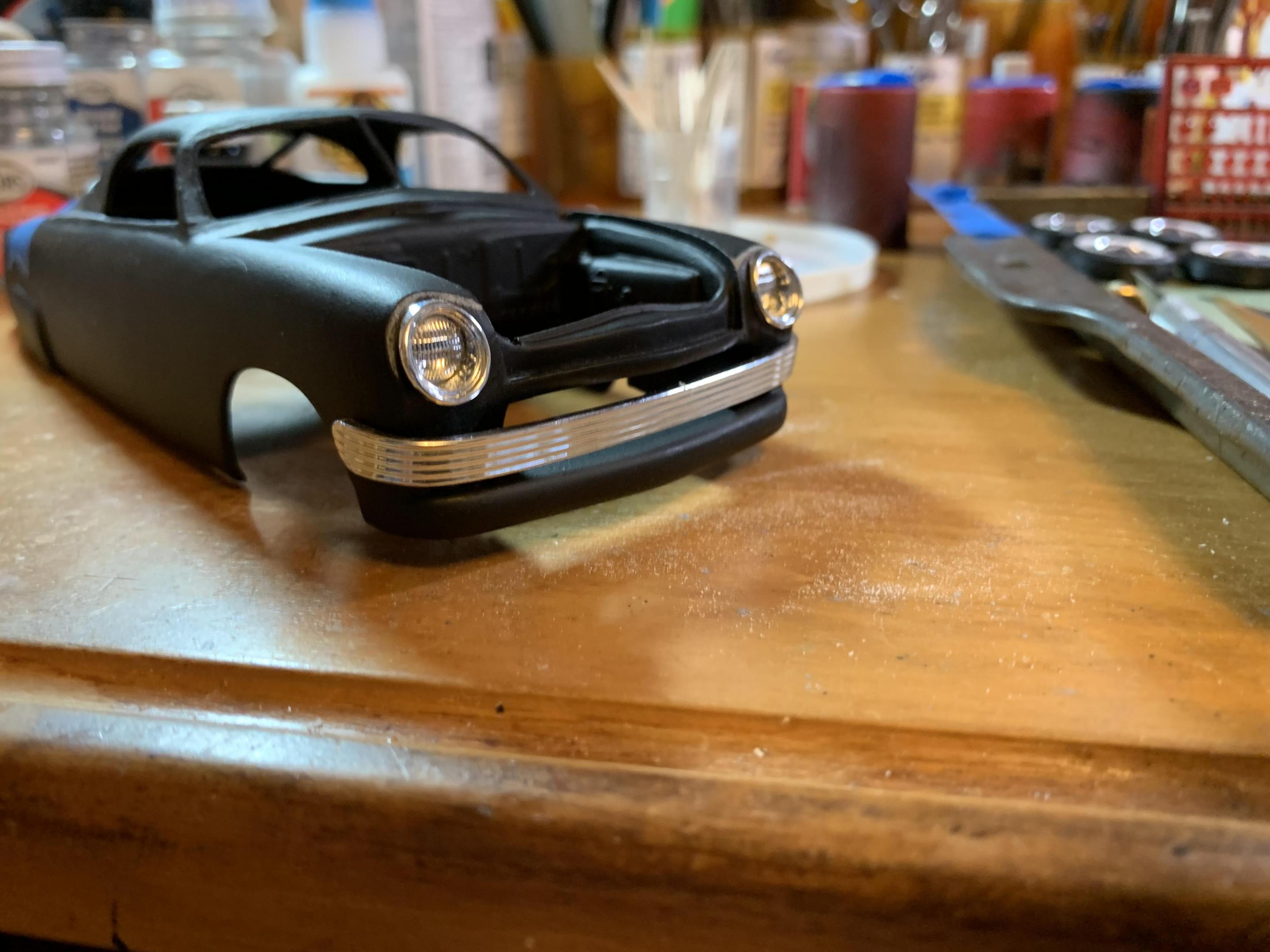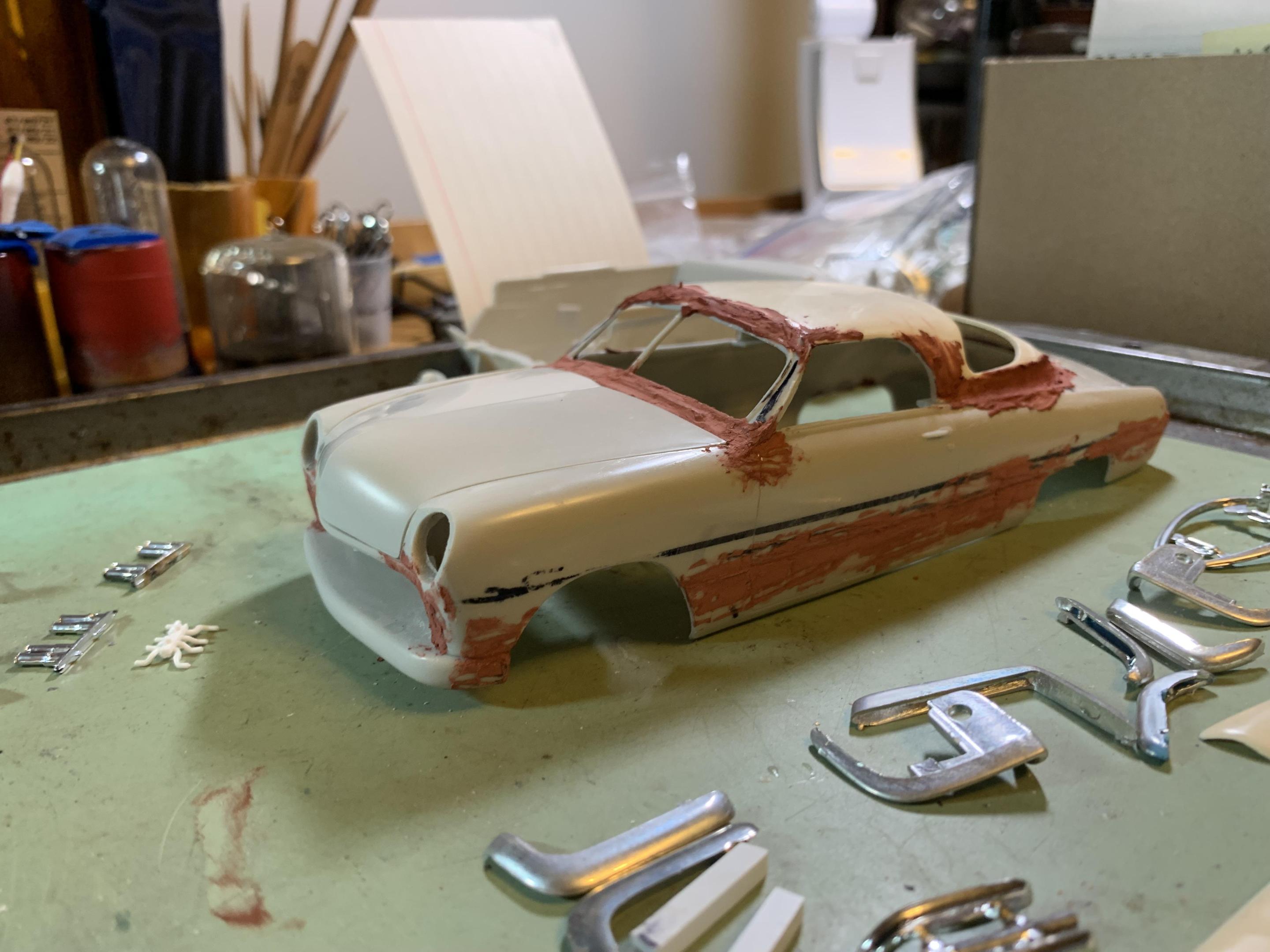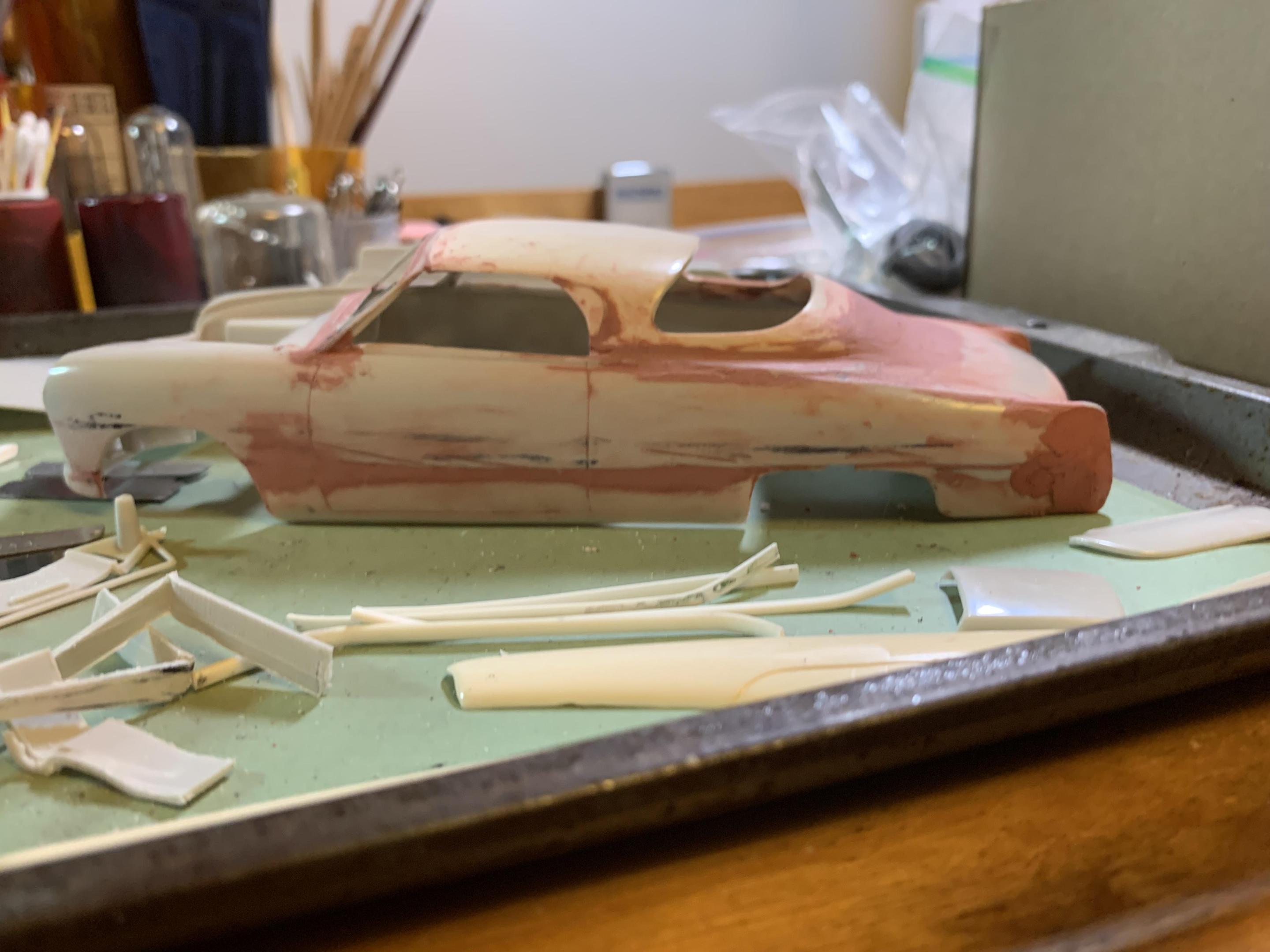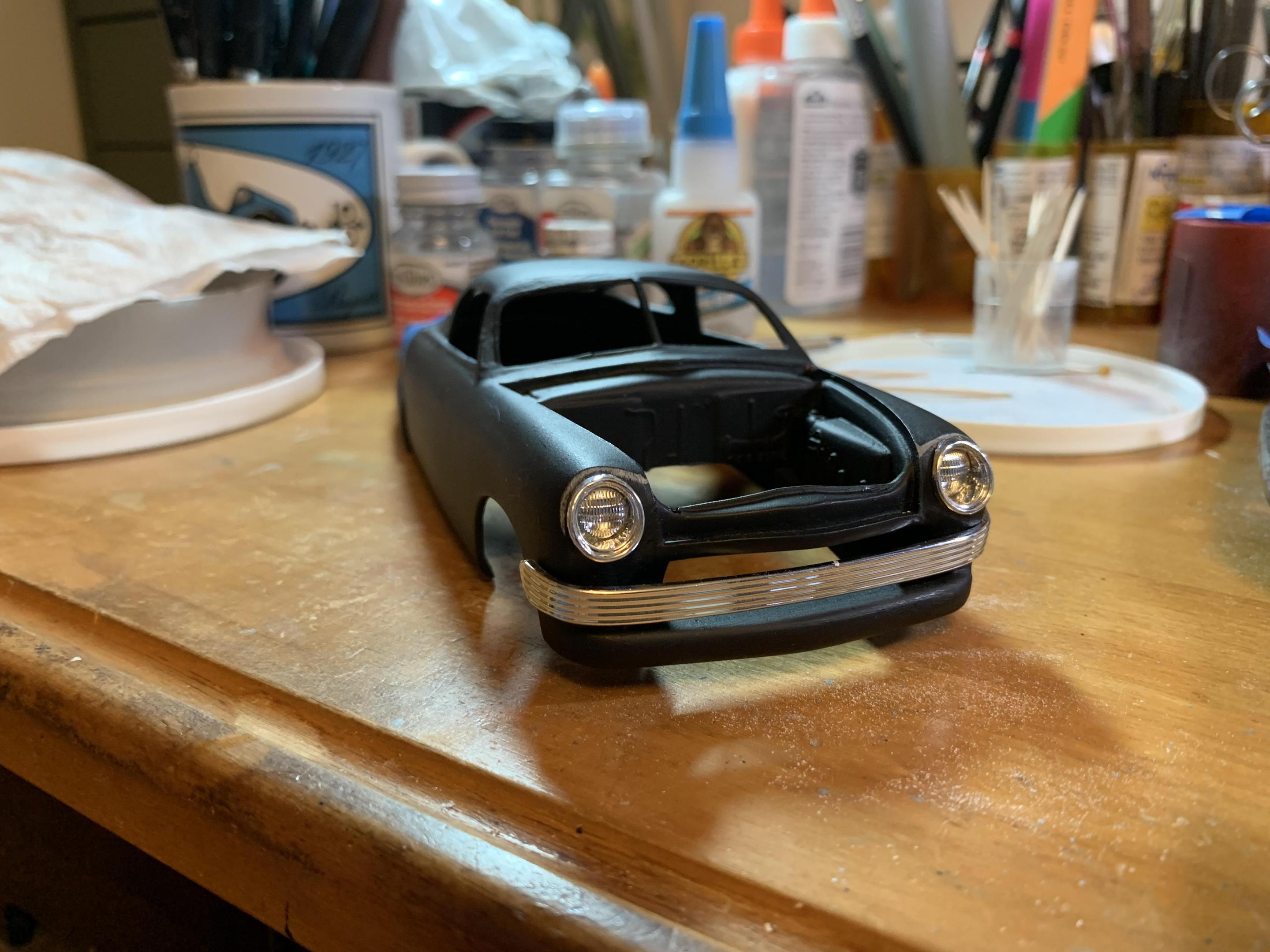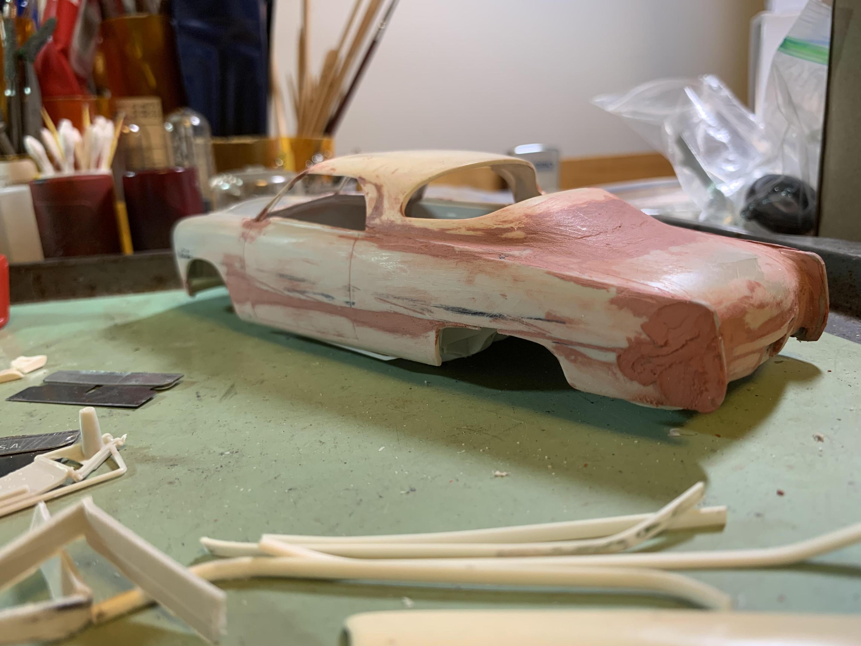 More progress, of a sort- the primer I used seems to not like drying and hardening- still sort of rubbery, and really clogs the sanding stick. First time for re-scribing panel lines. Decided to divide the rear window opening reminiscent of 49 Mercury, using 0.10" half round stock. Got a lot of chassis work done including installing the fishtail exhaust tips. Still need to fiddle with the rear suspension- not sitting low enough- already reversed the arch of the springs (shades of torching springs back in the 40's and 50's)- and need to add shocks. Started laying in the tuck "n" roll upholstery- we shall see if this stays, I'm not yet thrilled with the outcome- definitely will need more paint to pull it together. The 53 Studebaker wheel covers now have chrome trim rings and brake backs. Mocked up the Avanti headlight buckets and DeSoto bumper from Revel 49 Mercury to be used as the front grille. More pix when I get more done!