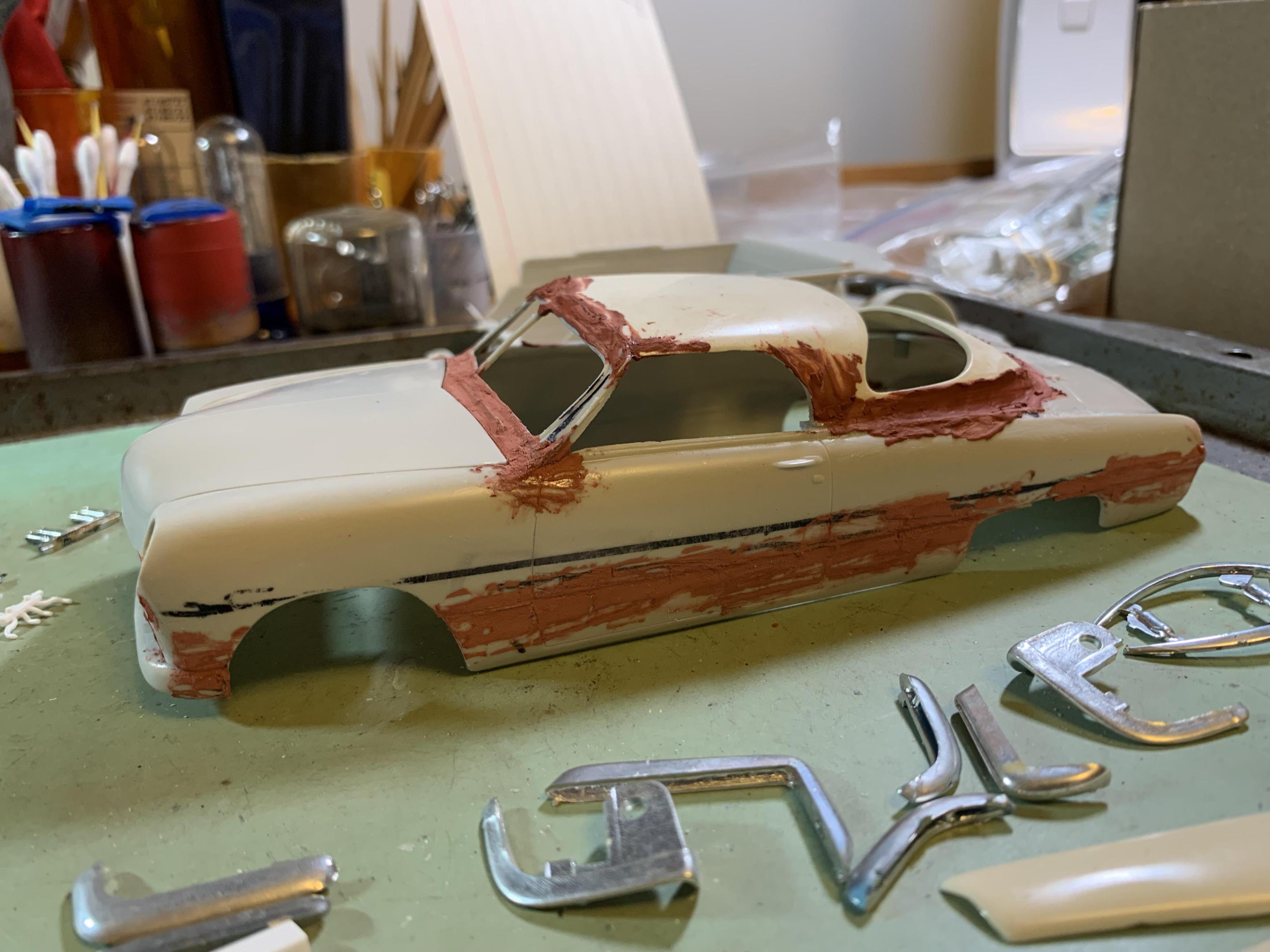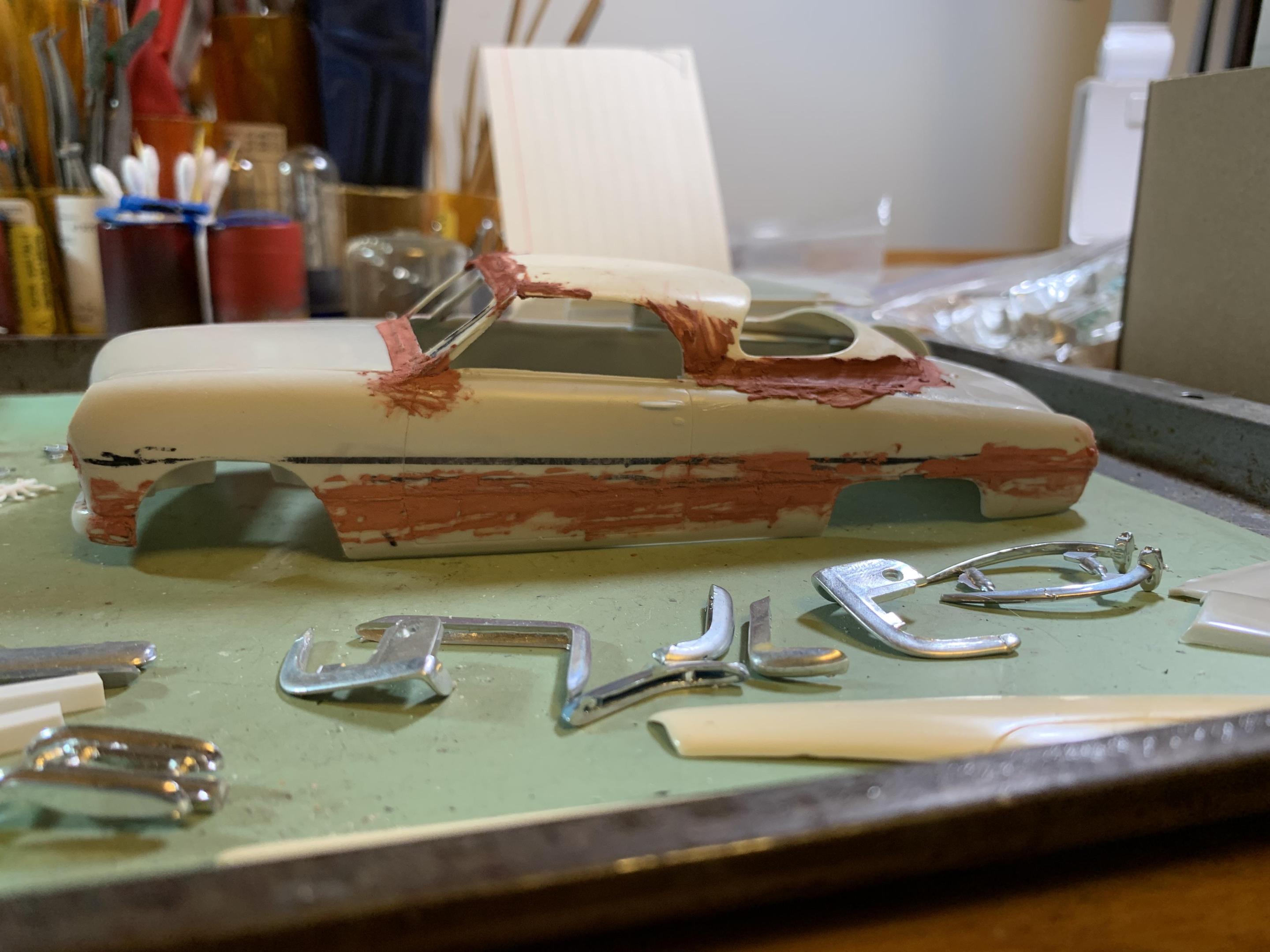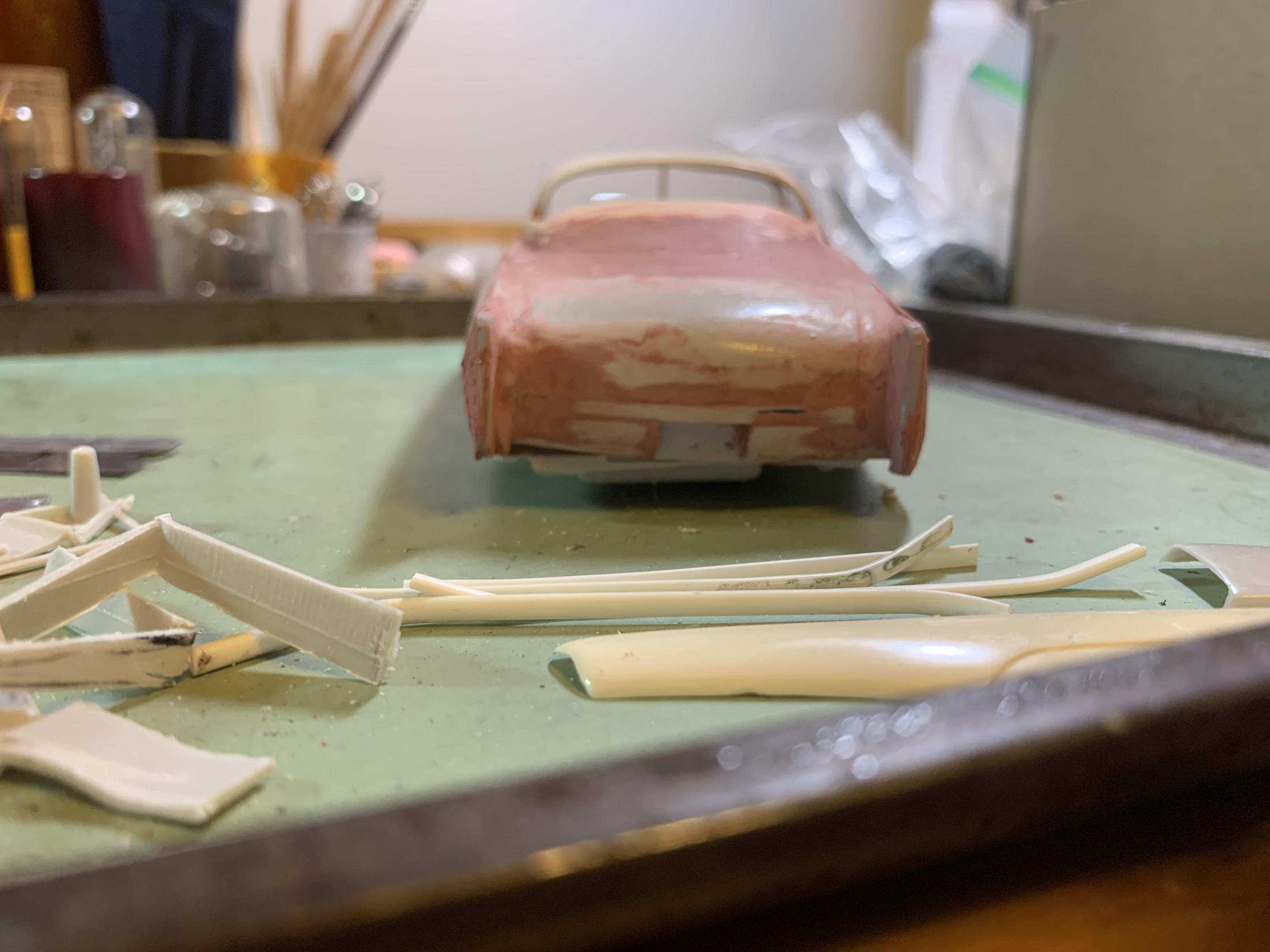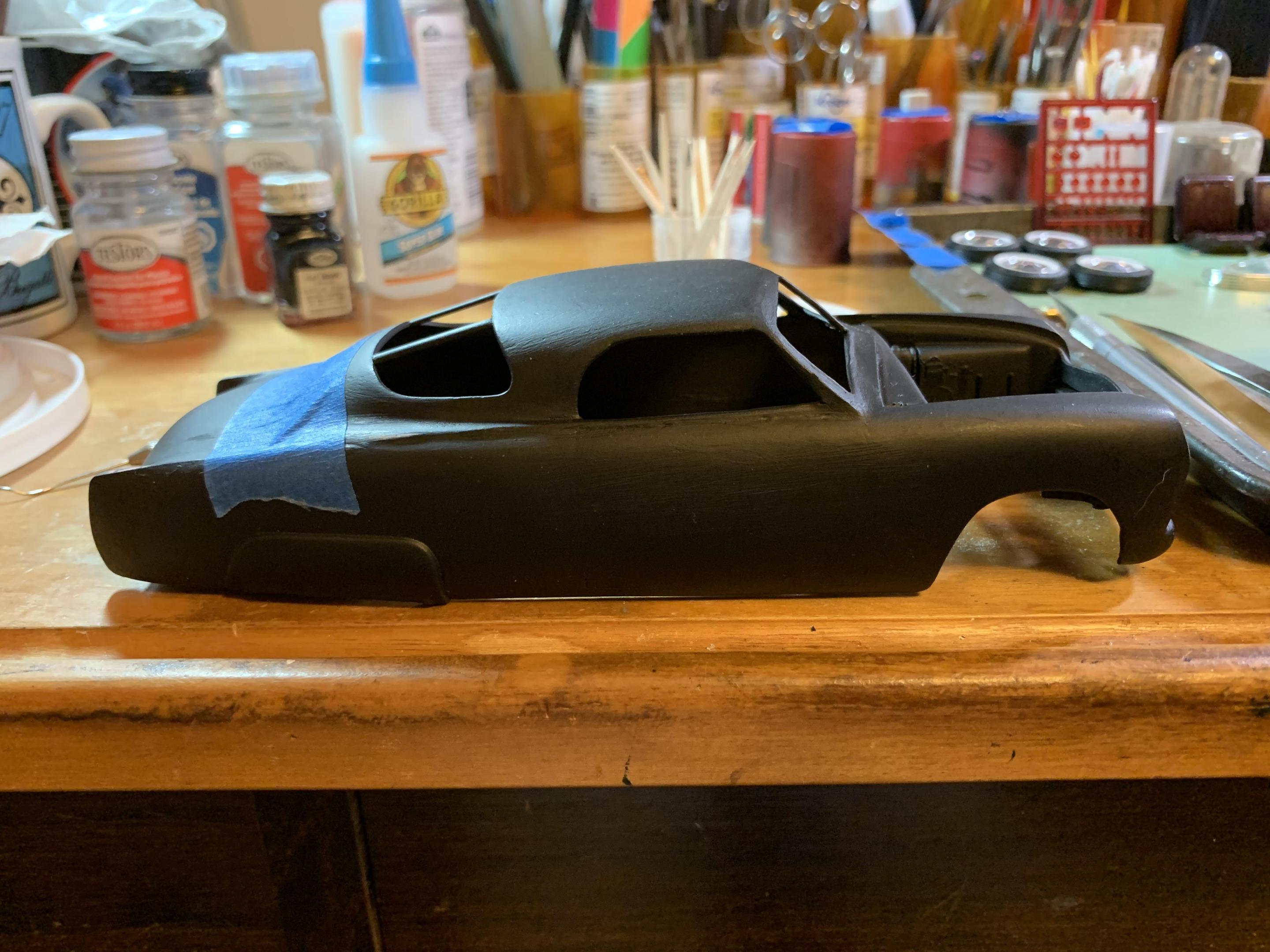 More progress, of a sort- the primer I used seems to not like drying and hardening- still sort of rubbery, and really clogs the sanding stick. First time for re-scribing panel lines. Decided to divide the rear window opening reminiscent of 49 Mercury, using 0.10" half round stock. Got a lot of chassis work done including installing the fishtail exhaust tips. Still need to fiddle with the rear suspension- not sitting low enough- already reversed the arch of the springs (shades of torching springs back in the 40's and 50's)- and need to add shocks. Started laying in the tuck "n" roll upholstery- we shall see if this stays, I'm not yet thrilled with the outcome- definitely will need more paint to pull it together. The 53 Studebaker wheel covers now have chrome trim rings and brake backs. Mocked up the Avanti headlight buckets and DeSoto bumper from Revel 49 Mercury to be used as the front grille. More pix when I get more done!